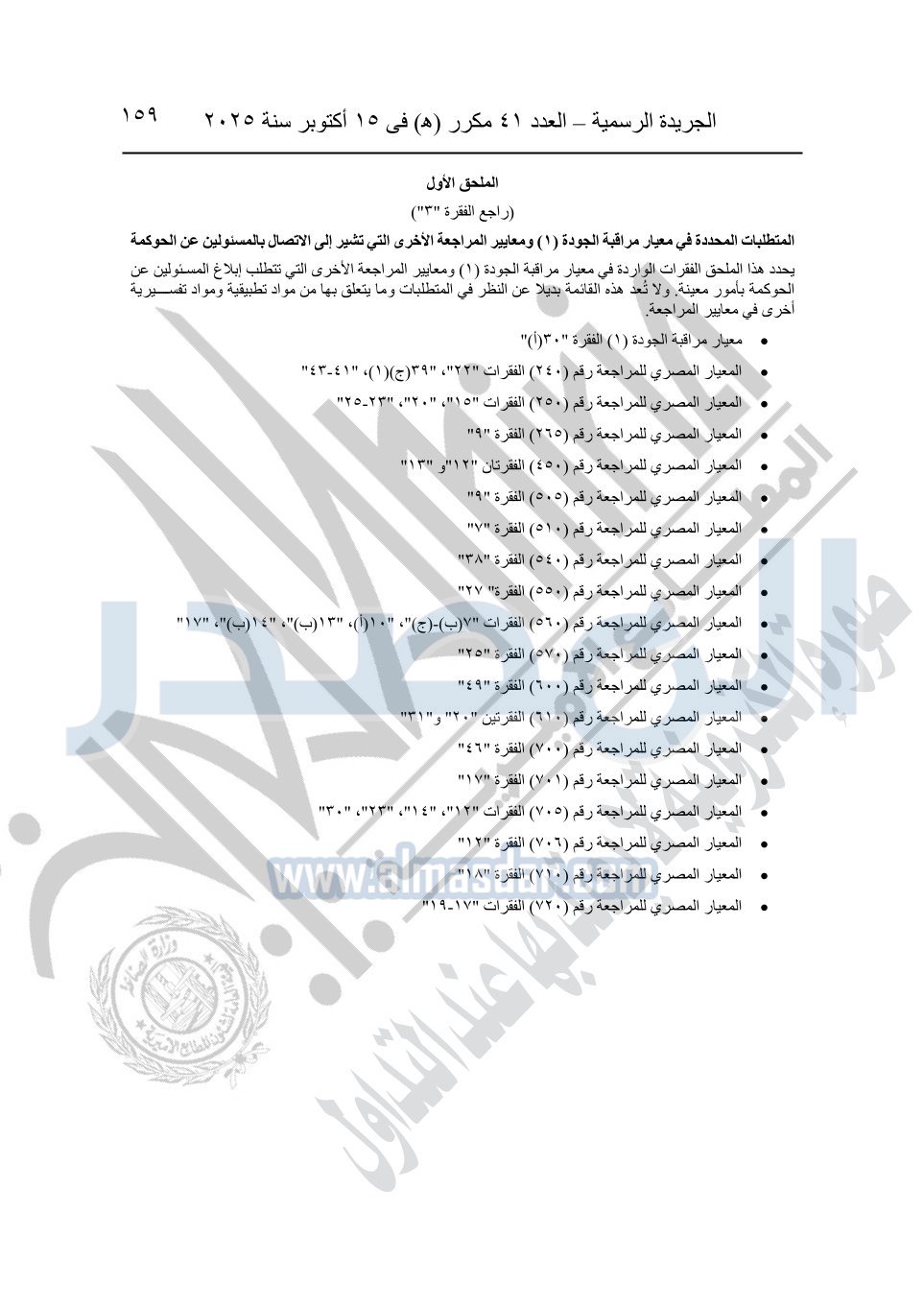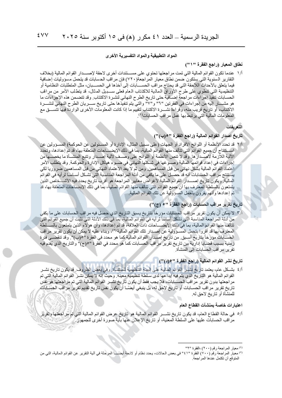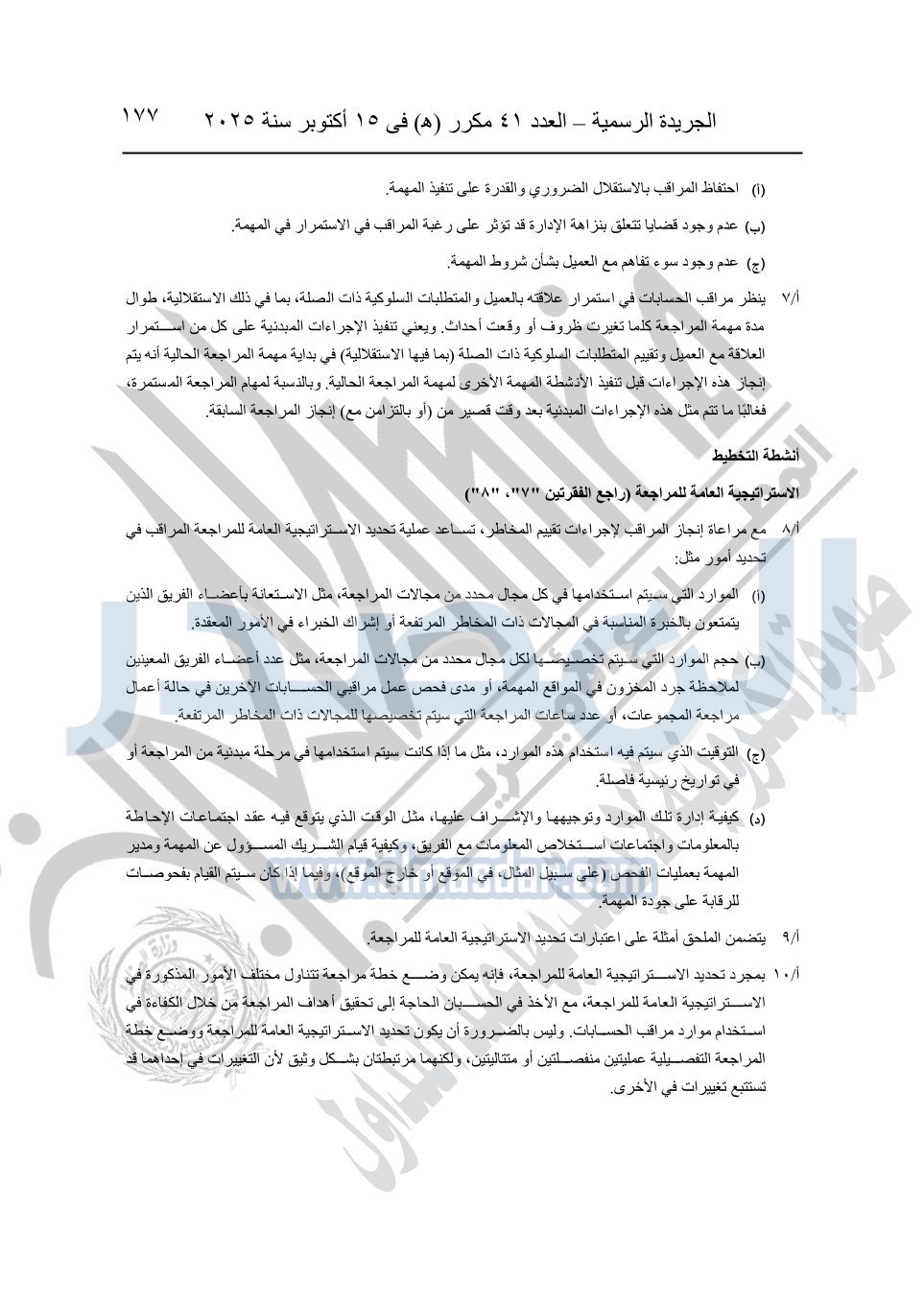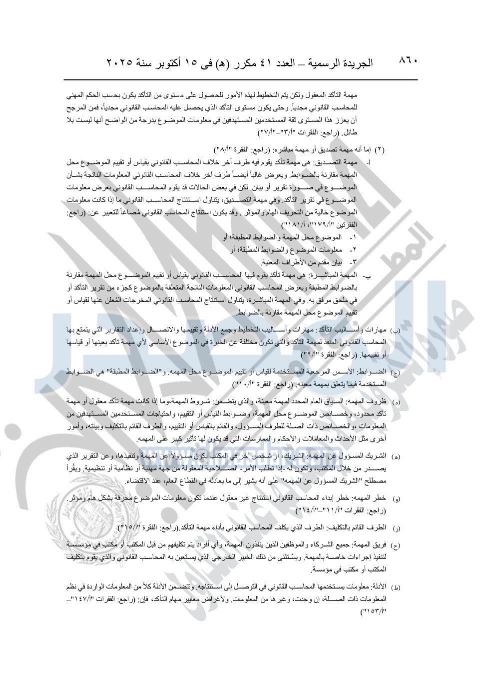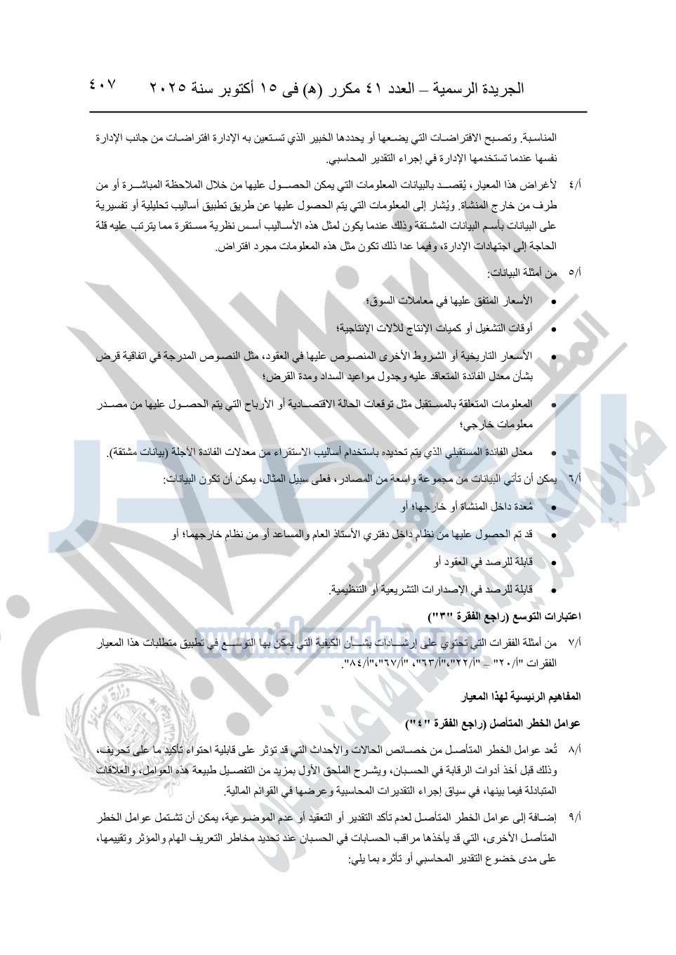 نشرت الجريدة الرسمية في العدد 41 مكرر "هـ" الصادر في 15 أكتوبر سنة 2025، قرار رئيس مجلس الوزراء رقم 3725 لسنة 2025، بشأن العمل بالمعايير المصرية للمراجعة والفحص المحدود ومهام التأكد الأخرى المرافقة لهذا القرار.
