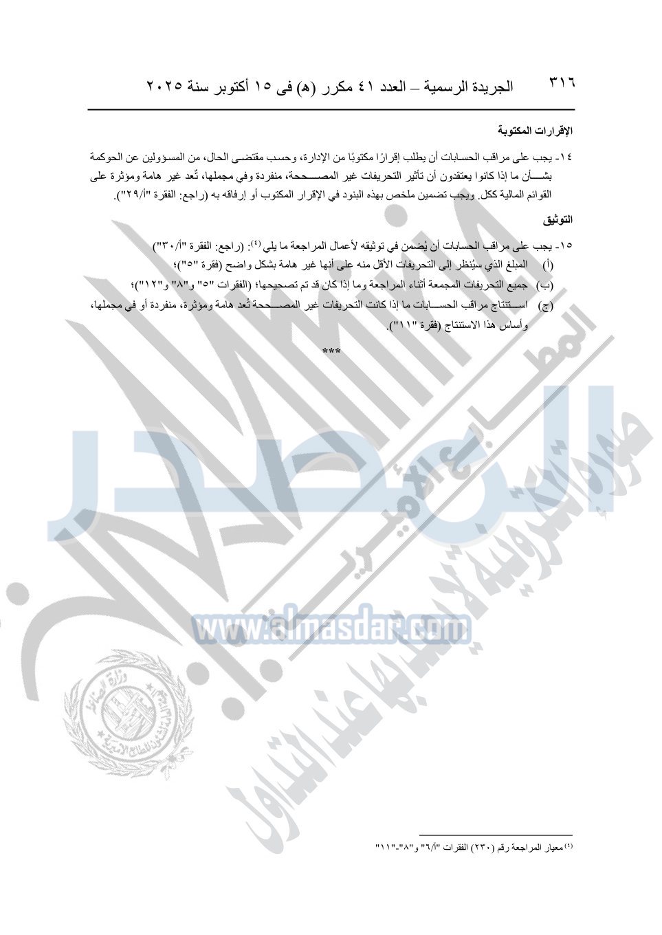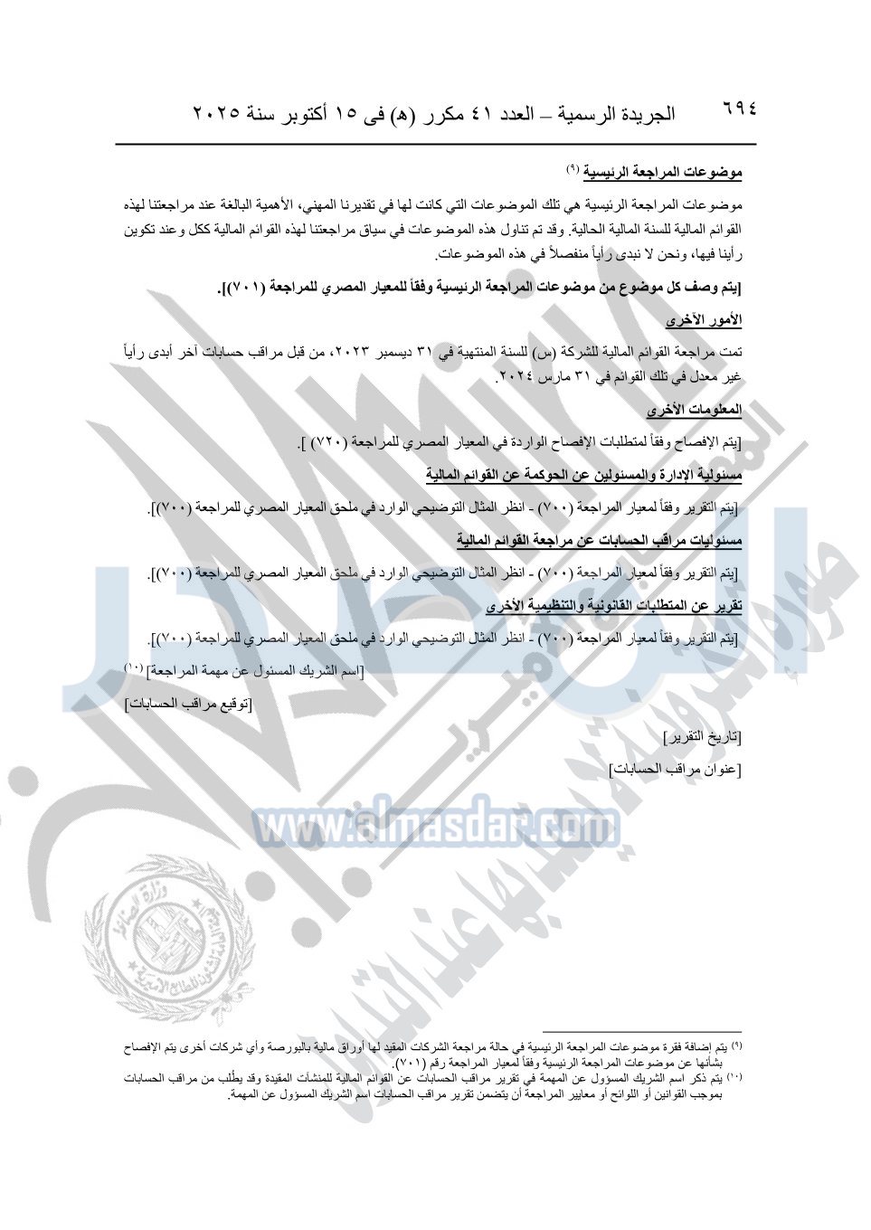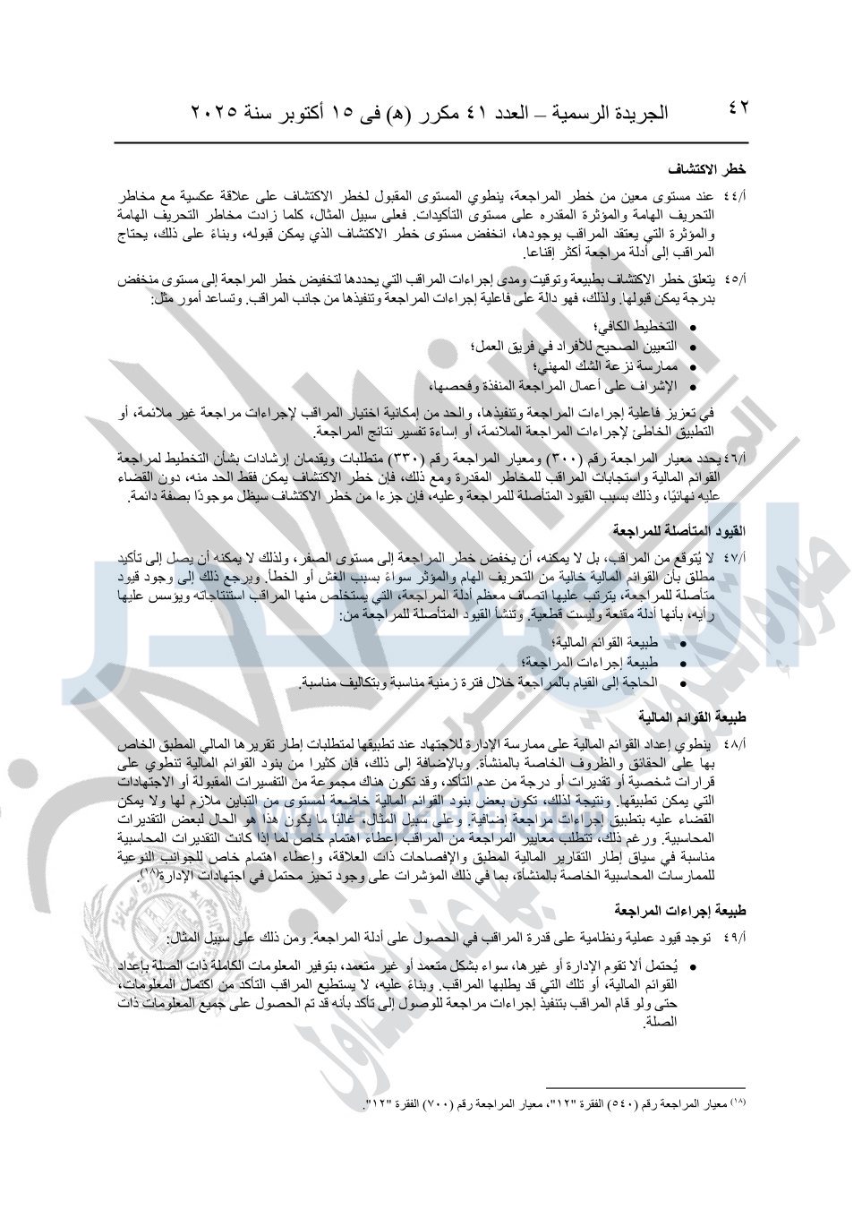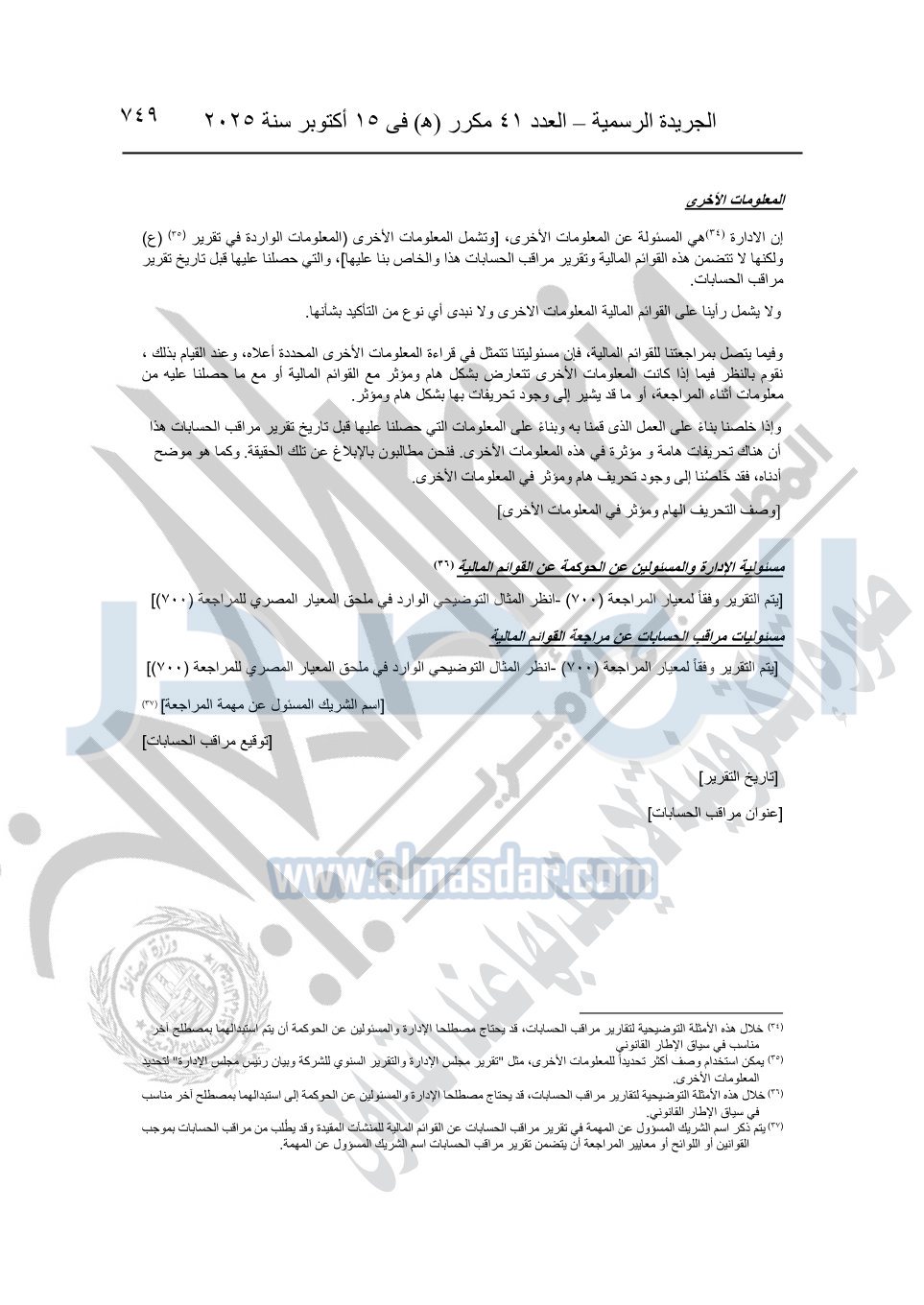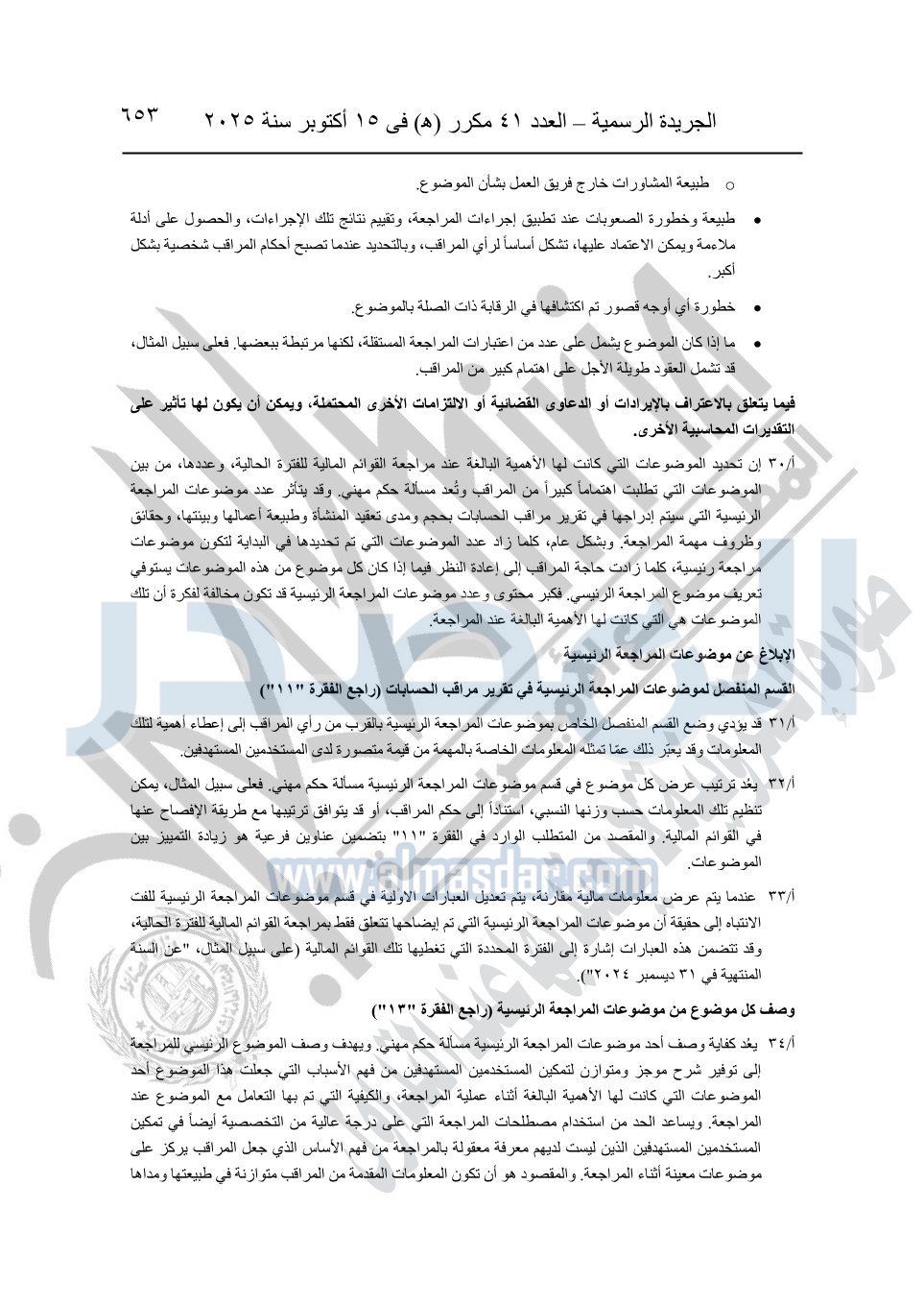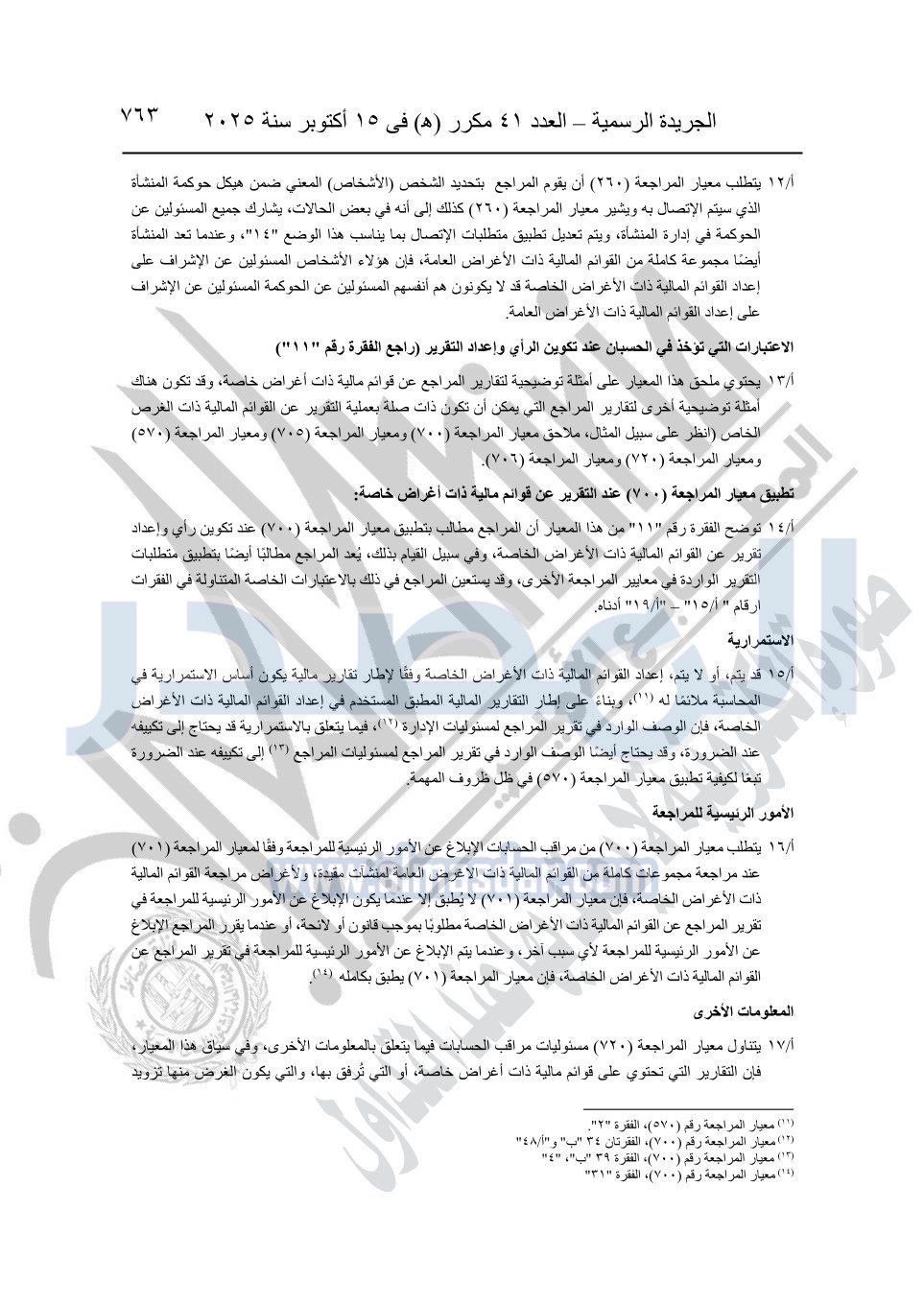 نشرت الجريدة الرسمية في العدد 41 مكرر "هـ" الصادر في 15 أكتوبر سنة 2025، قرار رئيس مجلس الوزراء رقم 3725 لسنة 2025، بشأن العمل بالمعايير المصرية للمراجعة والفحص المحدود ومهام التأكد الأخرى المرافقة لهذا القرار.