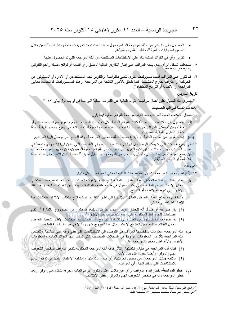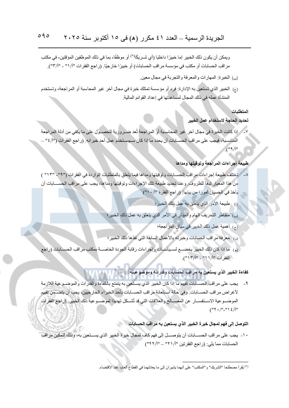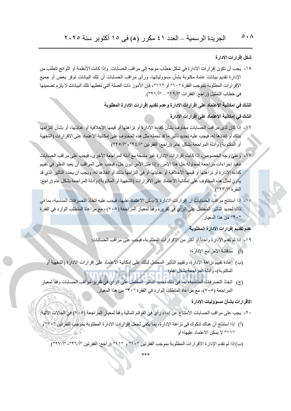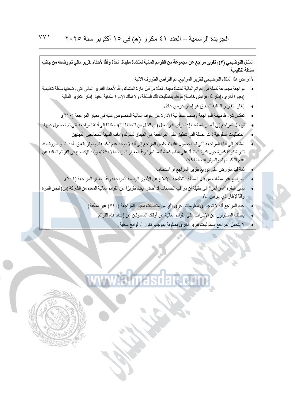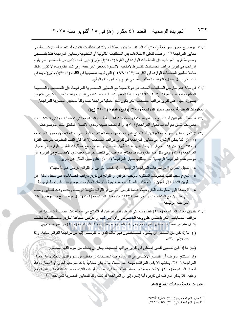 نشرت الجريدة الرسمية في العدد 41 مكرر "هـ" الصادر في 15 أكتوبر سنة 2025، قرار رئيس مجلس الوزراء رقم 3725 لسنة 2025، بشأن العمل بالمعايير المصرية للمراجعة والفحص المحدود ومهام التأكد الأخرى المرافقة لهذا القرار.