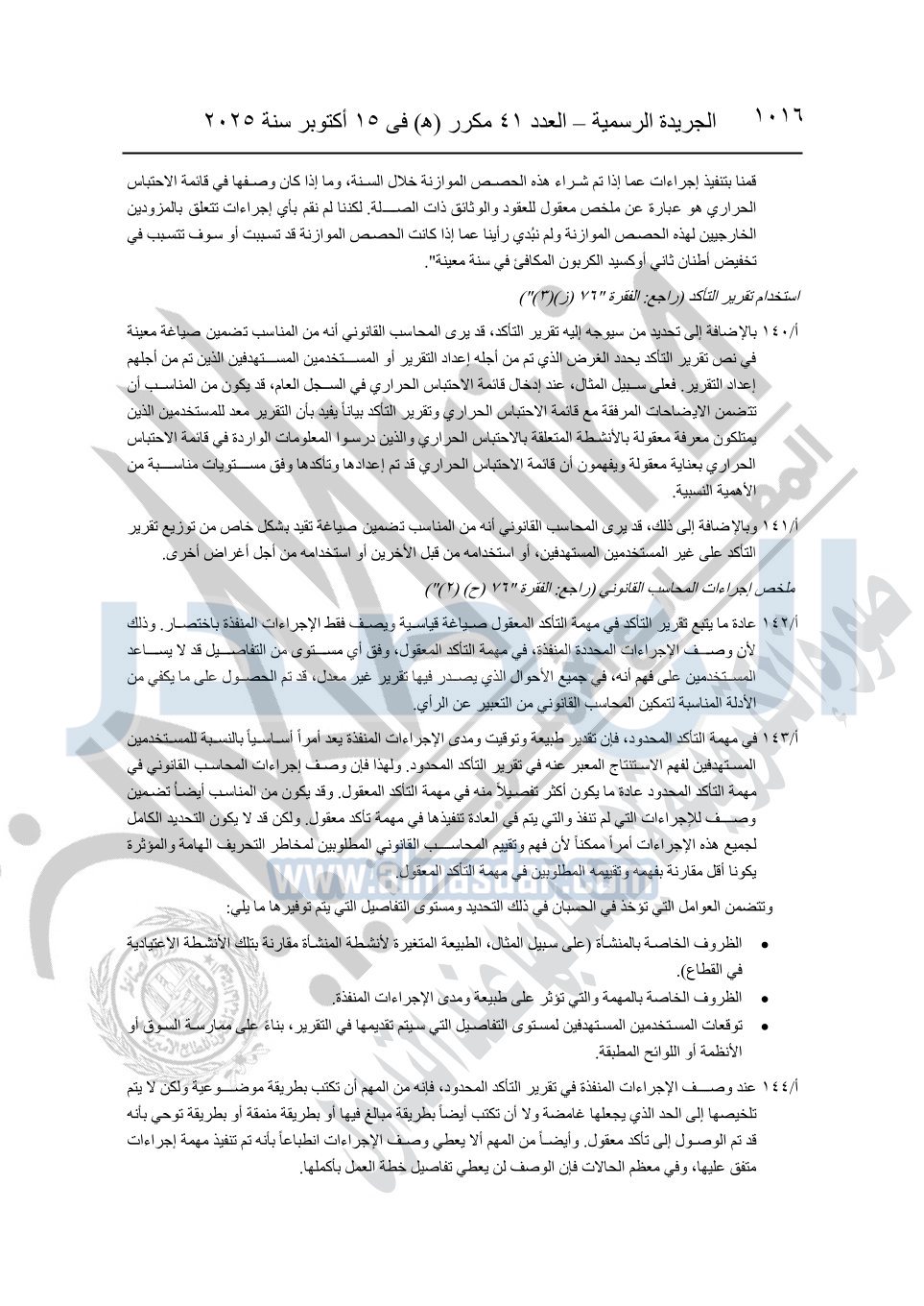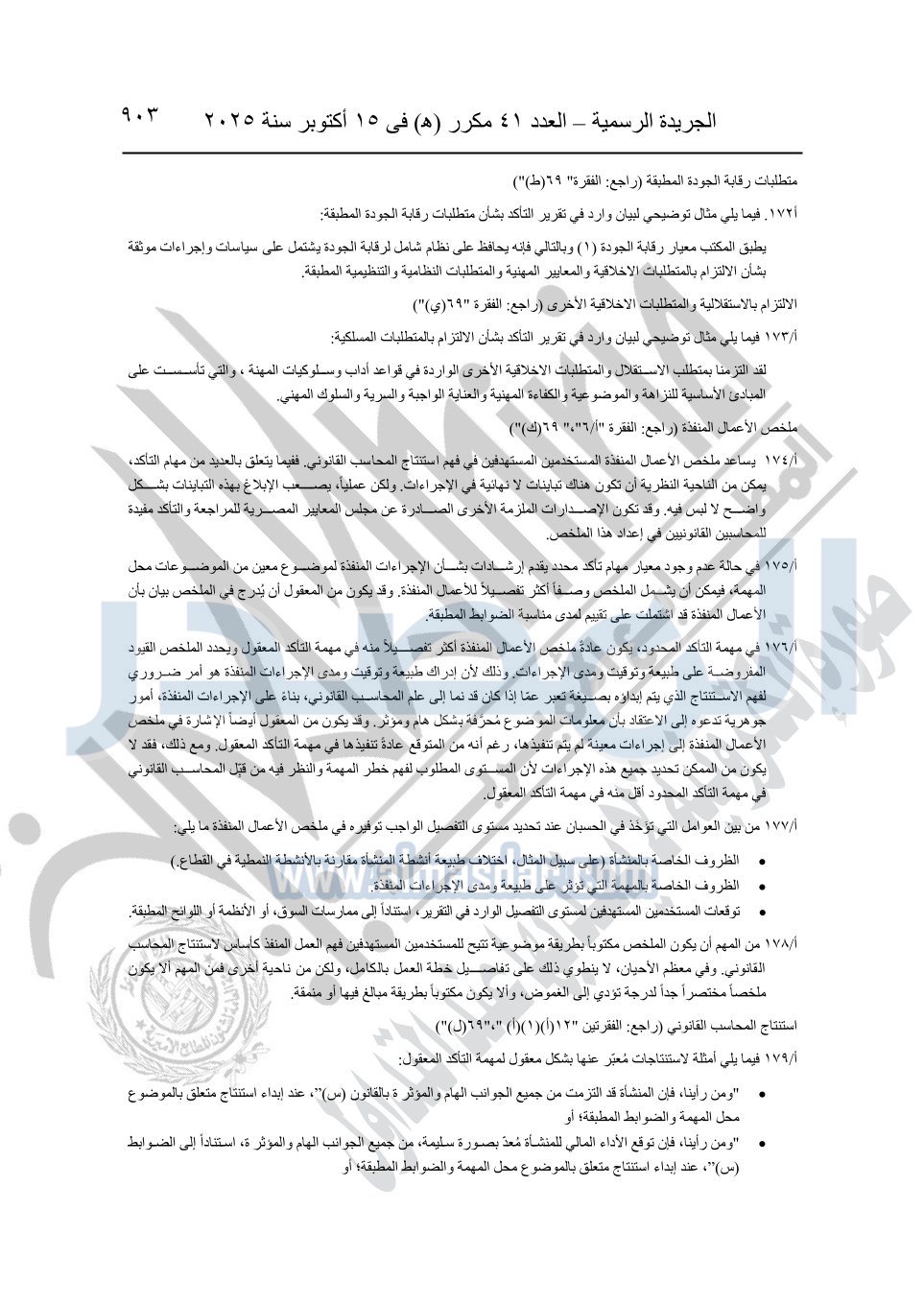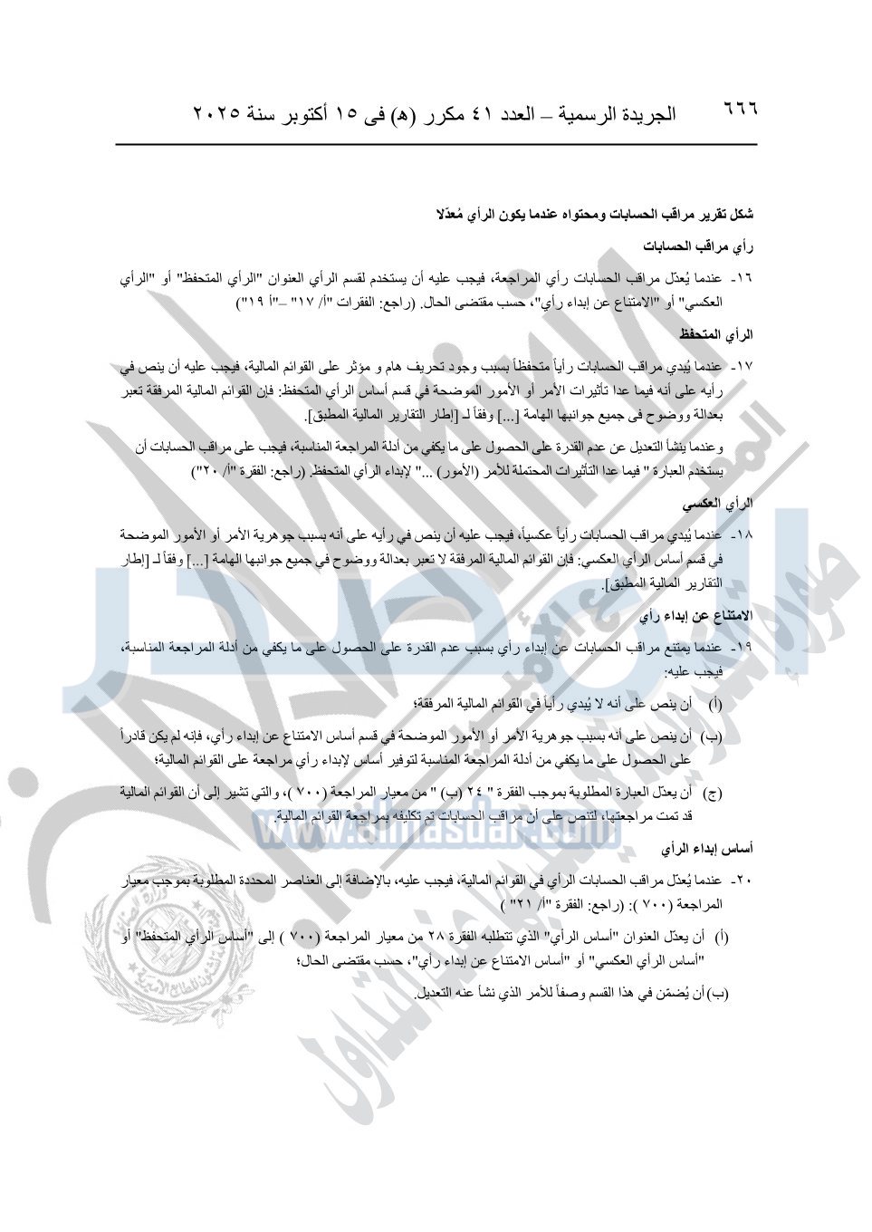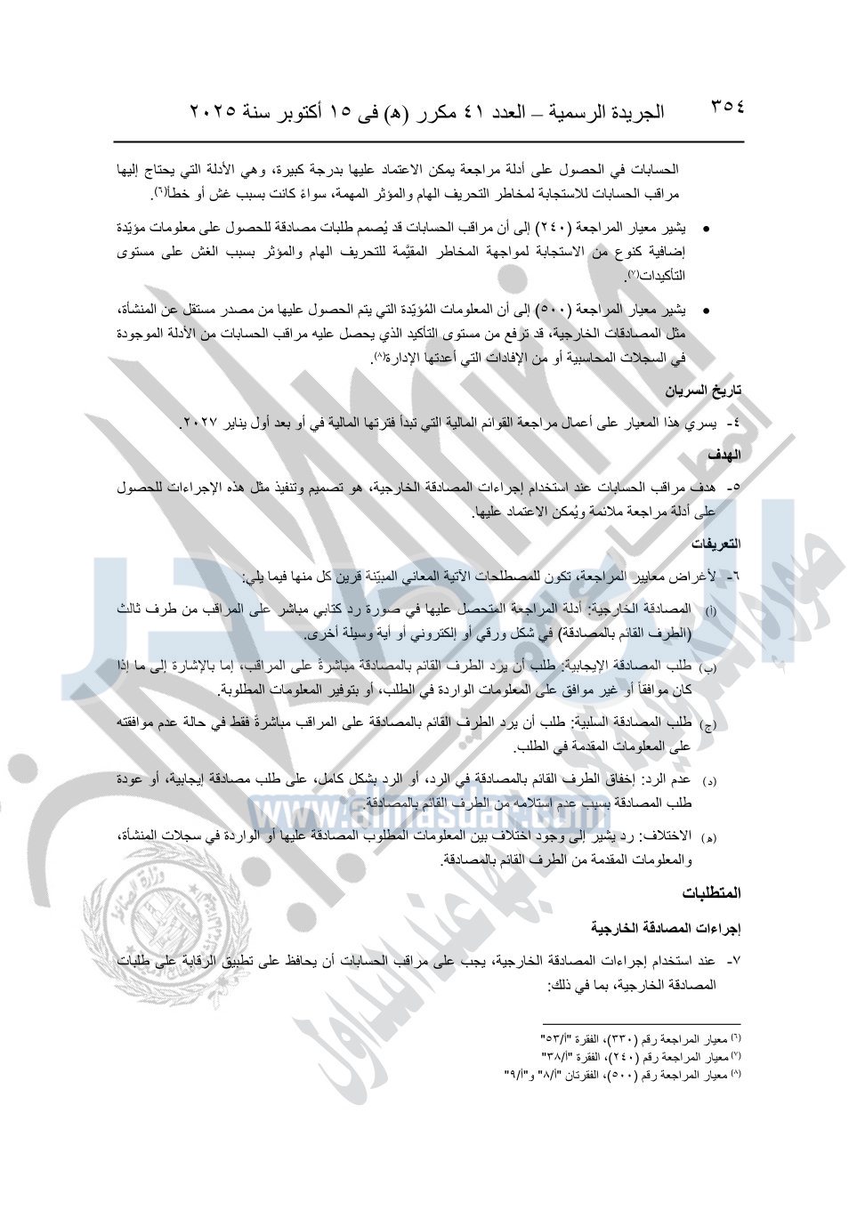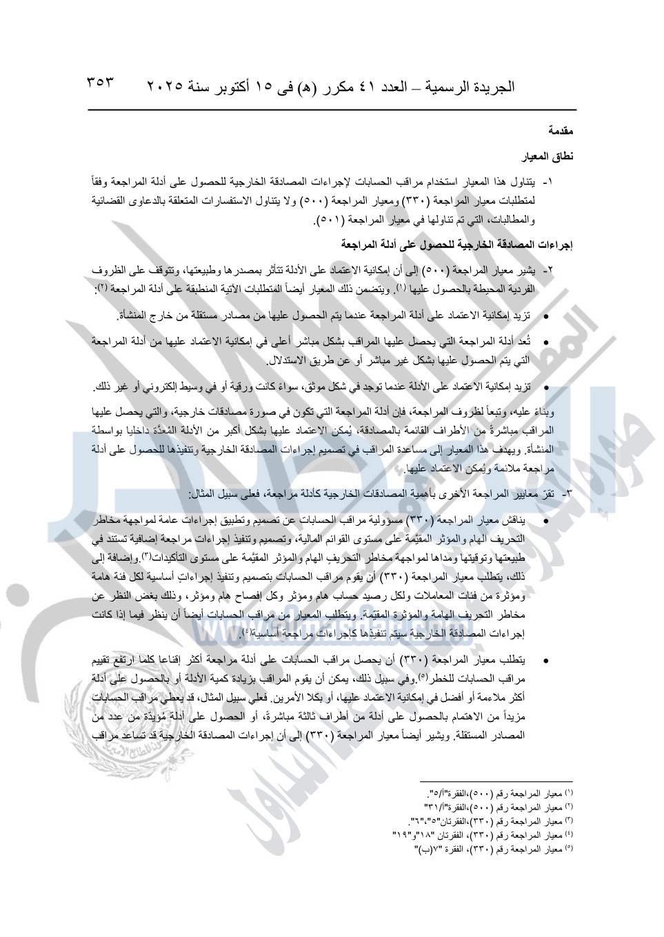 نشرت الجريدة الرسمية في العدد 41 مكرر "هـ" الصادر في 15 أكتوبر سنة 2025، قرار رئيس مجلس الوزراء رقم 3725 لسنة 2025، بشأن العمل بالمعايير المصرية للمراجعة والفحص المحدود ومهام التأكد الأخرى المرافقة لهذا القرار.