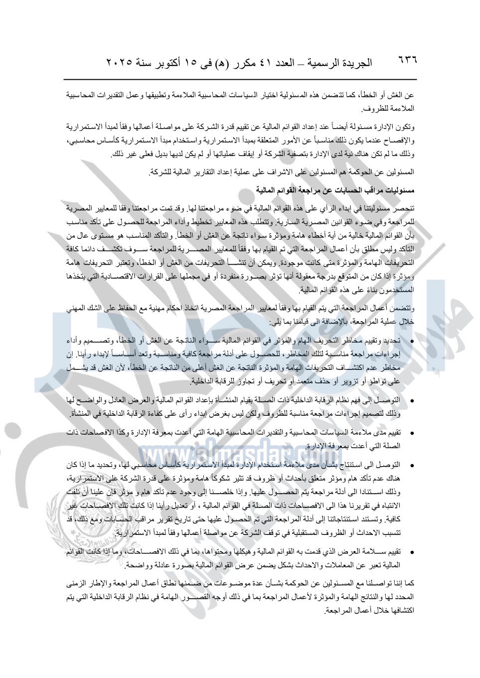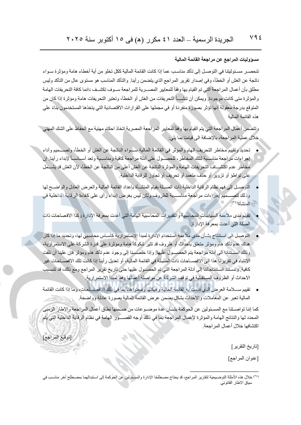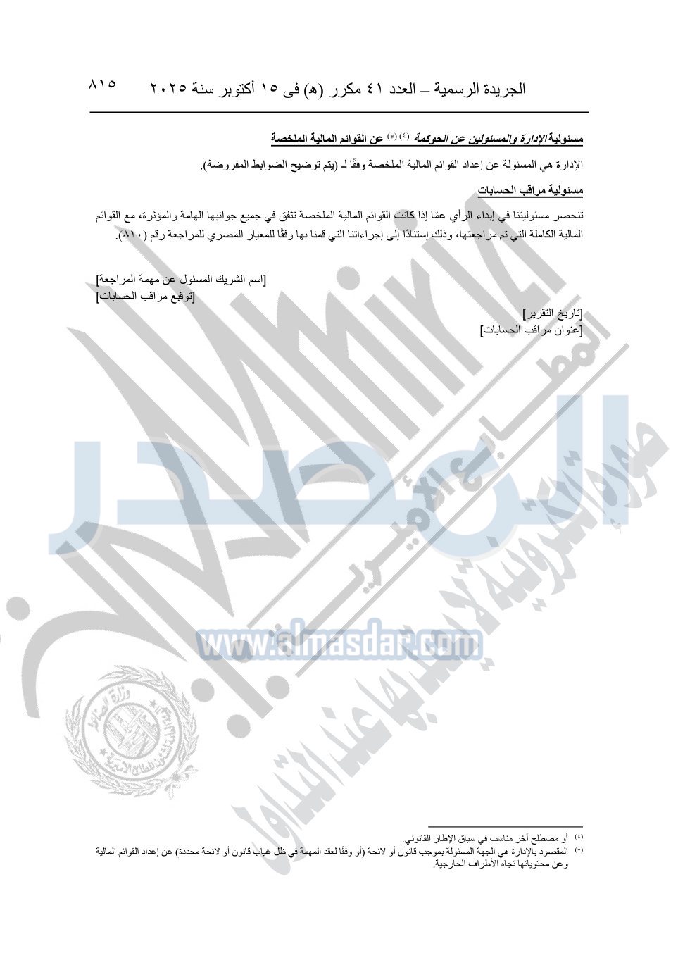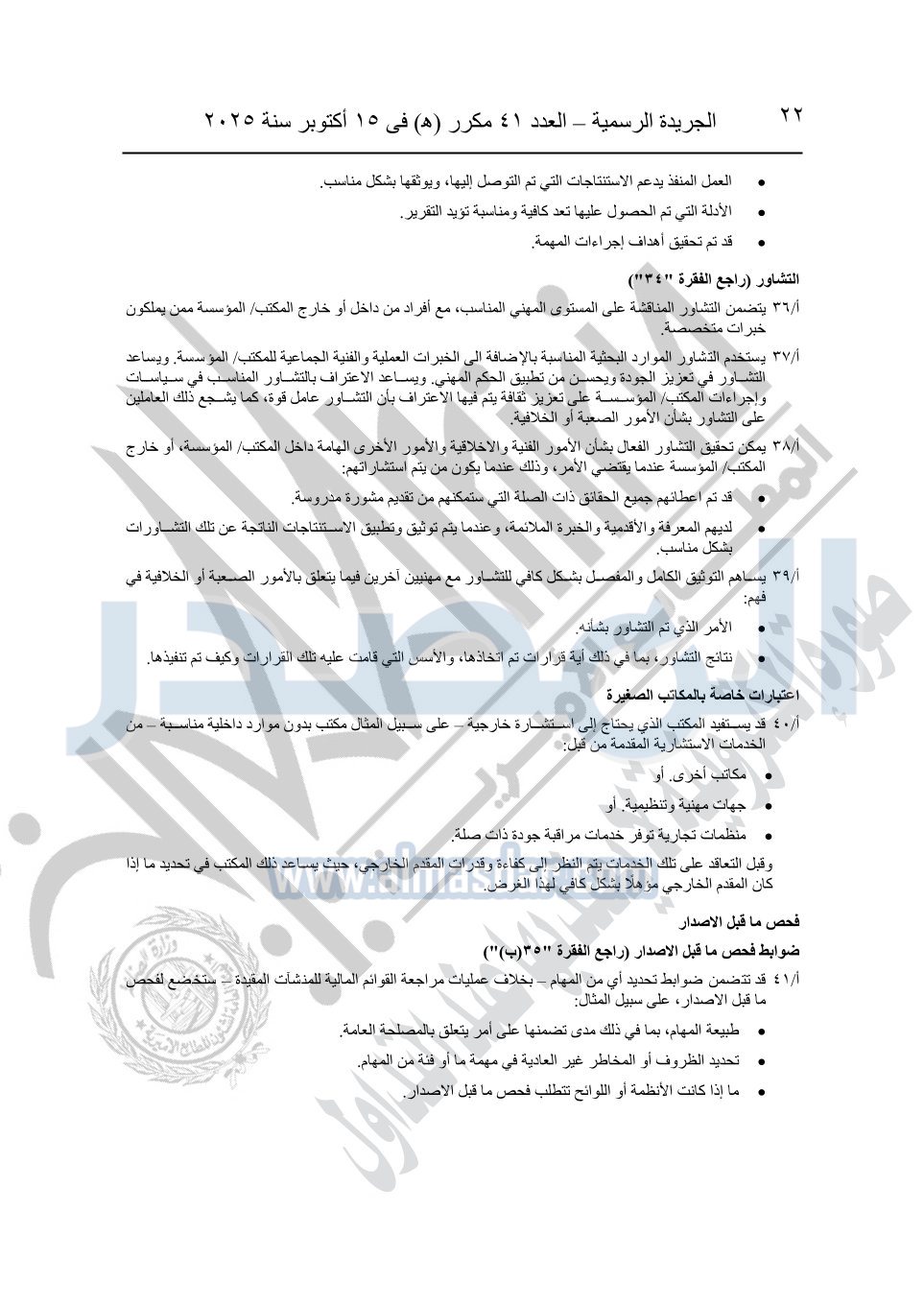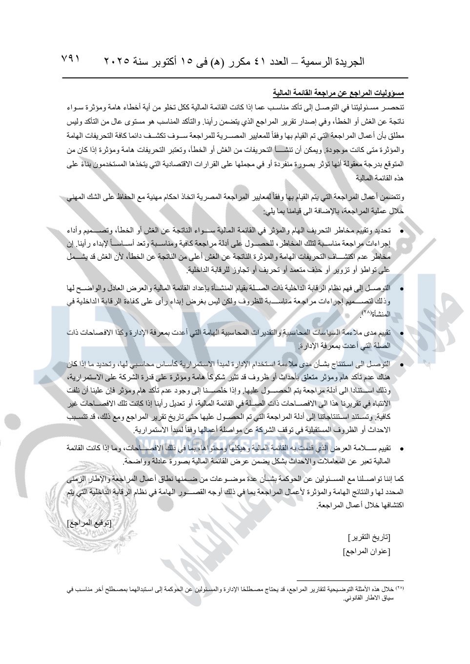 نشرت الجريدة الرسمية في العدد 41 مكرر "هـ" الصادر في 15 أكتوبر سنة 2025، قرار رئيس مجلس الوزراء رقم 3725 لسنة 2025، بشأن العمل بالمعايير المصرية للمراجعة والفحص المحدود ومهام التأكد الأخرى المرافقة لهذا القرار.