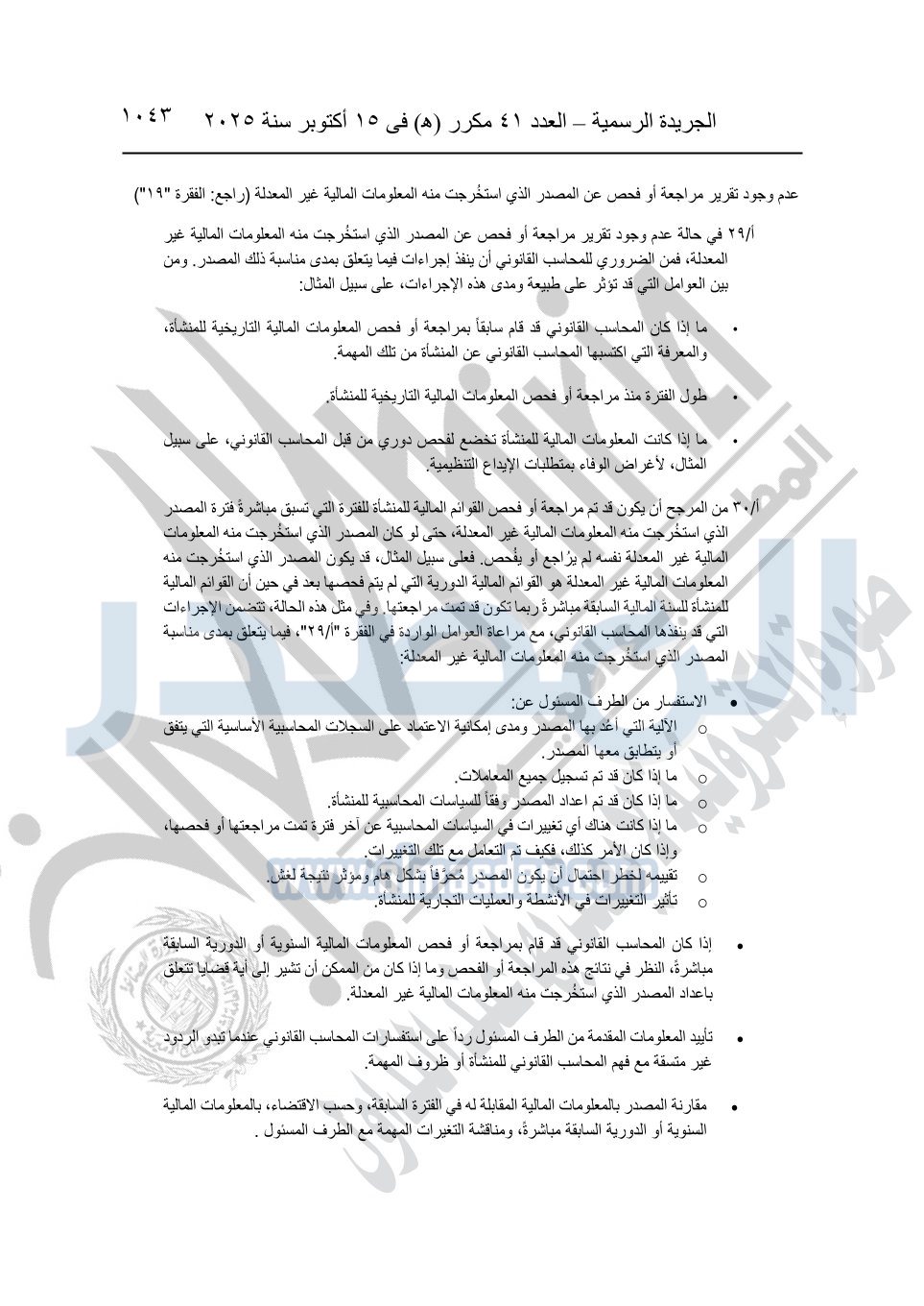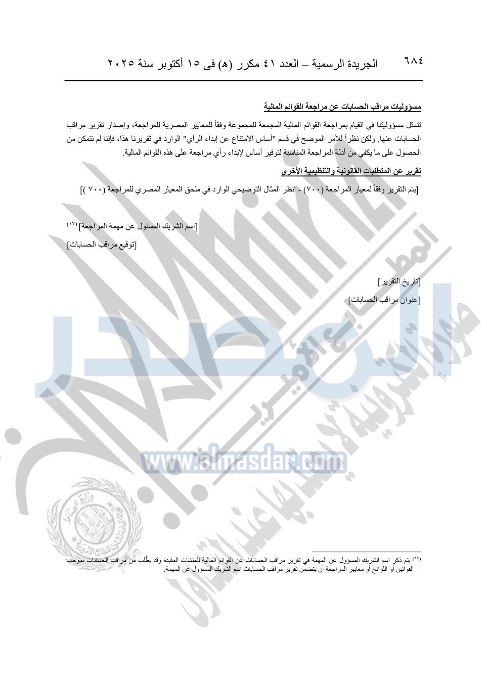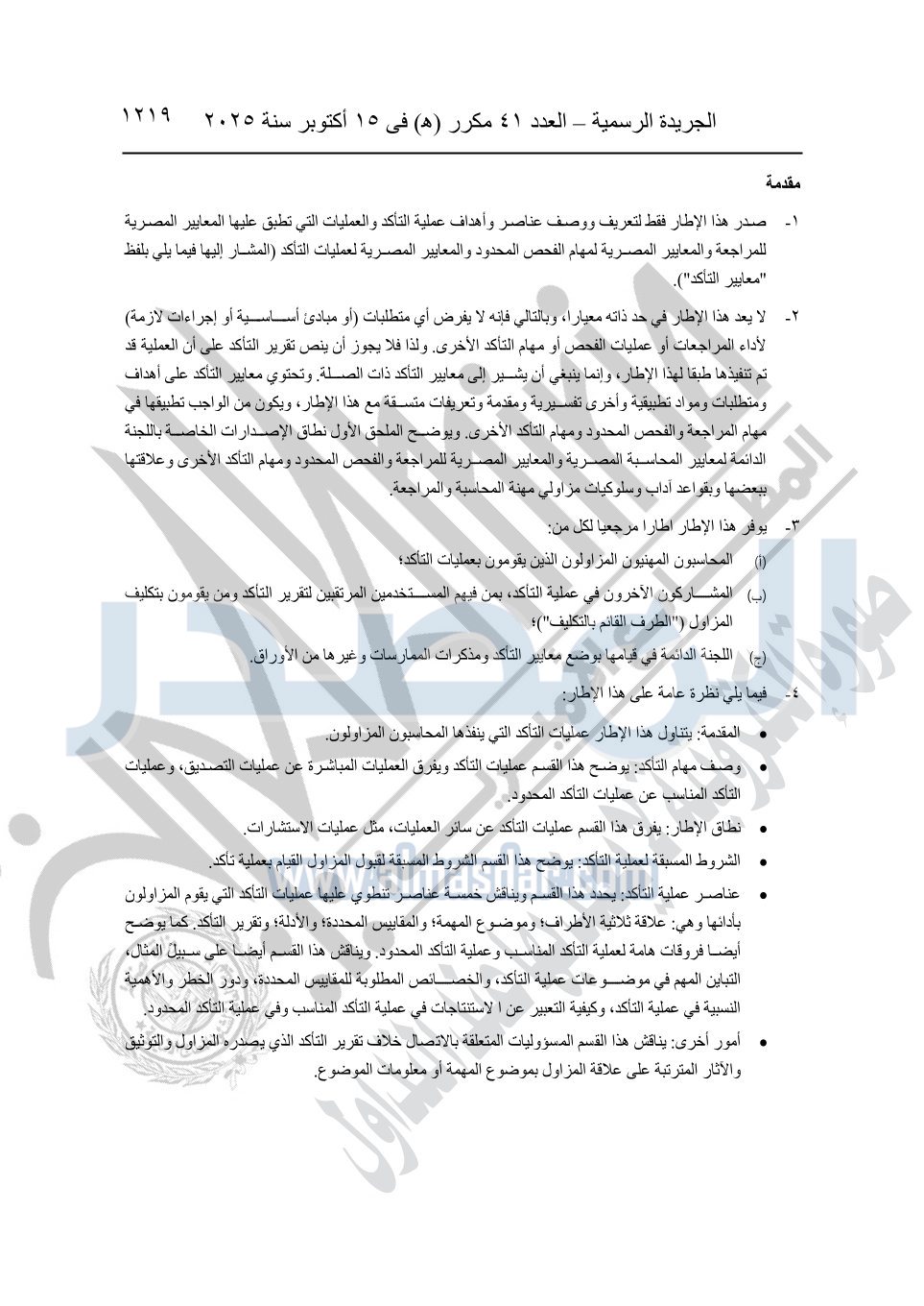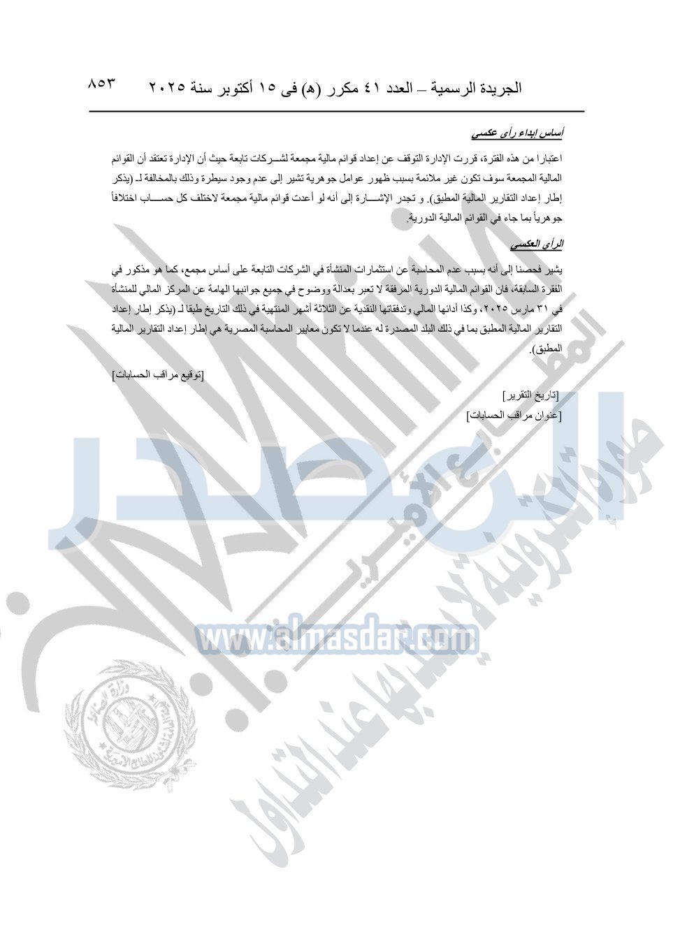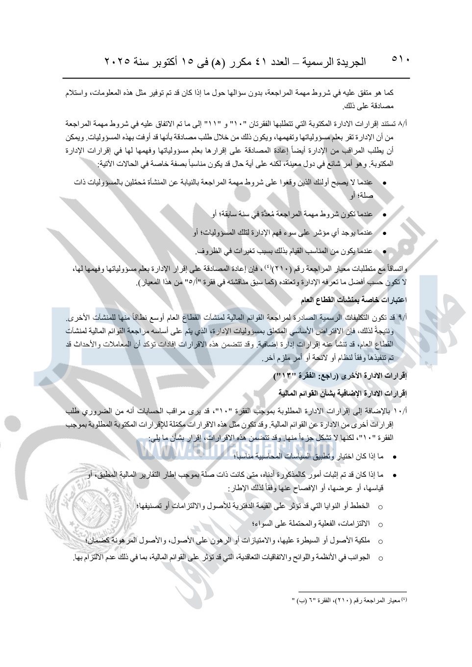 نشرت الجريدة الرسمية في العدد 41 مكرر "هـ" الصادر في 15 أكتوبر سنة 2025، قرار رئيس مجلس الوزراء رقم 3725 لسنة 2025، بشأن العمل بالمعايير المصرية للمراجعة والفحص المحدود ومهام التأكد الأخرى المرافقة لهذا القرار.
