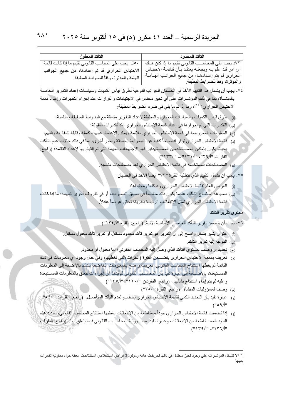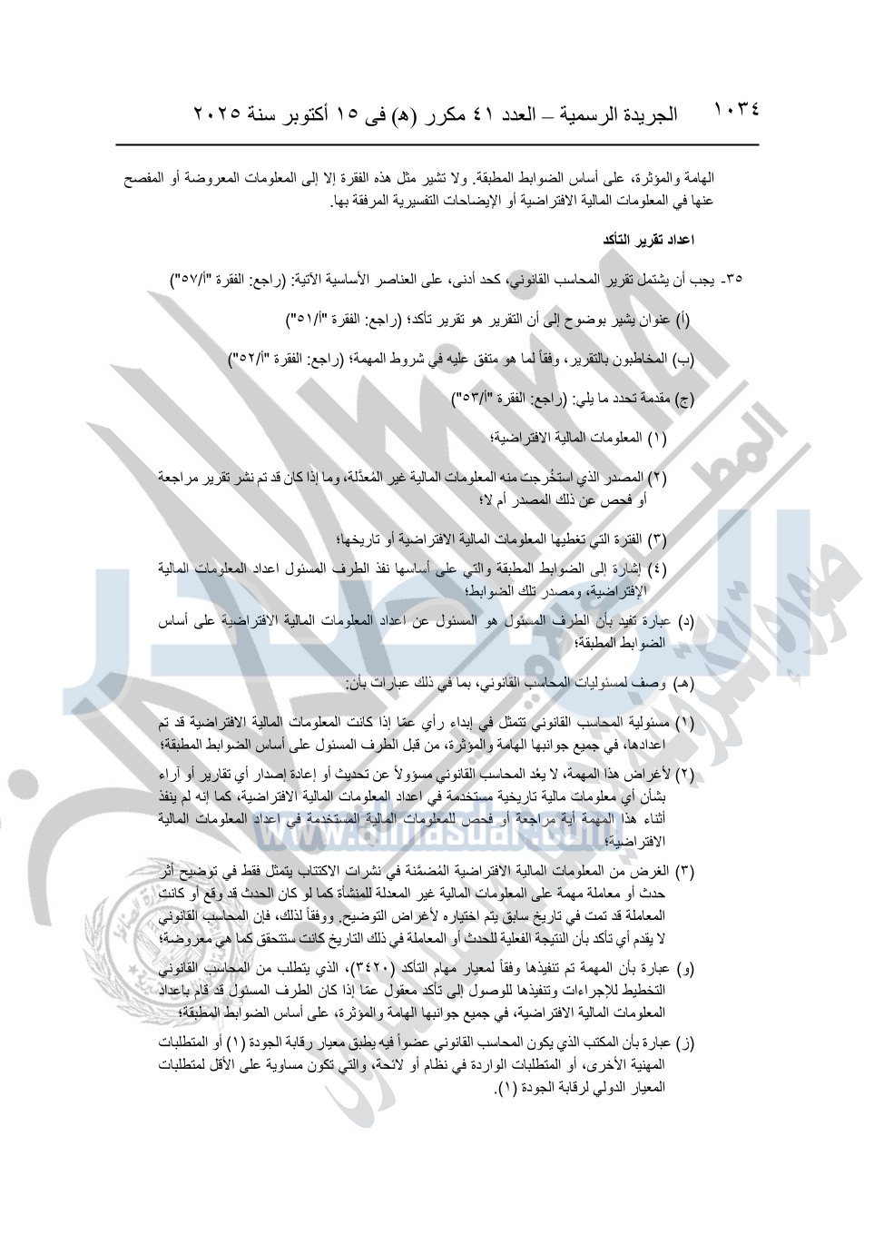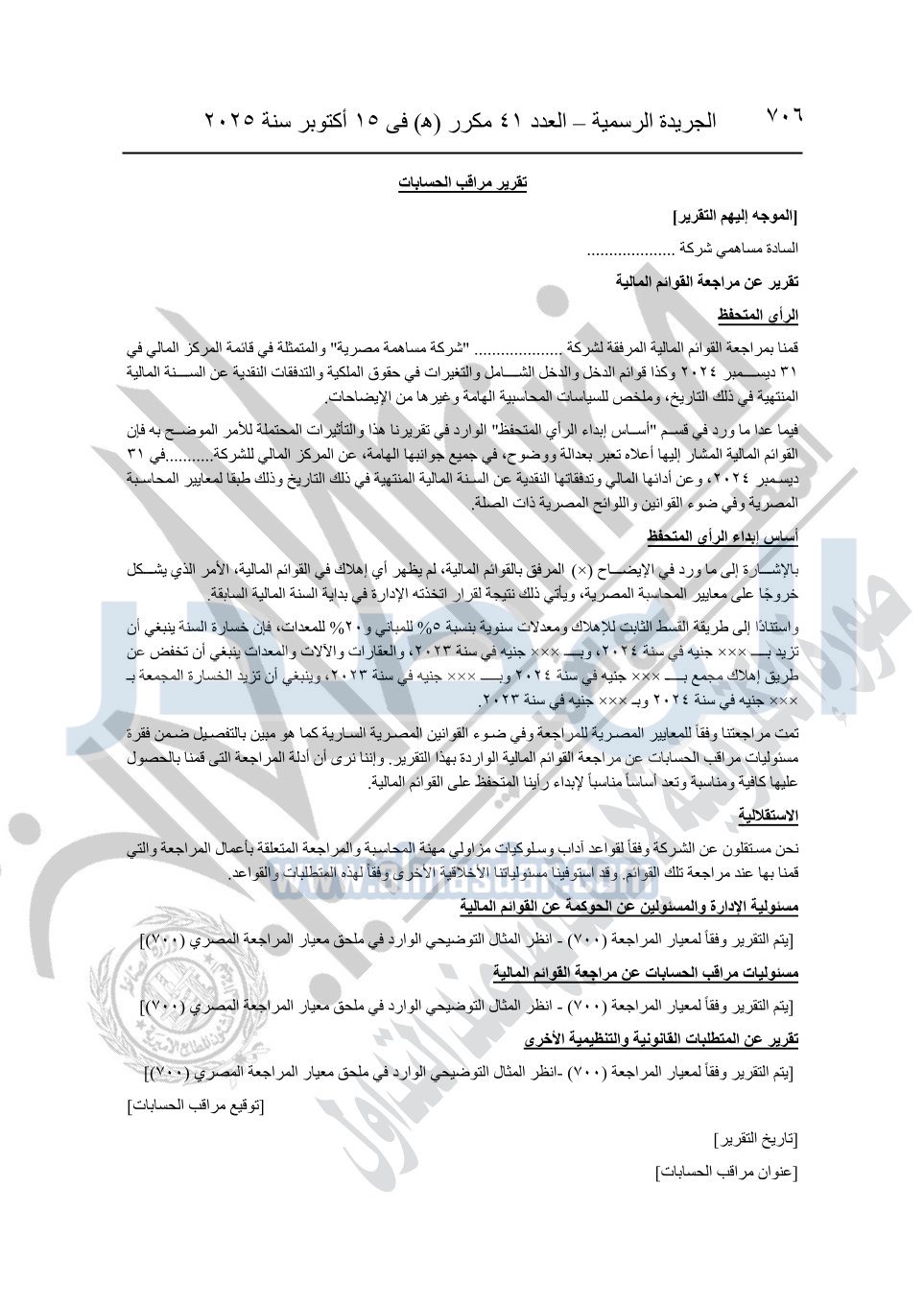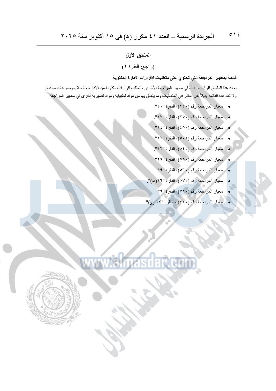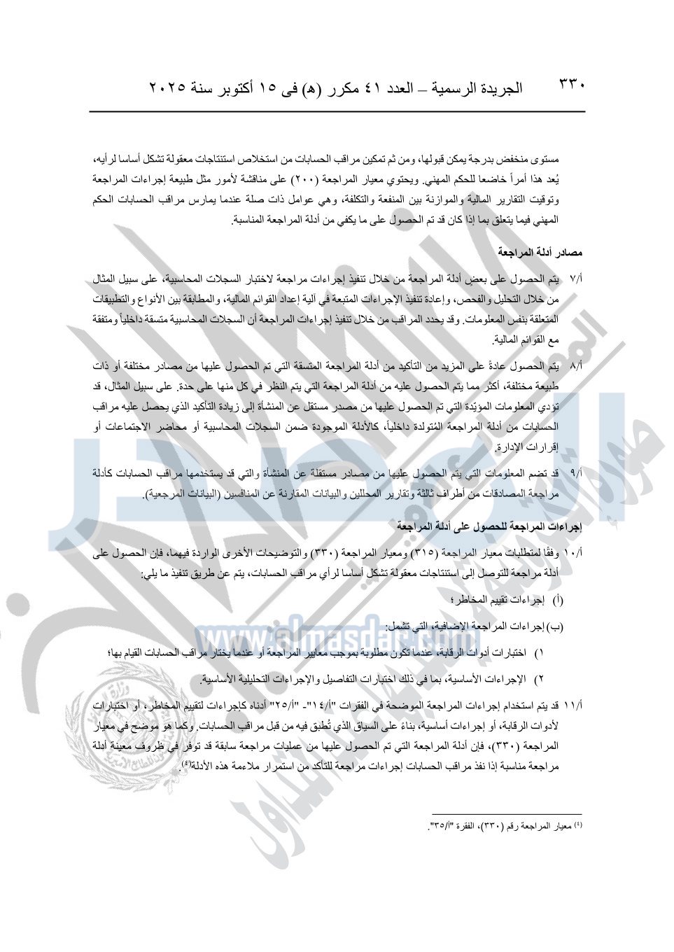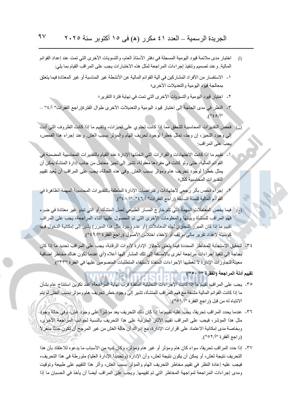 نشرت الجريدة الرسمية في العدد 41 مكرر "هـ" الصادر في 15 أكتوبر سنة 2025، قرار رئيس مجلس الوزراء رقم 3725 لسنة 2025، بشأن العمل بالمعايير المصرية للمراجعة والفحص المحدود ومهام التأكد الأخرى المرافقة لهذا القرار.
