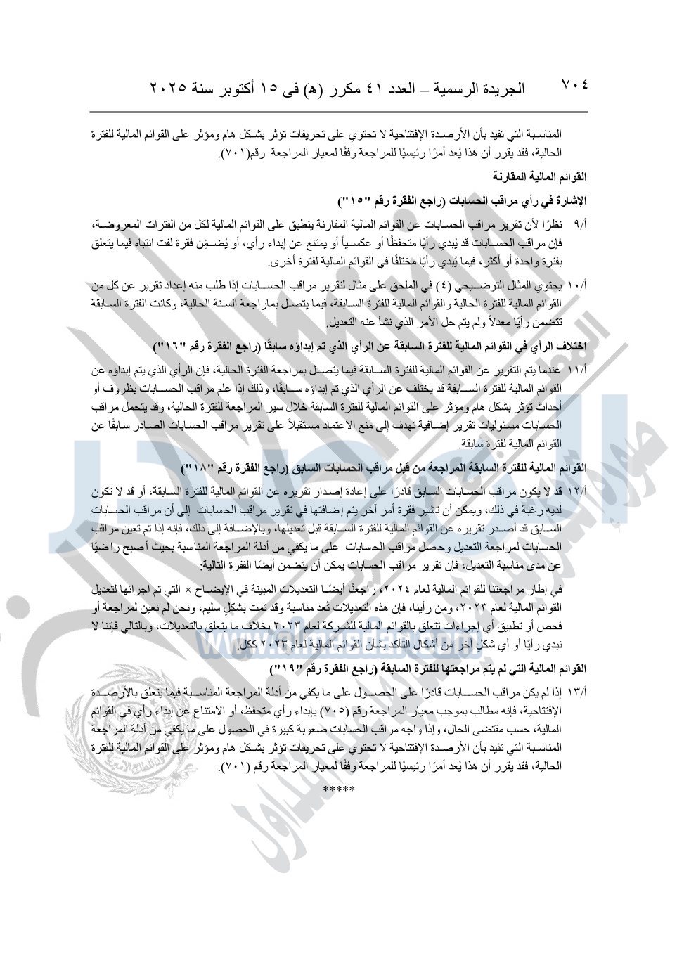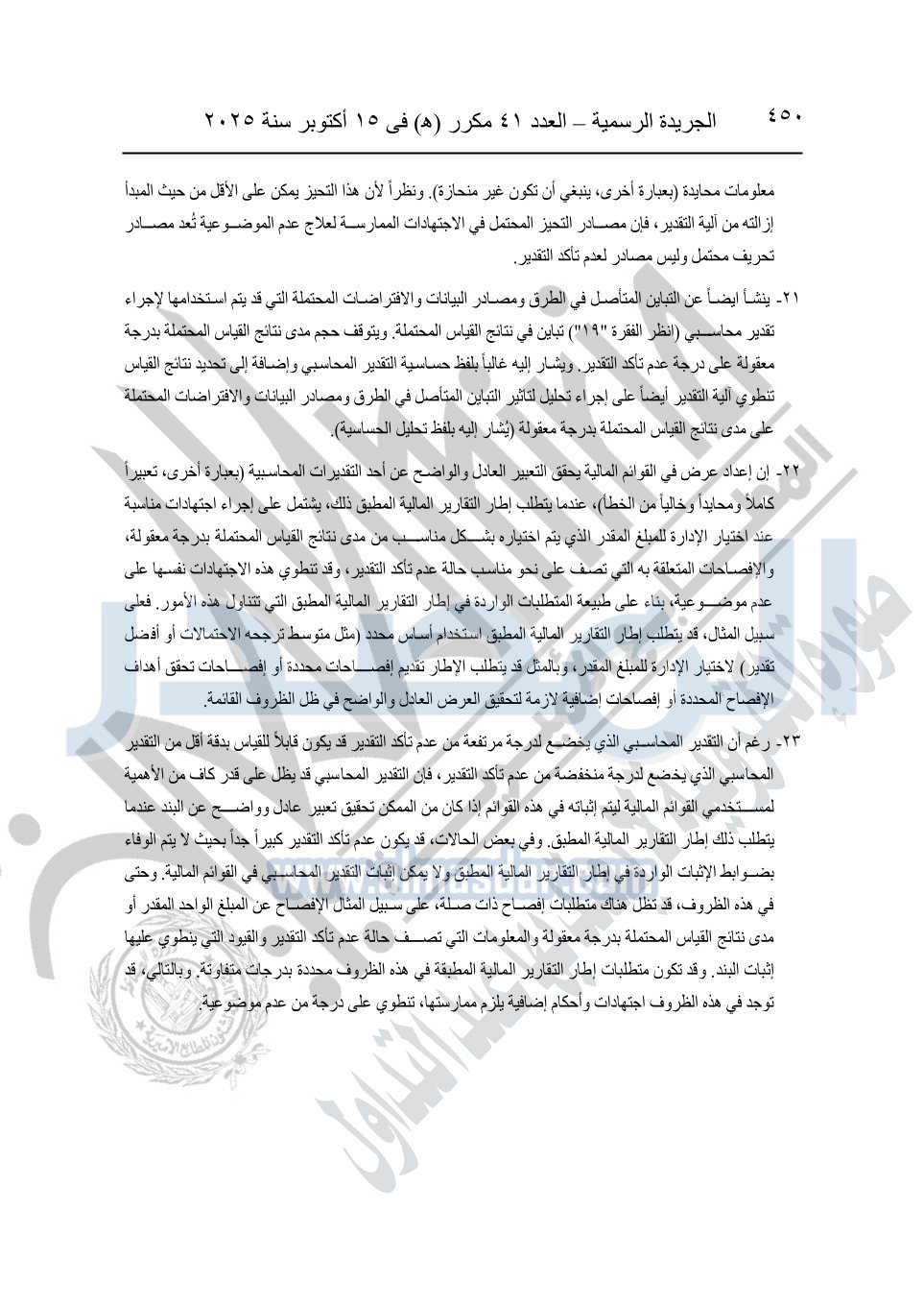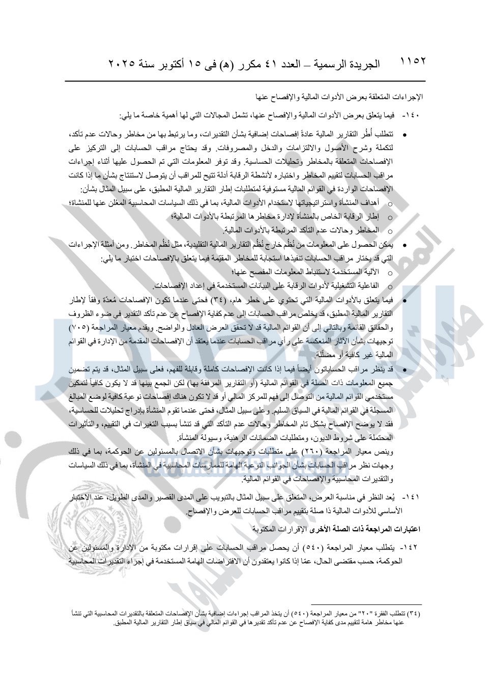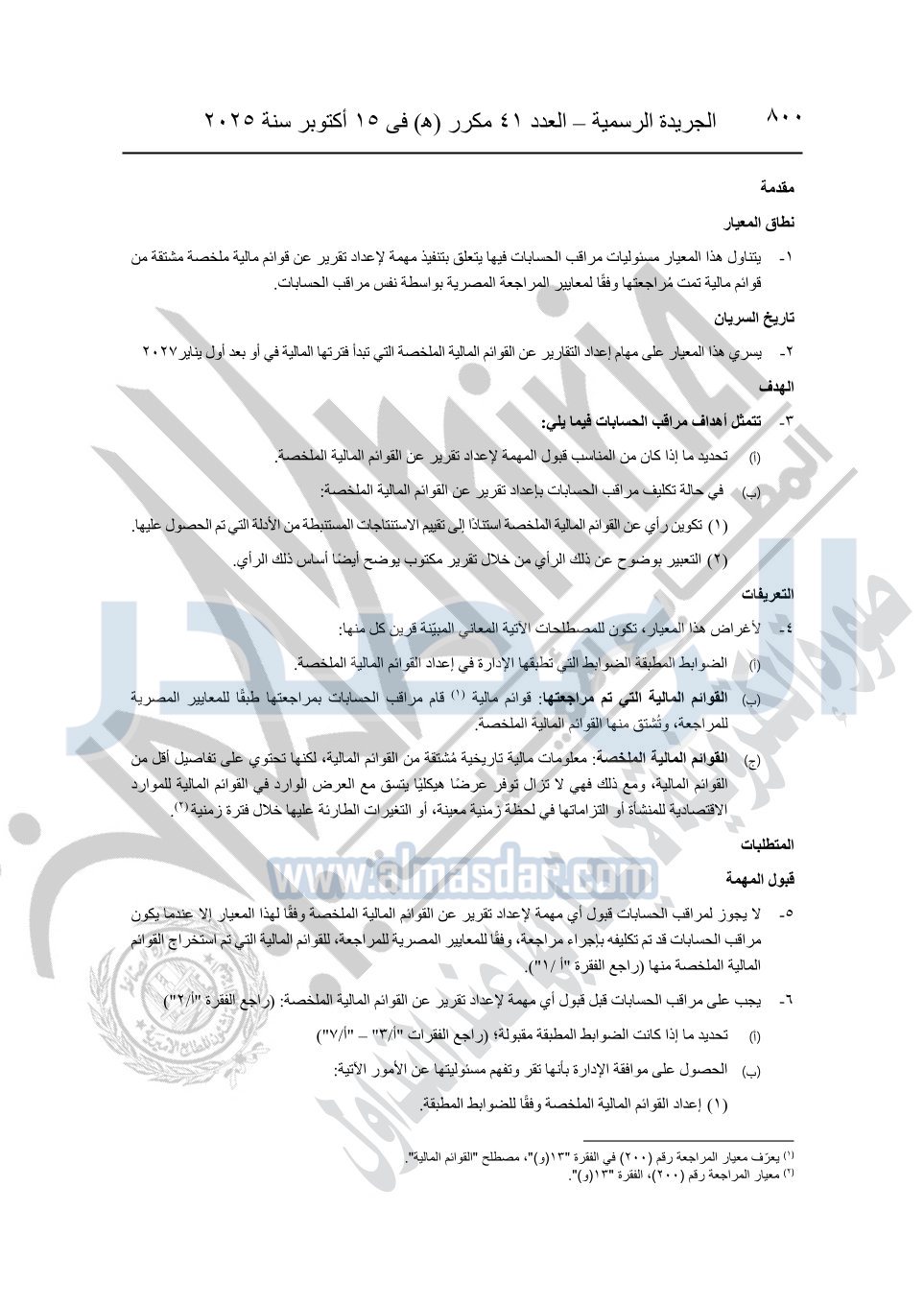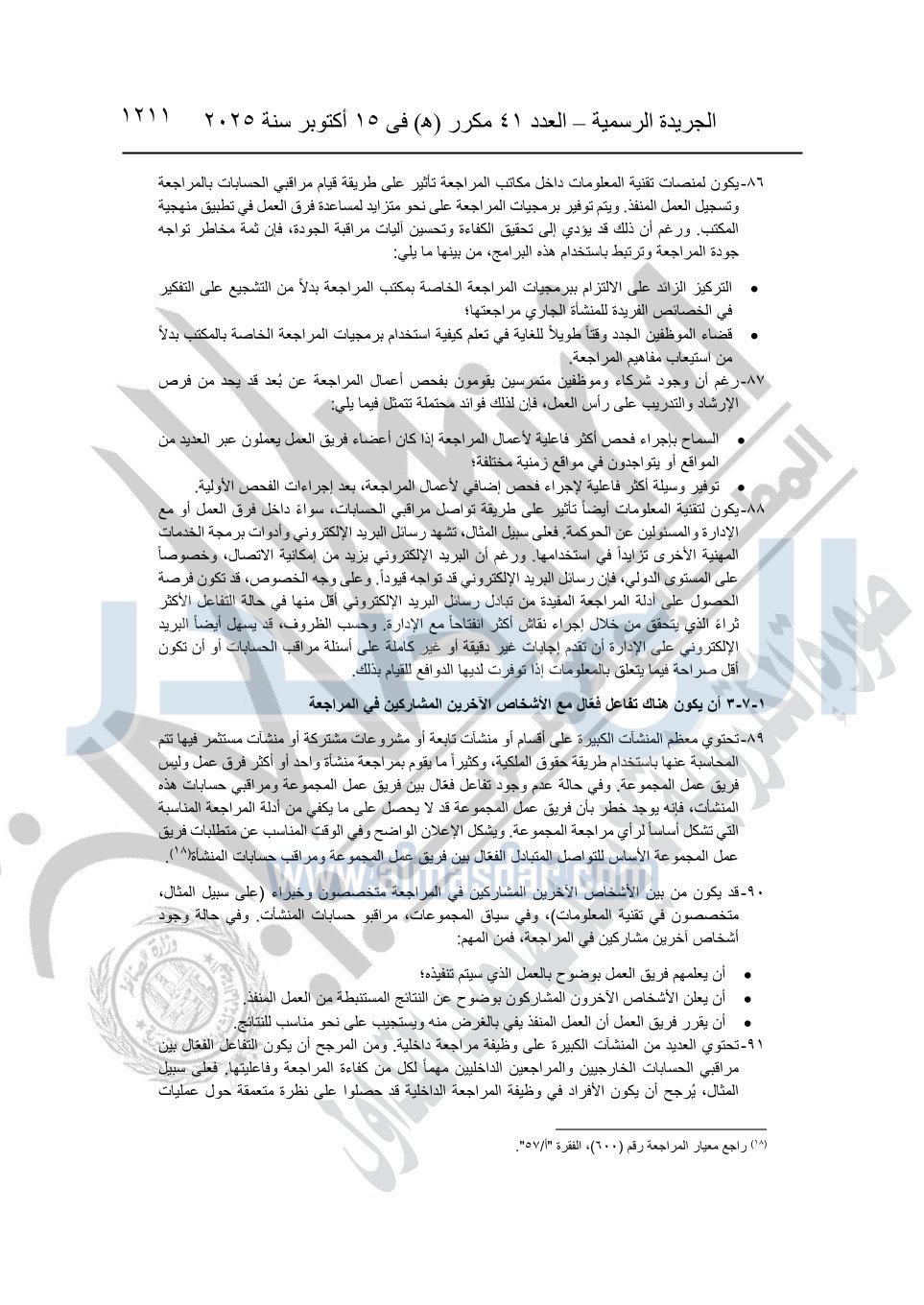 نشرت الجريدة الرسمية في العدد 41 مكرر "هـ" الصادر في 15 أكتوبر سنة 2025، قرار رئيس مجلس الوزراء رقم 3725 لسنة 2025، بشأن العمل بالمعايير المصرية للمراجعة والفحص المحدود ومهام التأكد الأخرى المرافقة لهذا القرار.