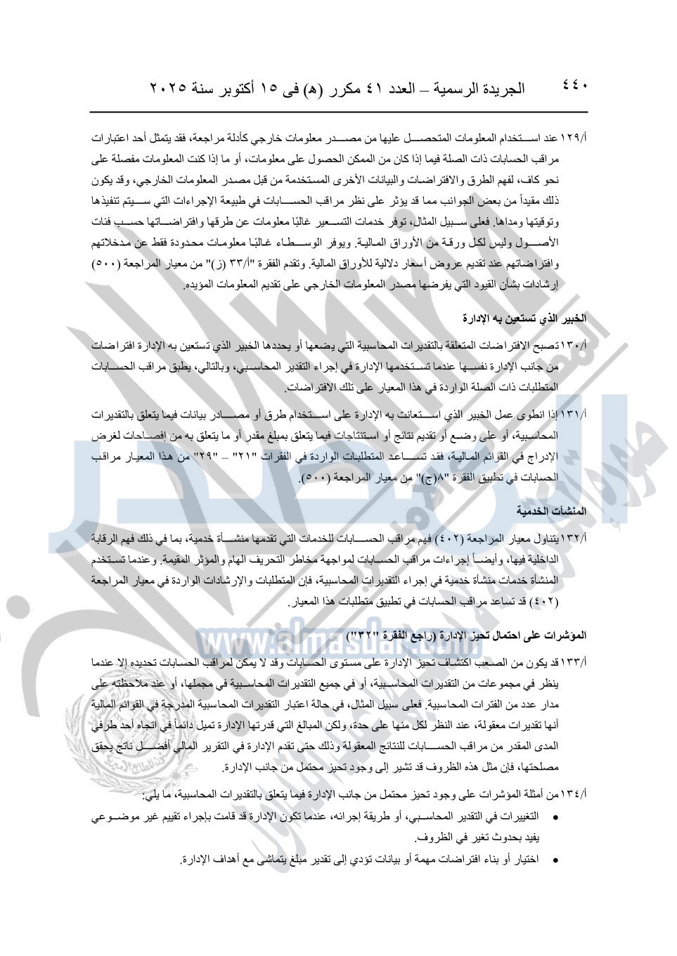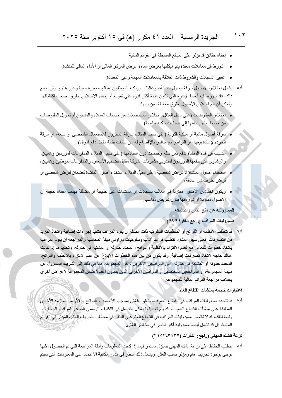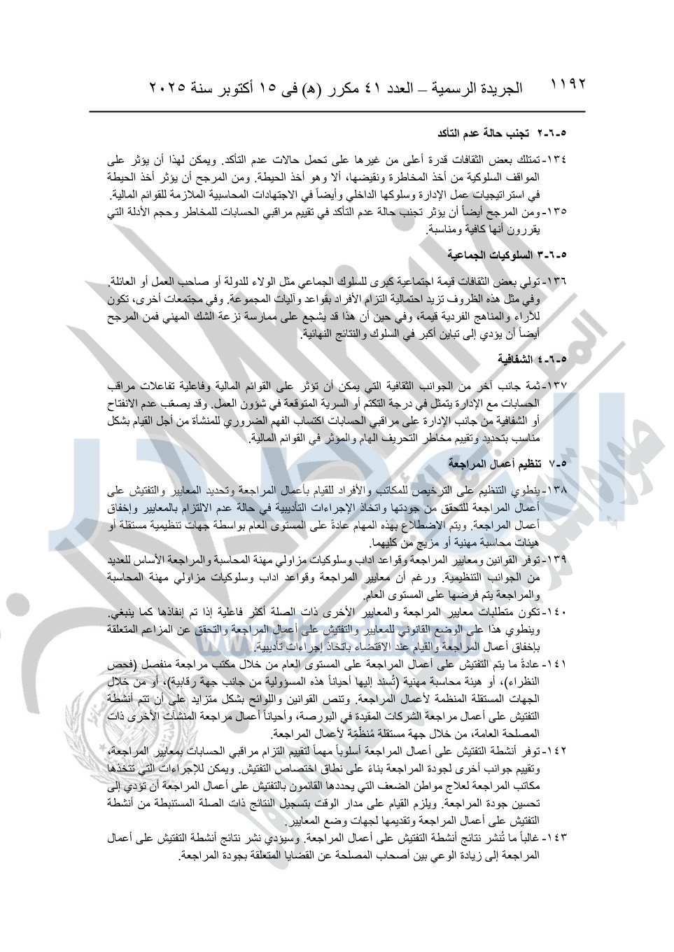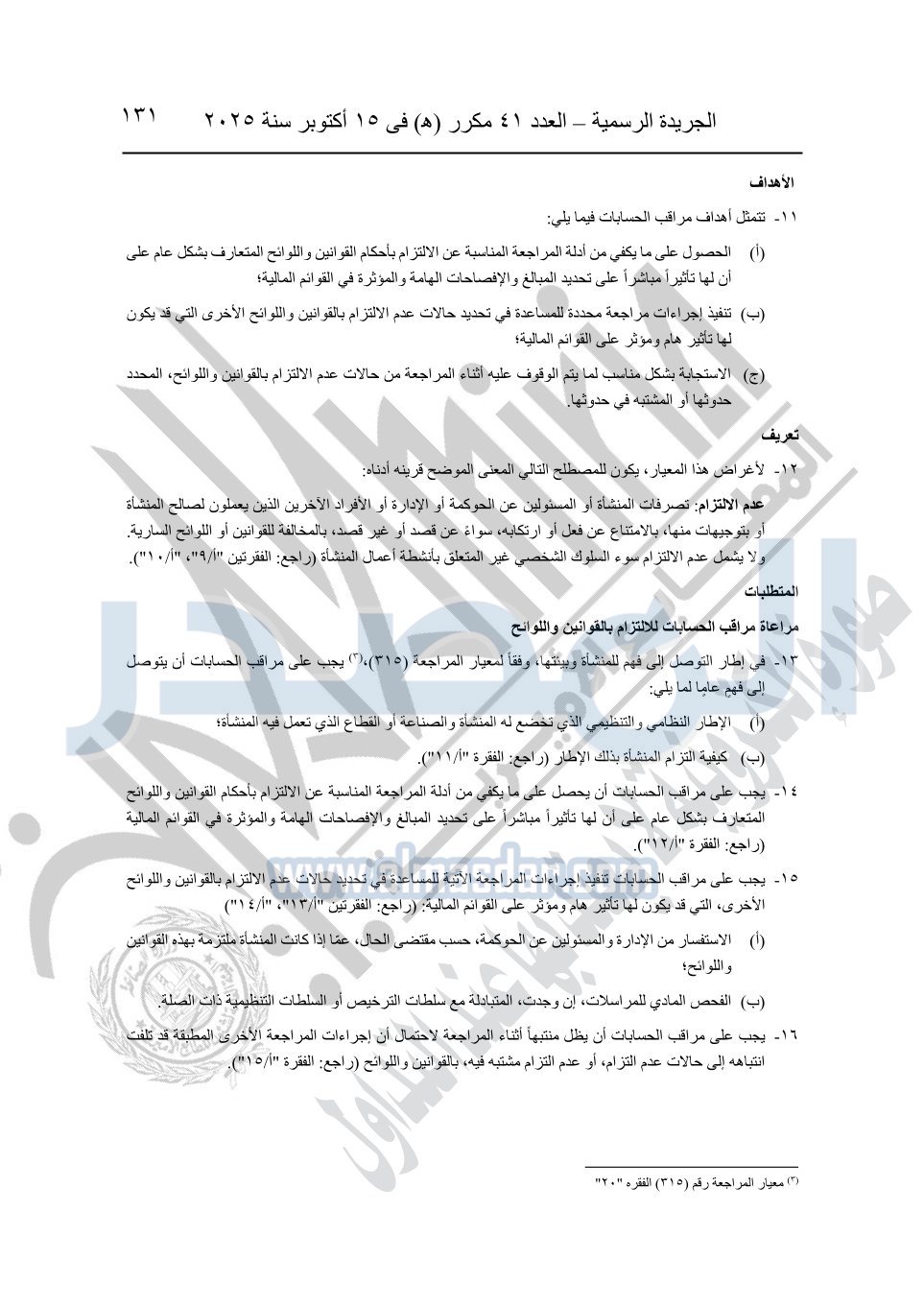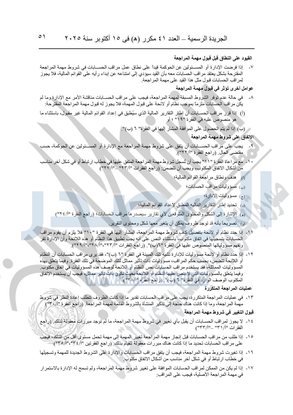 نشرت الجريدة الرسمية في العدد 41 مكرر "هـ" الصادر في 15 أكتوبر سنة 2025، قرار رئيس مجلس الوزراء رقم 3725 لسنة 2025، بشأن العمل بالمعايير المصرية للمراجعة والفحص المحدود ومهام التأكد الأخرى المرافقة لهذا القرار.
