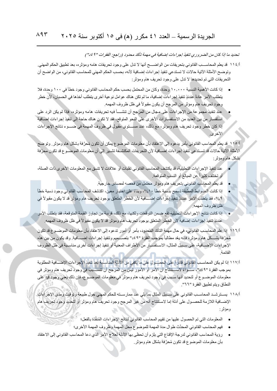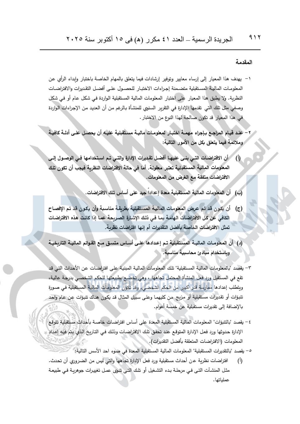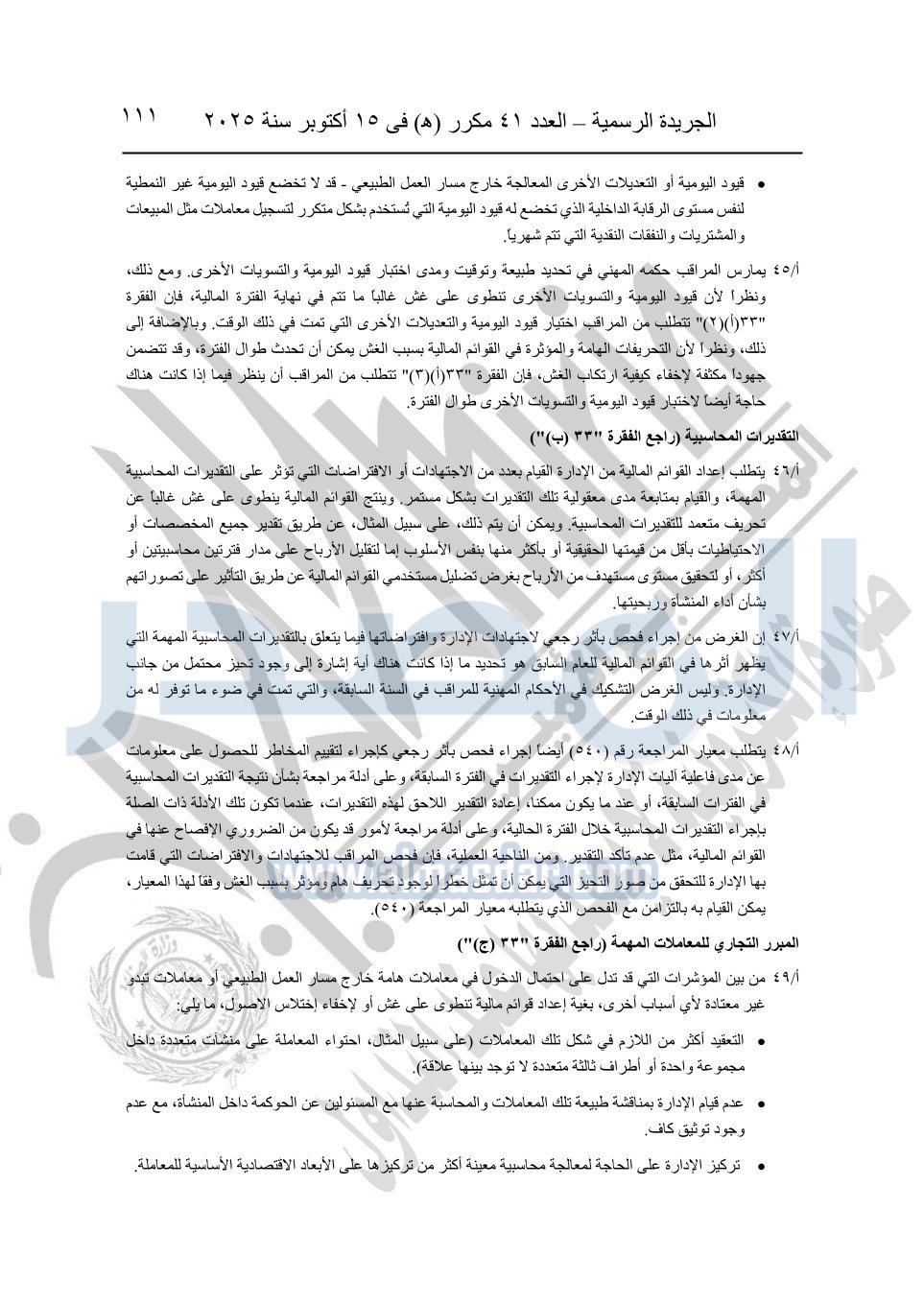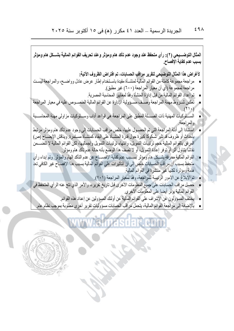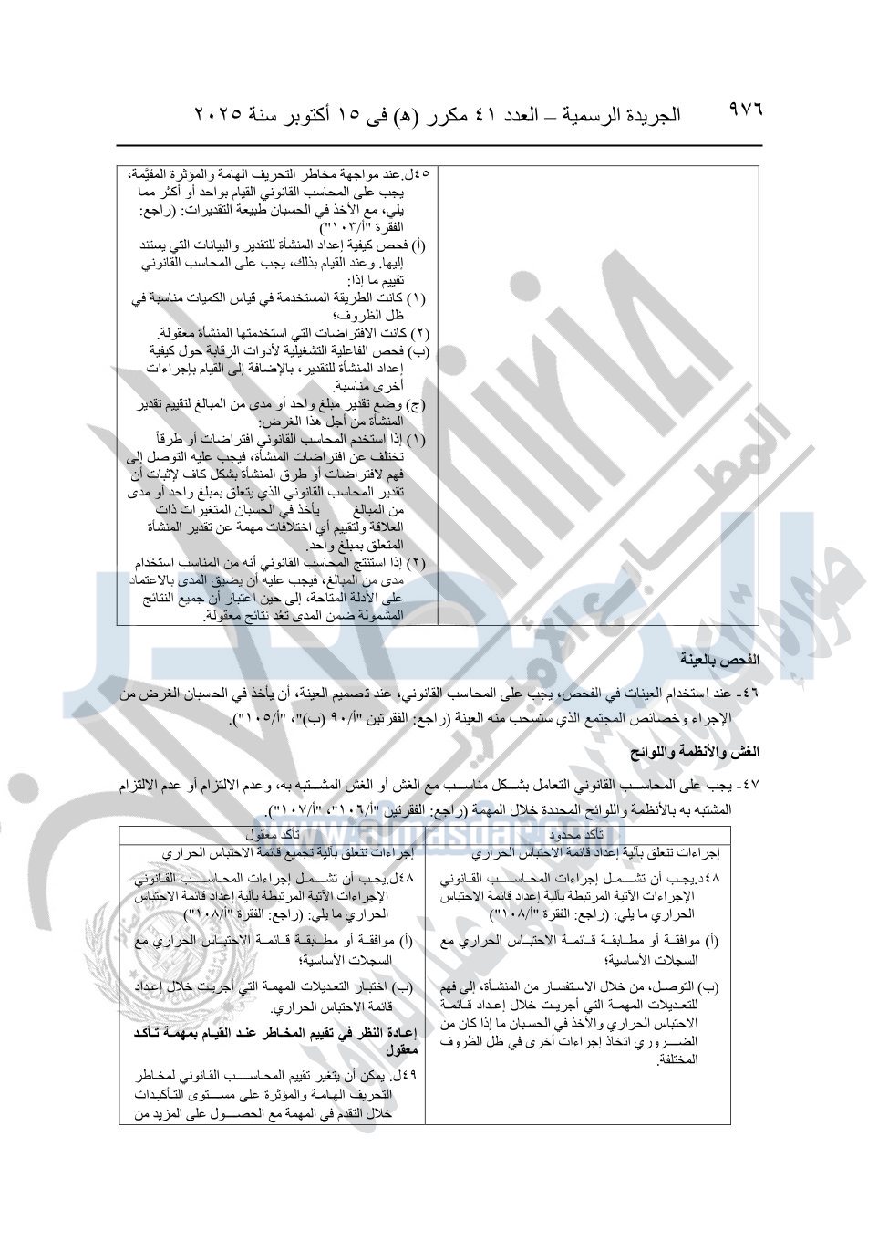 نشرت الجريدة الرسمية في العدد 41 مكرر "هـ" الصادر في 15 أكتوبر سنة 2025، قرار رئيس مجلس الوزراء رقم 3725 لسنة 2025، بشأن العمل بالمعايير المصرية للمراجعة والفحص المحدود ومهام التأكد الأخرى المرافقة لهذا القرار.
