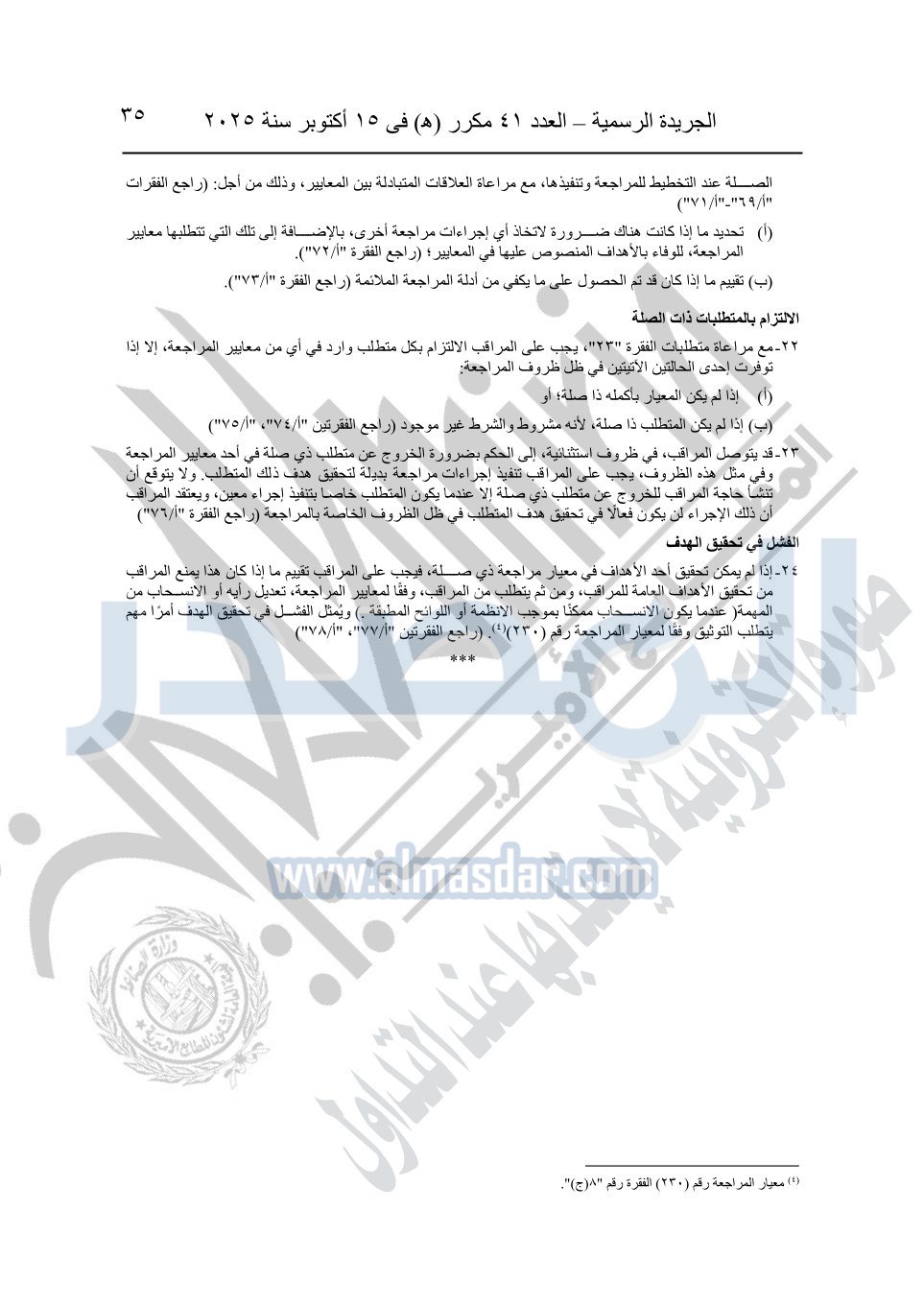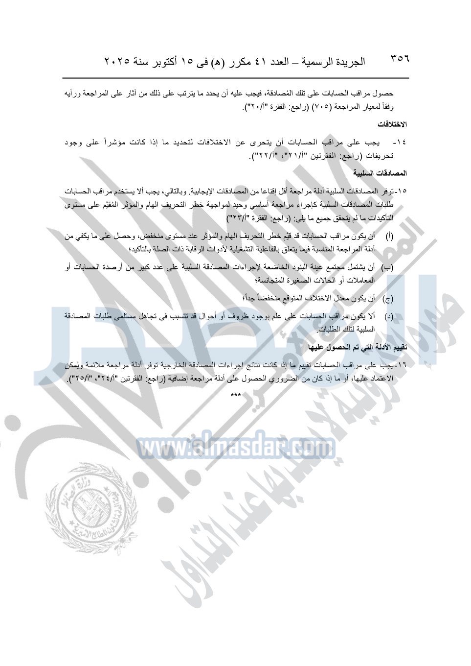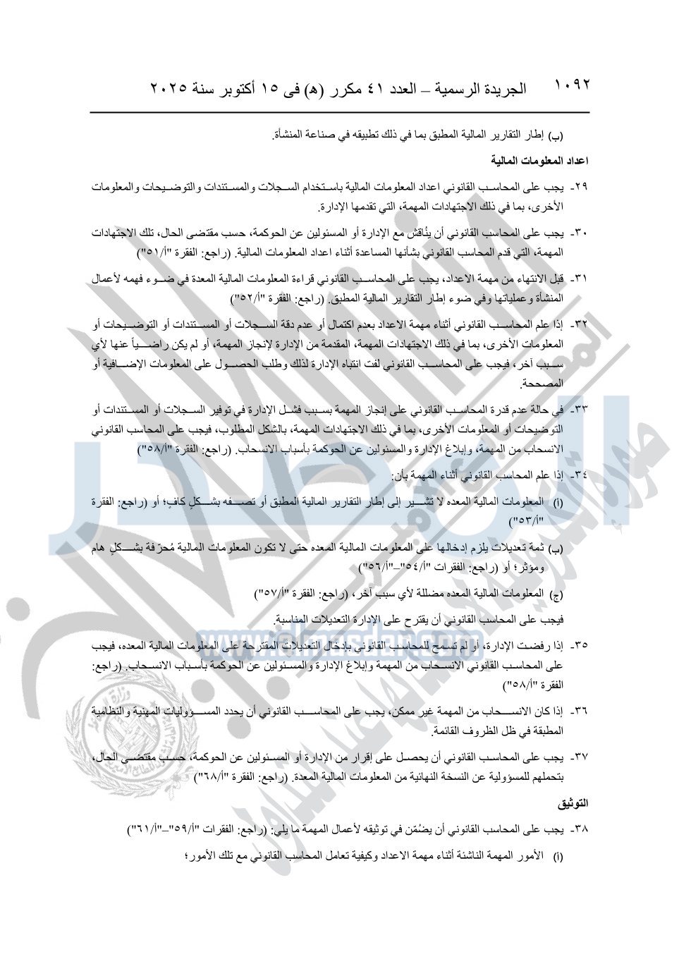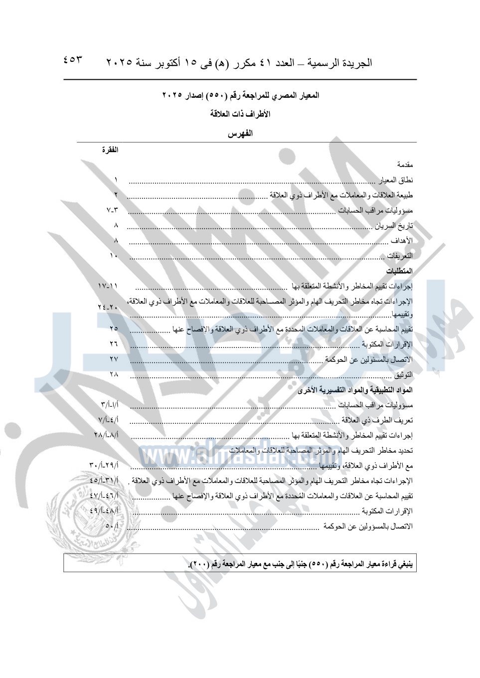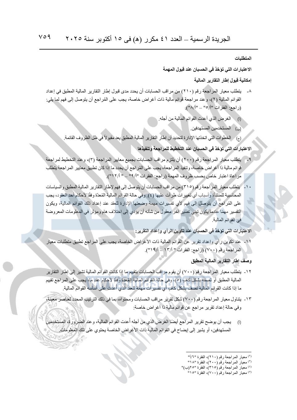 نشرت الجريدة الرسمية في العدد 41 مكرر "هـ" الصادر في 15 أكتوبر سنة 2025، قرار رئيس مجلس الوزراء رقم 3725 لسنة 2025، بشأن العمل بالمعايير المصرية للمراجعة والفحص المحدود ومهام التأكد الأخرى المرافقة لهذا القرار.