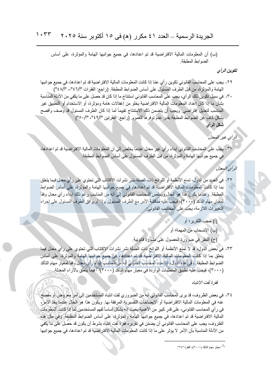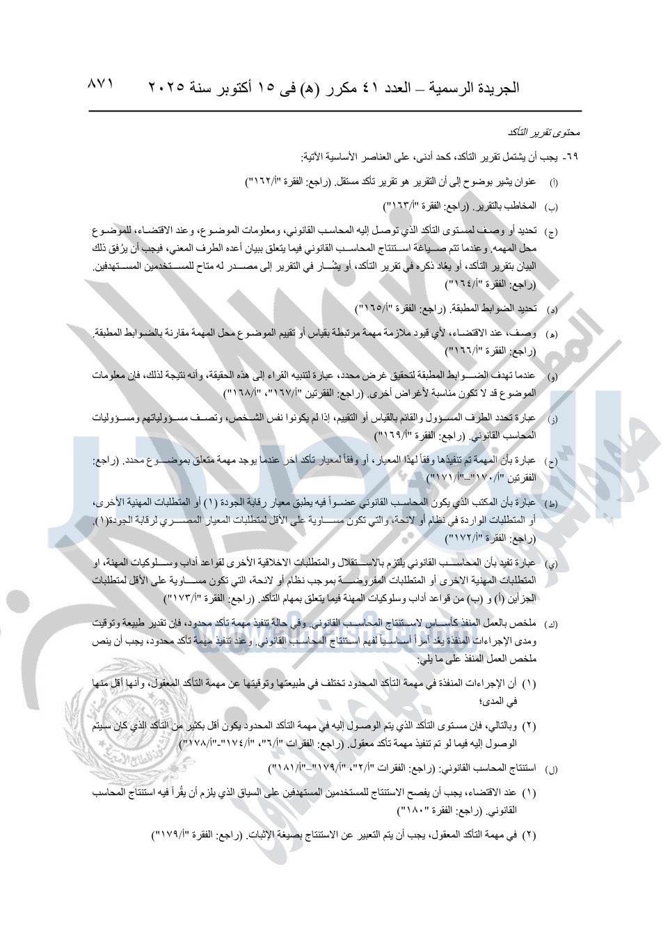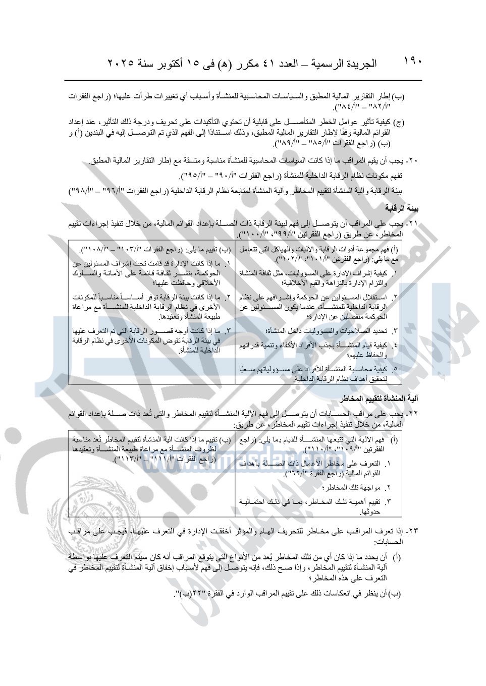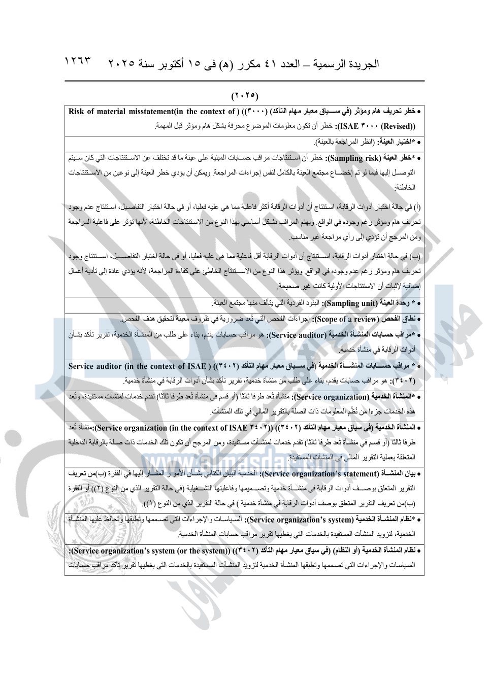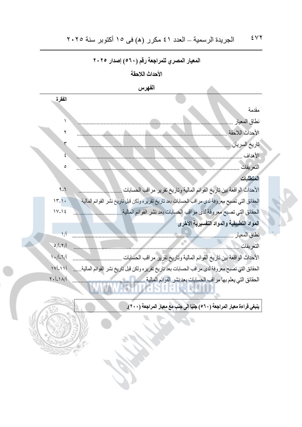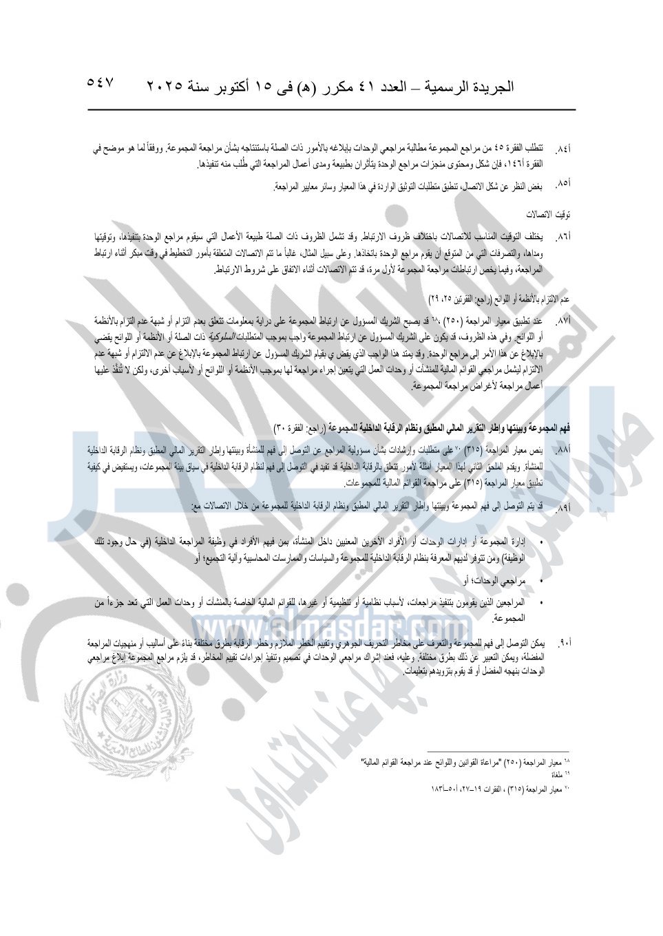 نشرت الجريدة الرسمية في العدد 41 مكرر "هـ" الصادر في 15 أكتوبر سنة 2025، قرار رئيس مجلس الوزراء رقم 3725 لسنة 2025، بشأن العمل بالمعايير المصرية للمراجعة والفحص المحدود ومهام التأكد الأخرى المرافقة لهذا القرار.