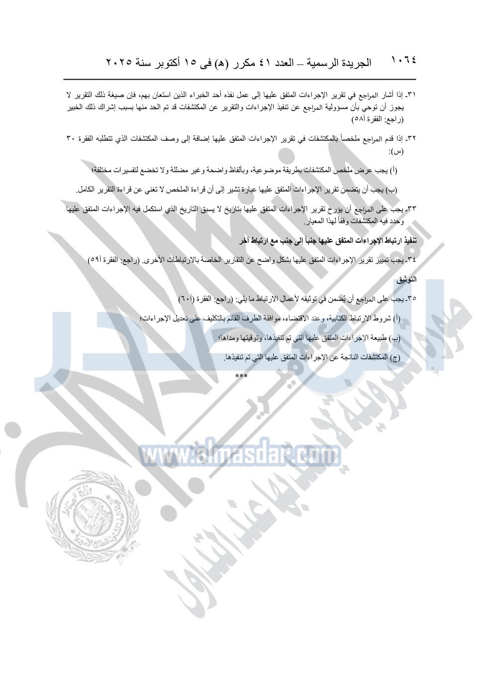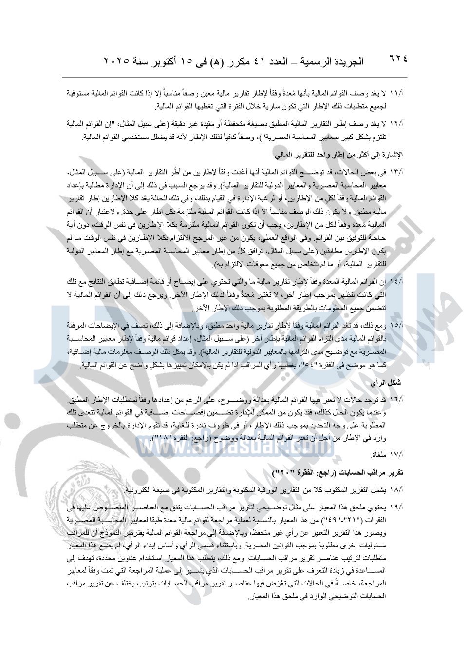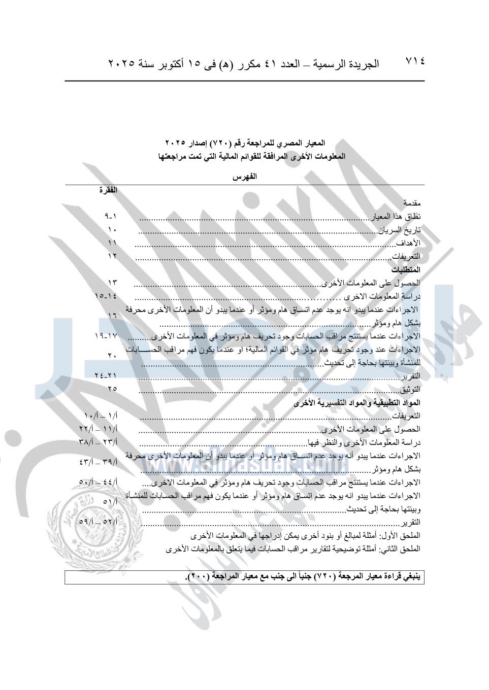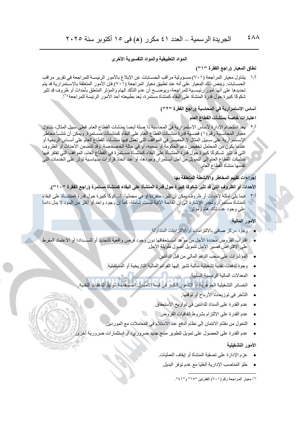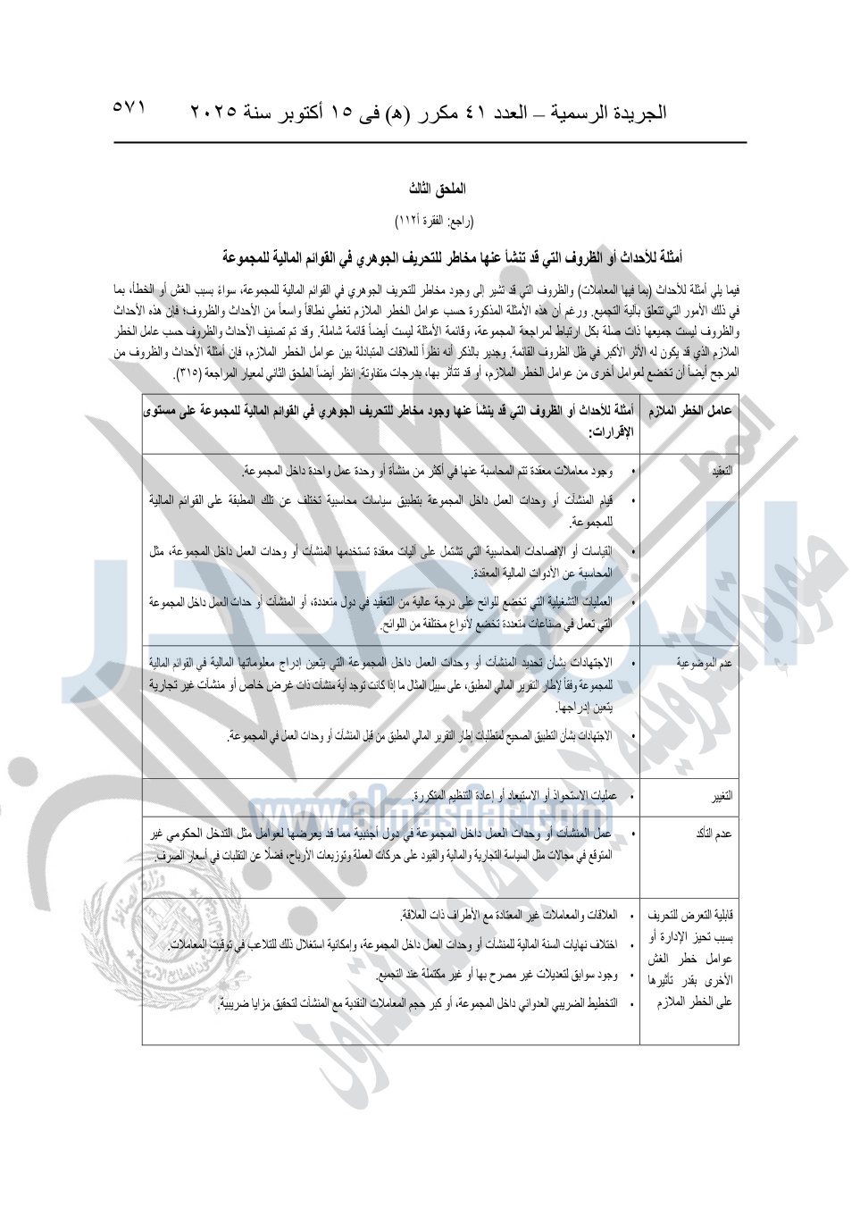 نشرت الجريدة الرسمية في العدد 41 مكرر "هـ" الصادر في 15 أكتوبر سنة 2025، قرار رئيس مجلس الوزراء رقم 3725 لسنة 2025، بشأن العمل بالمعايير المصرية للمراجعة والفحص المحدود ومهام التأكد الأخرى المرافقة لهذا القرار.
