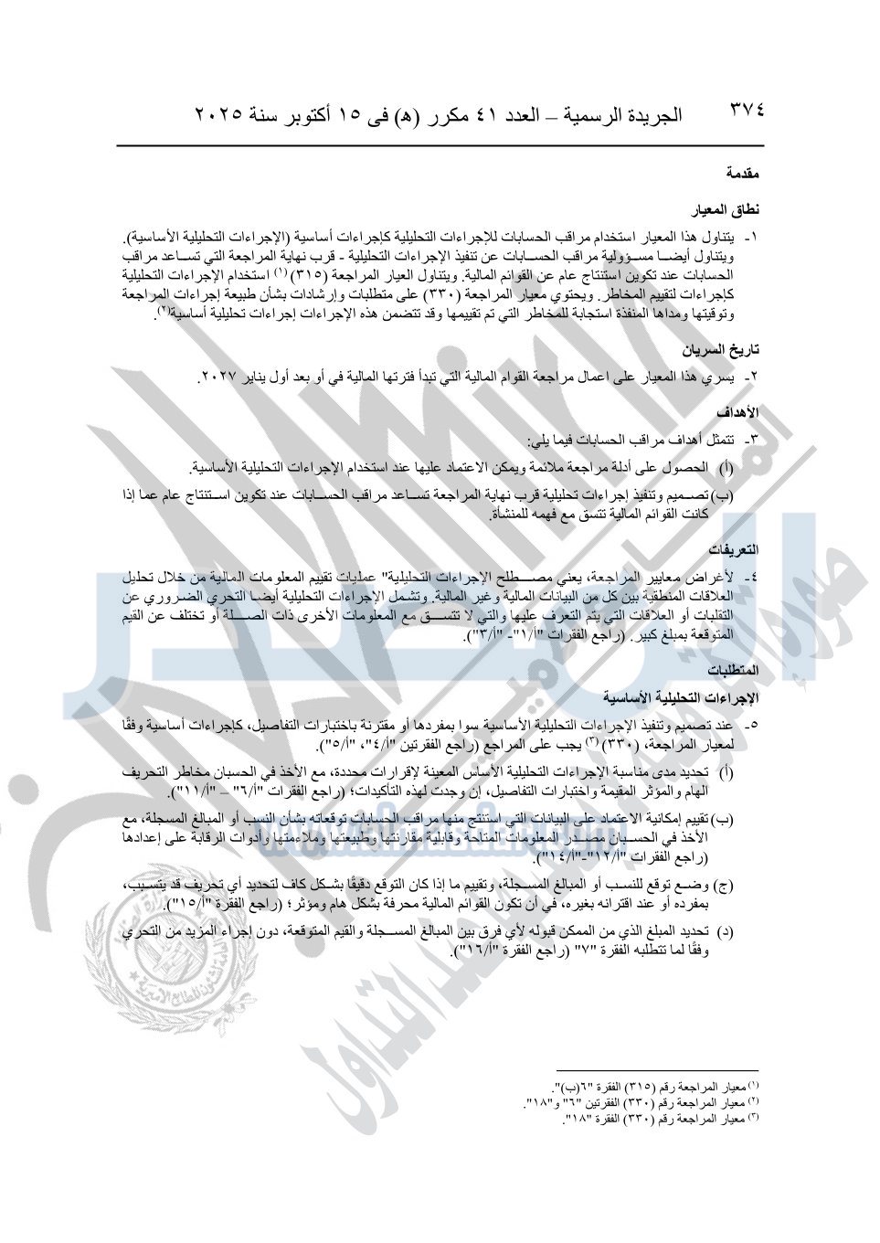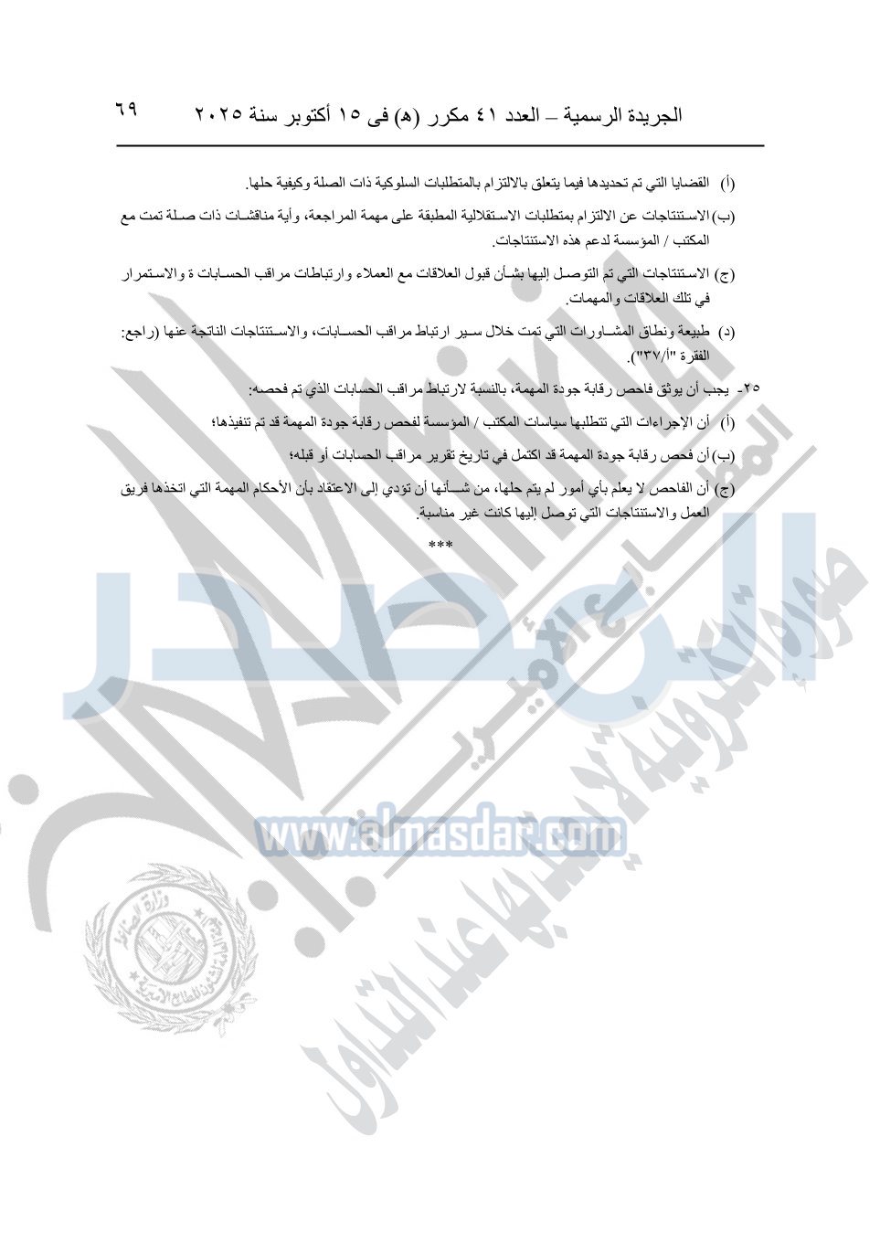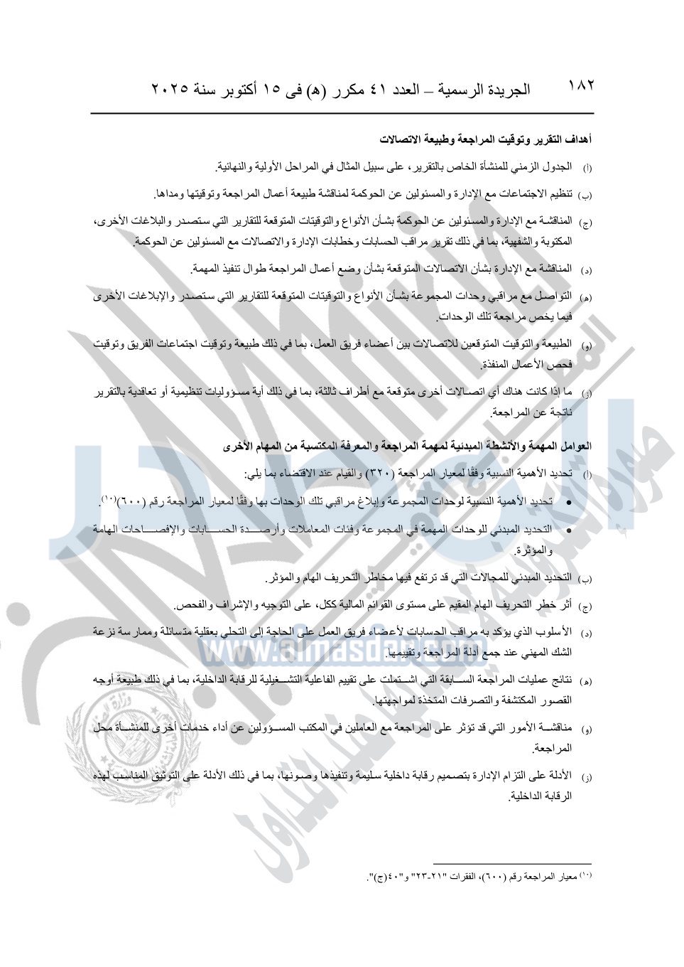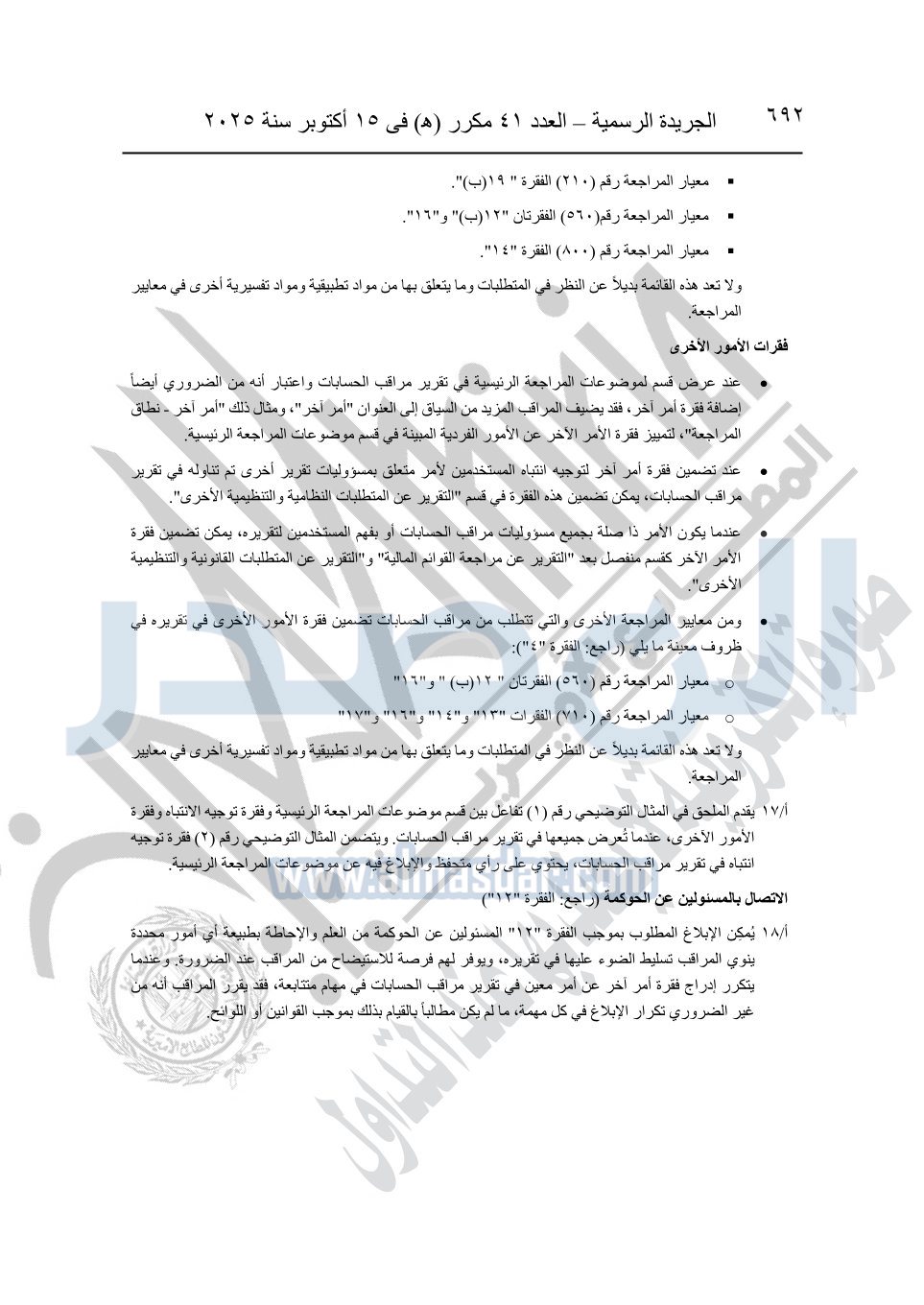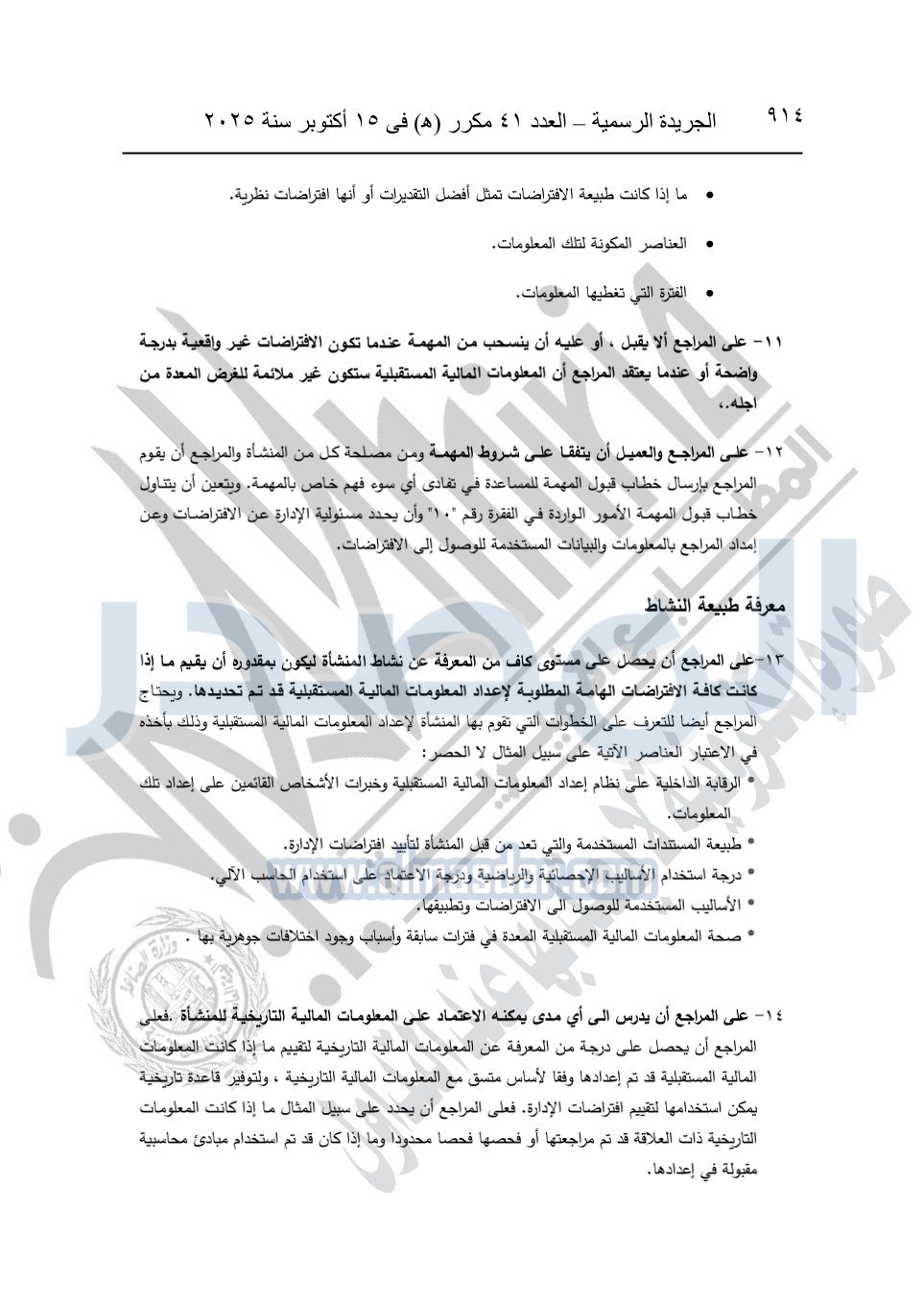 نشرت الجريدة الرسمية في العدد 41 مكرر "هـ" الصادر في 15 أكتوبر سنة 2025، قرار رئيس مجلس الوزراء رقم 3725 لسنة 2025، بشأن العمل بالمعايير المصرية للمراجعة والفحص المحدود ومهام التأكد الأخرى المرافقة لهذا القرار.