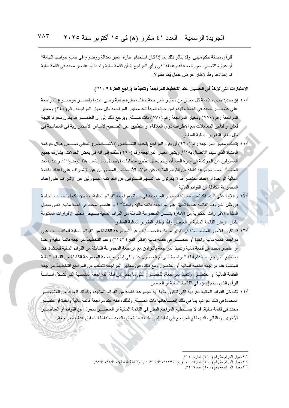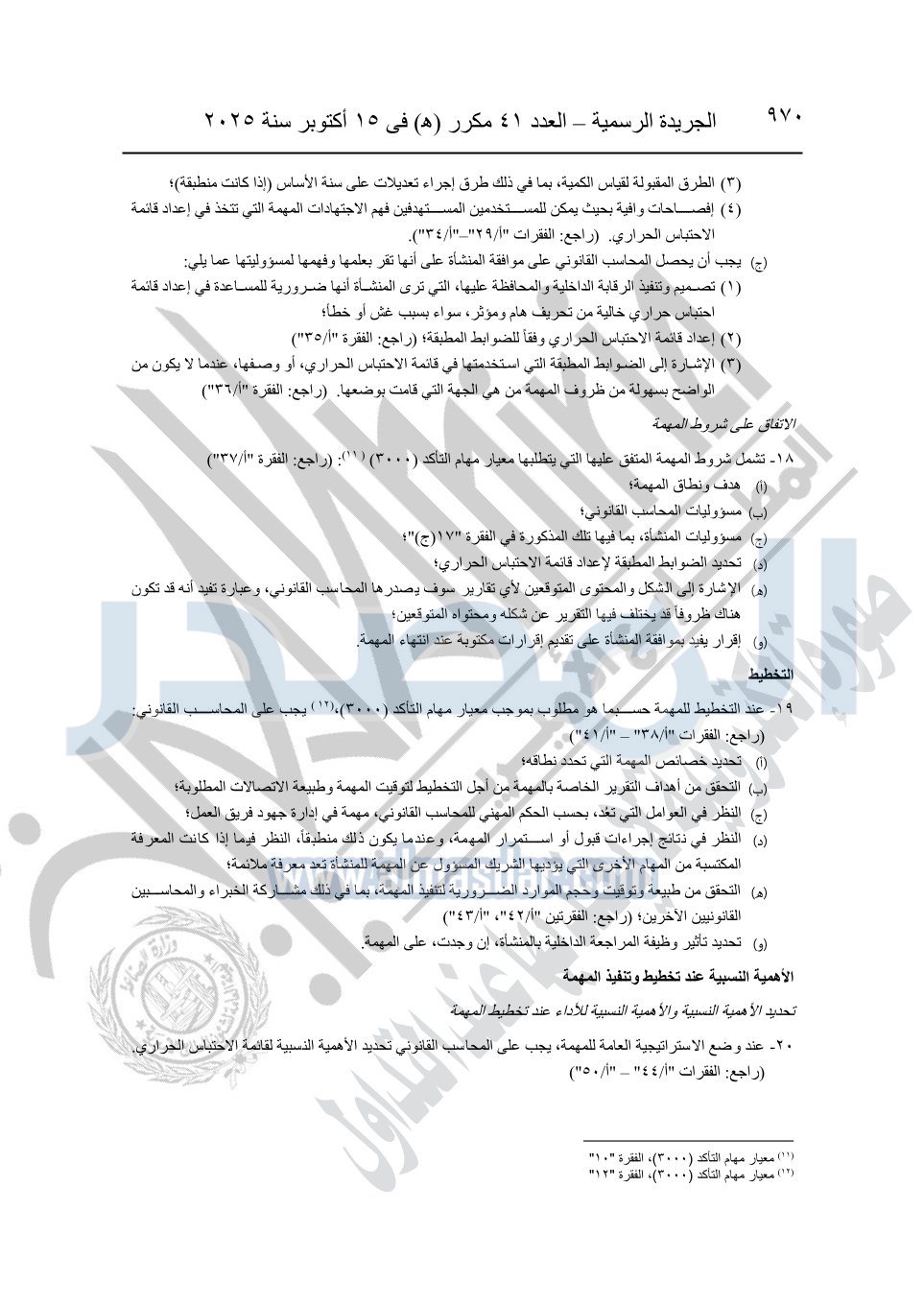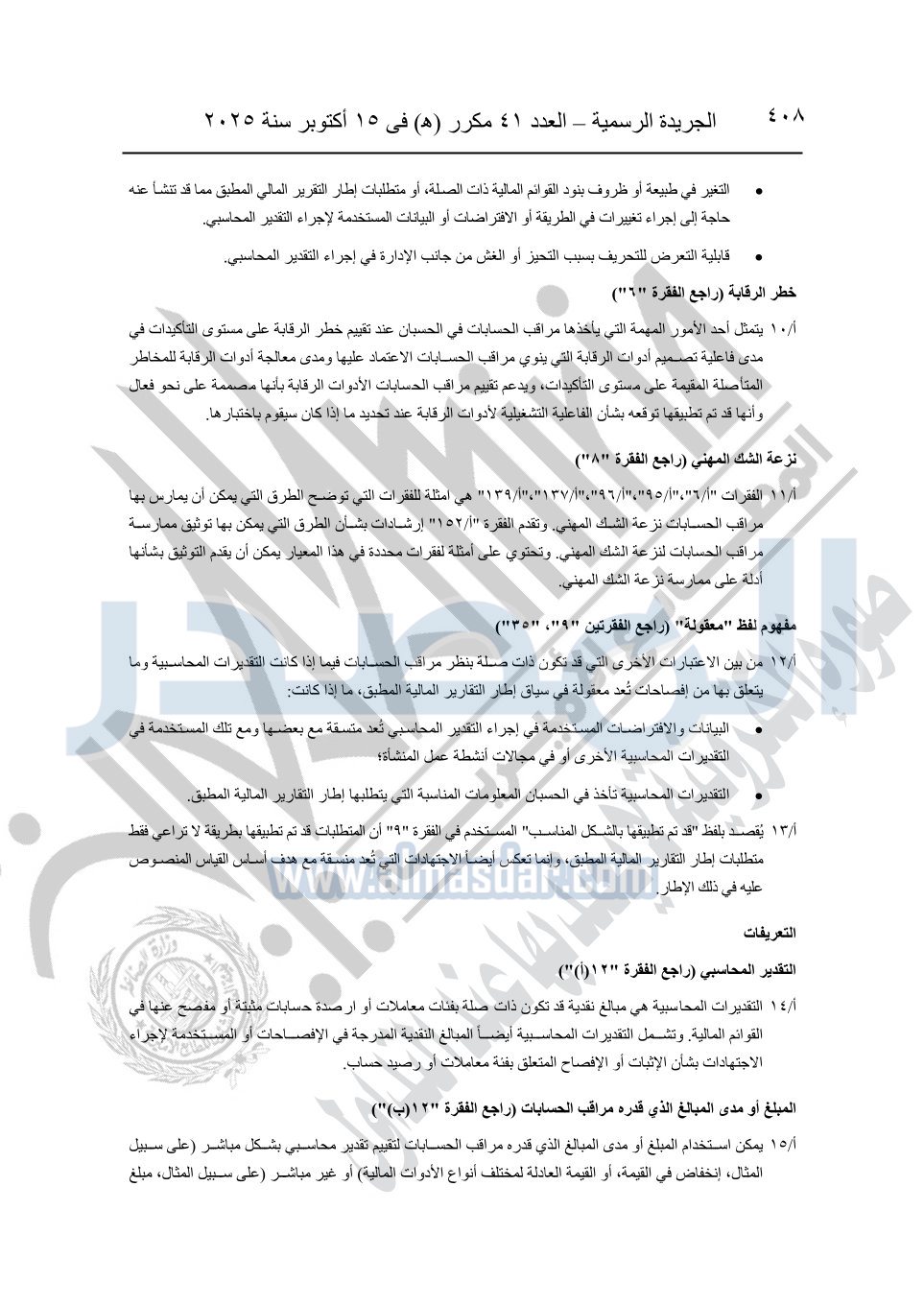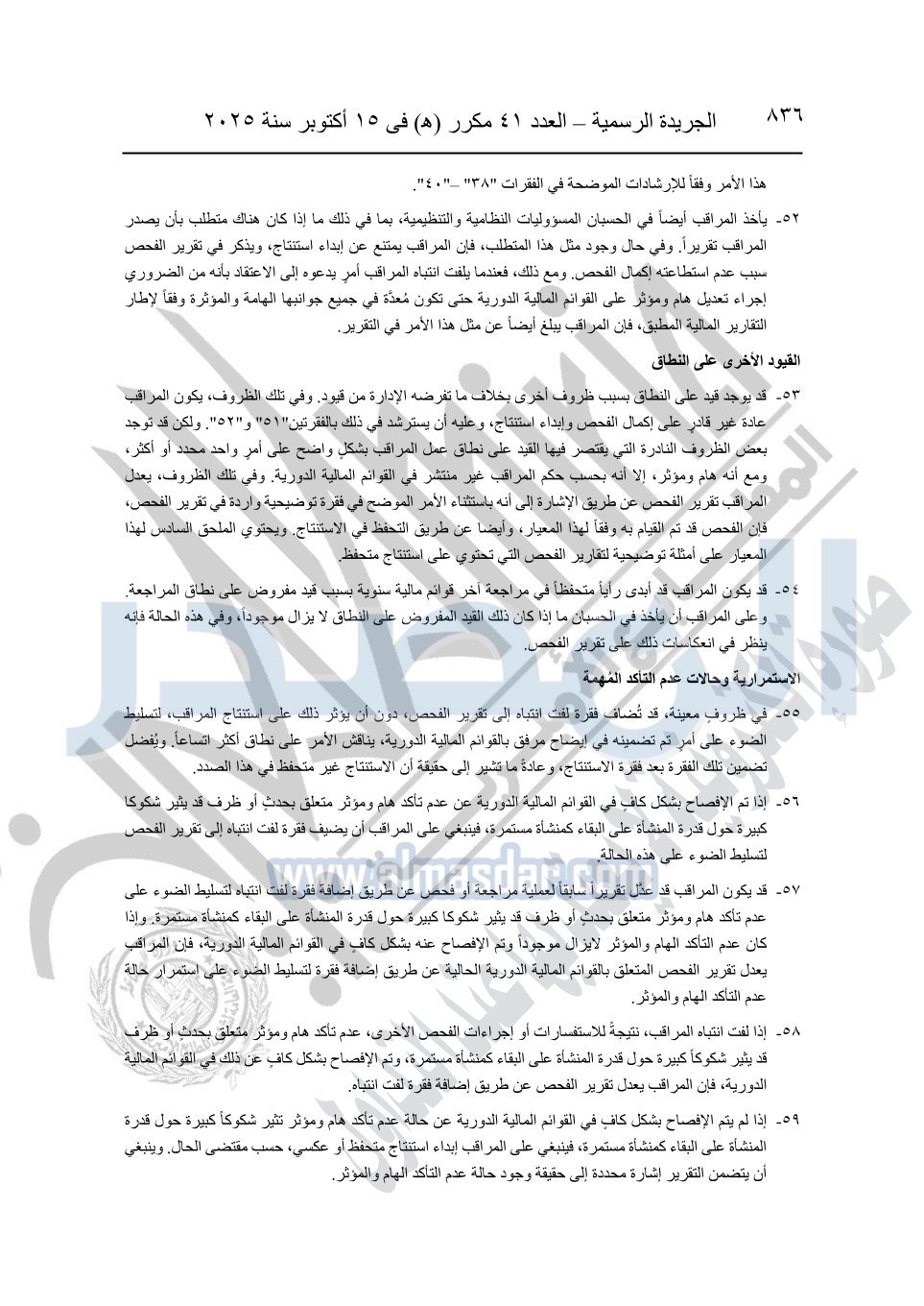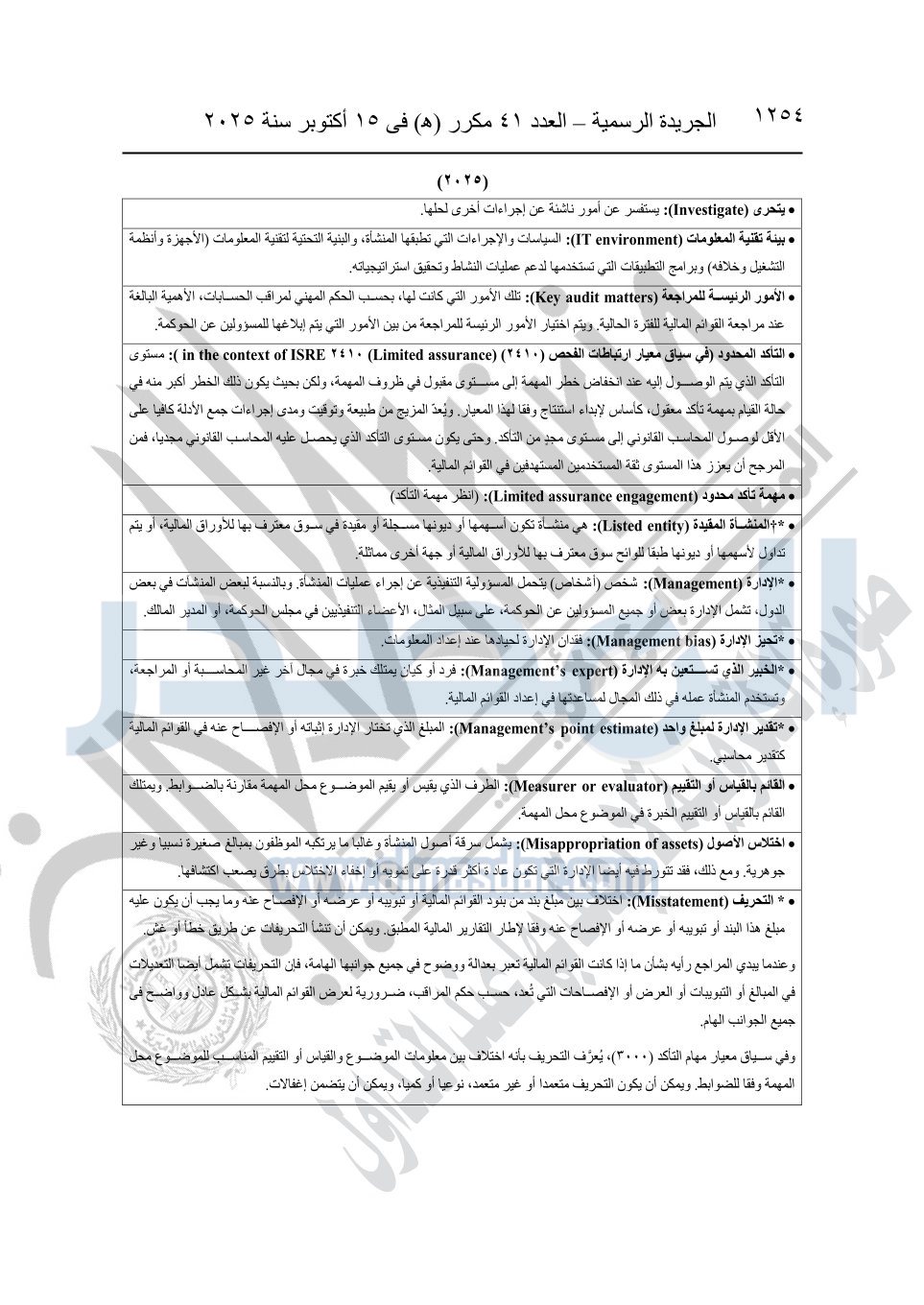 نشرت الجريدة الرسمية في العدد 41 مكرر "هـ" الصادر في 15 أكتوبر سنة 2025، قرار رئيس مجلس الوزراء رقم 3725 لسنة 2025، بشأن العمل بالمعايير المصرية للمراجعة والفحص المحدود ومهام التأكد الأخرى المرافقة لهذا القرار.