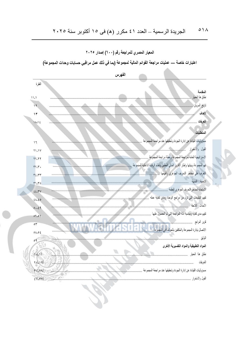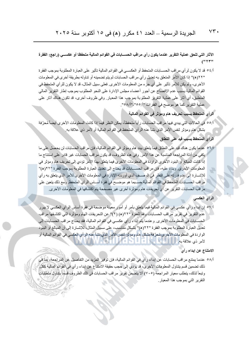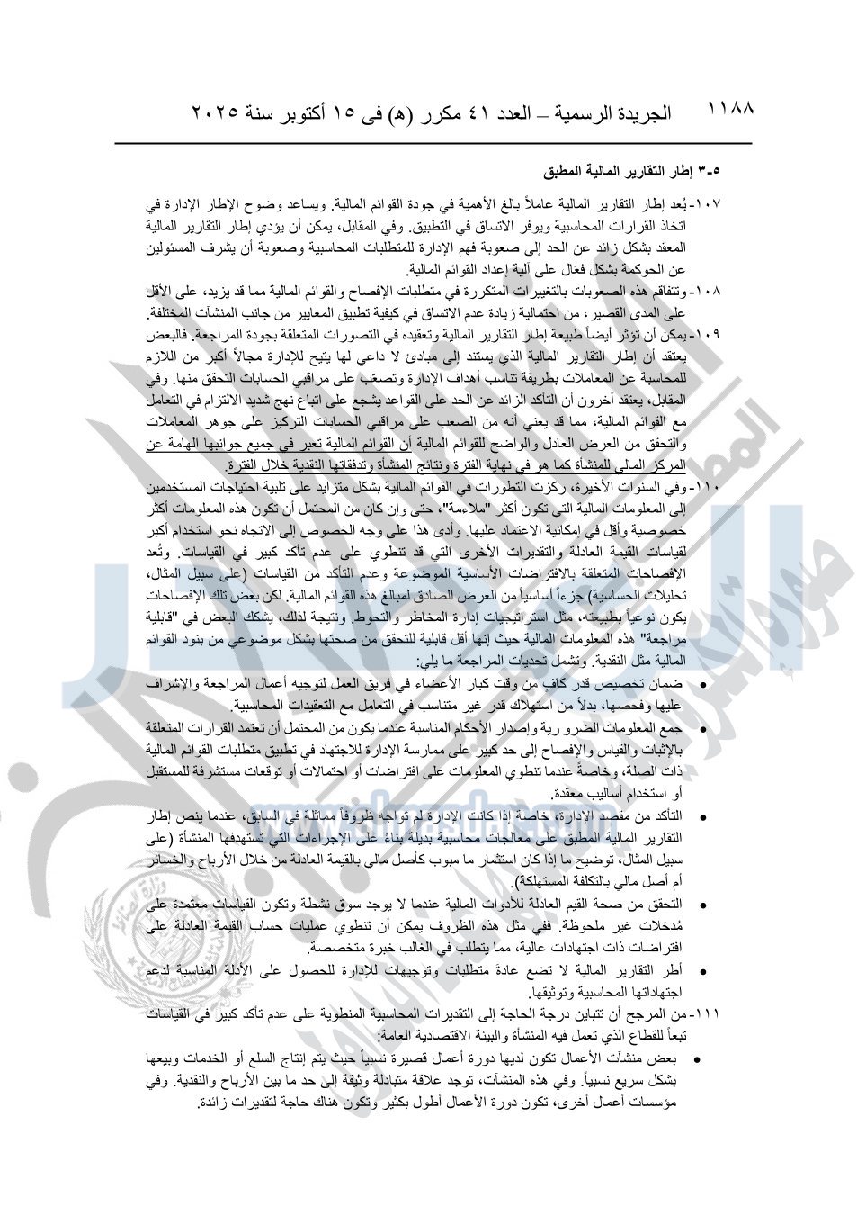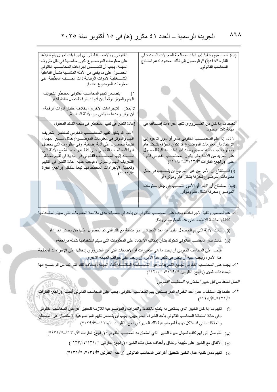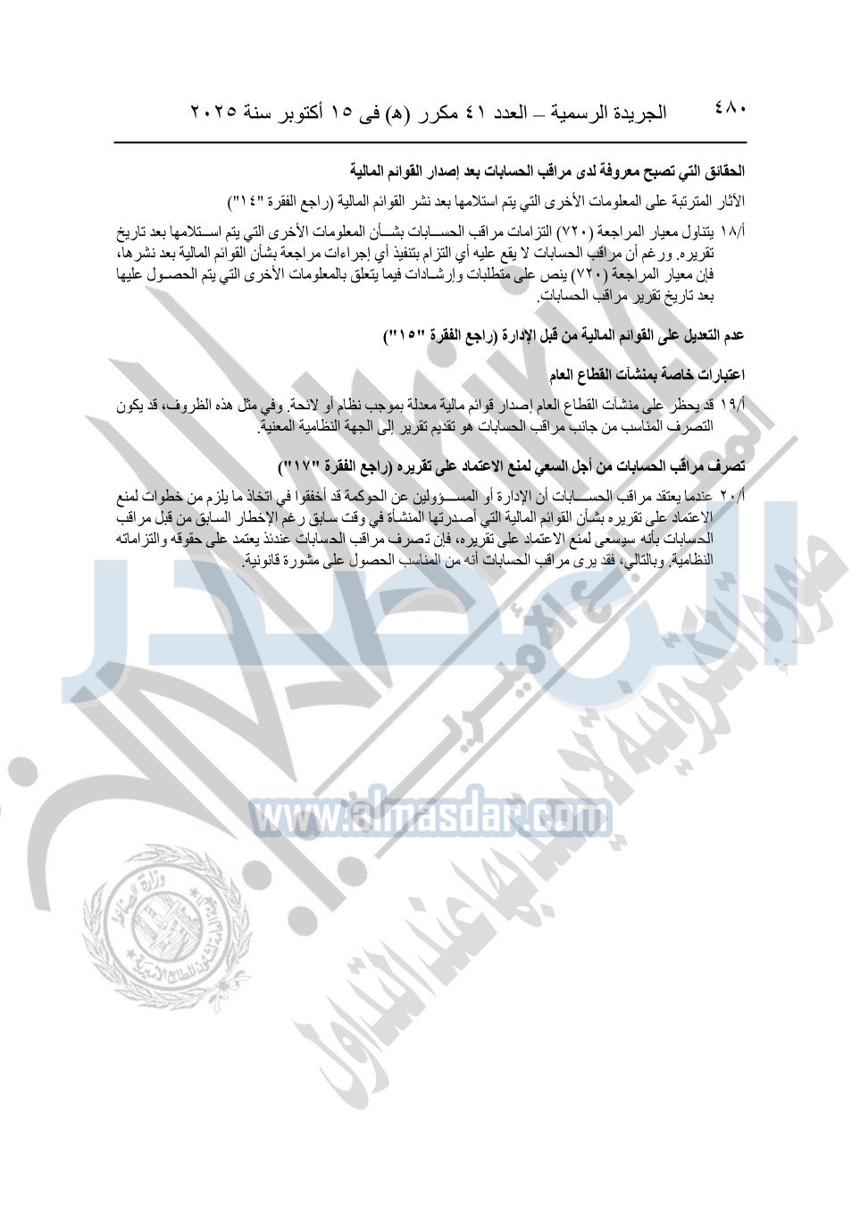 نشرت الجريدة الرسمية في العدد 41 مكرر "هـ" الصادر في 15 أكتوبر سنة 2025، قرار رئيس مجلس الوزراء رقم 3725 لسنة 2025، بشأن العمل بالمعايير المصرية للمراجعة والفحص المحدود ومهام التأكد الأخرى المرافقة لهذا القرار.