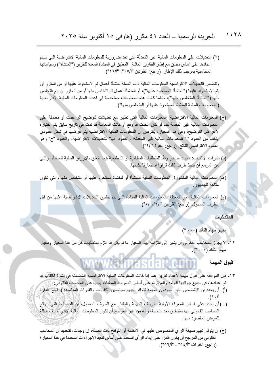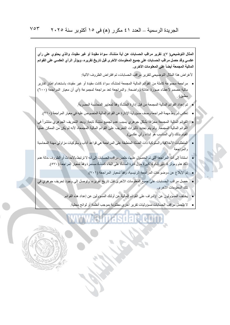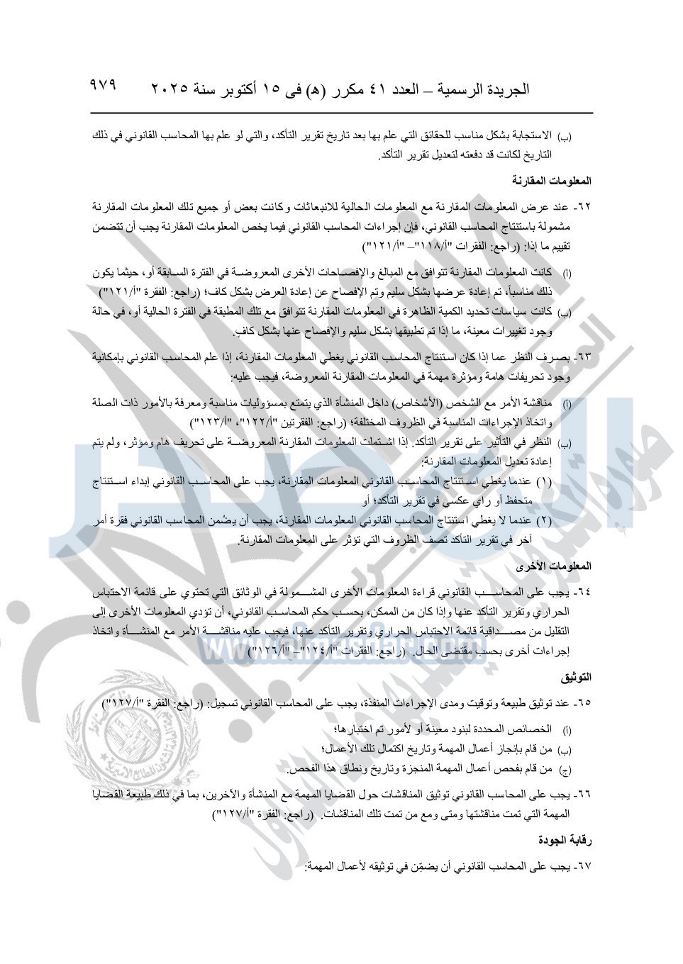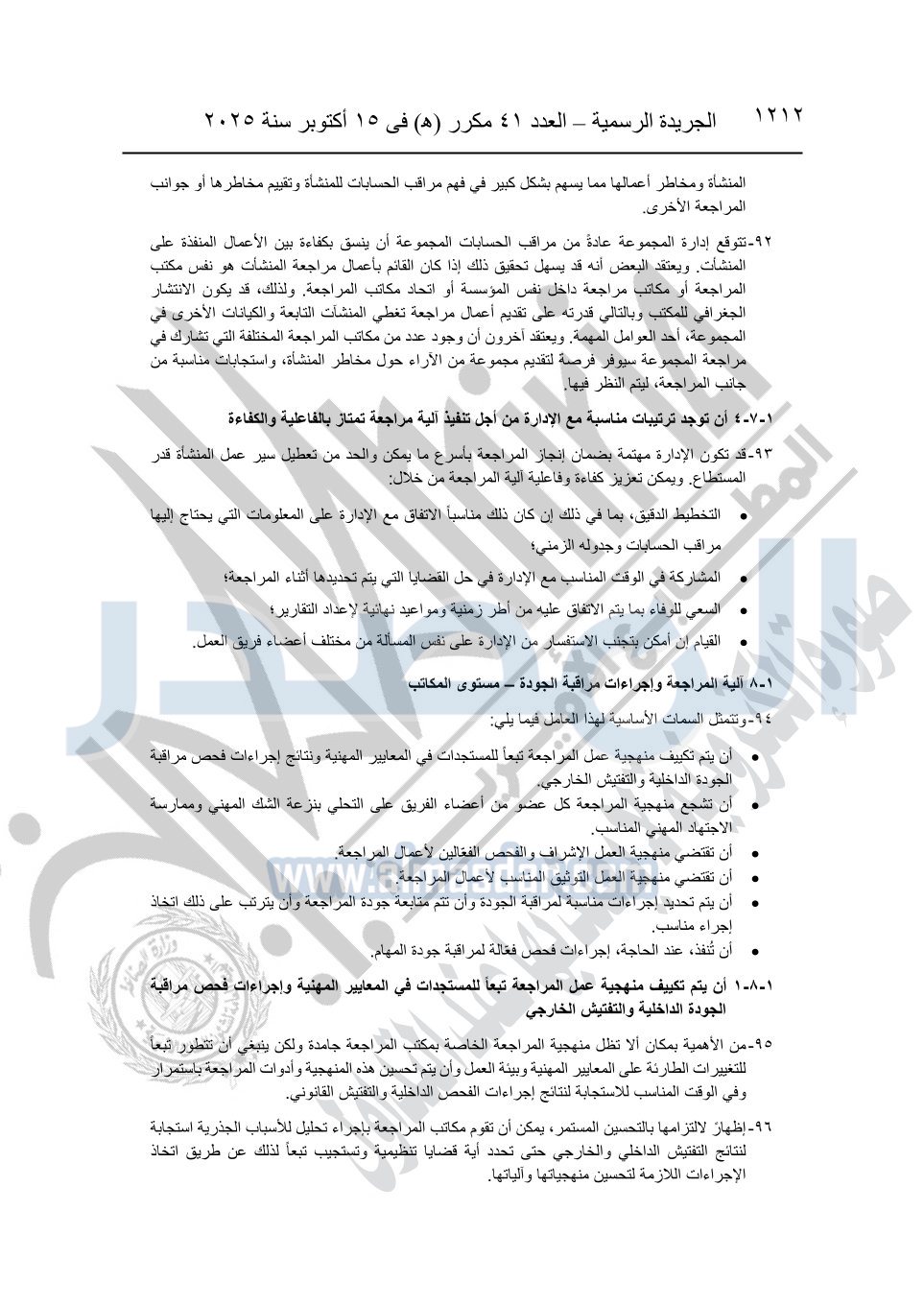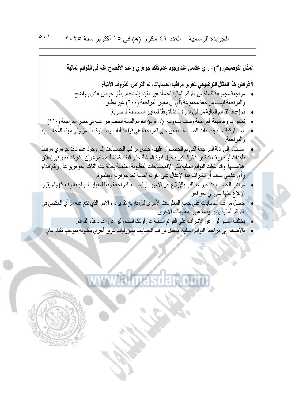 نشرت الجريدة الرسمية في العدد 41 مكرر "هـ" الصادر في 15 أكتوبر سنة 2025، قرار رئيس مجلس الوزراء رقم 3725 لسنة 2025، بشأن العمل بالمعايير المصرية للمراجعة والفحص المحدود ومهام التأكد الأخرى المرافقة لهذا القرار.