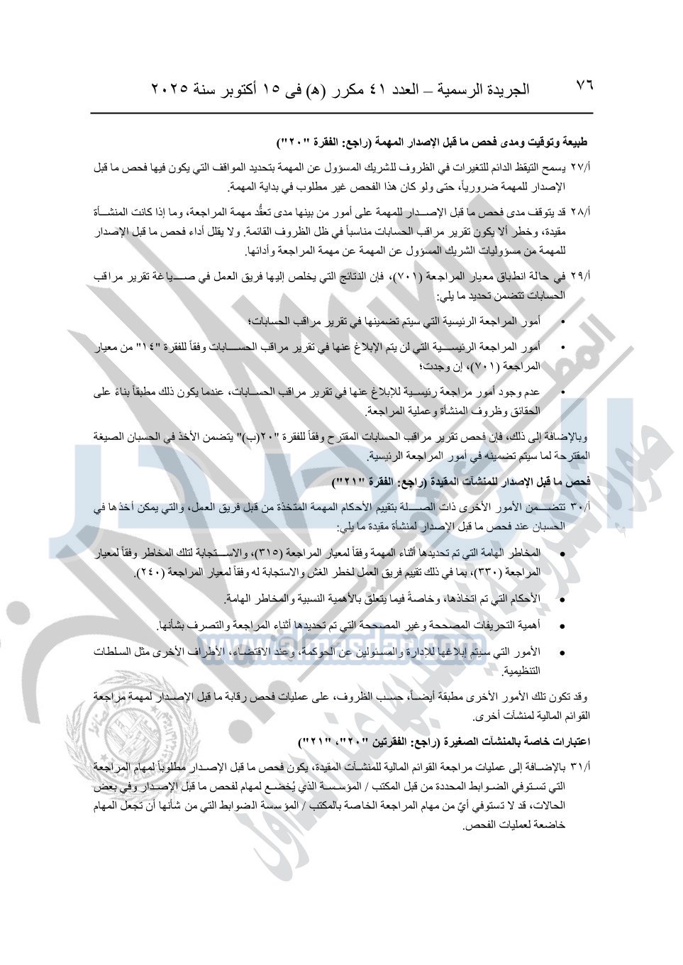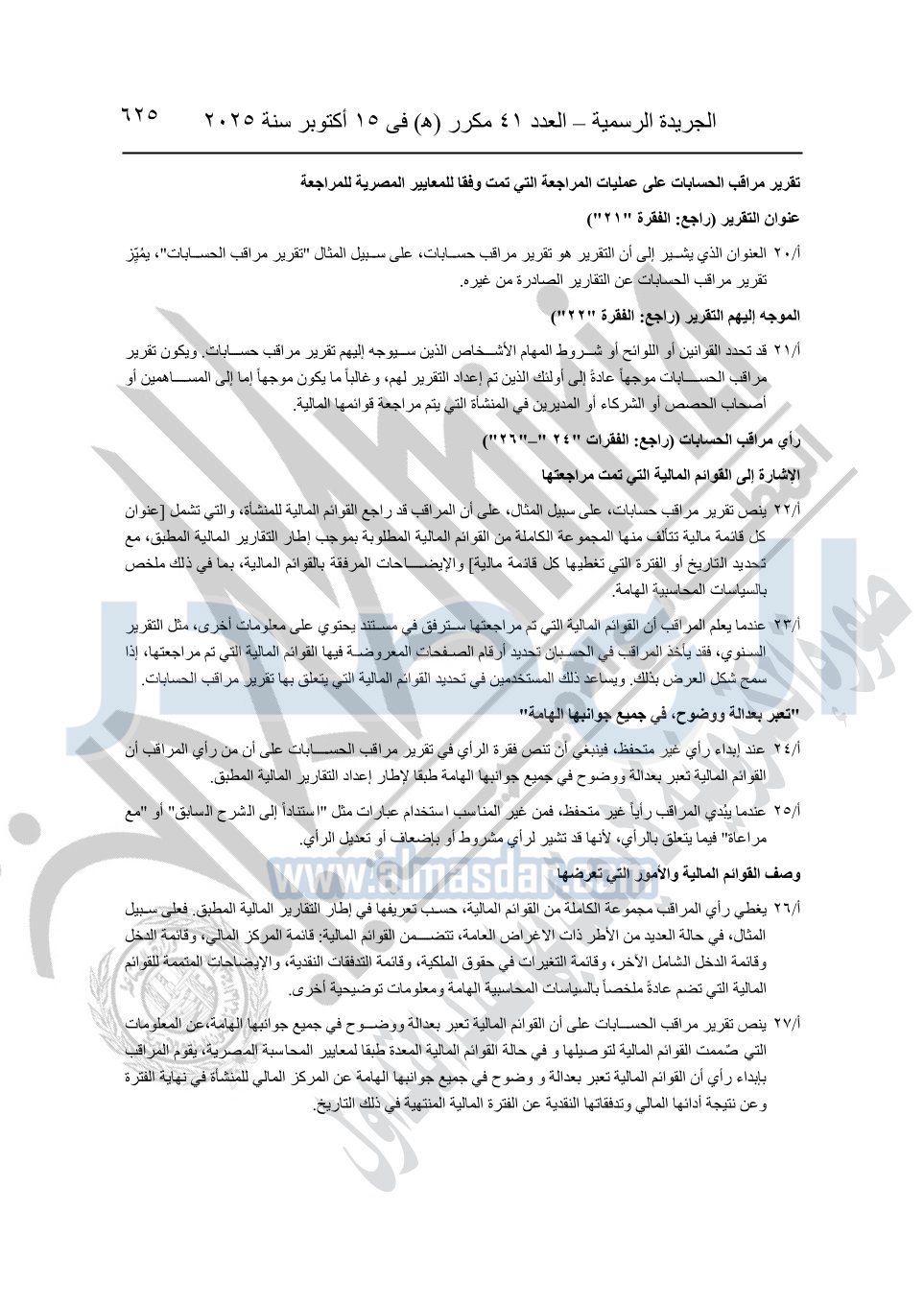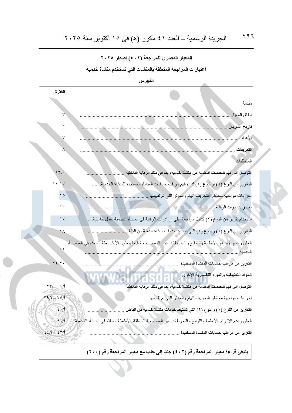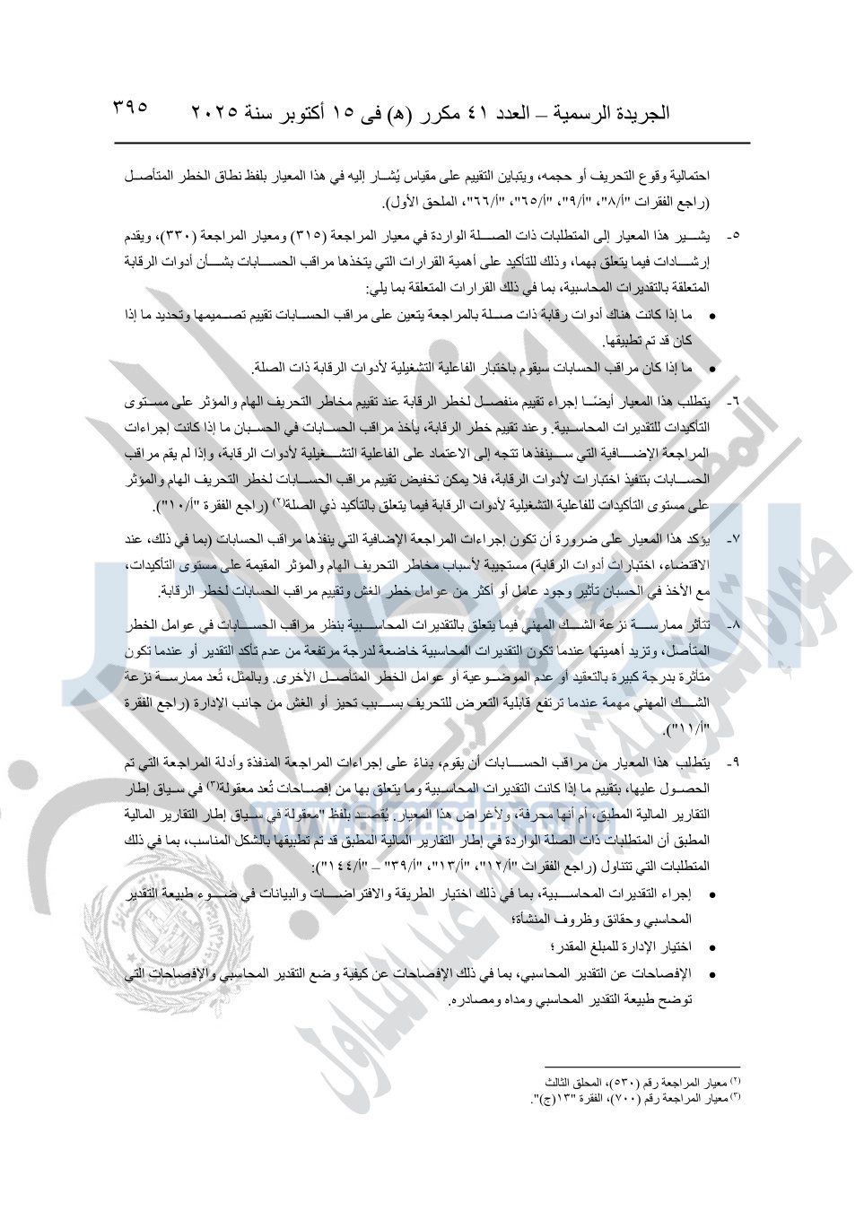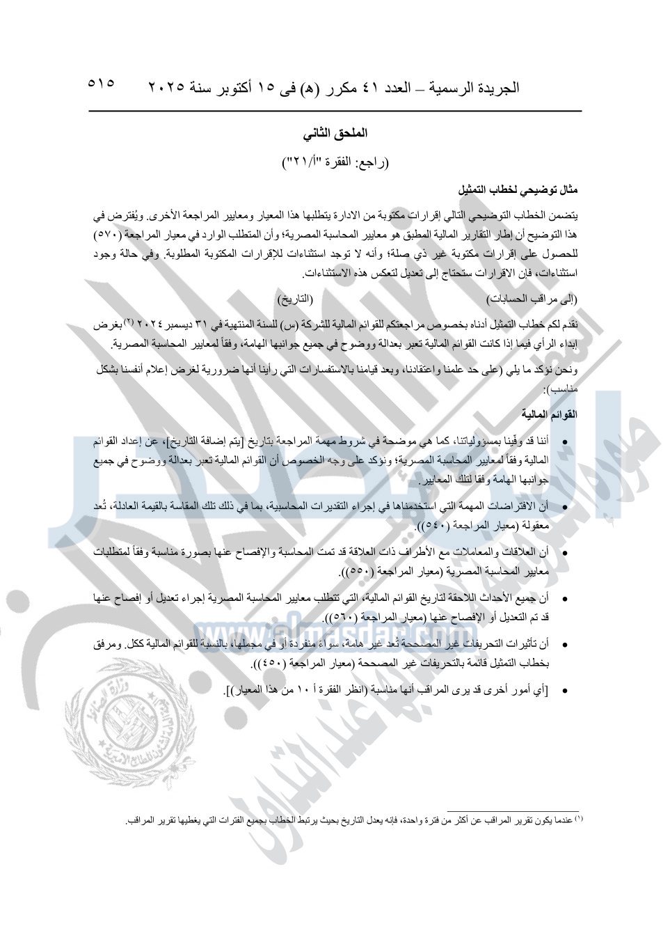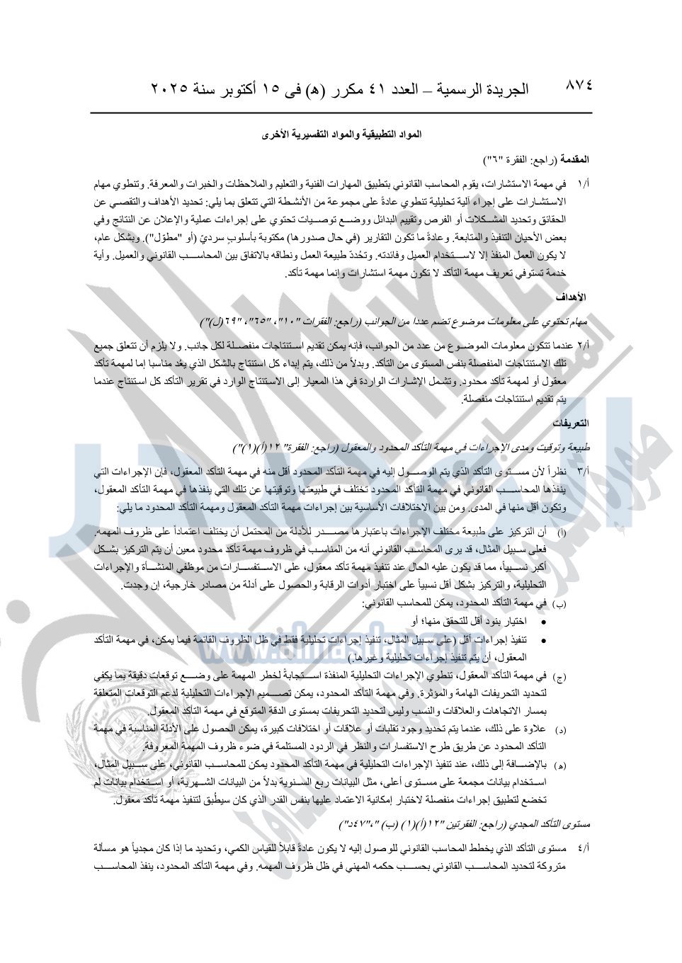 نشرت الجريدة الرسمية في العدد 41 مكرر "هـ" الصادر في 15 أكتوبر سنة 2025، قرار رئيس مجلس الوزراء رقم 3725 لسنة 2025، بشأن العمل بالمعايير المصرية للمراجعة والفحص المحدود ومهام التأكد الأخرى المرافقة لهذا القرار.
