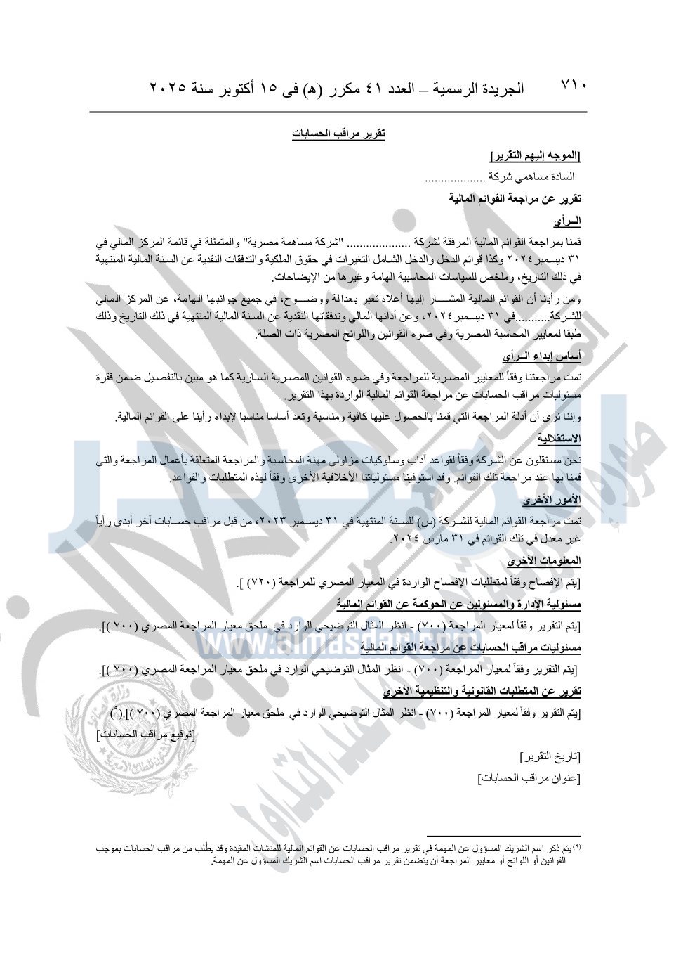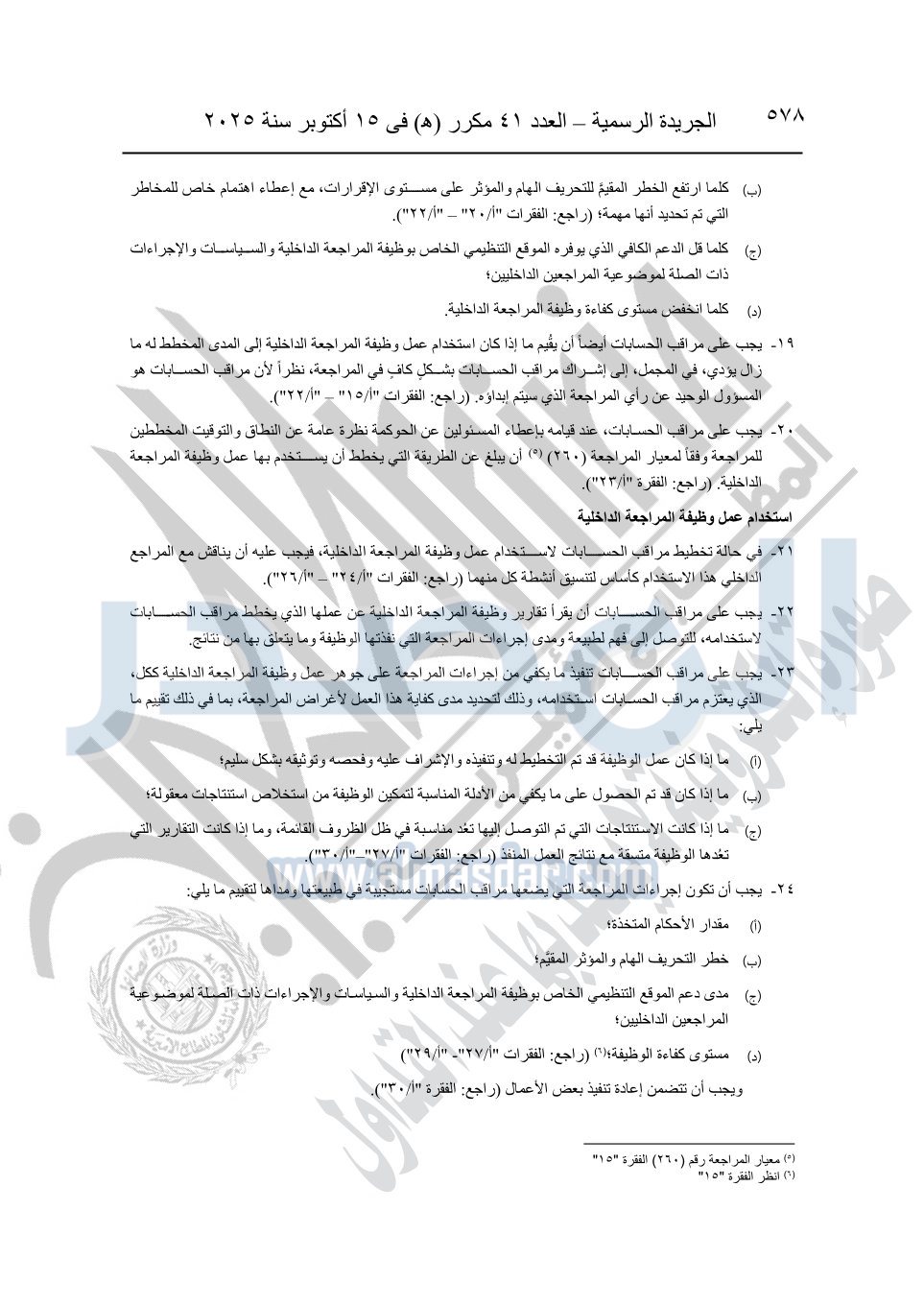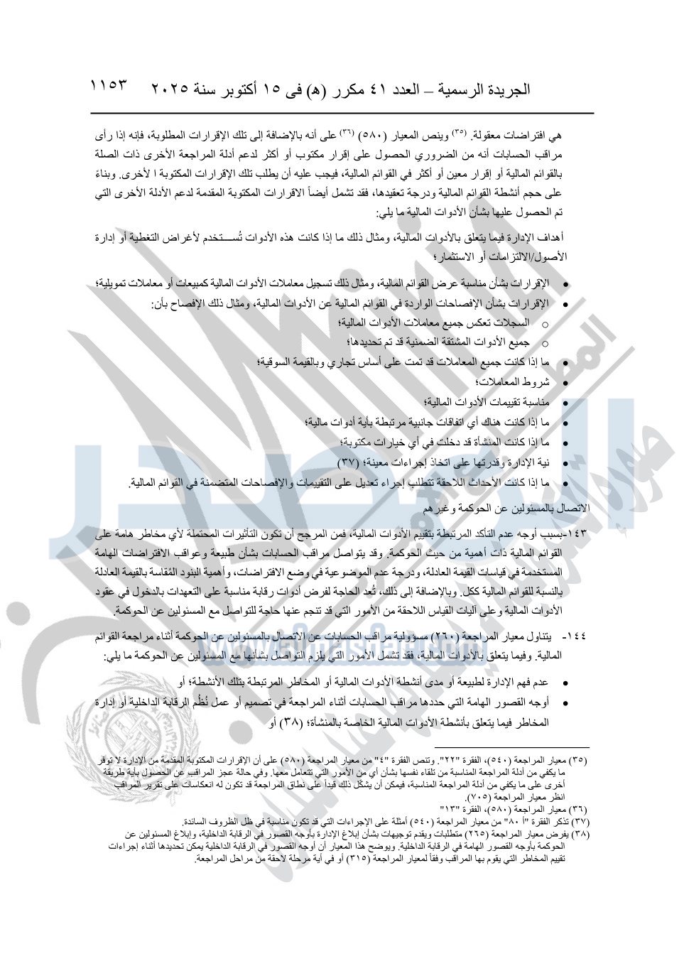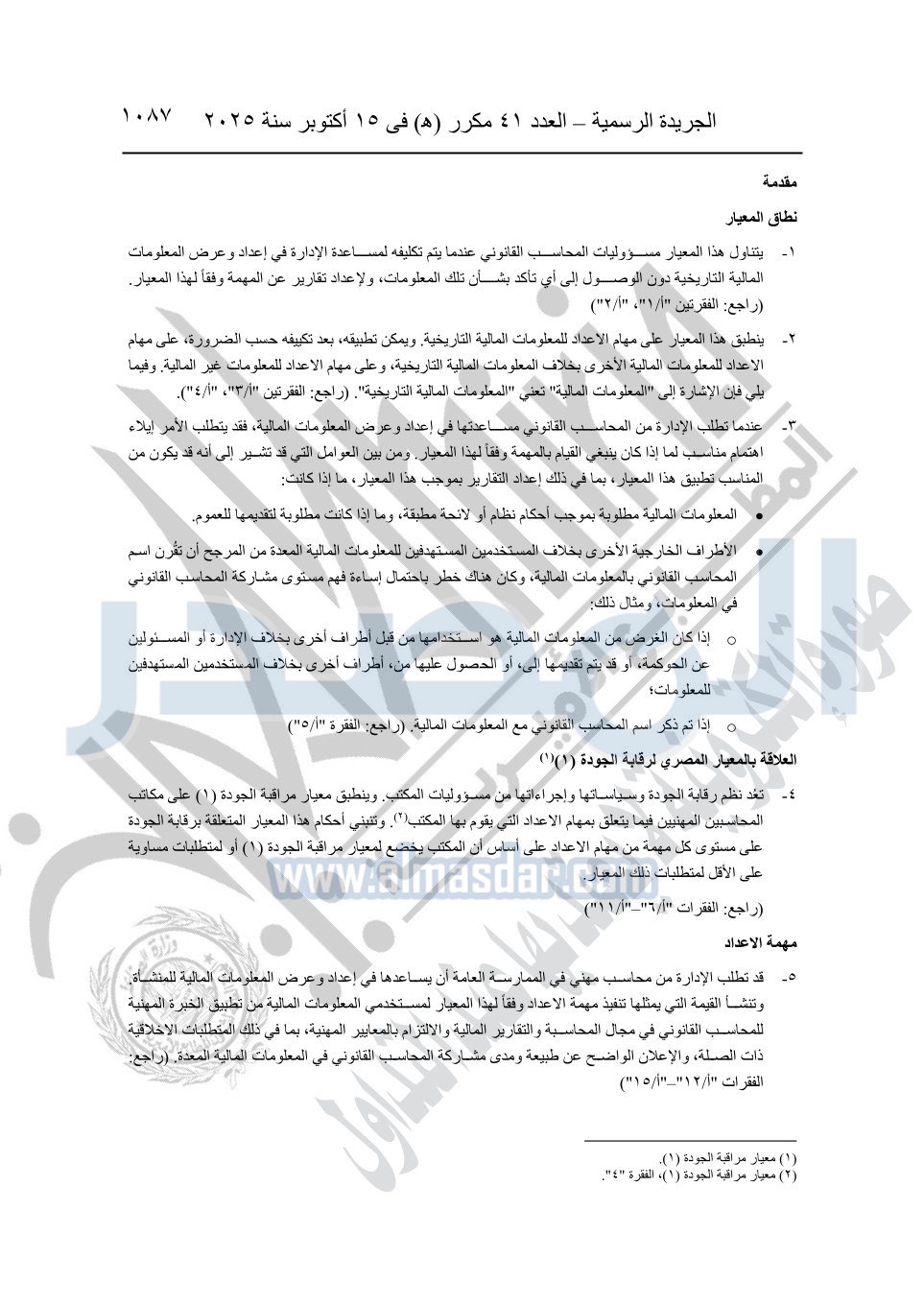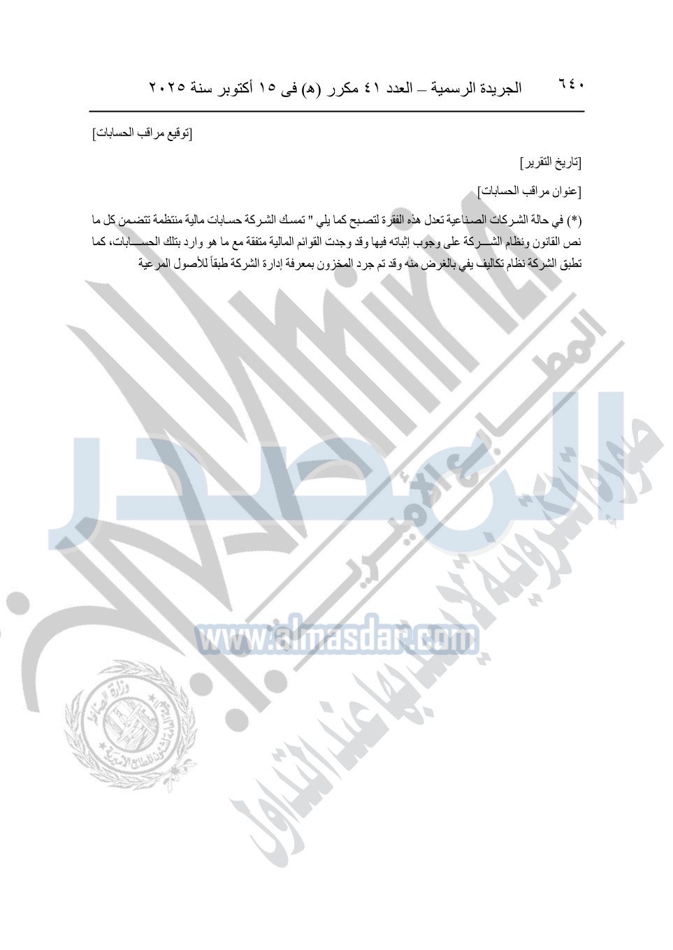 نشرت الجريدة الرسمية في العدد 41 مكرر "هـ" الصادر في 15 أكتوبر سنة 2025، قرار رئيس مجلس الوزراء رقم 3725 لسنة 2025، بشأن العمل بالمعايير المصرية للمراجعة والفحص المحدود ومهام التأكد الأخرى المرافقة لهذا القرار.