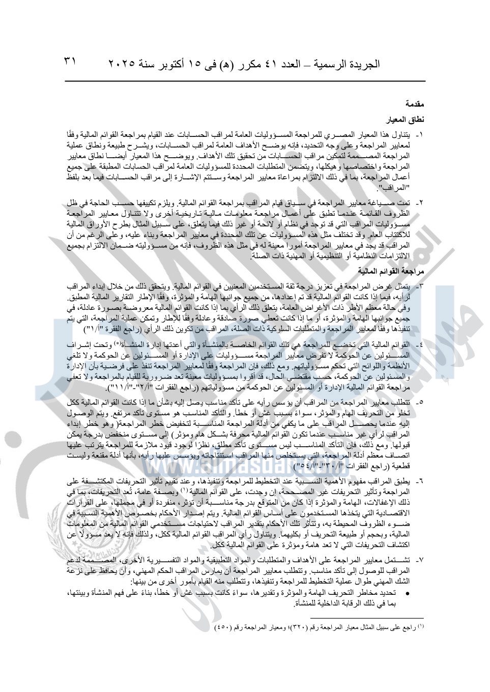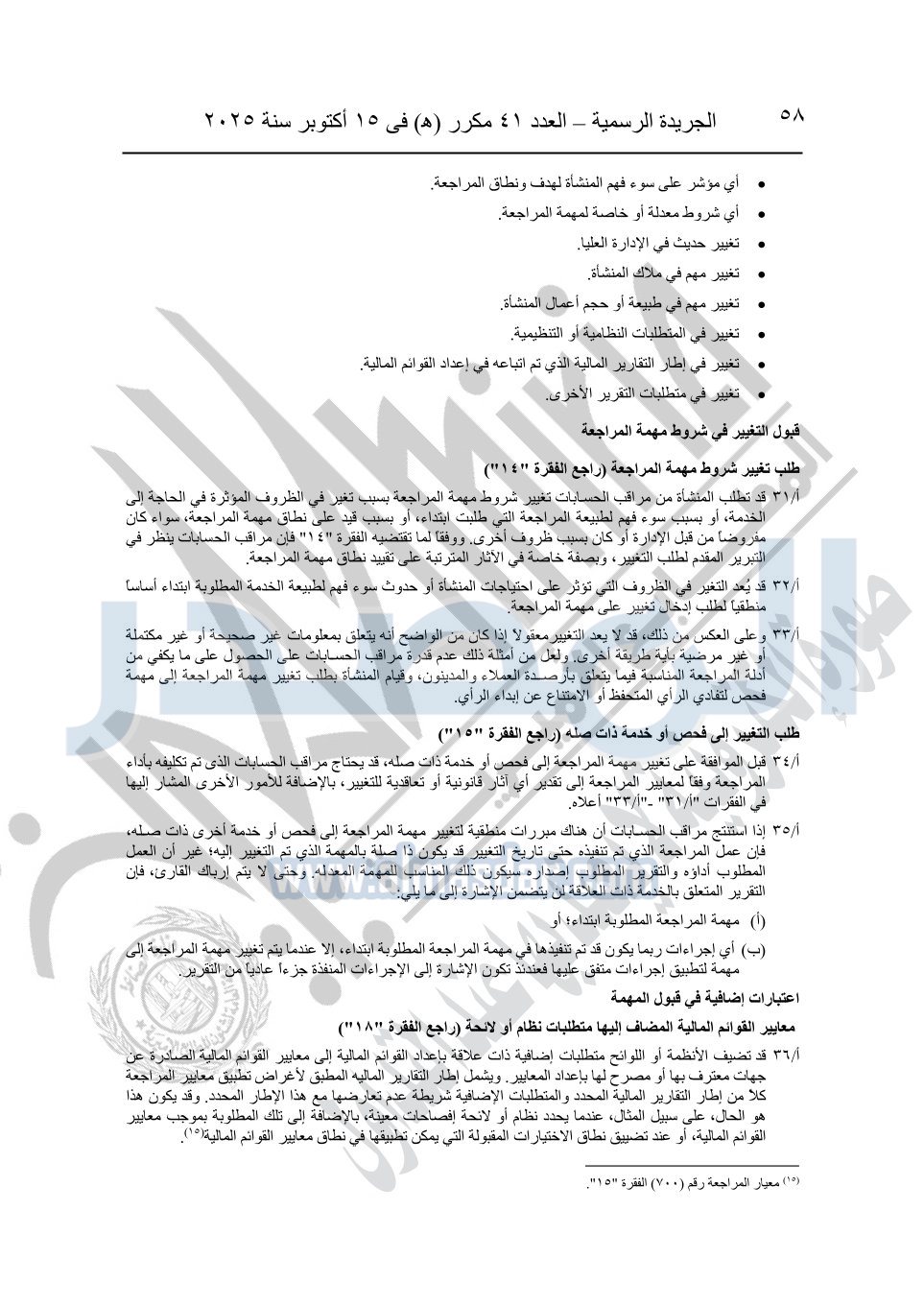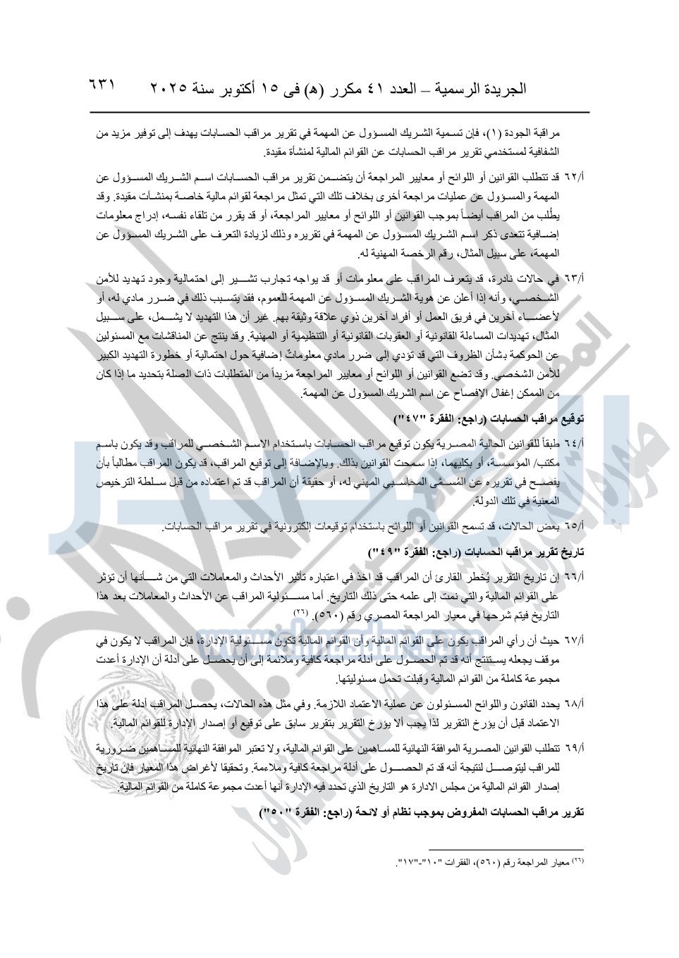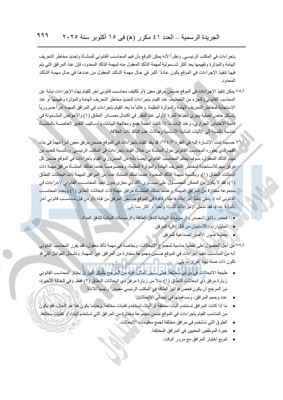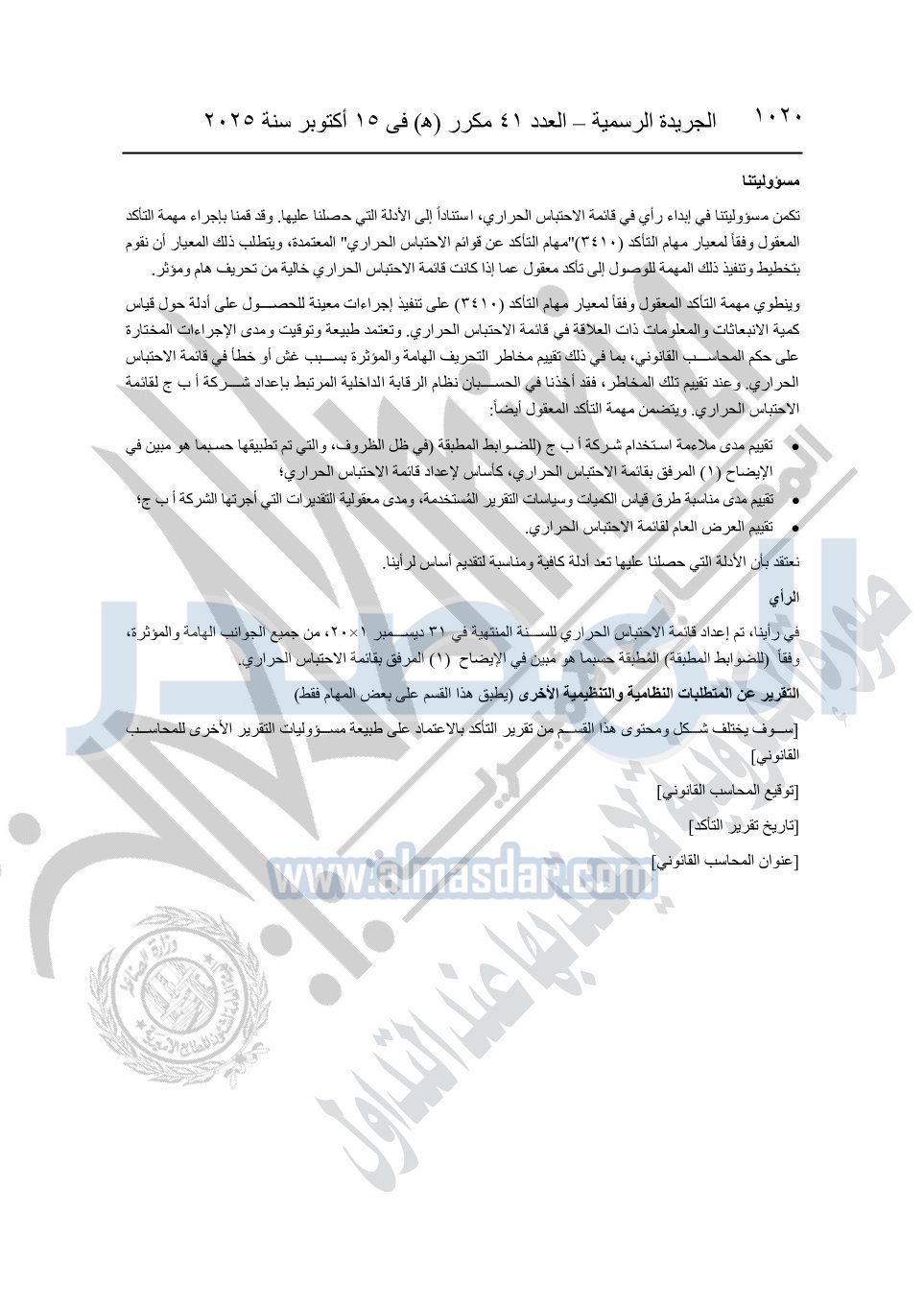 نشرت الجريدة الرسمية في العدد 41 مكرر "هـ" الصادر في 15 أكتوبر سنة 2025، قرار رئيس مجلس الوزراء رقم 3725 لسنة 2025، بشأن العمل بالمعايير المصرية للمراجعة والفحص المحدود ومهام التأكد الأخرى المرافقة لهذا القرار.