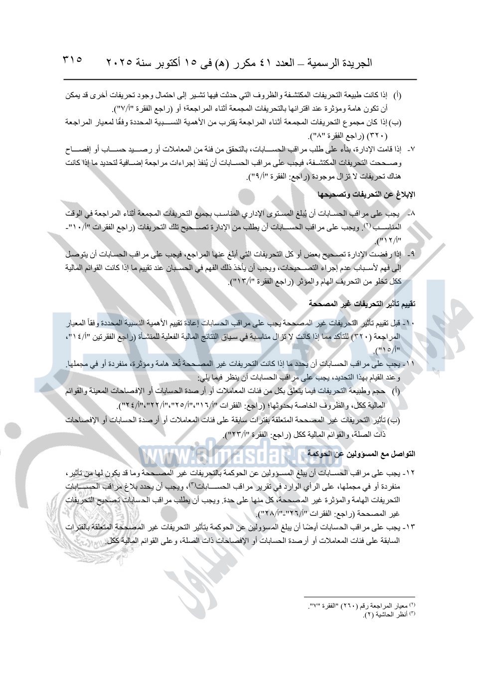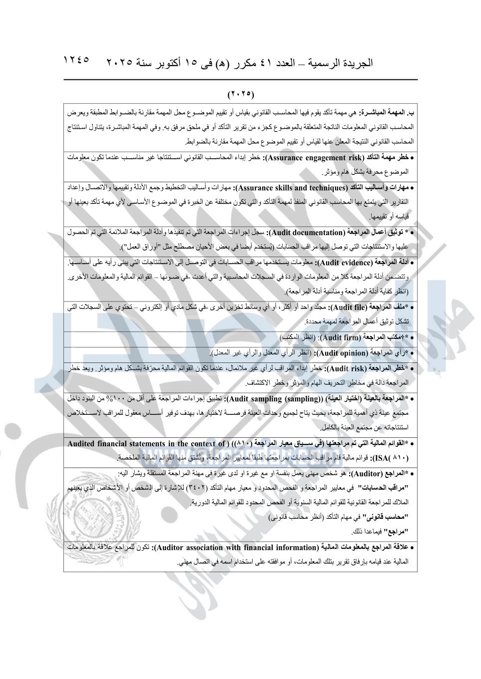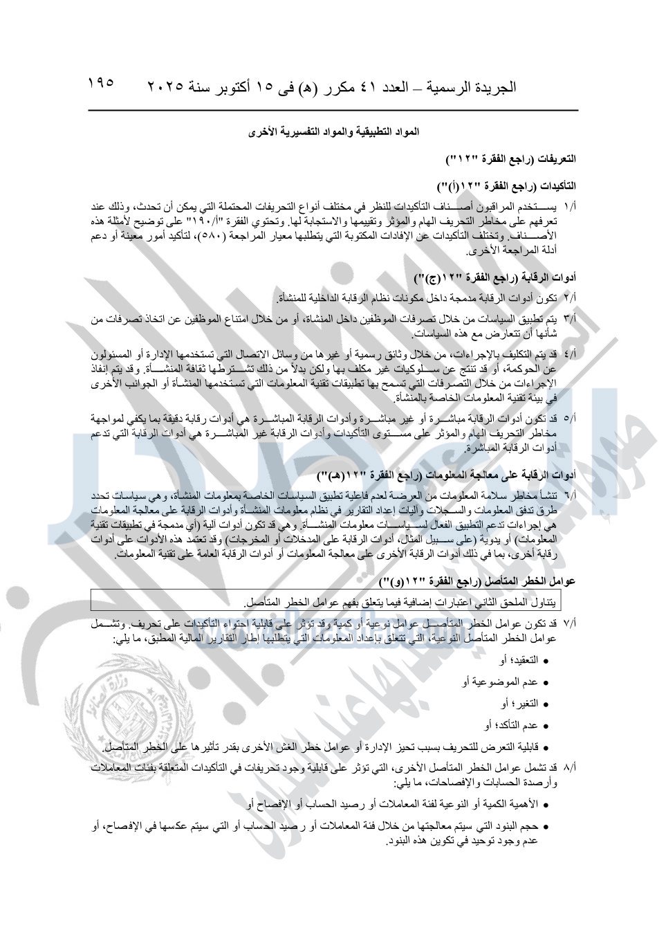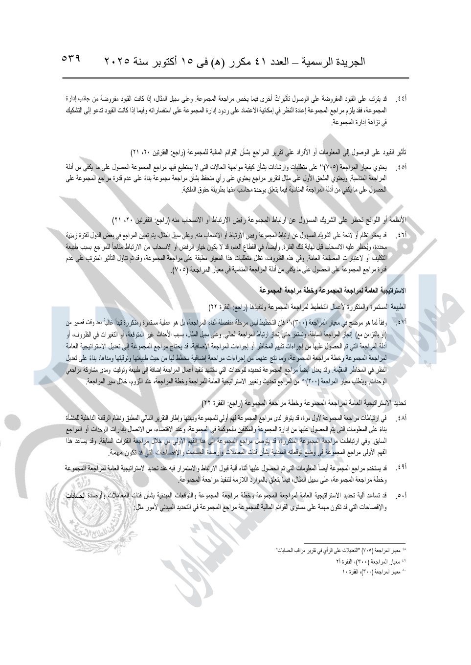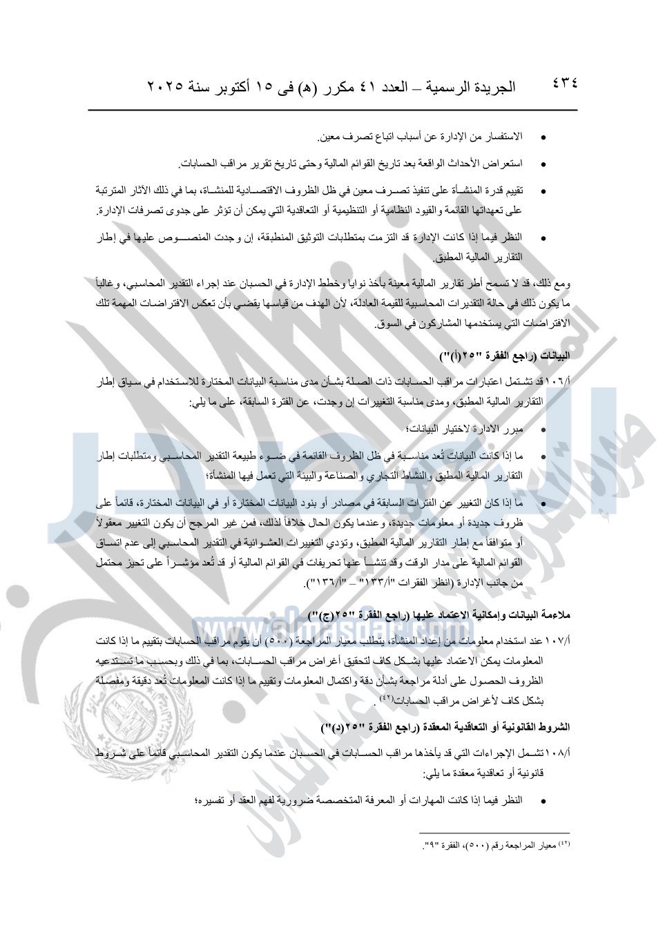 نشرت الجريدة الرسمية في العدد 41 مكرر "هـ" الصادر في 15 أكتوبر سنة 2025، قرار رئيس مجلس الوزراء رقم 3725 لسنة 2025، بشأن العمل بالمعايير المصرية للمراجعة والفحص المحدود ومهام التأكد الأخرى المرافقة لهذا القرار.