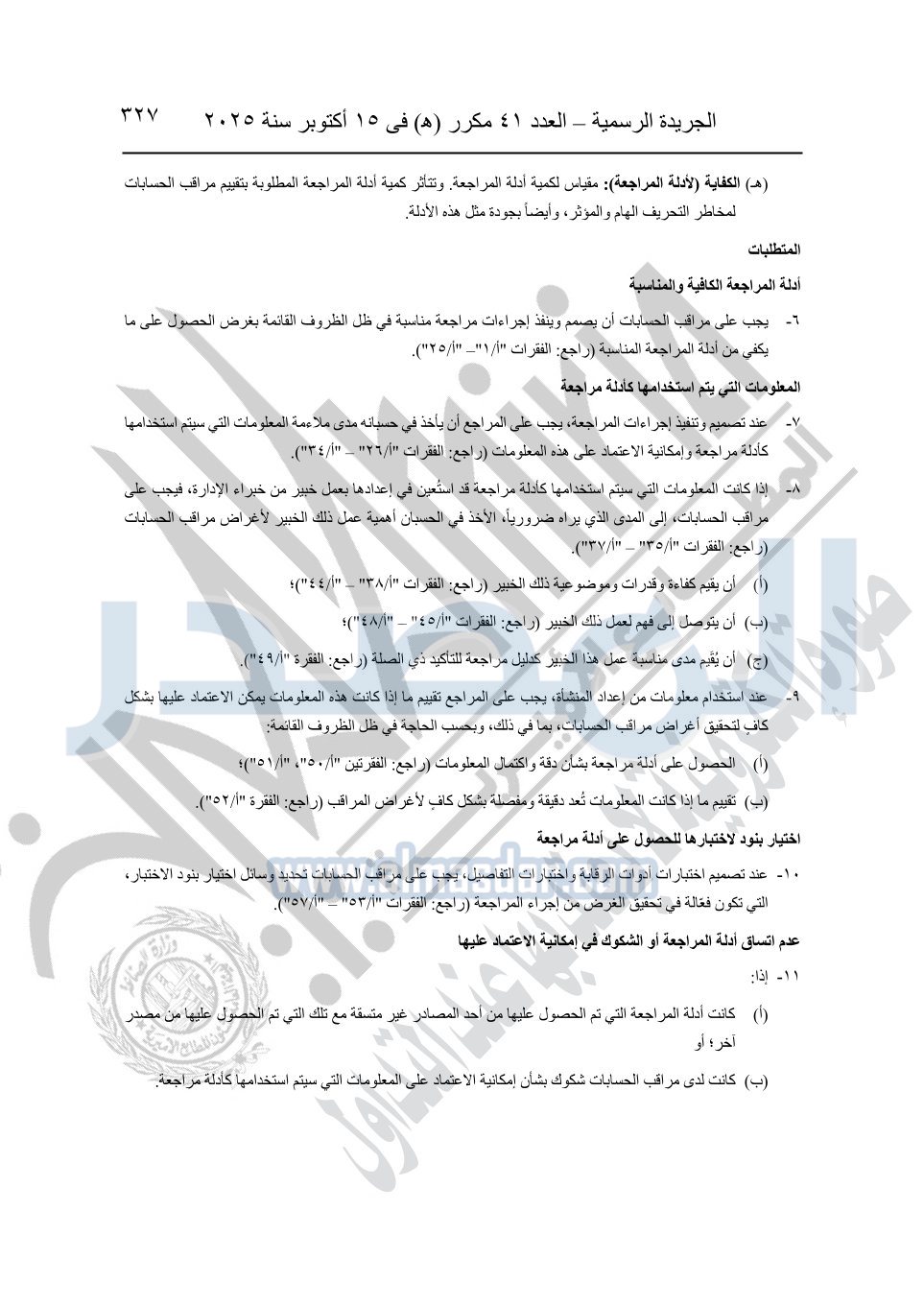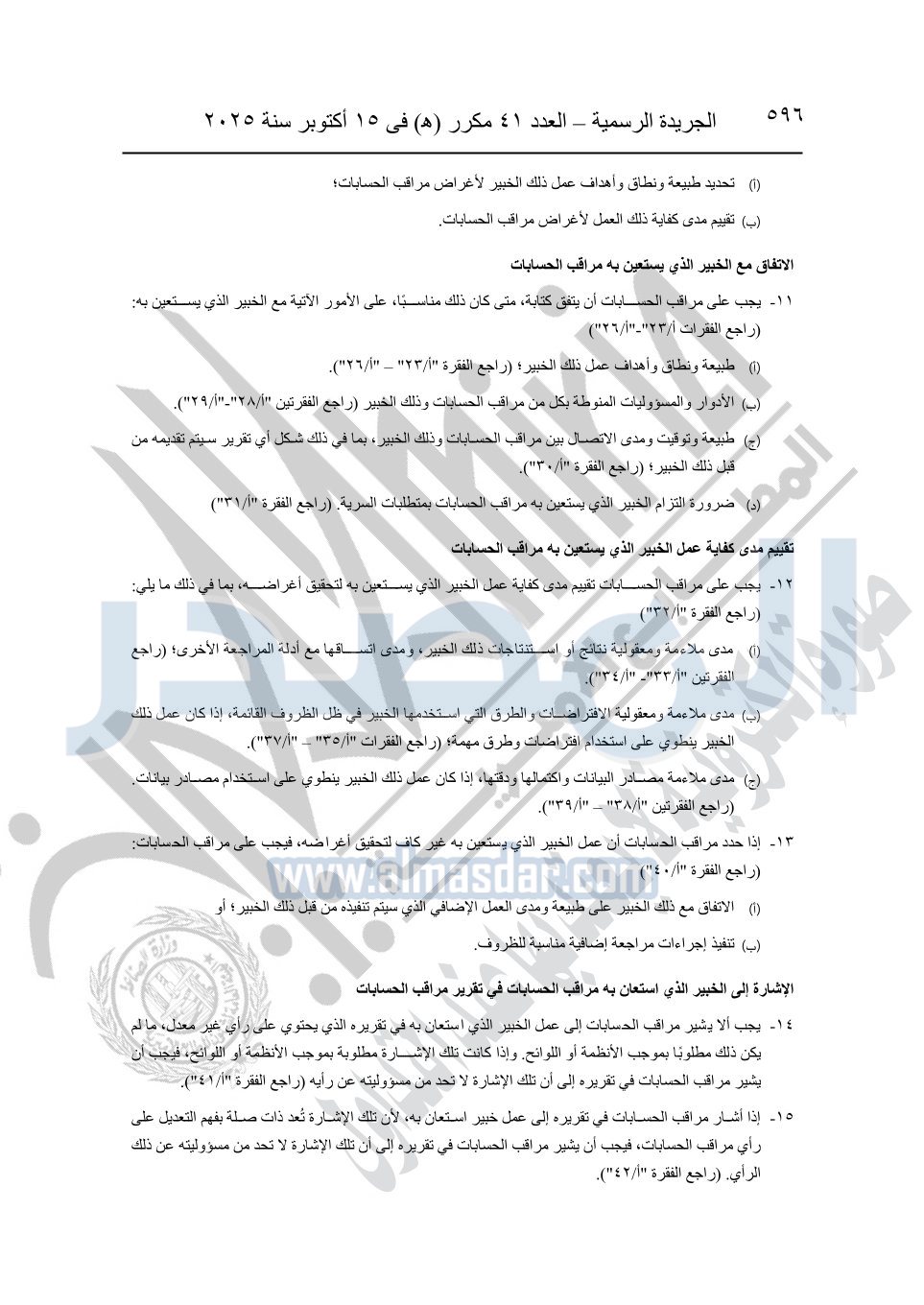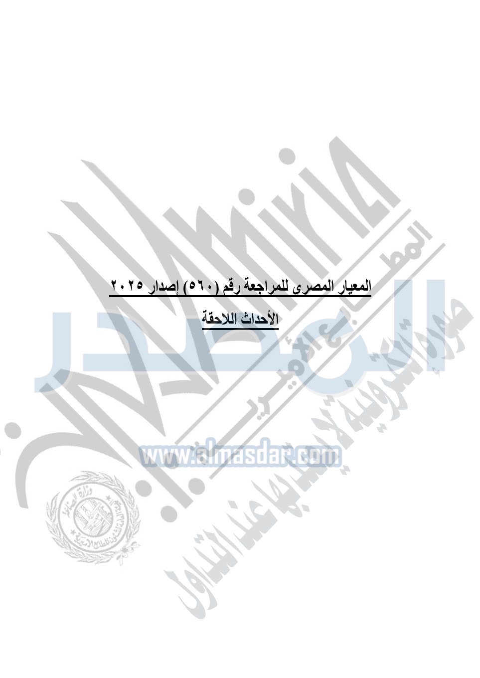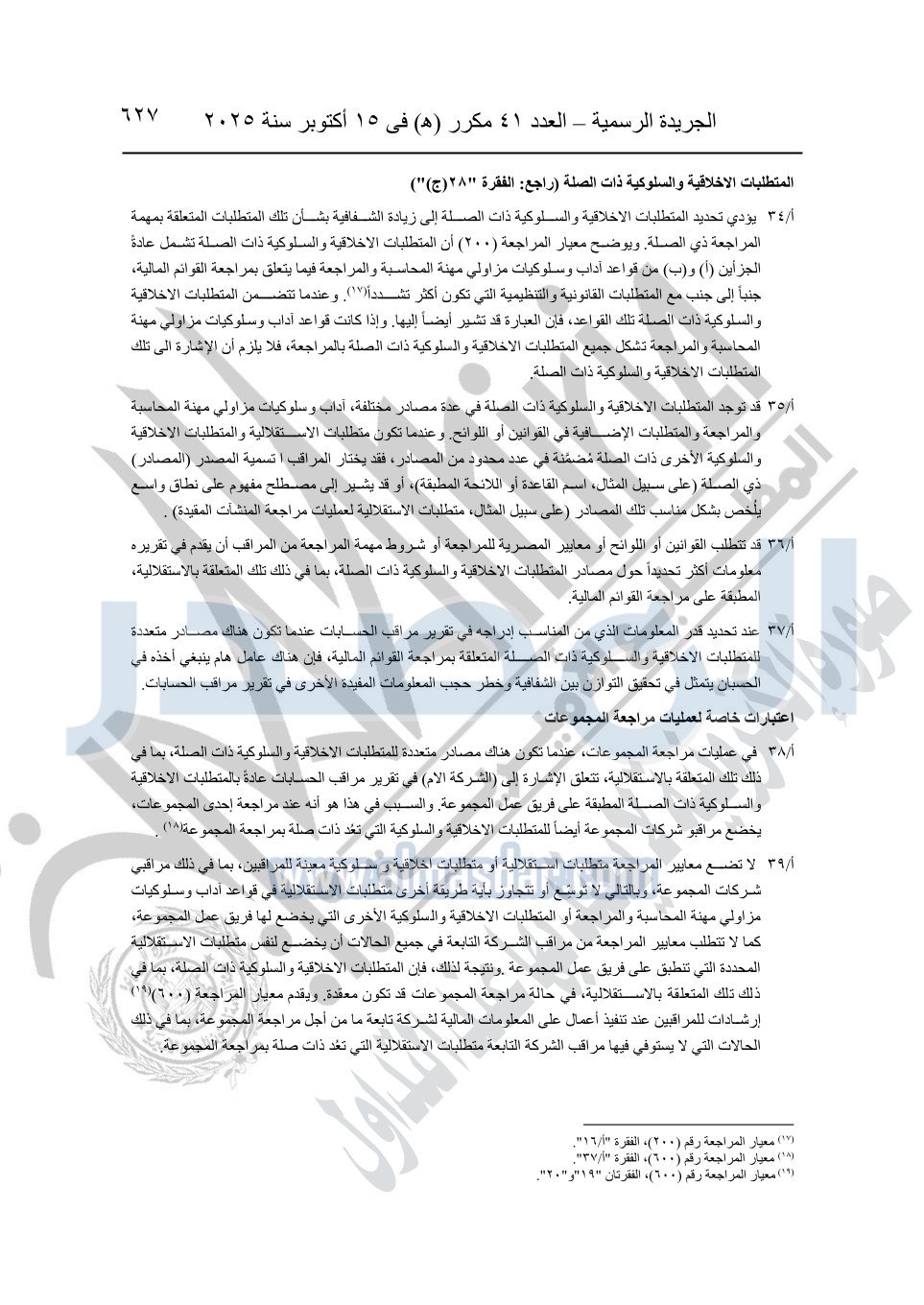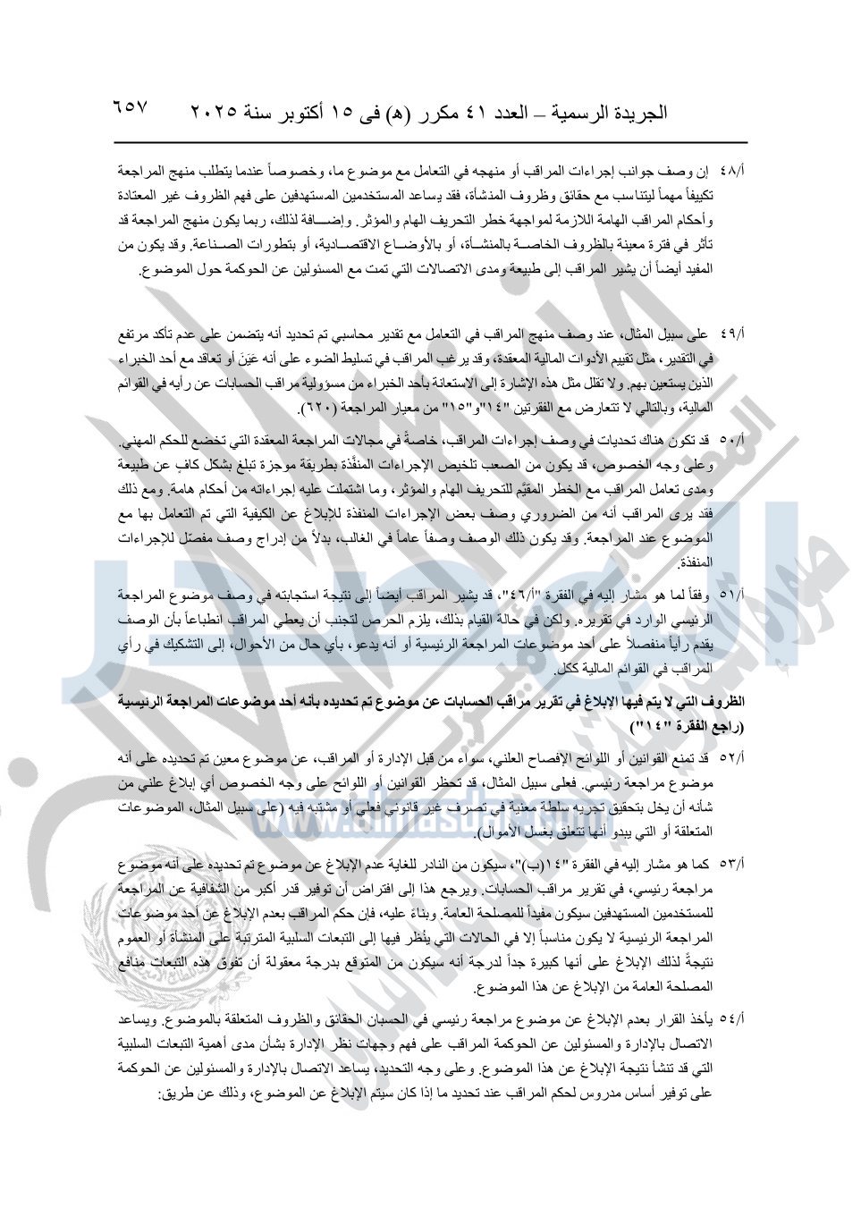 نشرت الجريدة الرسمية في العدد 41 مكرر "هـ" الصادر في 15 أكتوبر سنة 2025، قرار رئيس مجلس الوزراء رقم 3725 لسنة 2025، بشأن العمل بالمعايير المصرية للمراجعة والفحص المحدود ومهام التأكد الأخرى المرافقة لهذا القرار.