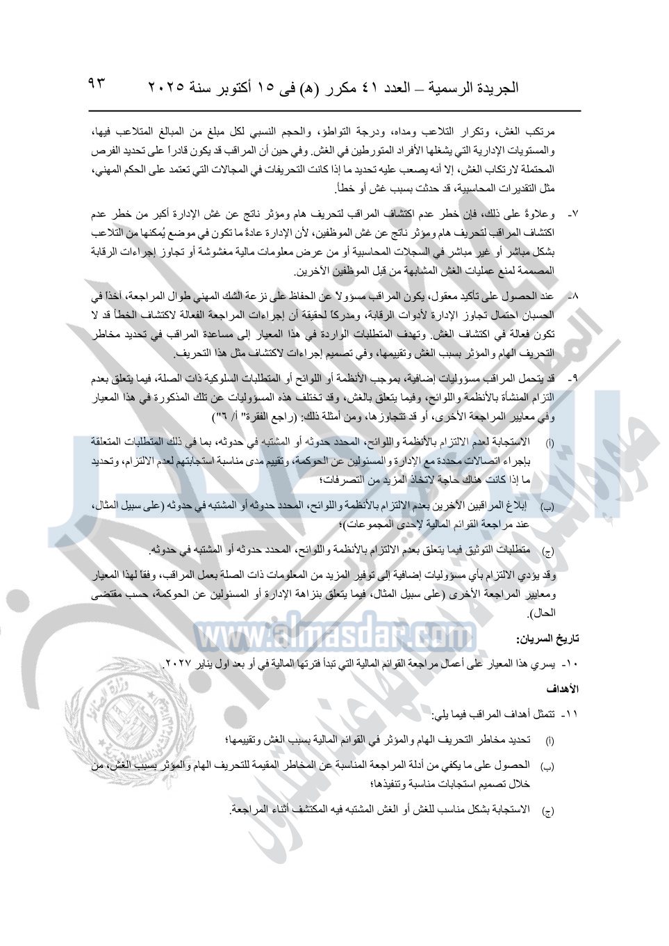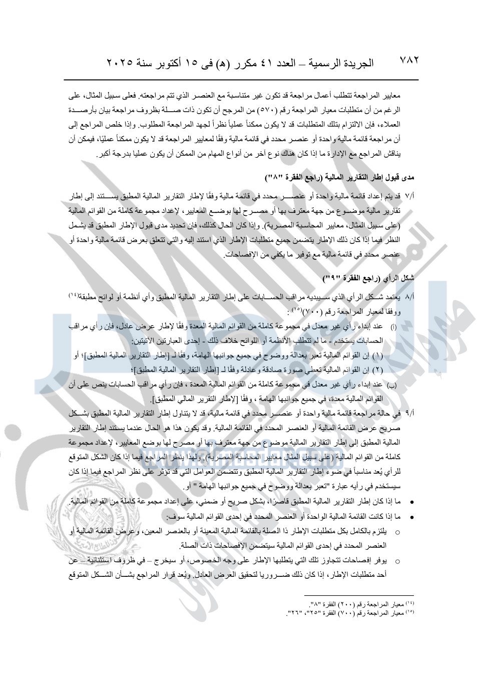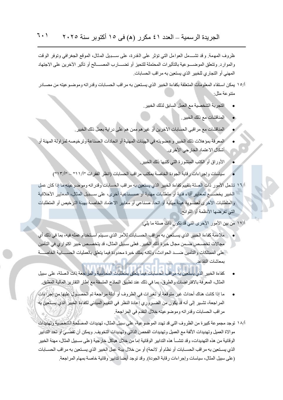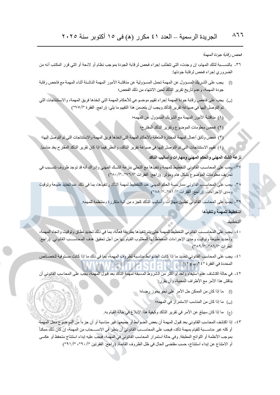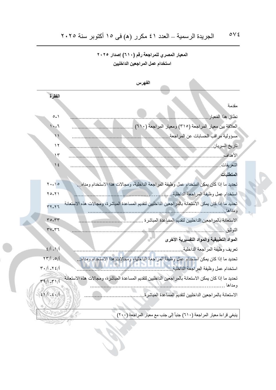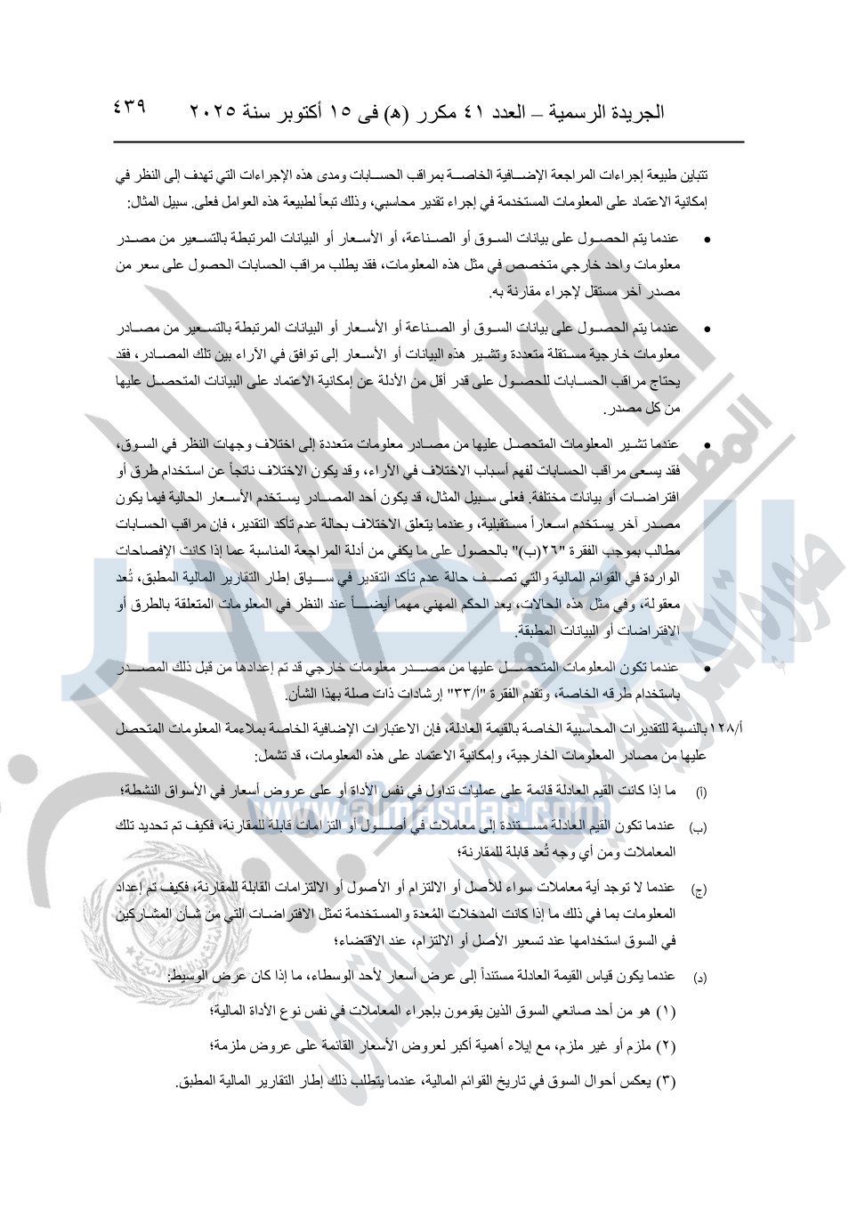 نشرت الجريدة الرسمية في العدد 41 مكرر "هـ" الصادر في 15 أكتوبر سنة 2025، قرار رئيس مجلس الوزراء رقم 3725 لسنة 2025، بشأن العمل بالمعايير المصرية للمراجعة والفحص المحدود ومهام التأكد الأخرى المرافقة لهذا القرار.