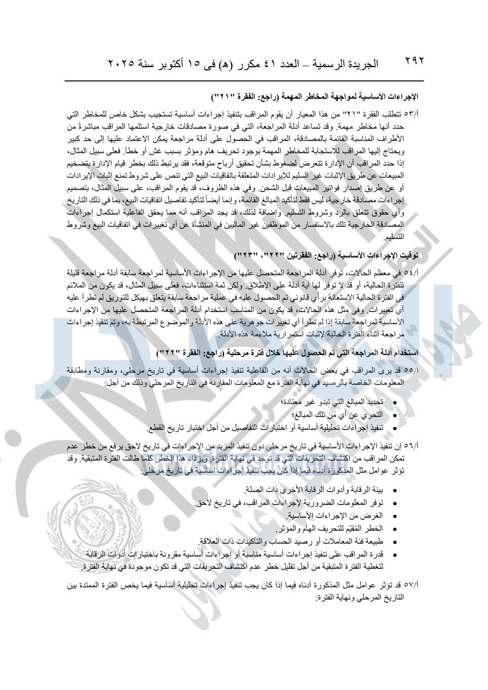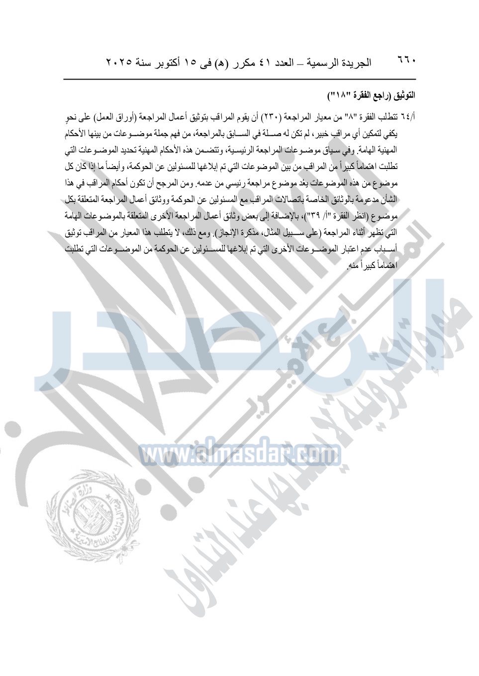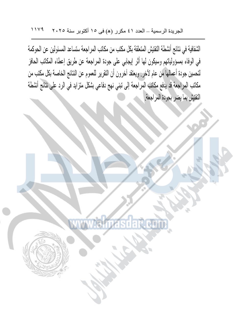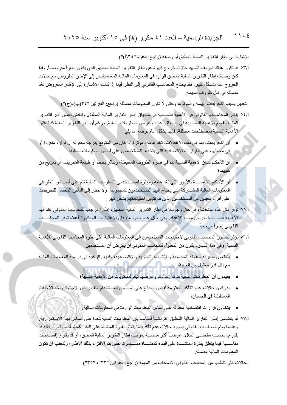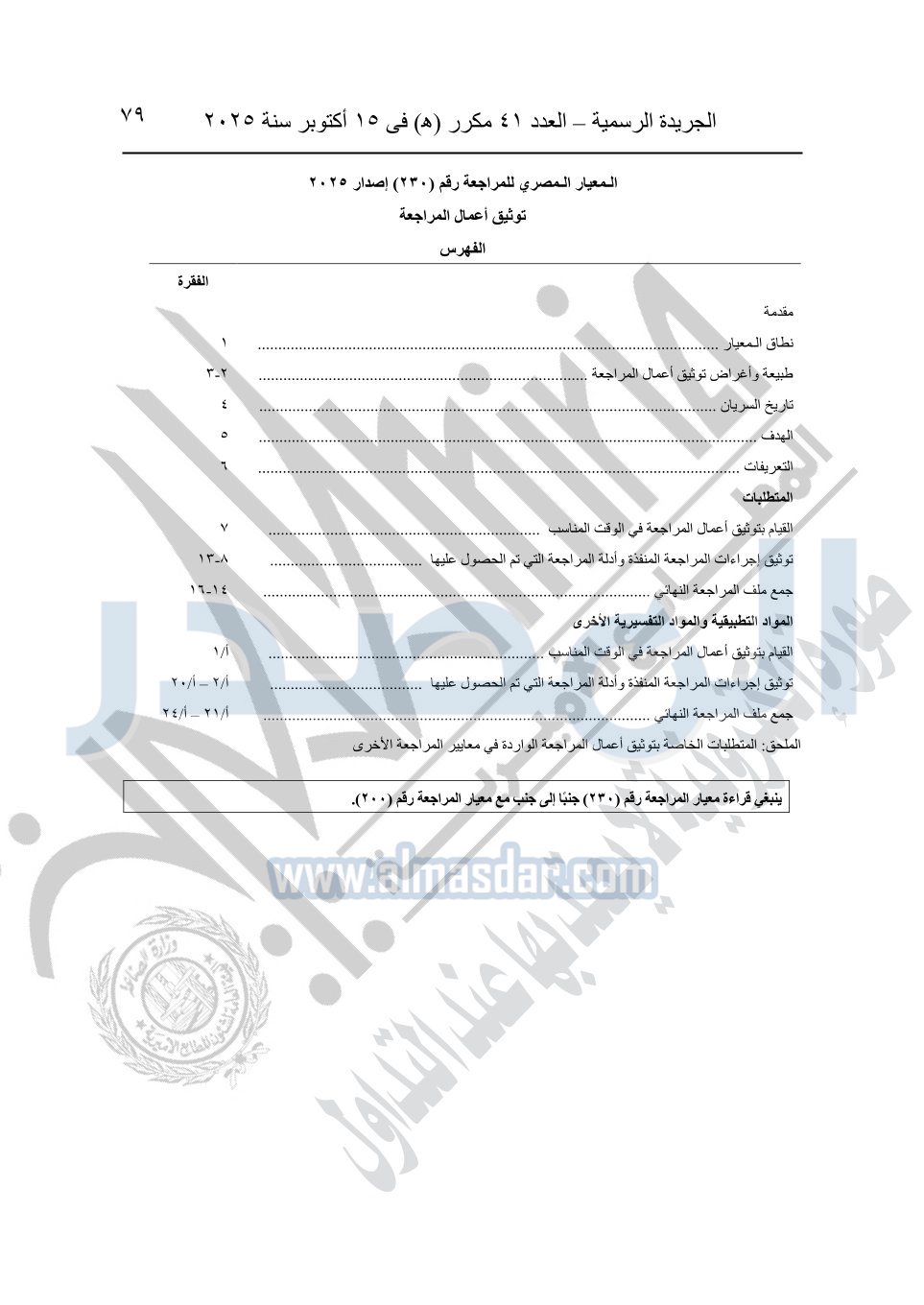 نشرت الجريدة الرسمية في العدد 41 مكرر "هـ" الصادر في 15 أكتوبر سنة 2025، قرار رئيس مجلس الوزراء رقم 3725 لسنة 2025، بشأن العمل بالمعايير المصرية للمراجعة والفحص المحدود ومهام التأكد الأخرى المرافقة لهذا القرار.