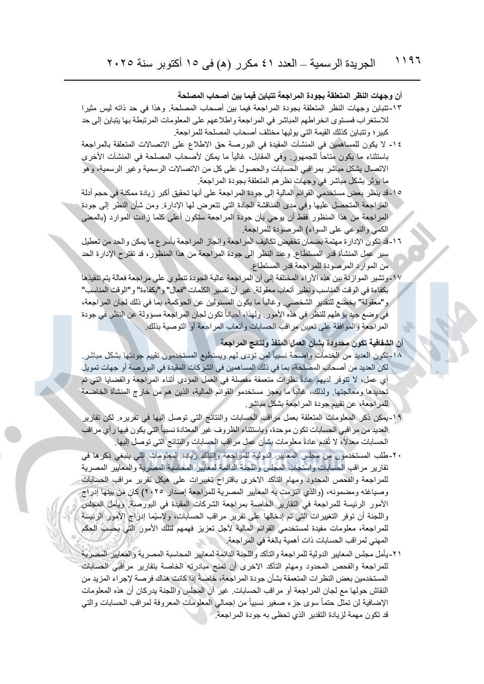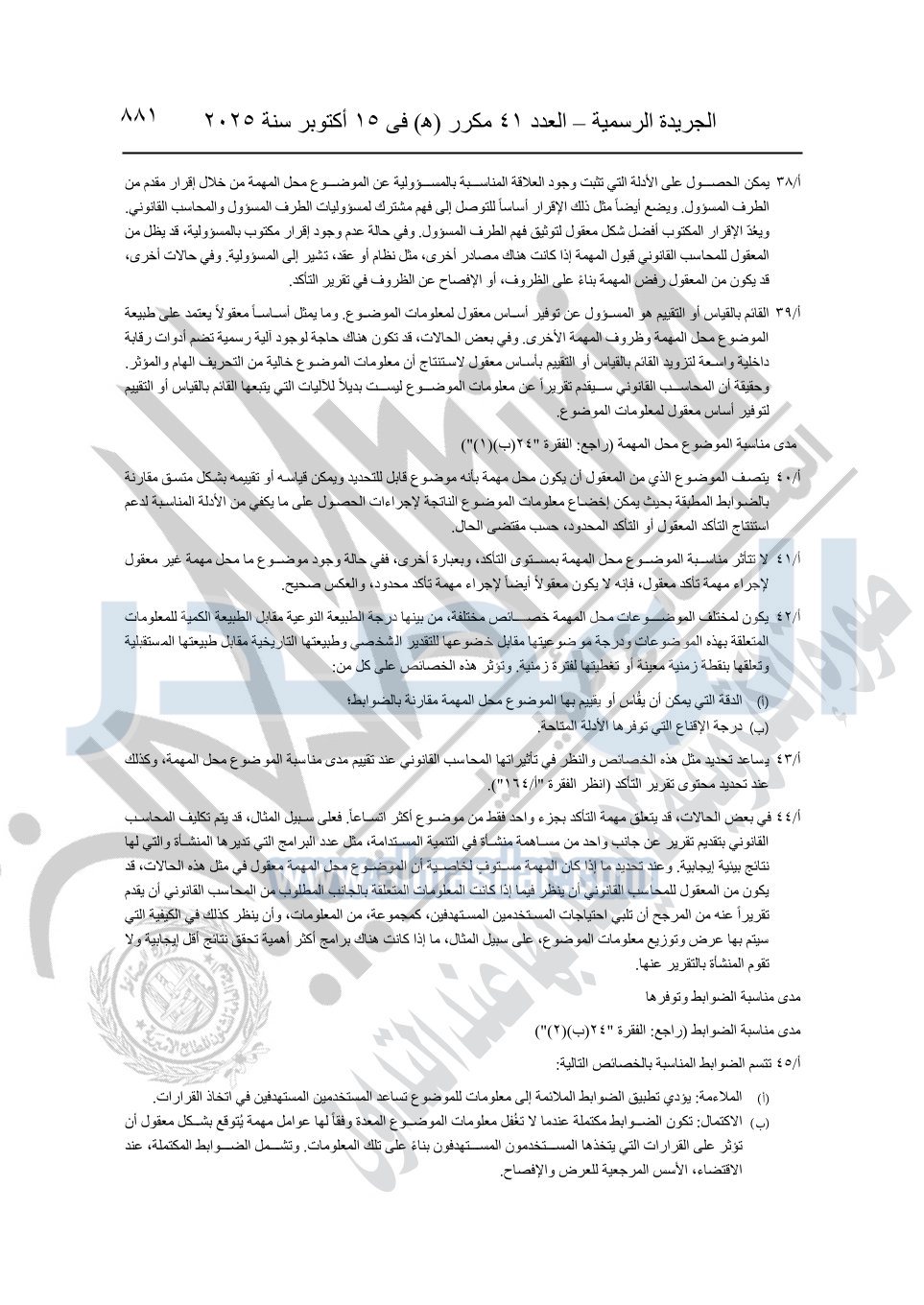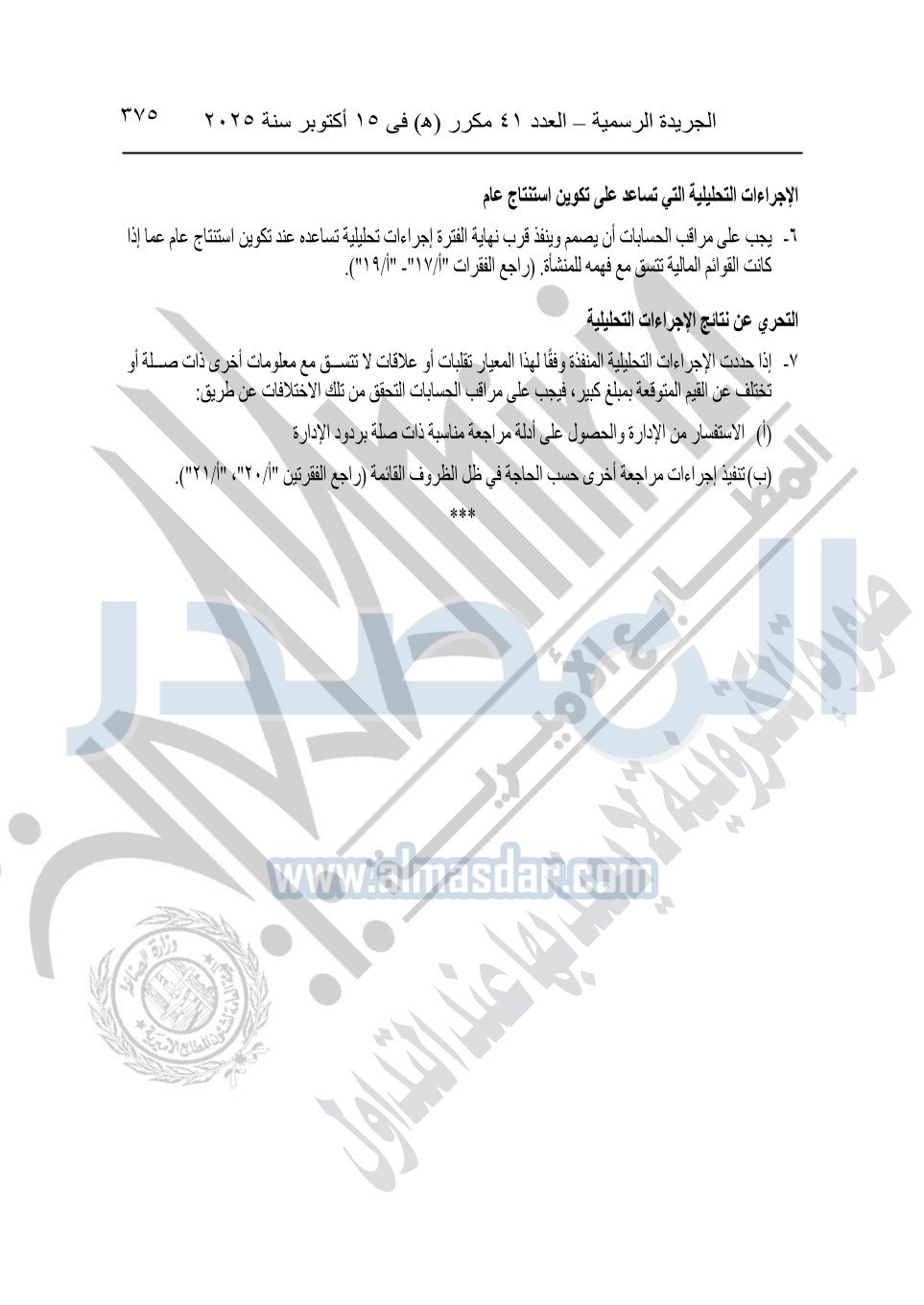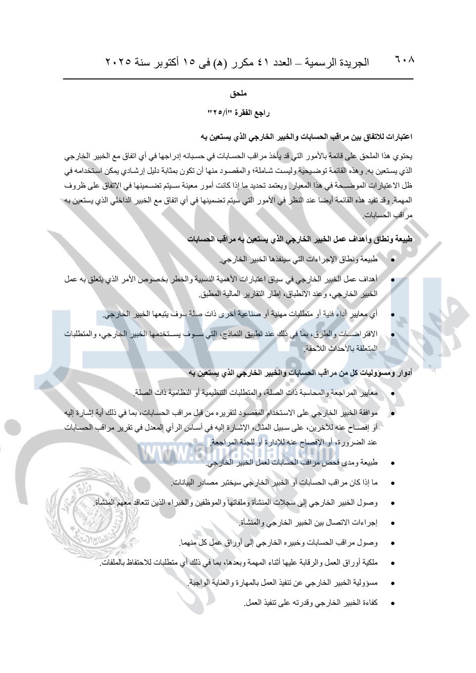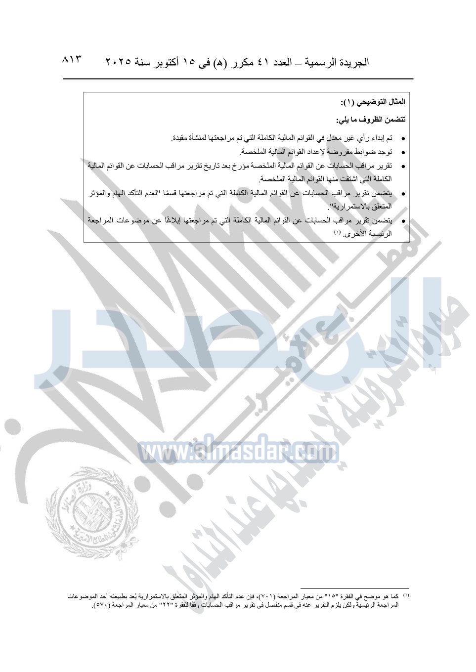 نشرت الجريدة الرسمية في العدد 41 مكرر "هـ" الصادر في 15 أكتوبر سنة 2025، قرار رئيس مجلس الوزراء رقم 3725 لسنة 2025، بشأن العمل بالمعايير المصرية للمراجعة والفحص المحدود ومهام التأكد الأخرى المرافقة لهذا القرار.