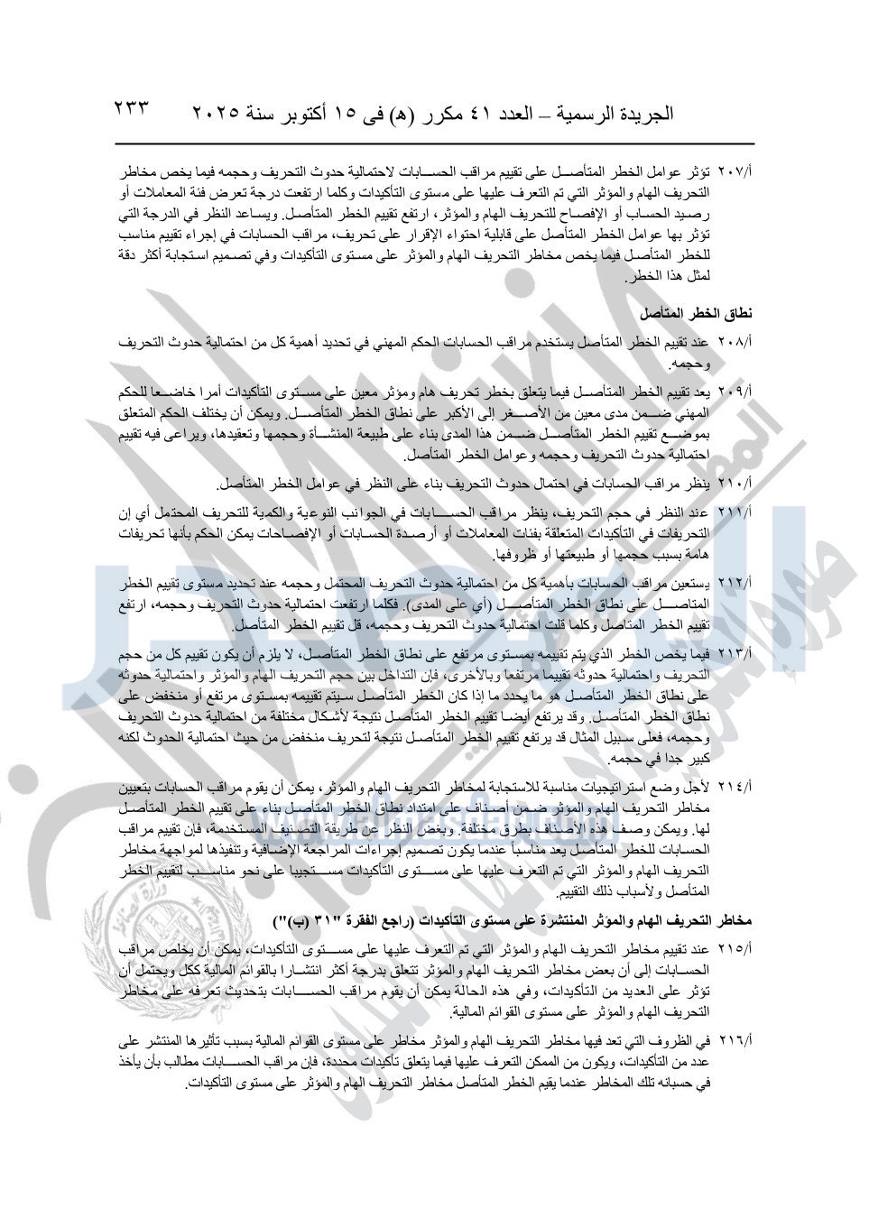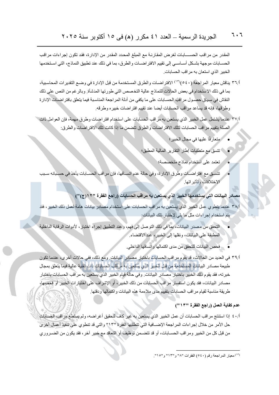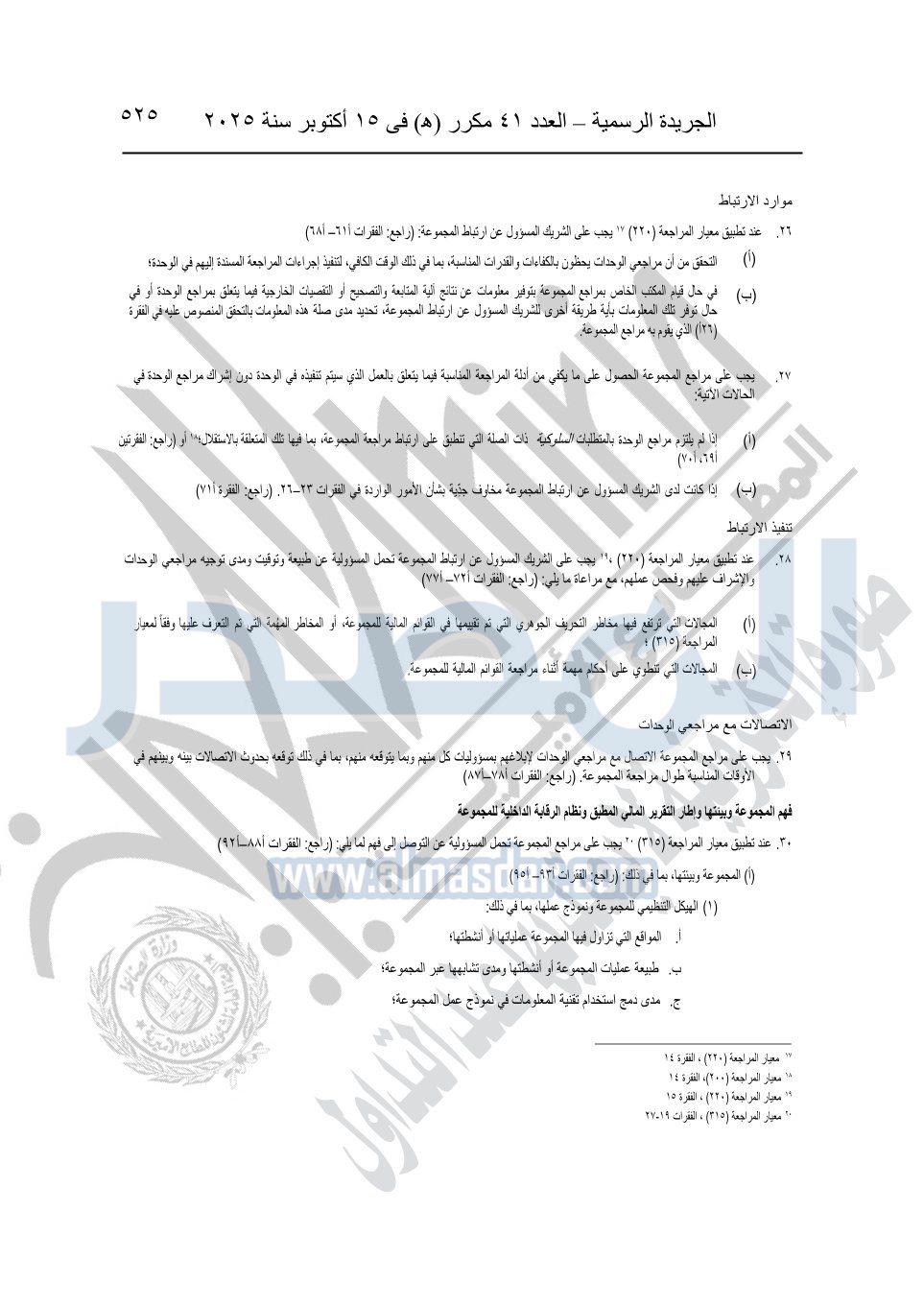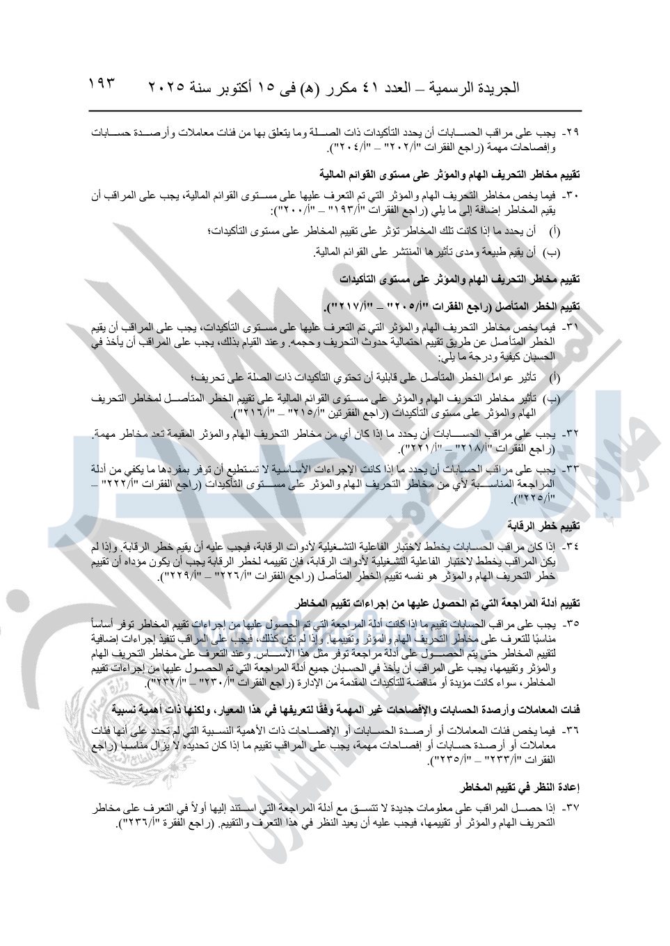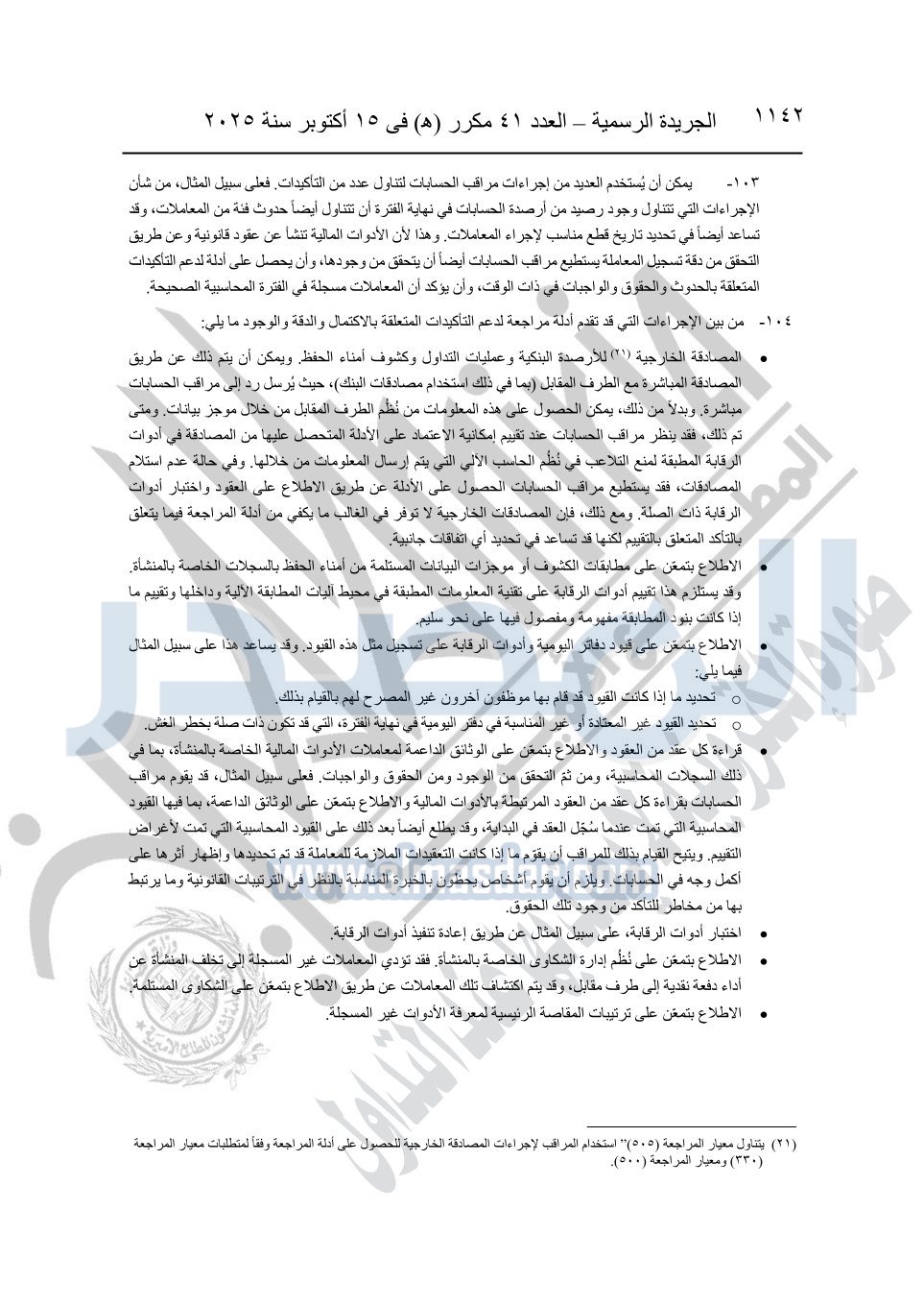 نشرت الجريدة الرسمية في العدد 41 مكرر "هـ" الصادر في 15 أكتوبر سنة 2025، قرار رئيس مجلس الوزراء رقم 3725 لسنة 2025، بشأن العمل بالمعايير المصرية للمراجعة والفحص المحدود ومهام التأكد الأخرى المرافقة لهذا القرار.