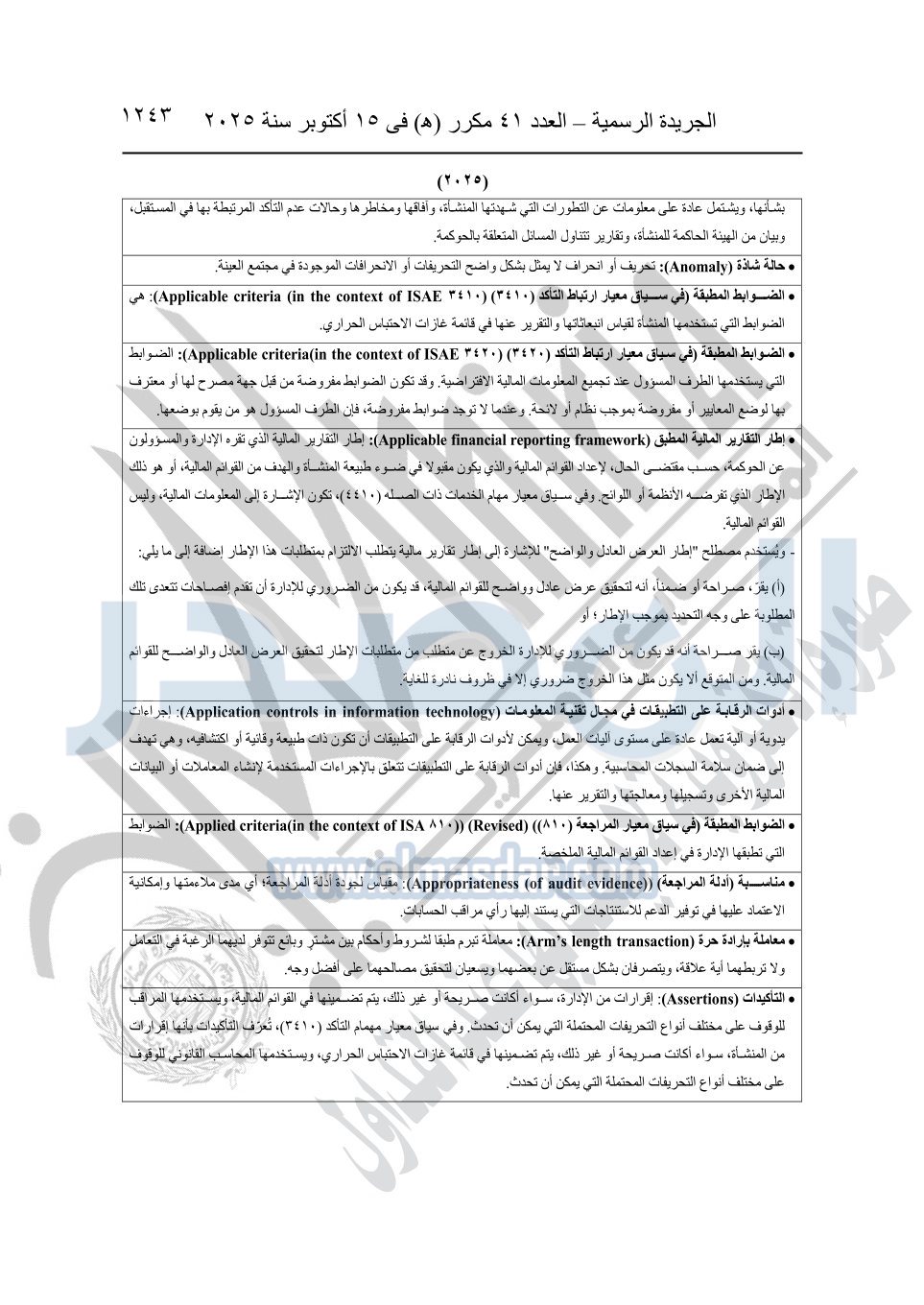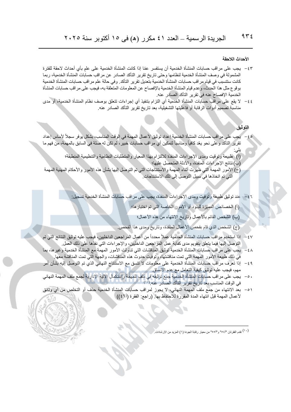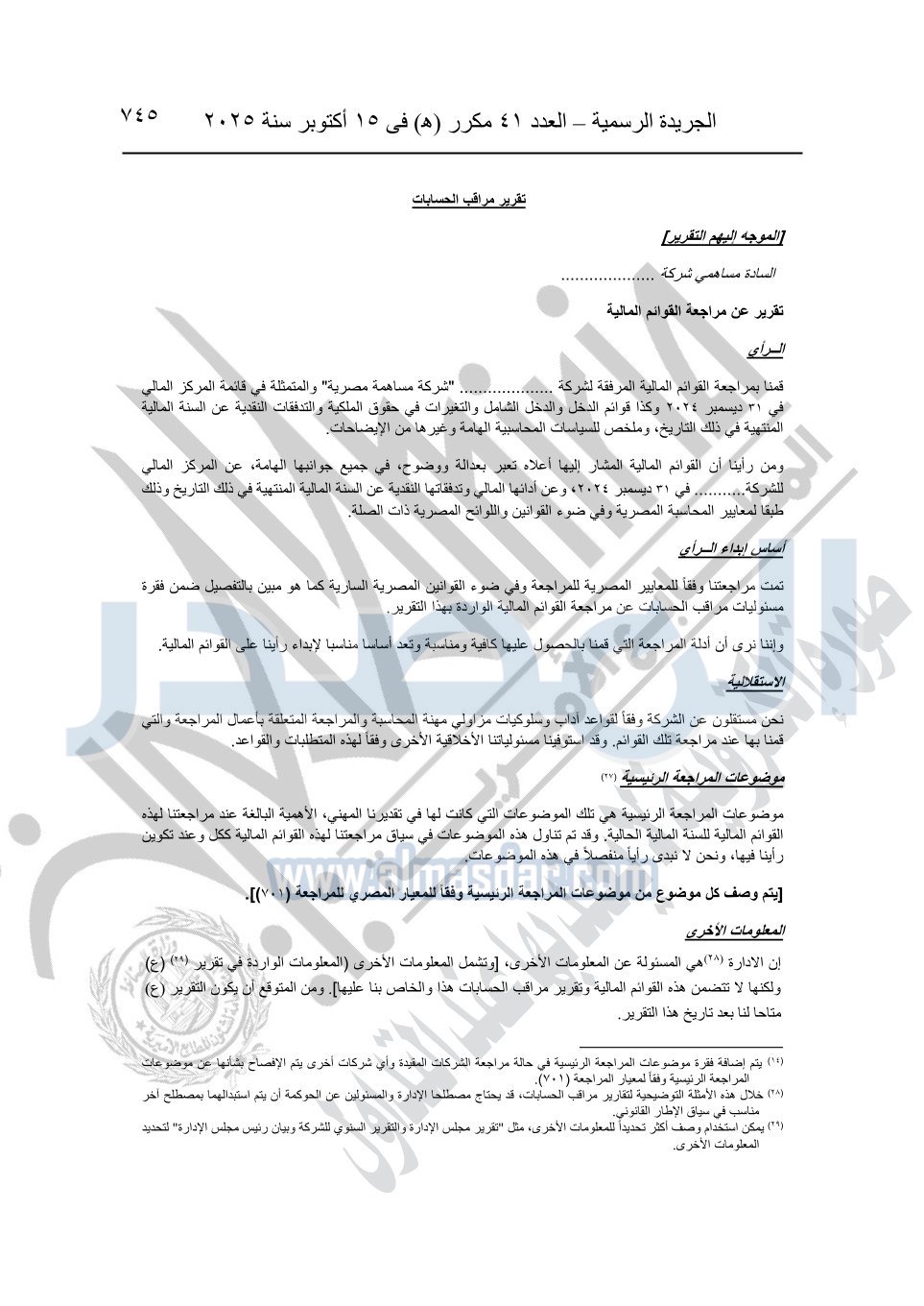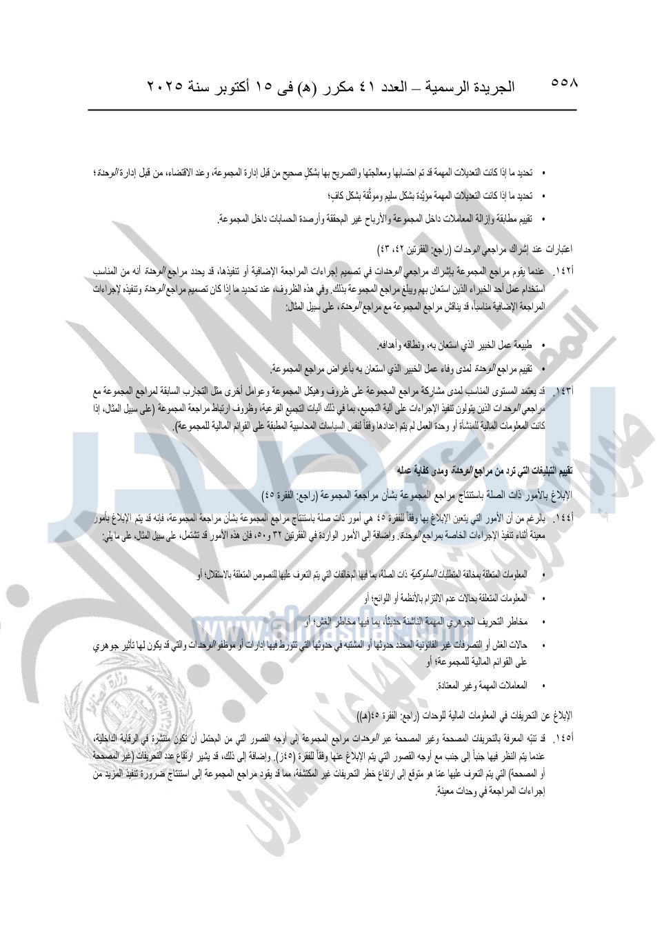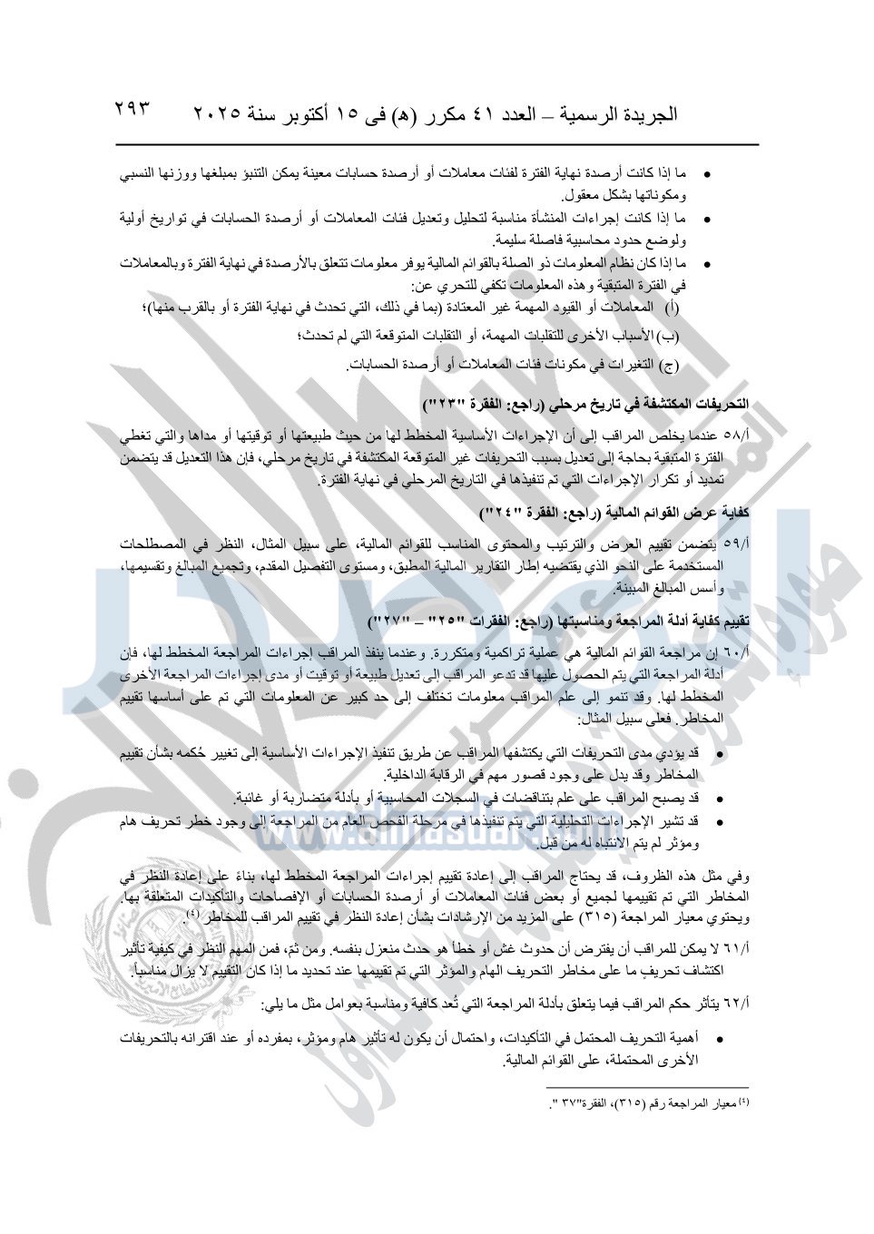 نشرت الجريدة الرسمية في العدد 41 مكرر "هـ" الصادر في 15 أكتوبر سنة 2025، قرار رئيس مجلس الوزراء رقم 3725 لسنة 2025، بشأن العمل بالمعايير المصرية للمراجعة والفحص المحدود ومهام التأكد الأخرى المرافقة لهذا القرار.