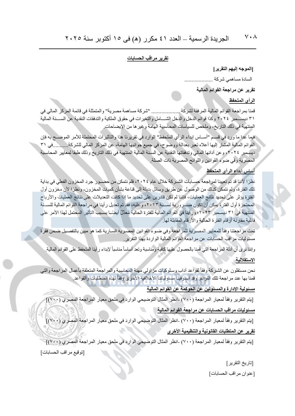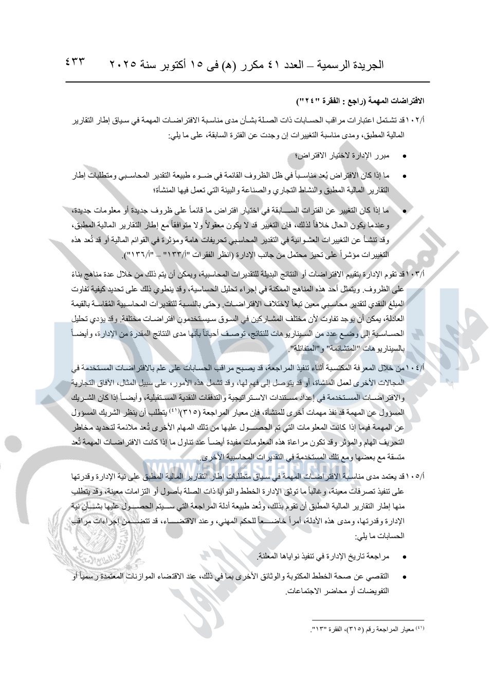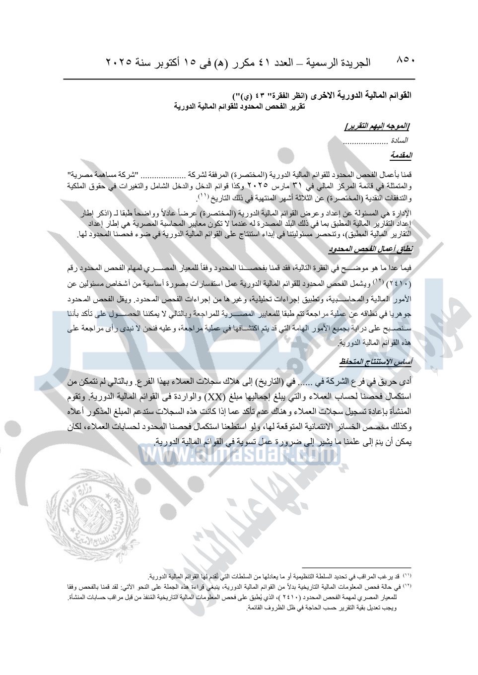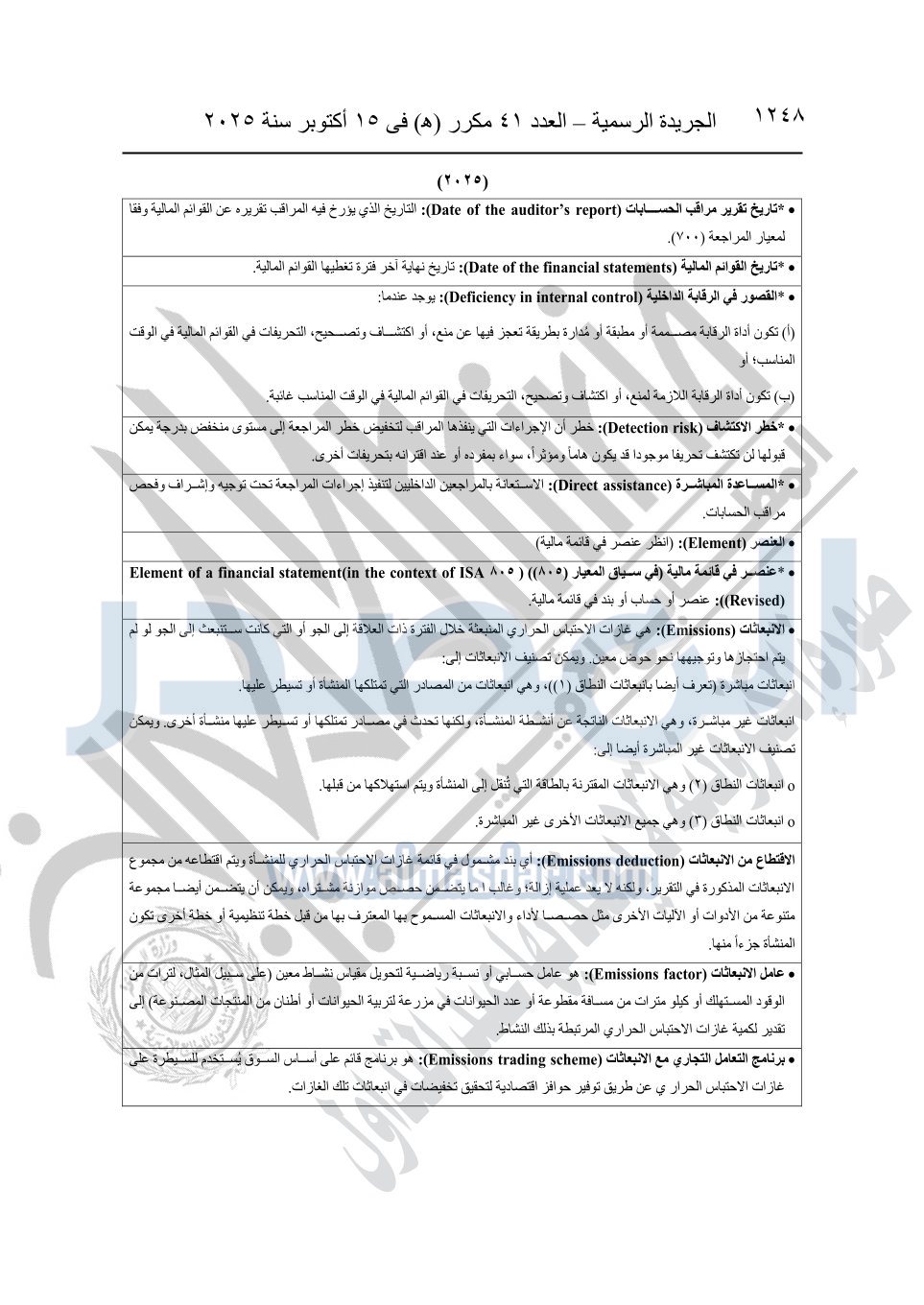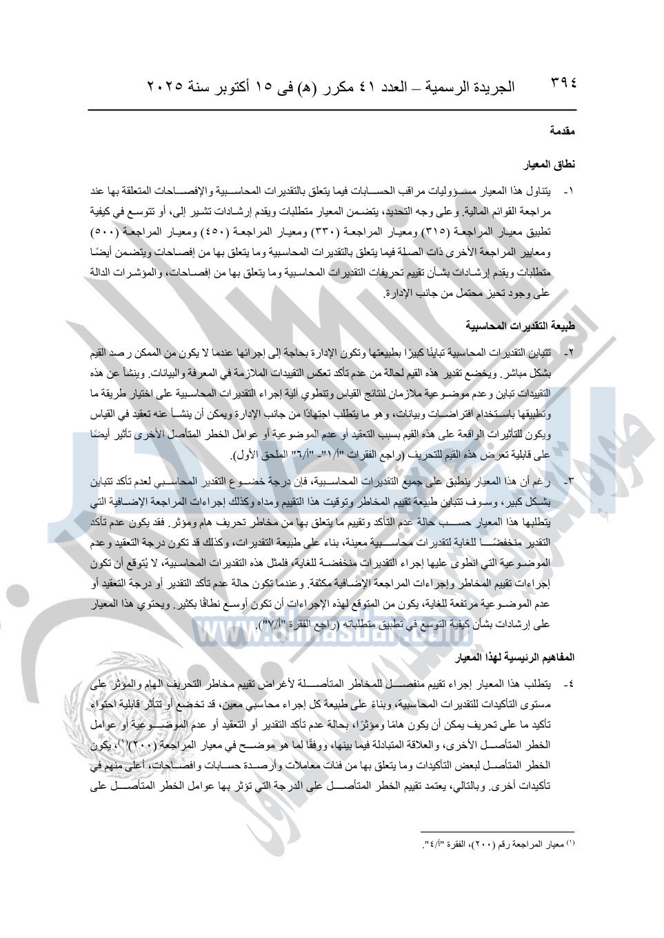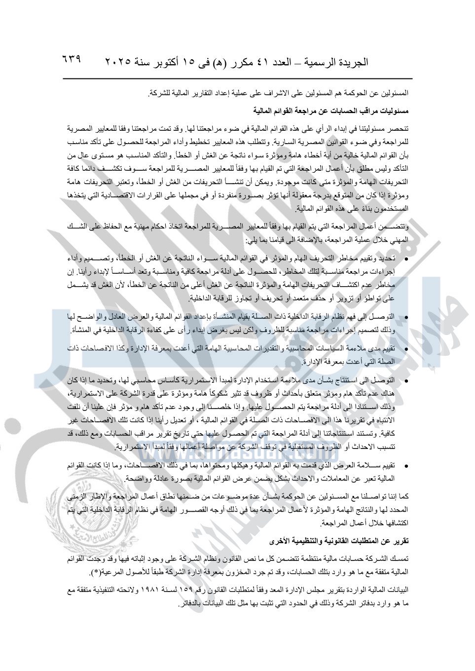 نشرت الجريدة الرسمية في العدد 41 مكرر "هـ" الصادر في 15 أكتوبر سنة 2025، قرار رئيس مجلس الوزراء رقم 3725 لسنة 2025، بشأن العمل بالمعايير المصرية للمراجعة والفحص المحدود ومهام التأكد الأخرى المرافقة لهذا القرار.
