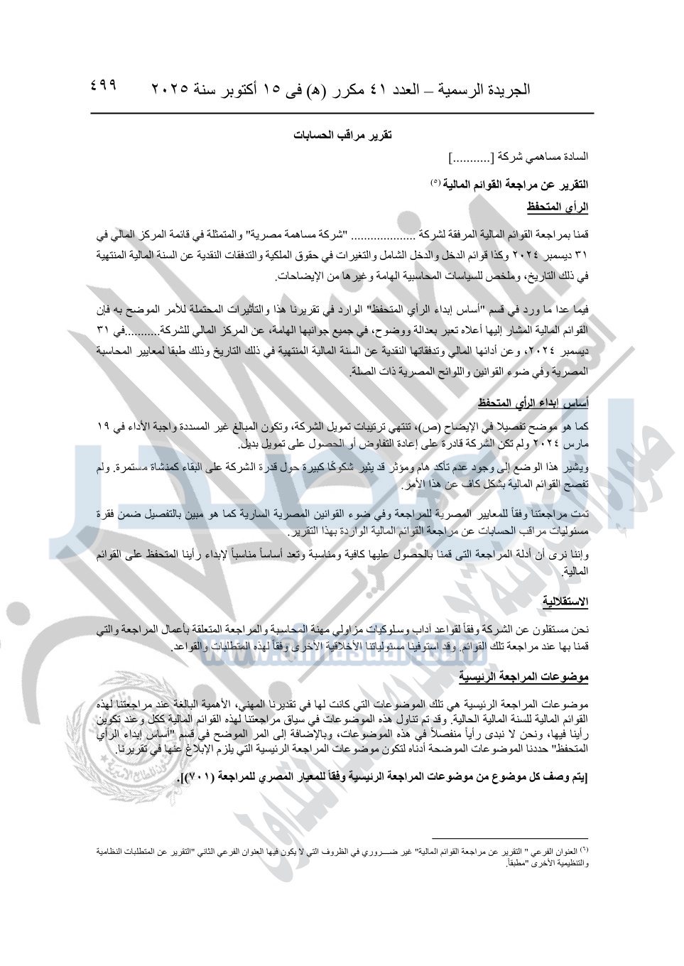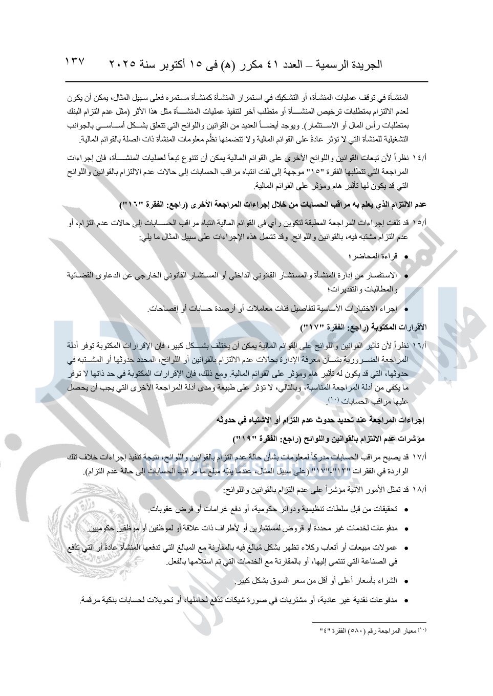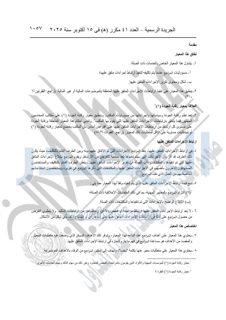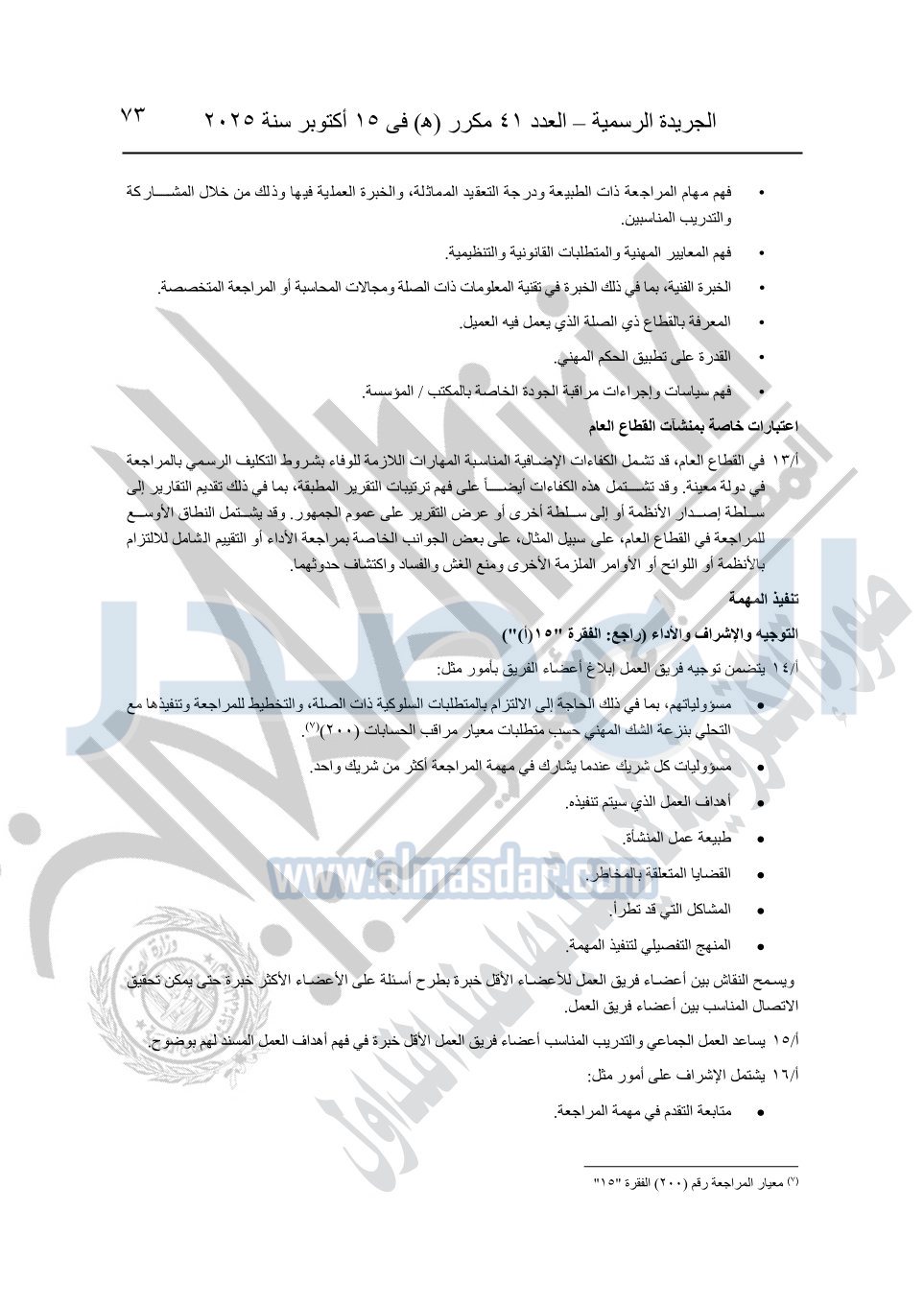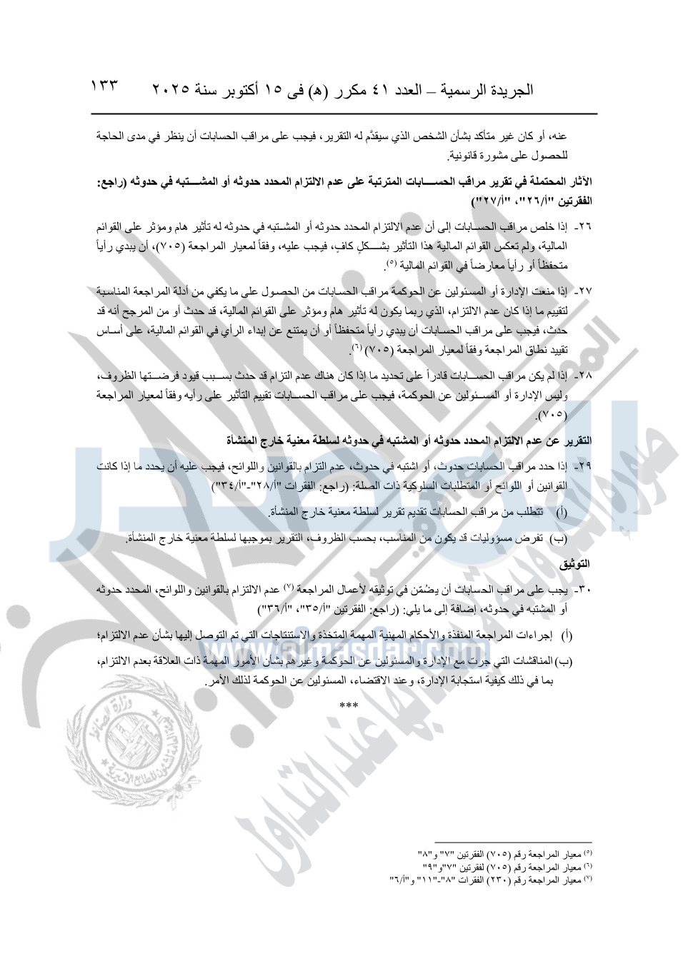 نشرت الجريدة الرسمية في العدد 41 مكرر "هـ" الصادر في 15 أكتوبر سنة 2025، قرار رئيس مجلس الوزراء رقم 3725 لسنة 2025، بشأن العمل بالمعايير المصرية للمراجعة والفحص المحدود ومهام التأكد الأخرى المرافقة لهذا القرار.