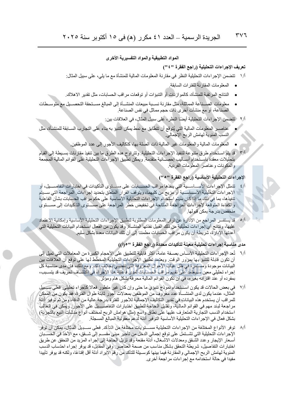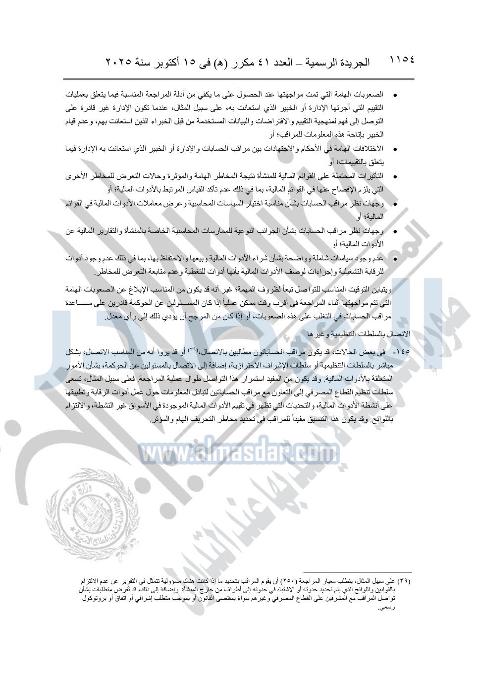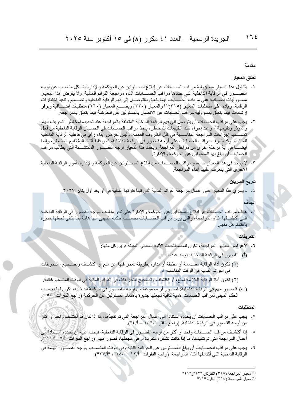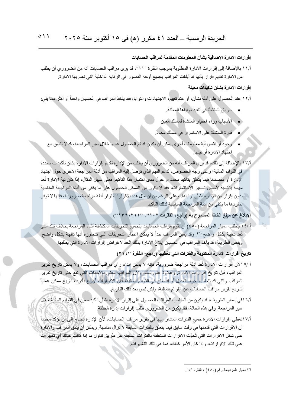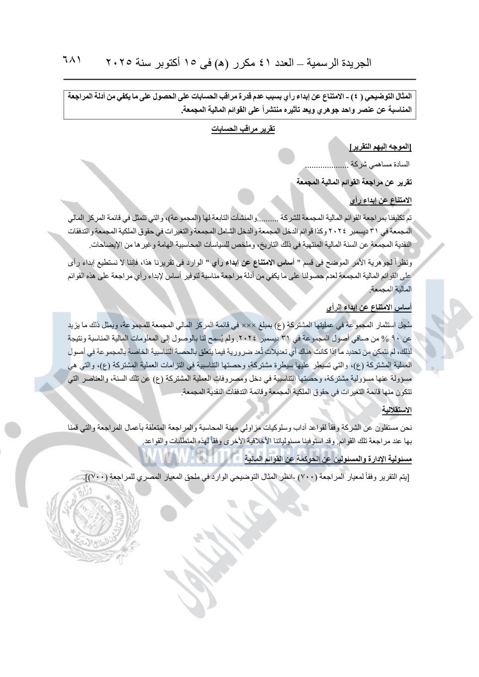 نشرت الجريدة الرسمية في العدد 41 مكرر "هـ" الصادر في 15 أكتوبر سنة 2025، قرار رئيس مجلس الوزراء رقم 3725 لسنة 2025، بشأن العمل بالمعايير المصرية للمراجعة والفحص المحدود ومهام التأكد الأخرى المرافقة لهذا القرار.