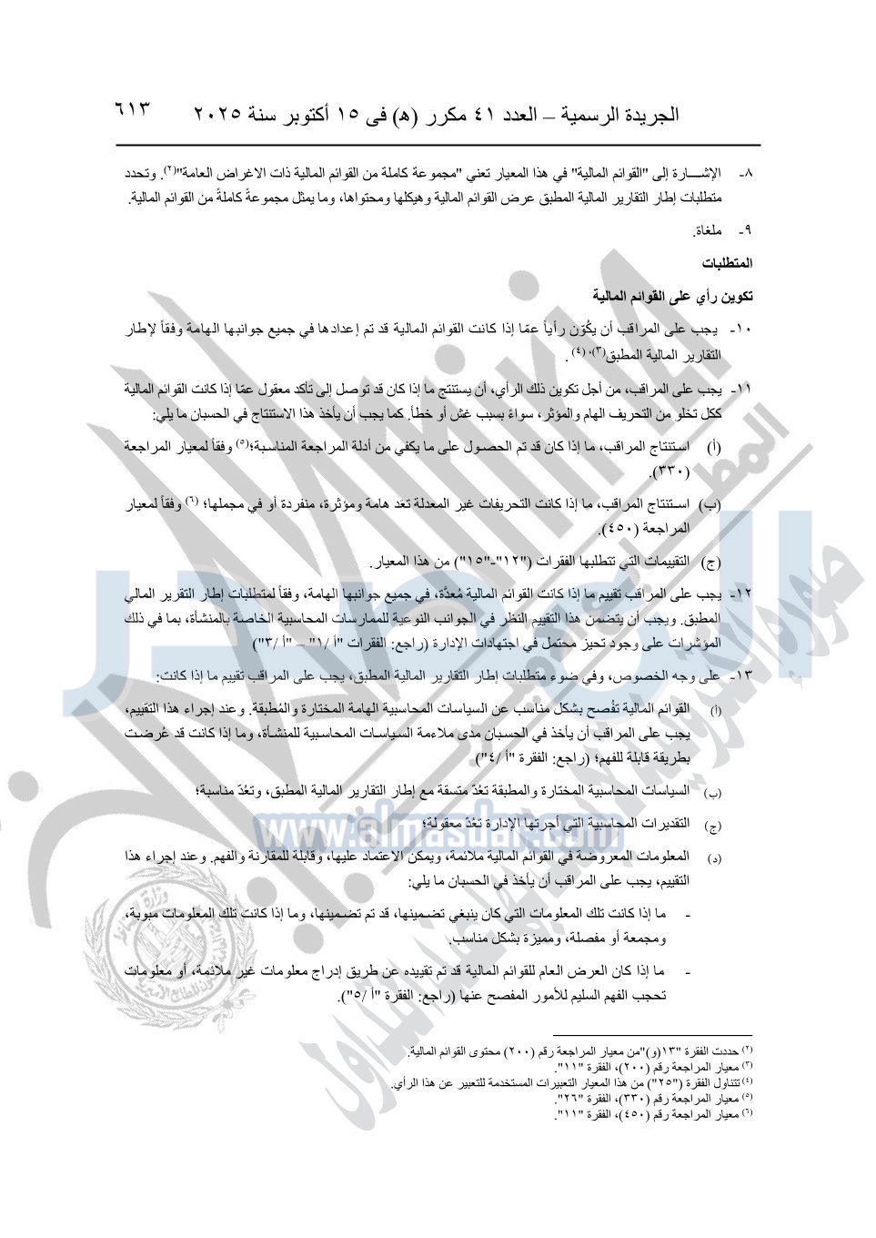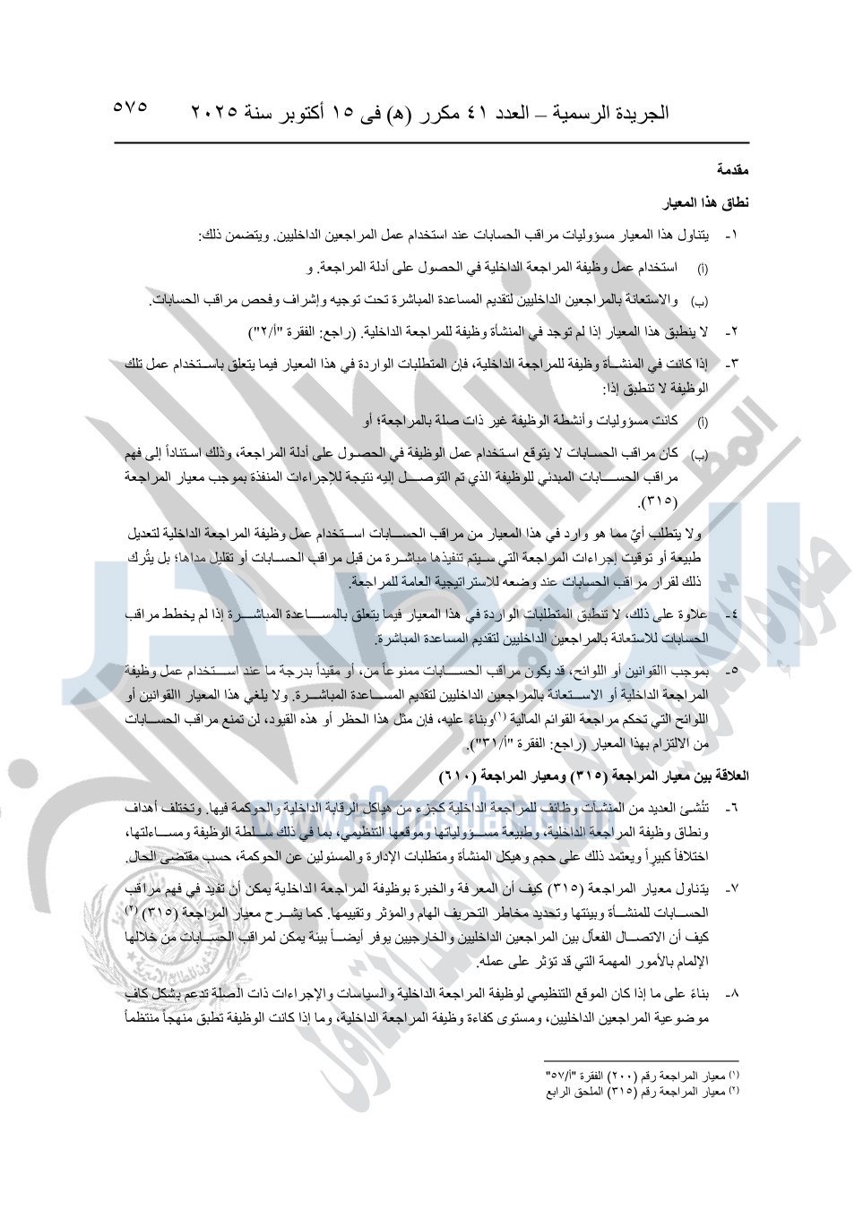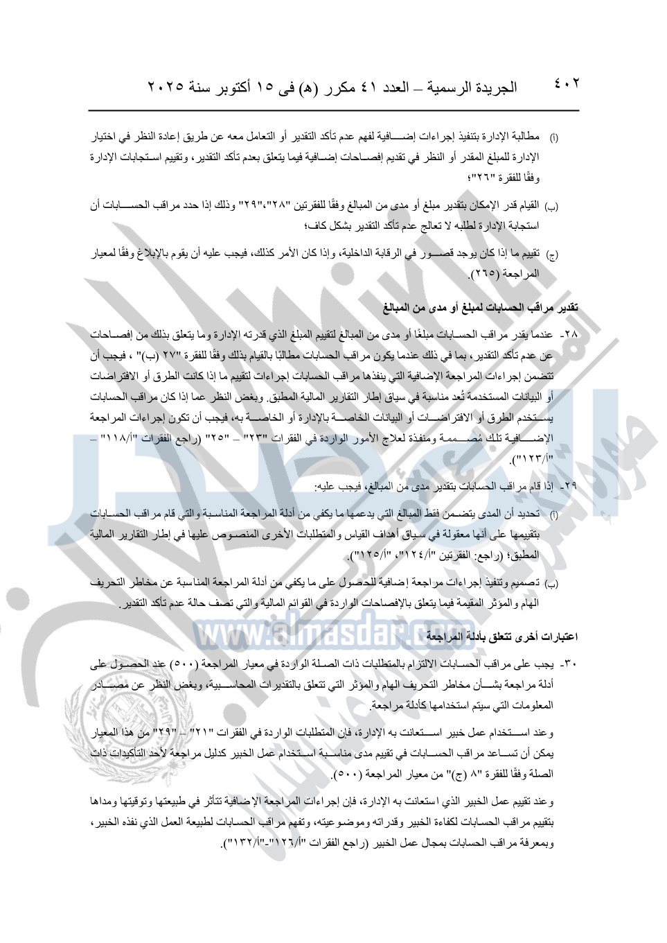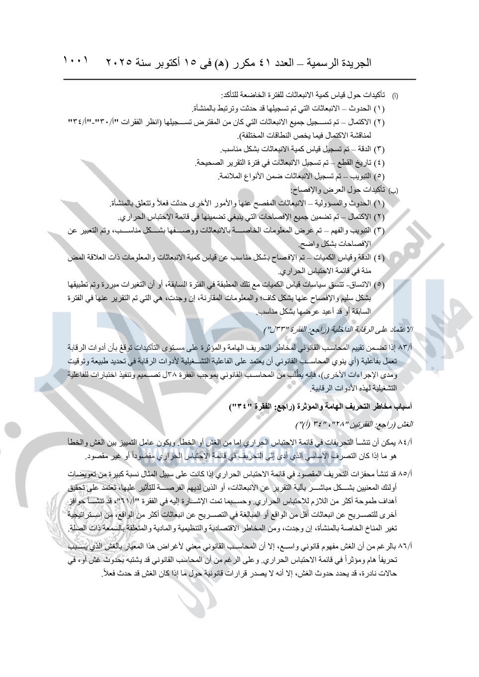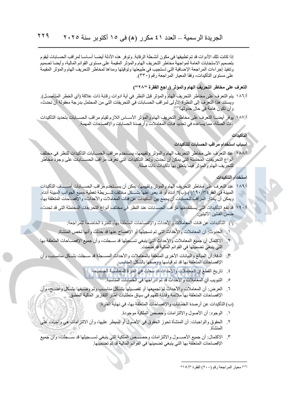 نشرت الجريدة الرسمية في العدد 41 مكرر "هـ" الصادر في 15 أكتوبر سنة 2025، قرار رئيس مجلس الوزراء رقم 3725 لسنة 2025، بشأن العمل بالمعايير المصرية للمراجعة والفحص المحدود ومهام التأكد الأخرى المرافقة لهذا القرار.