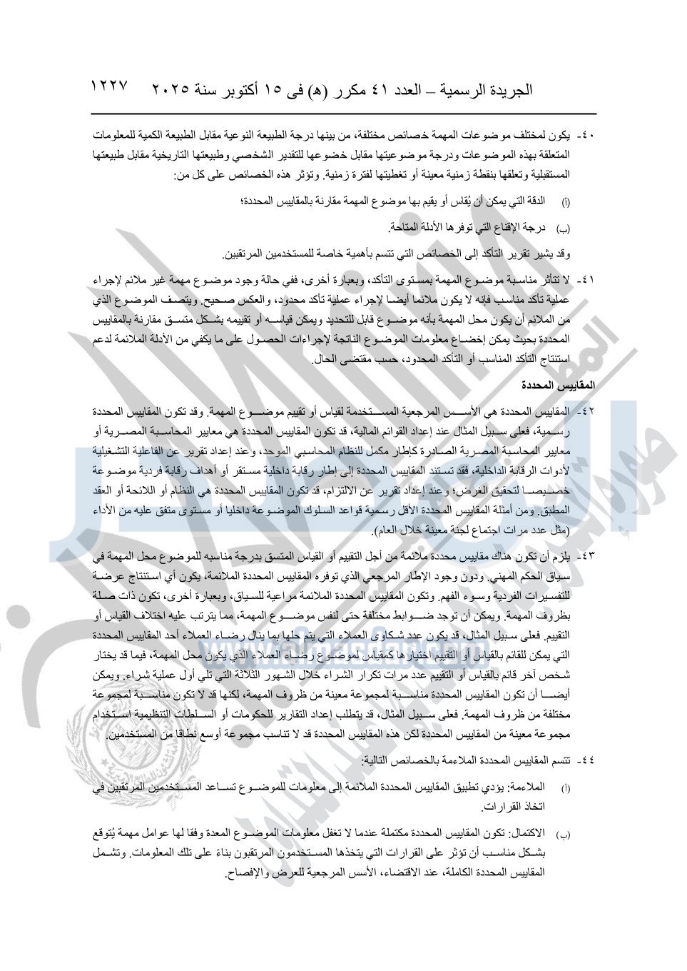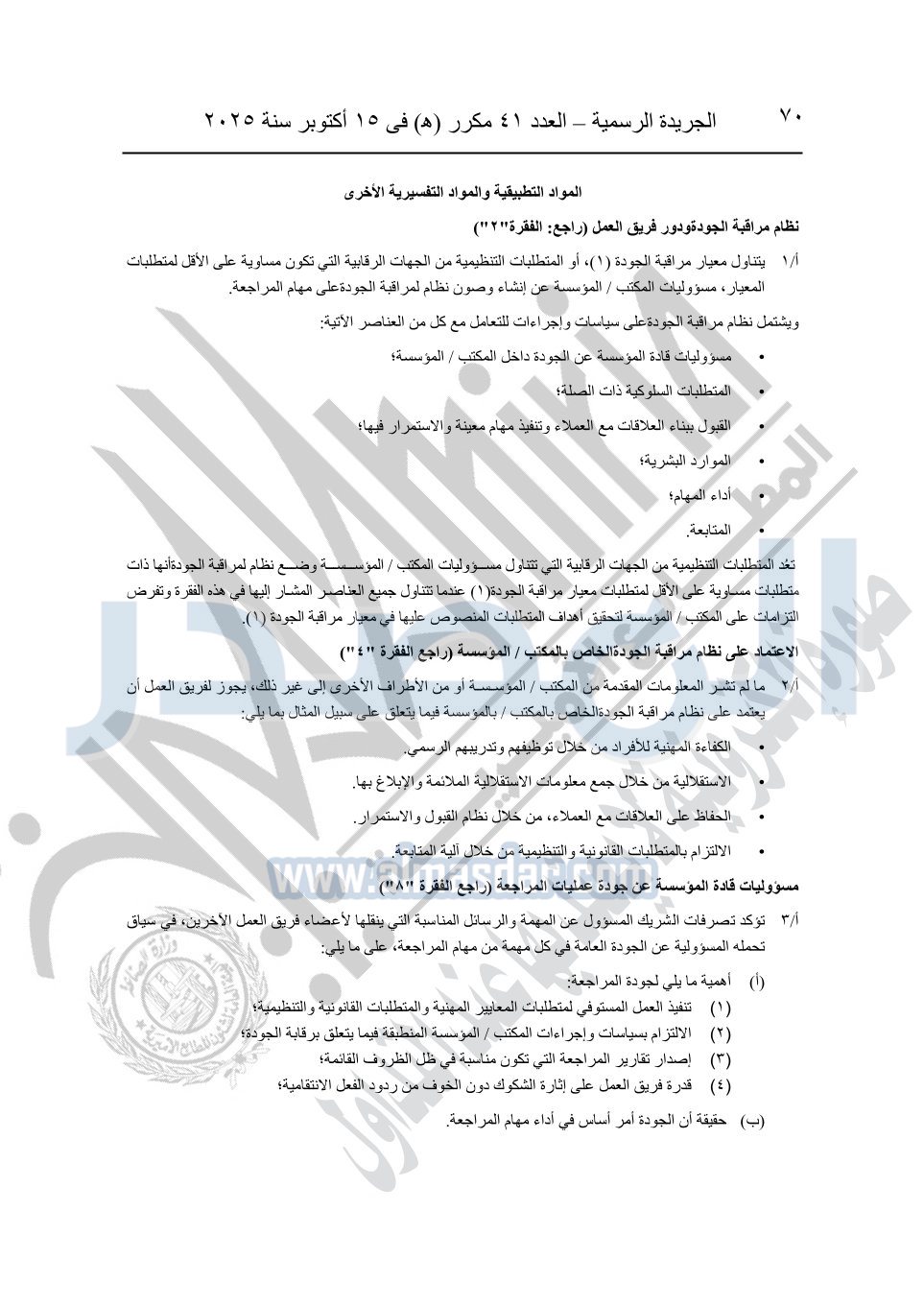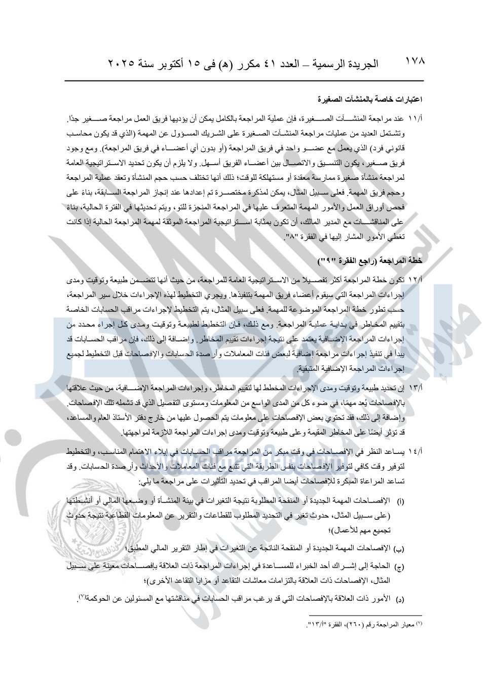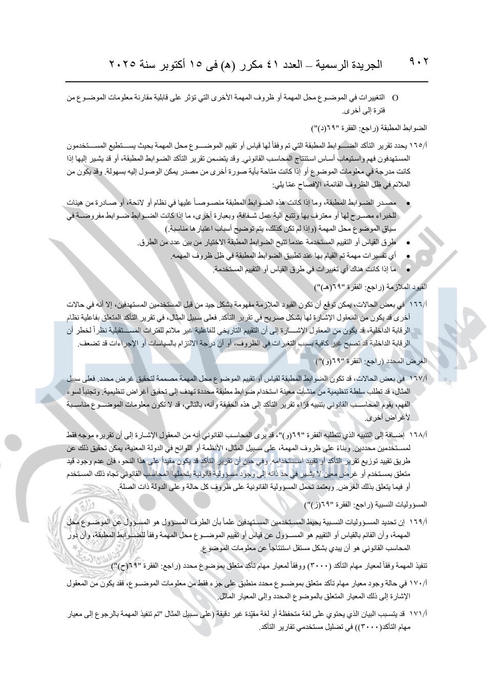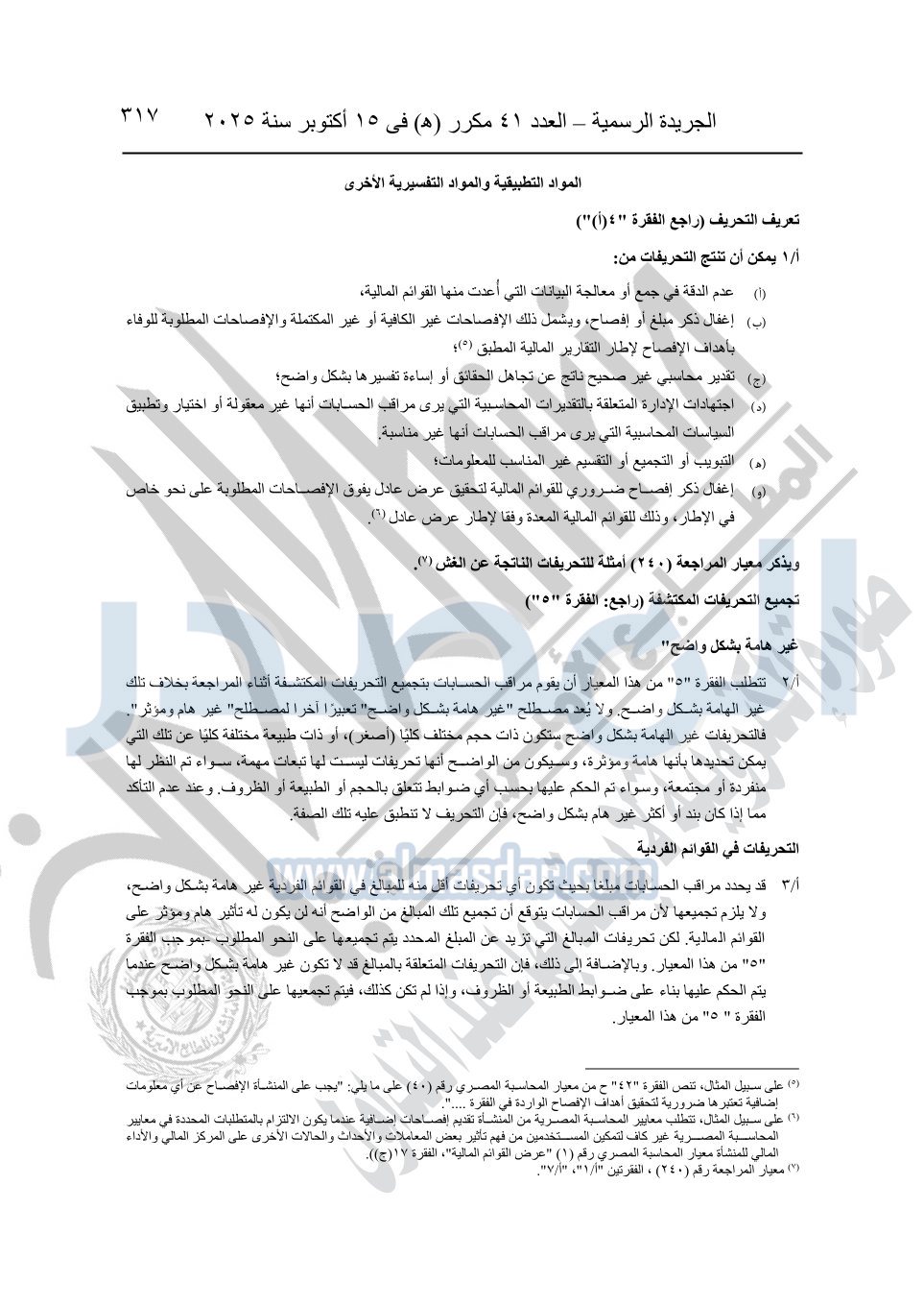 نشرت الجريدة الرسمية في العدد 41 مكرر "هـ" الصادر في 15 أكتوبر سنة 2025، قرار رئيس مجلس الوزراء رقم 3725 لسنة 2025، بشأن العمل بالمعايير المصرية للمراجعة والفحص المحدود ومهام التأكد الأخرى المرافقة لهذا القرار.