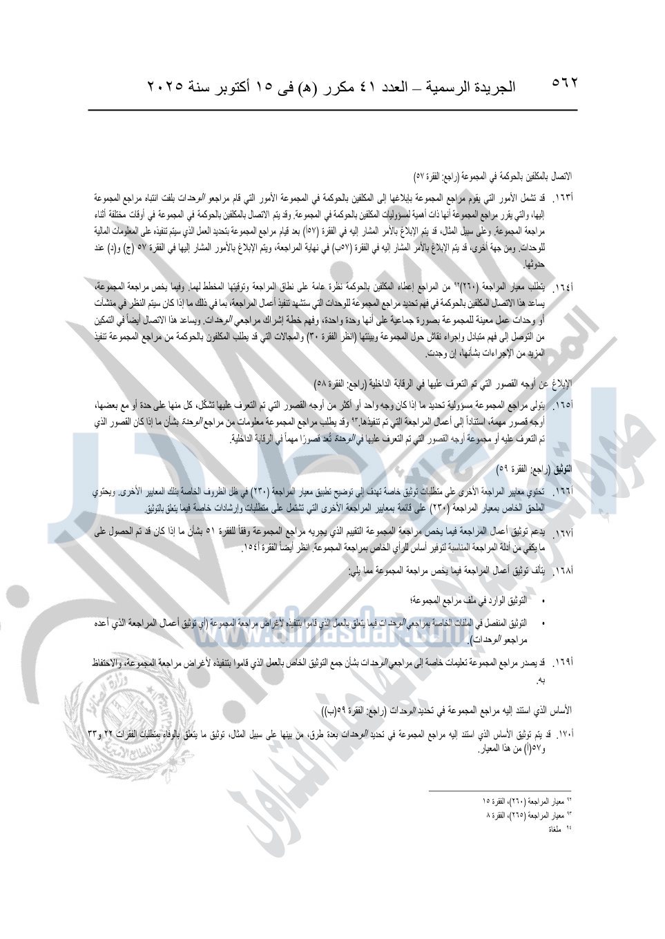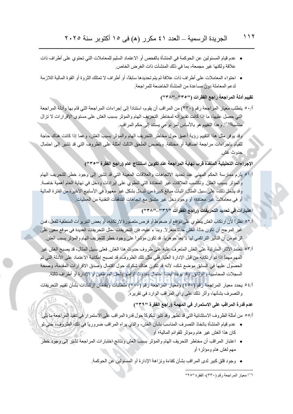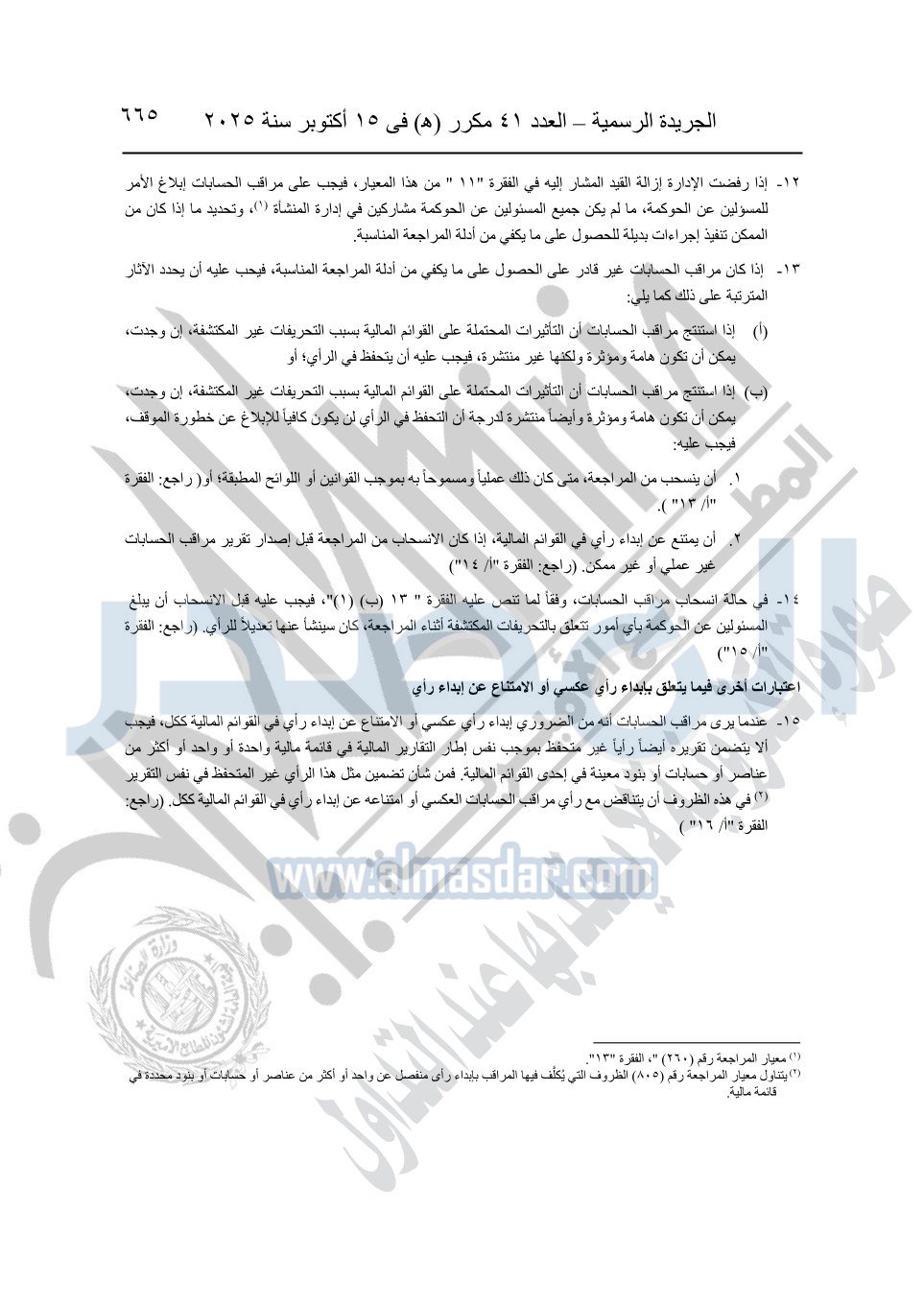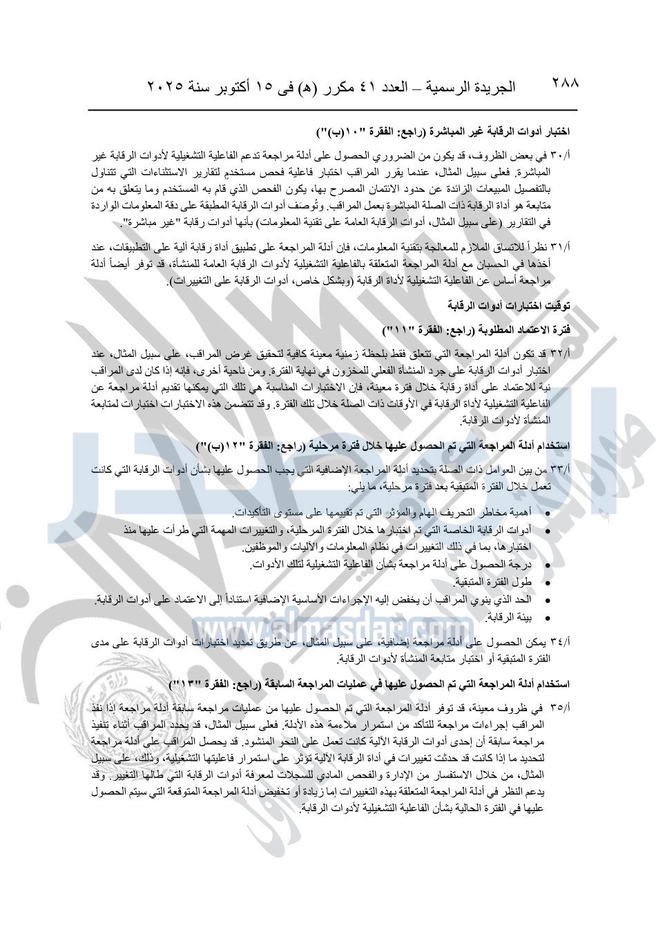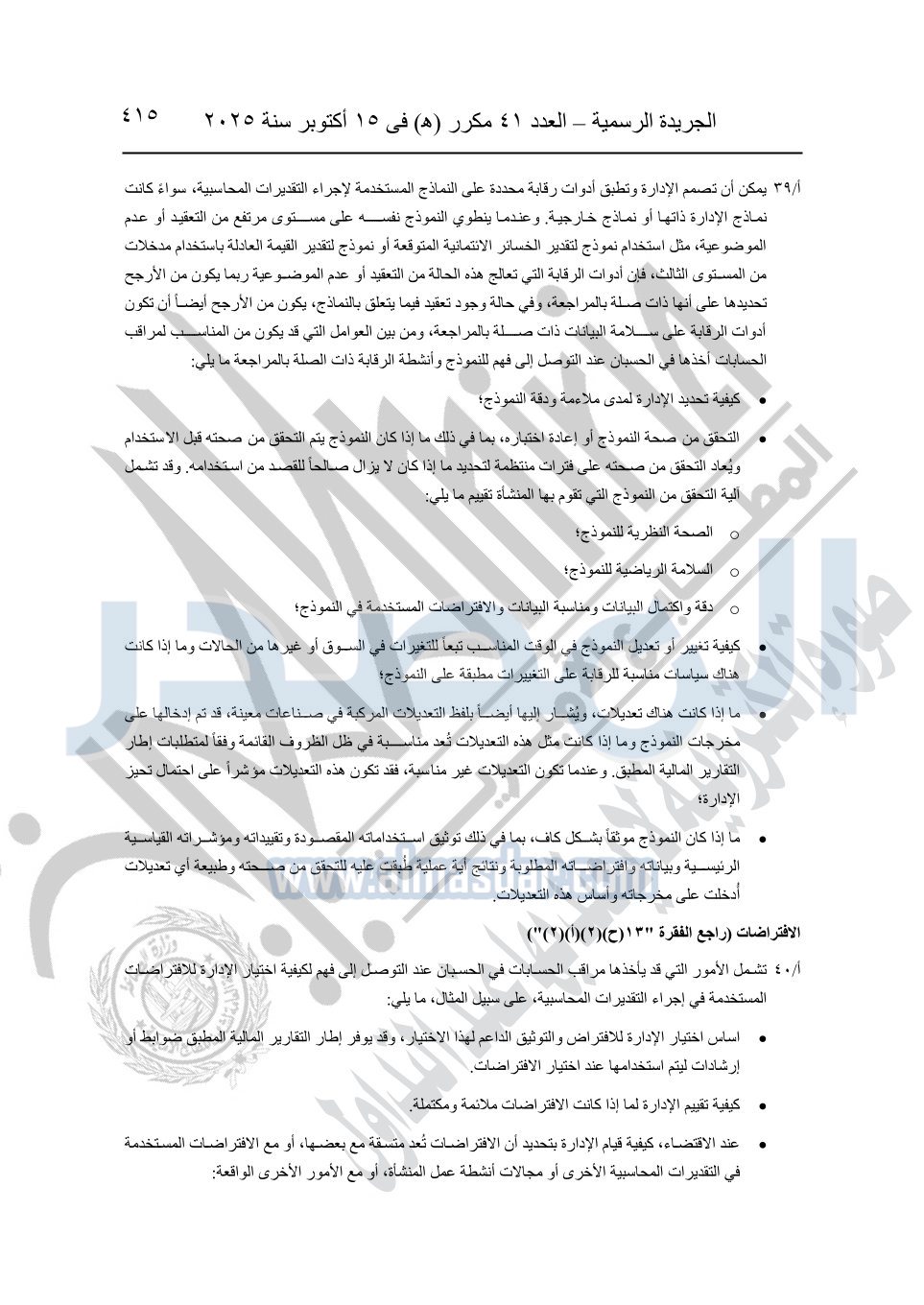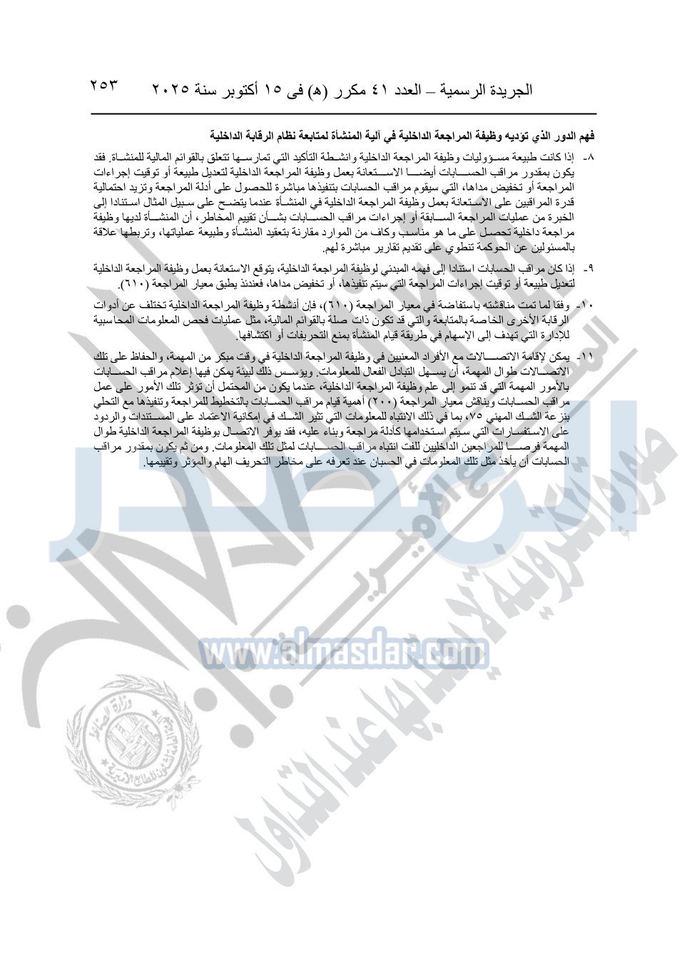 نشرت الجريدة الرسمية في العدد 41 مكرر "هـ" الصادر في 15 أكتوبر سنة 2025، قرار رئيس مجلس الوزراء رقم 3725 لسنة 2025، بشأن العمل بالمعايير المصرية للمراجعة والفحص المحدود ومهام التأكد الأخرى المرافقة لهذا القرار.
