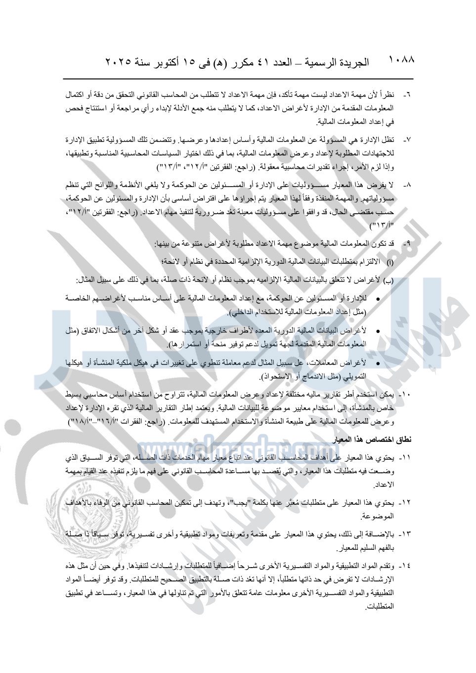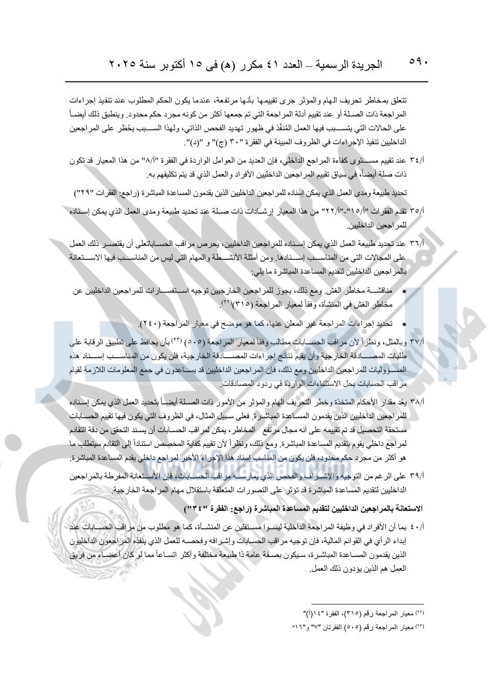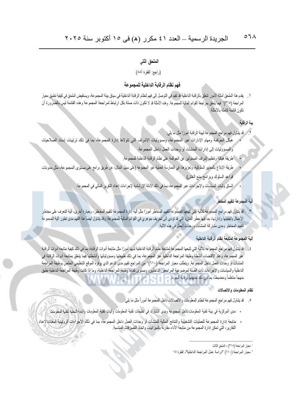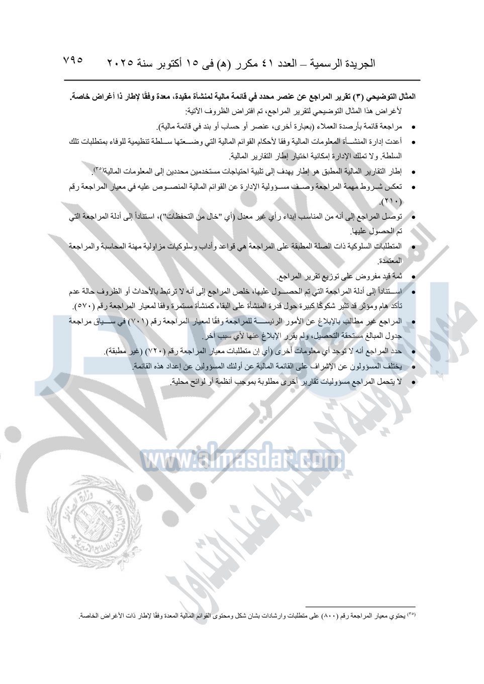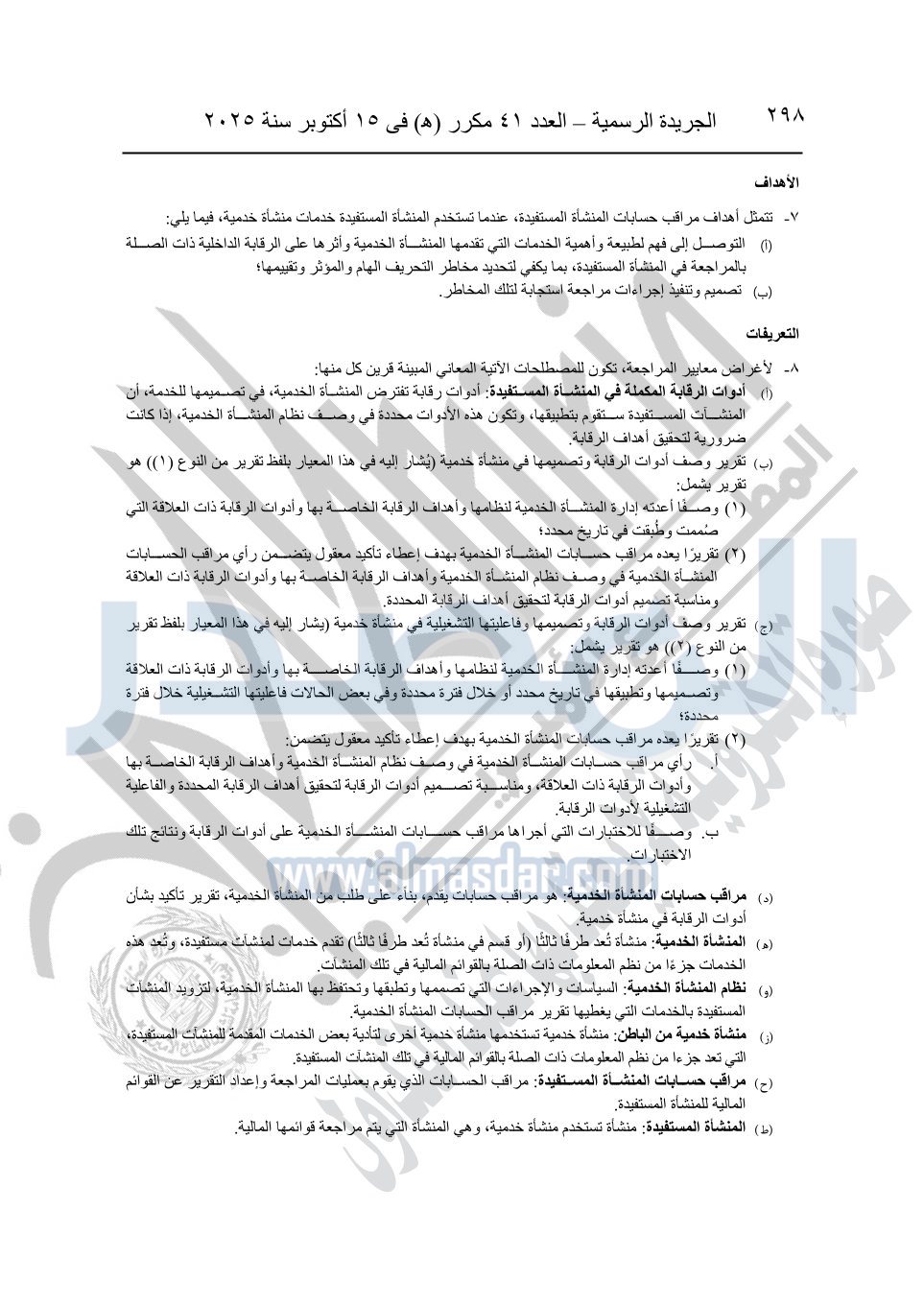 نشرت الجريدة الرسمية في العدد 41 مكرر "هـ" الصادر في 15 أكتوبر سنة 2025، قرار رئيس مجلس الوزراء رقم 3725 لسنة 2025، بشأن العمل بالمعايير المصرية للمراجعة والفحص المحدود ومهام التأكد الأخرى المرافقة لهذا القرار.