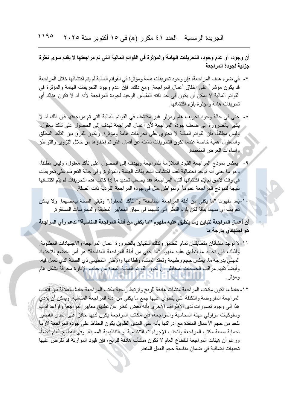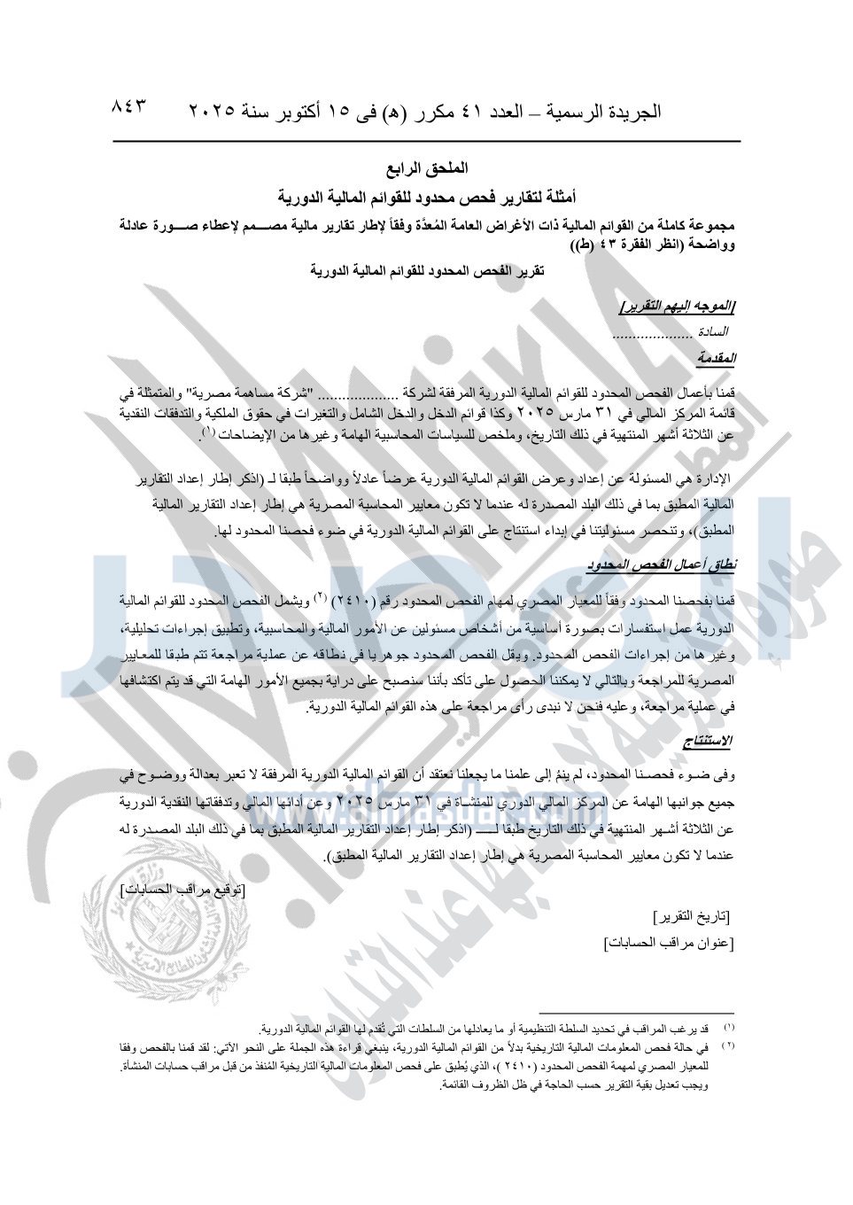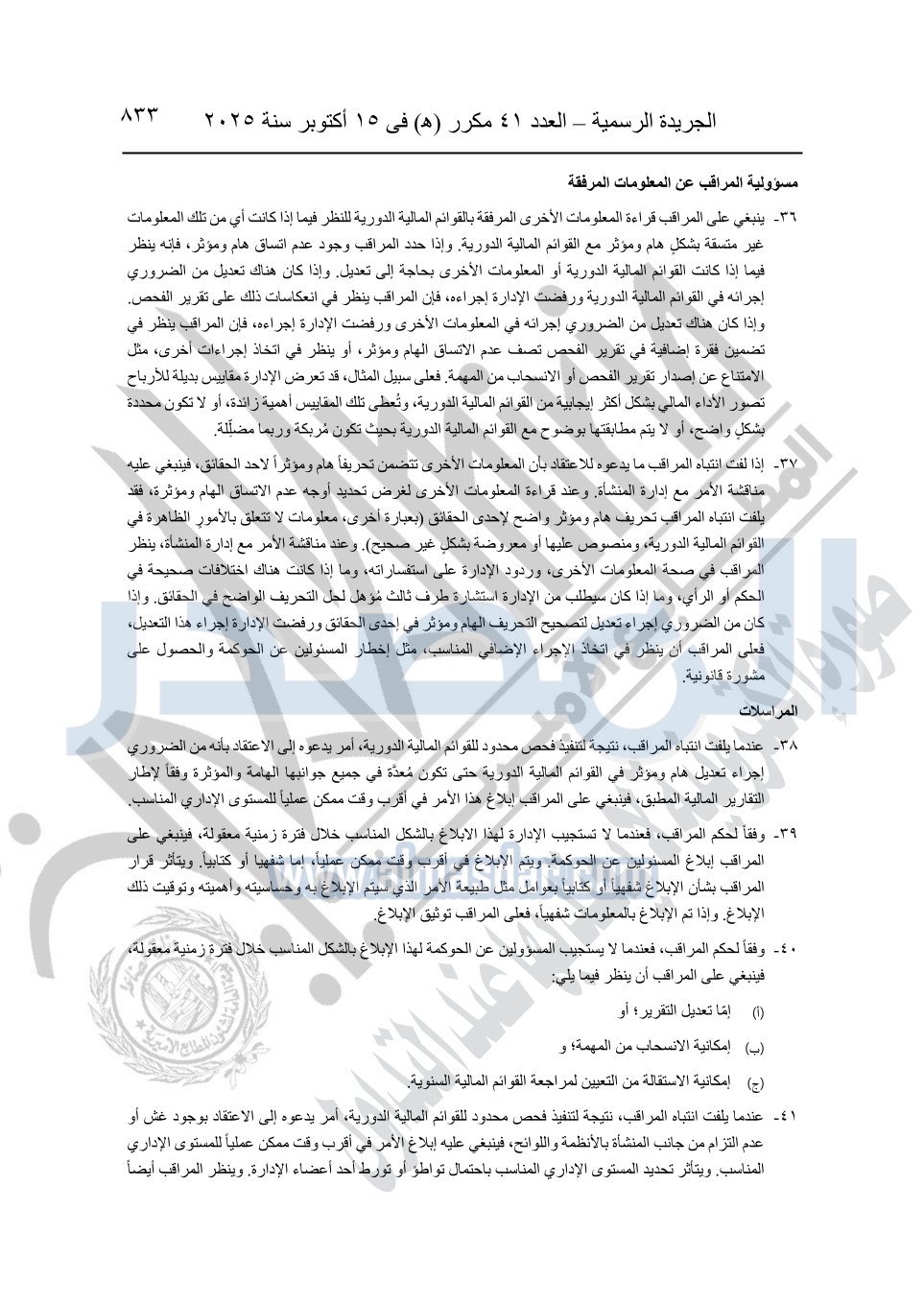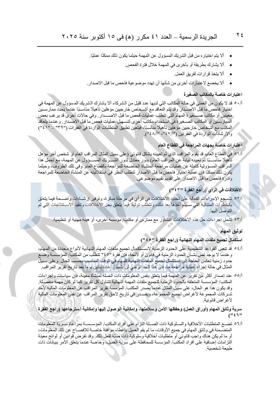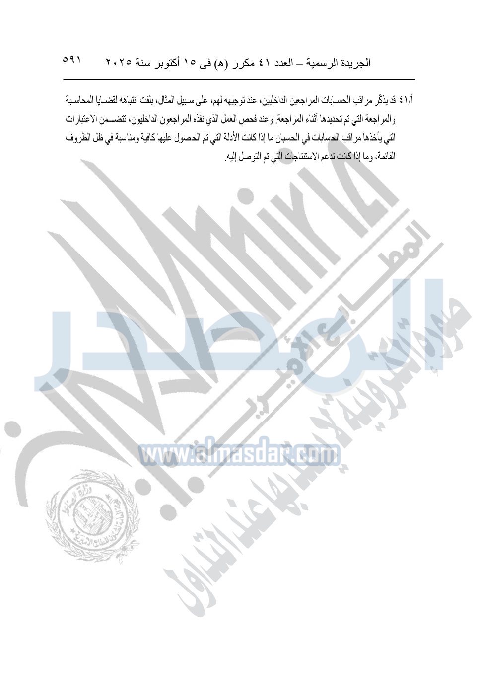 نشرت الجريدة الرسمية في العدد 41 مكرر "هـ" الصادر في 15 أكتوبر سنة 2025، قرار رئيس مجلس الوزراء رقم 3725 لسنة 2025، بشأن العمل بالمعايير المصرية للمراجعة والفحص المحدود ومهام التأكد الأخرى المرافقة لهذا القرار.