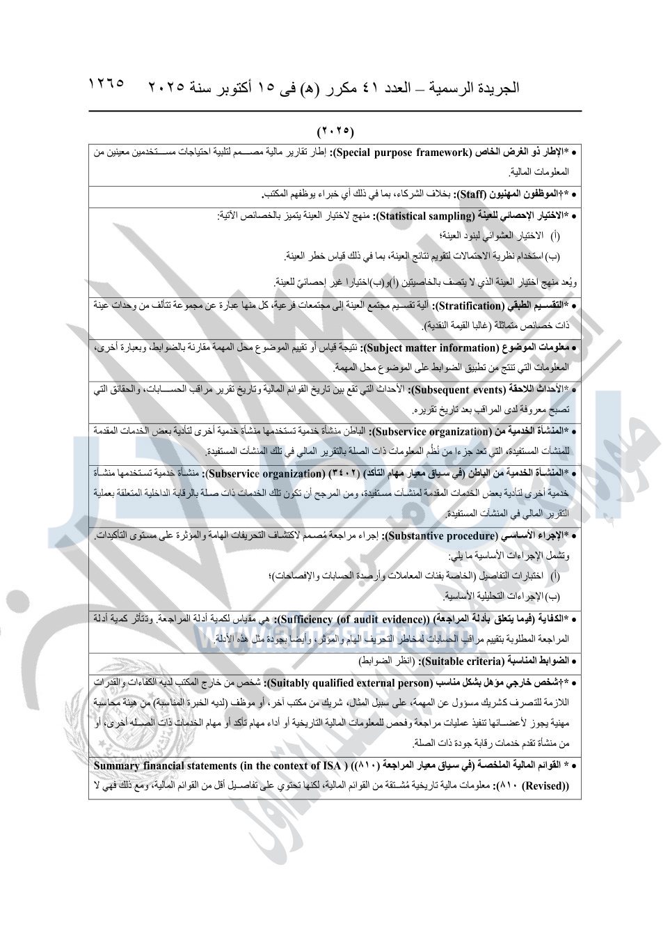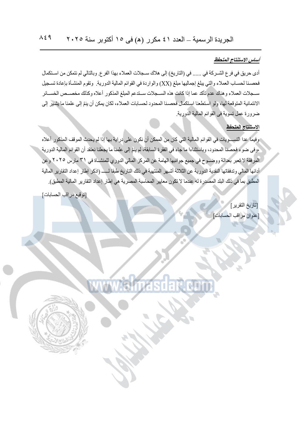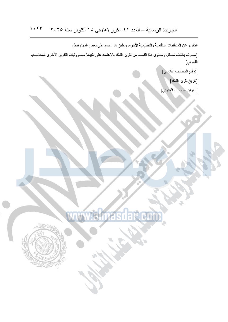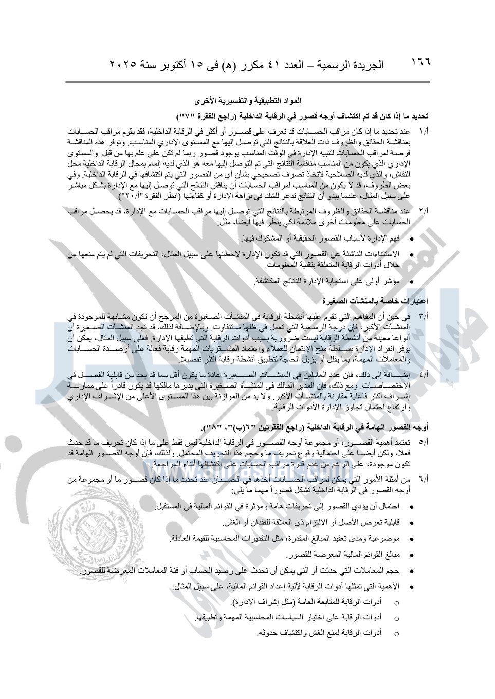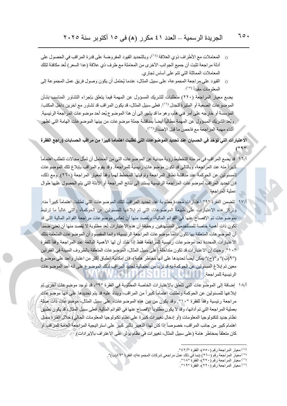 نشرت الجريدة الرسمية في العدد 41 مكرر "هـ" الصادر في 15 أكتوبر سنة 2025، قرار رئيس مجلس الوزراء رقم 3725 لسنة 2025، بشأن العمل بالمعايير المصرية للمراجعة والفحص المحدود ومهام التأكد الأخرى المرافقة لهذا القرار.