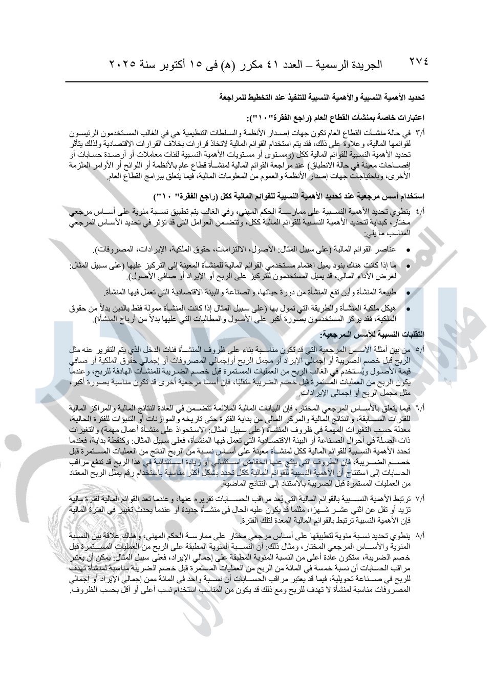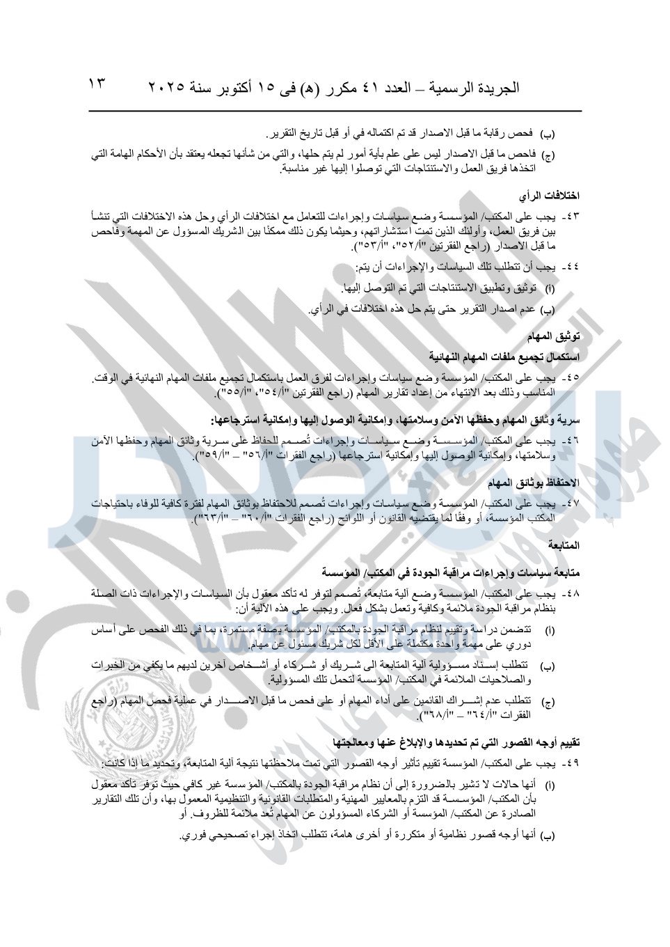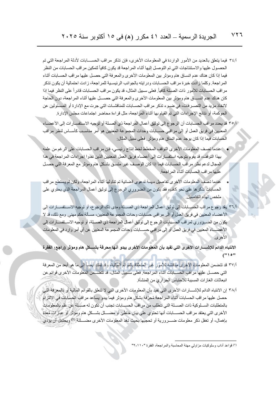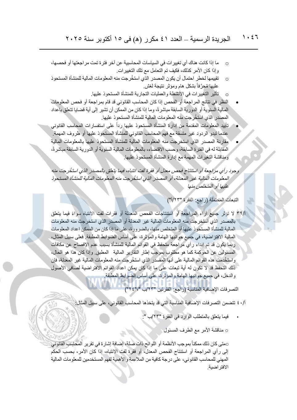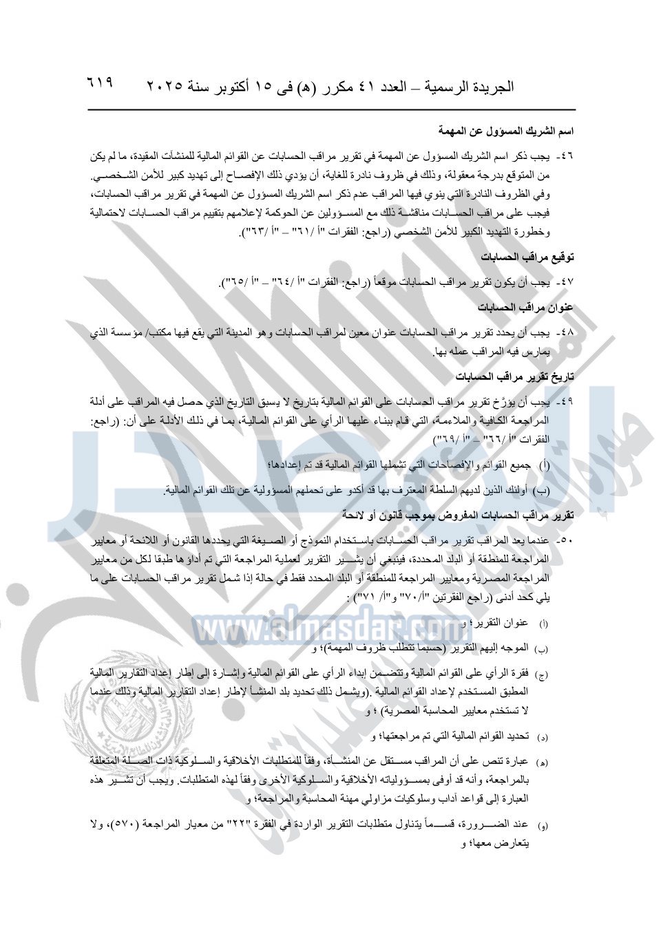 نشرت الجريدة الرسمية في العدد 41 مكرر "هـ" الصادر في 15 أكتوبر سنة 2025، قرار رئيس مجلس الوزراء رقم 3725 لسنة 2025، بشأن العمل بالمعايير المصرية للمراجعة والفحص المحدود ومهام التأكد الأخرى المرافقة لهذا القرار.