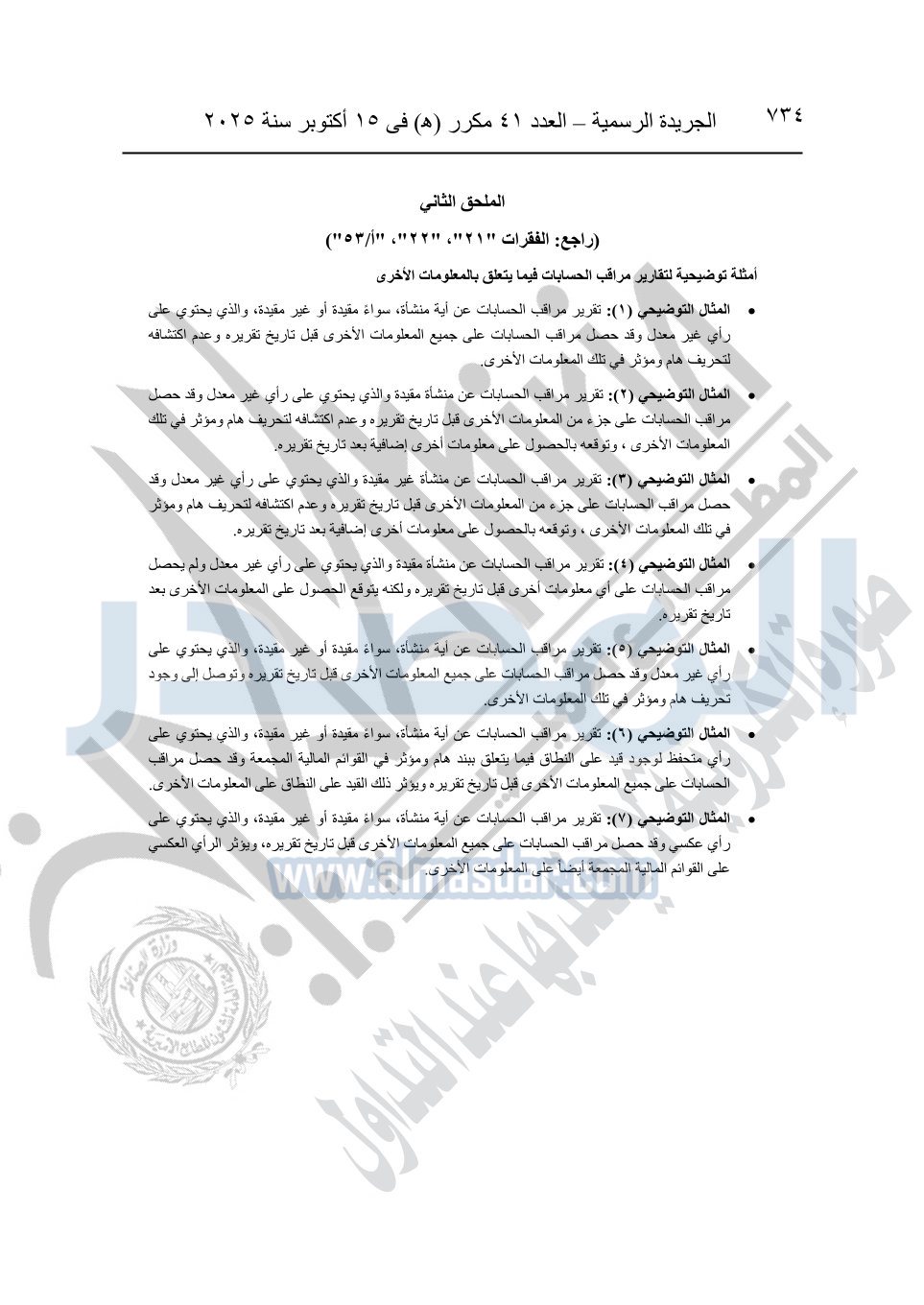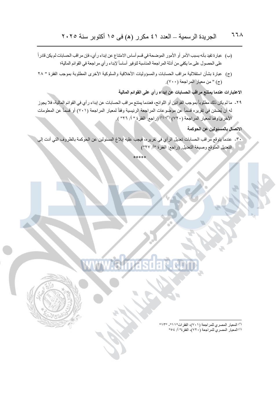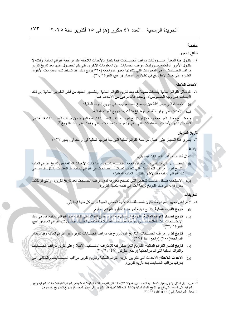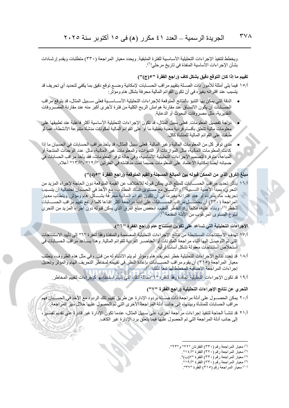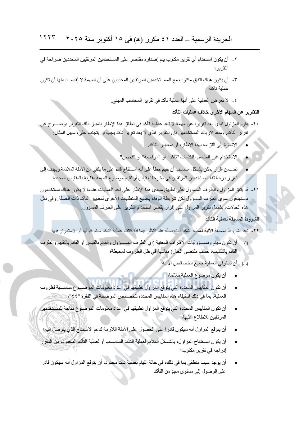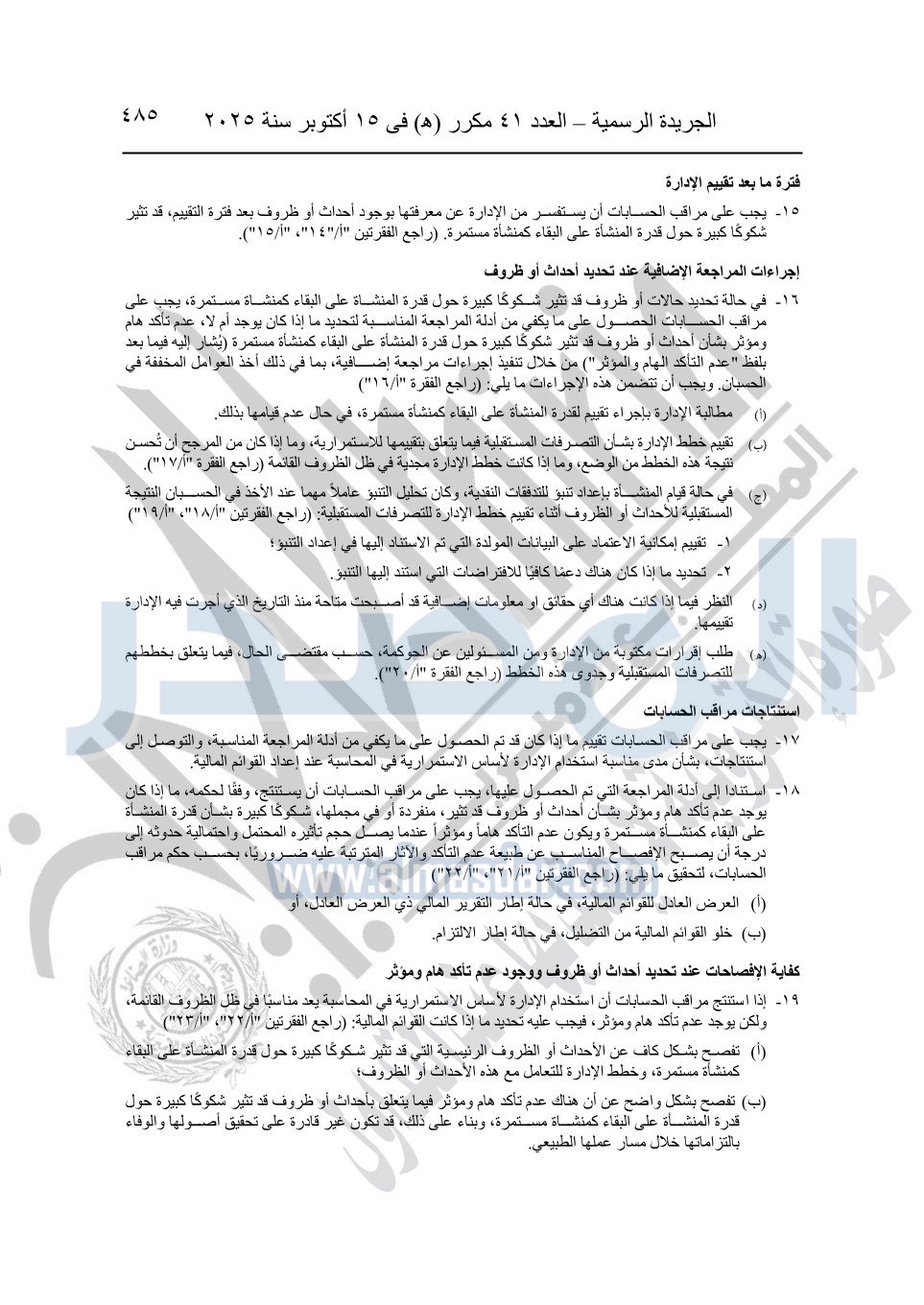 نشرت الجريدة الرسمية في العدد 41 مكرر "هـ" الصادر في 15 أكتوبر سنة 2025، قرار رئيس مجلس الوزراء رقم 3725 لسنة 2025، بشأن العمل بالمعايير المصرية للمراجعة والفحص المحدود ومهام التأكد الأخرى المرافقة لهذا القرار.