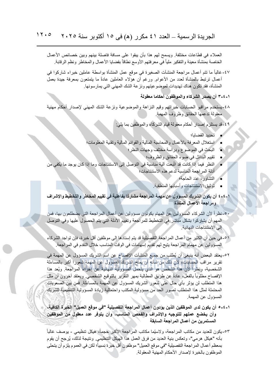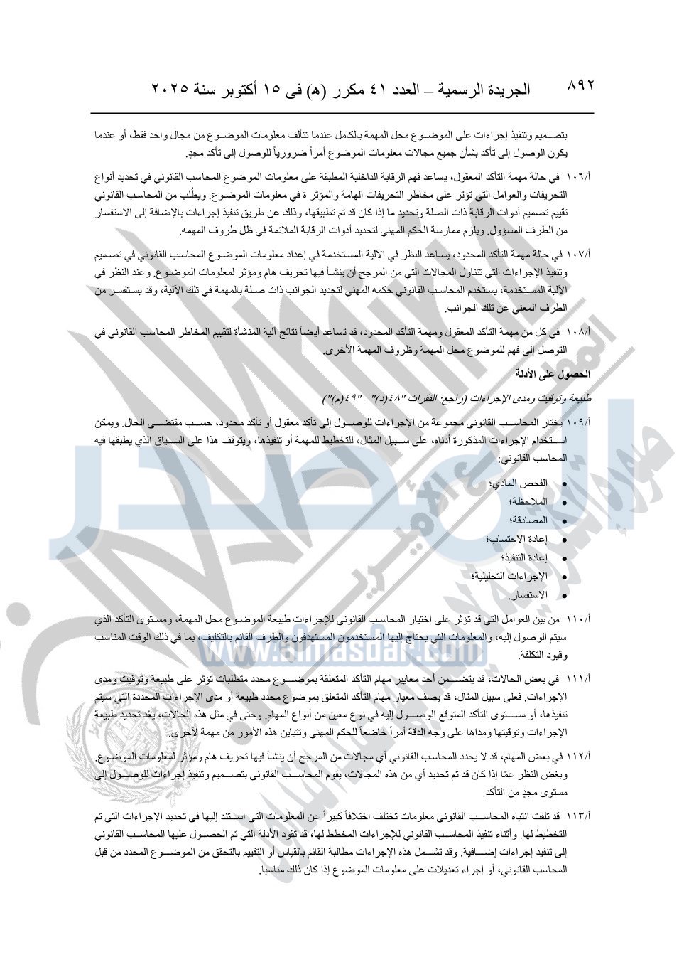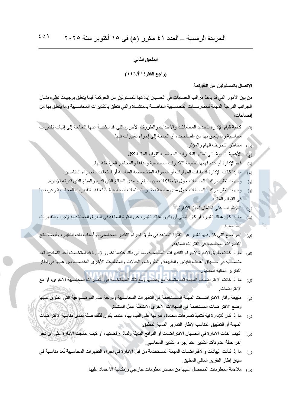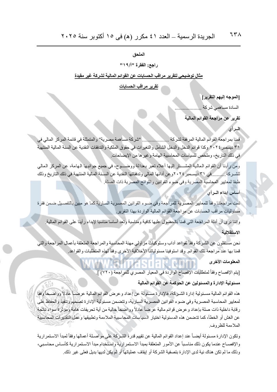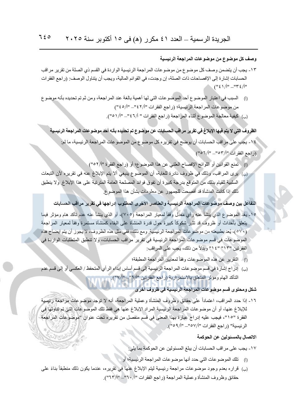 نشرت الجريدة الرسمية في العدد 41 مكرر "هـ" الصادر في 15 أكتوبر سنة 2025، قرار رئيس مجلس الوزراء رقم 3725 لسنة 2025، بشأن العمل بالمعايير المصرية للمراجعة والفحص المحدود ومهام التأكد الأخرى المرافقة لهذا القرار.
