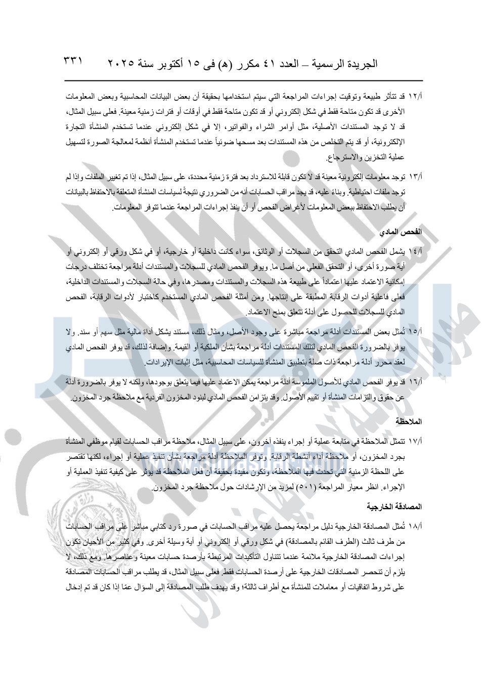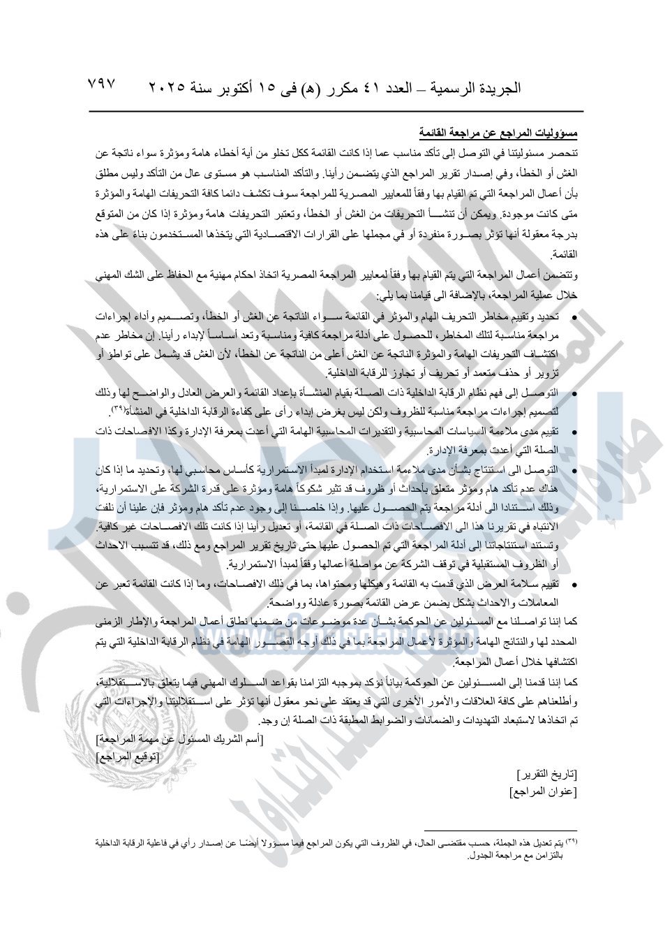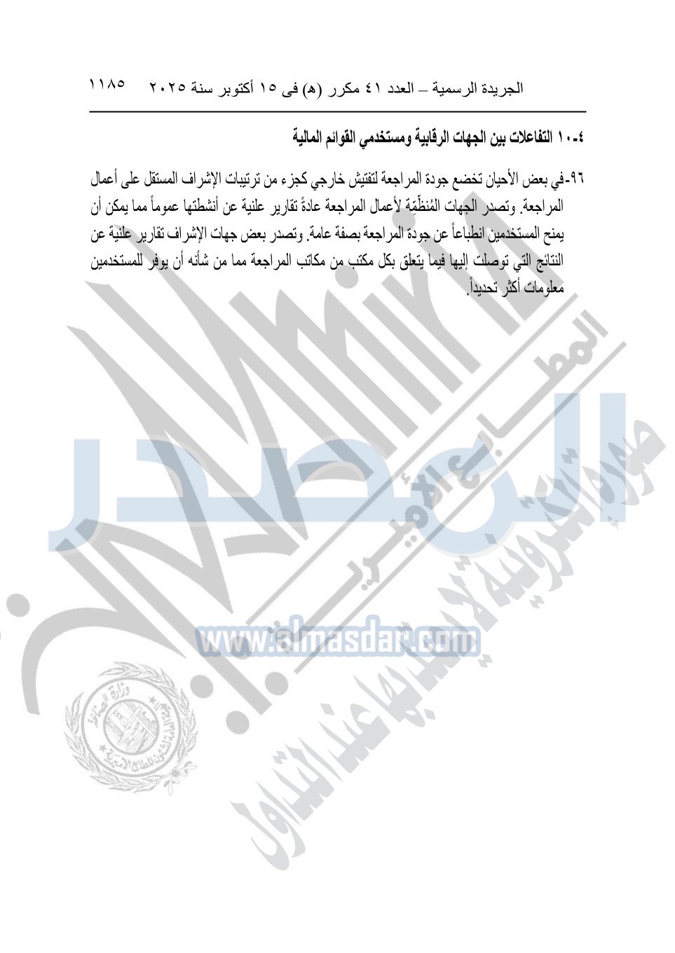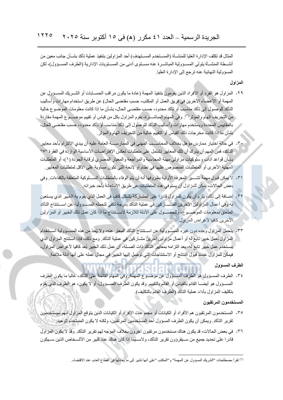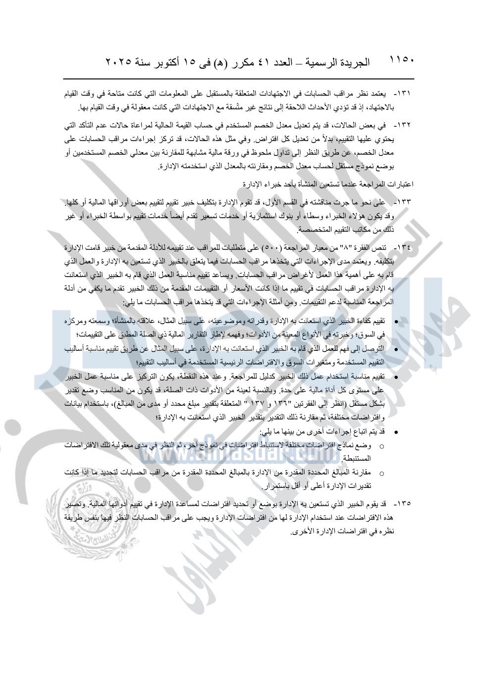 نشرت الجريدة الرسمية في العدد 41 مكرر "هـ" الصادر في 15 أكتوبر سنة 2025، قرار رئيس مجلس الوزراء رقم 3725 لسنة 2025، بشأن العمل بالمعايير المصرية للمراجعة والفحص المحدود ومهام التأكد الأخرى المرافقة لهذا القرار.