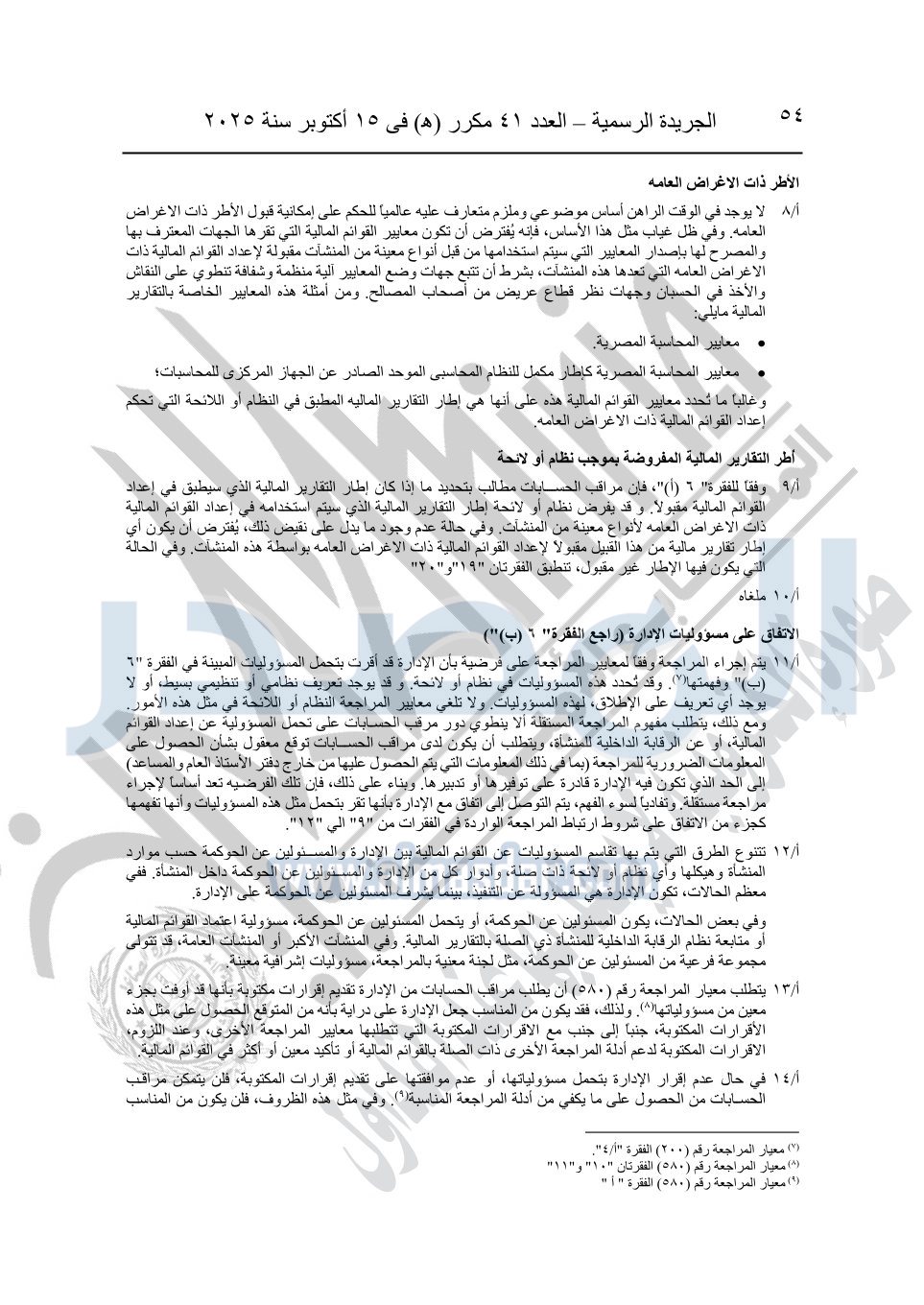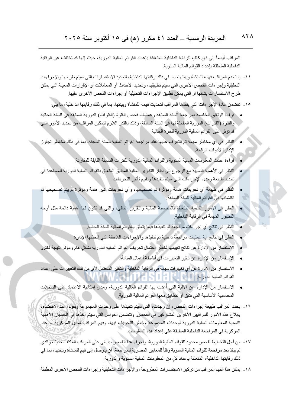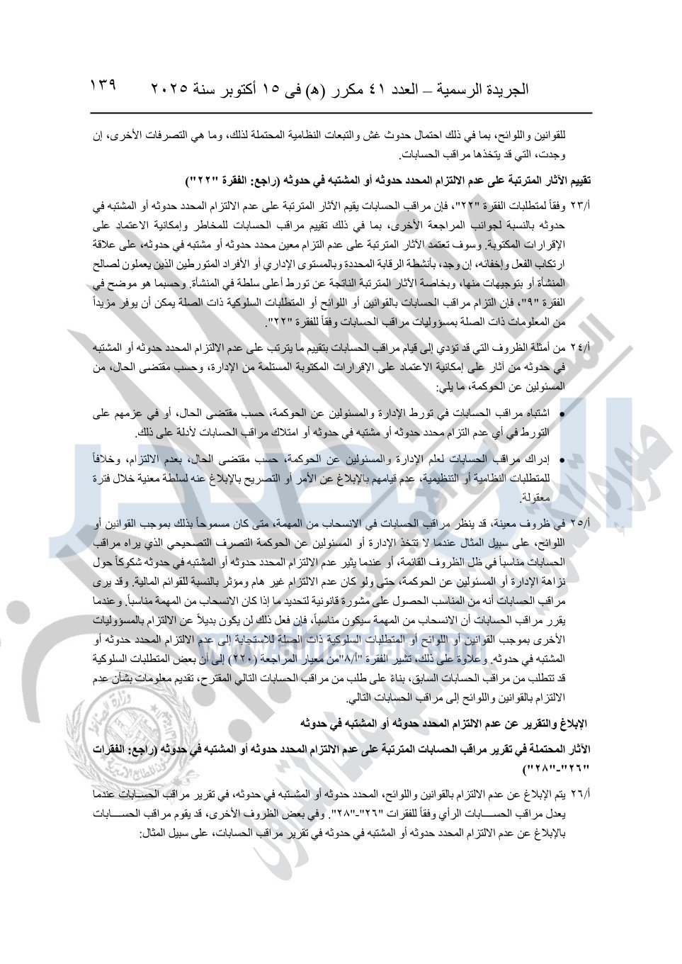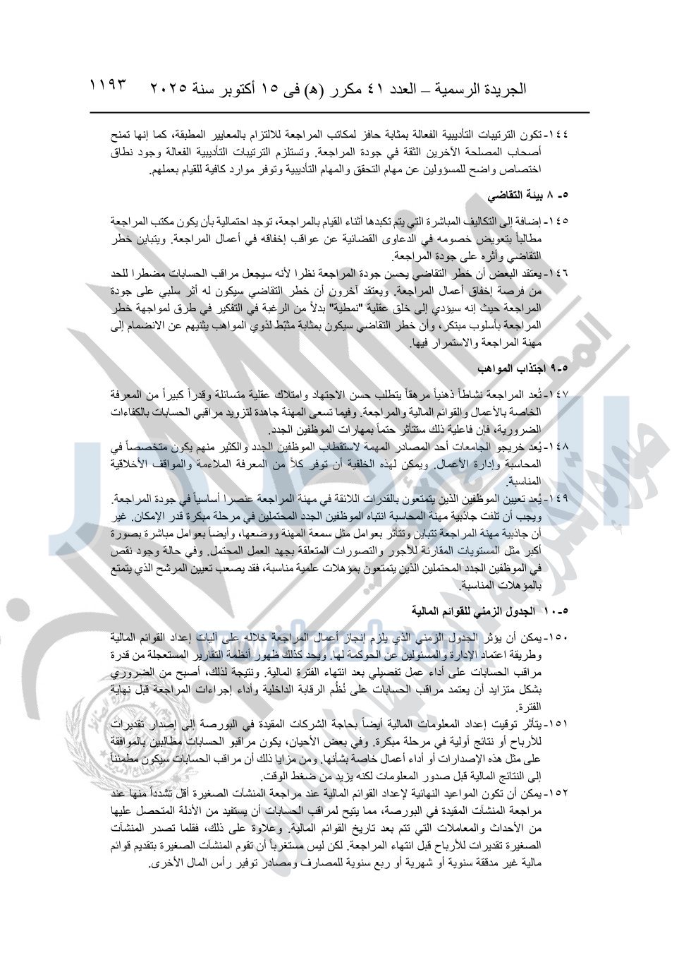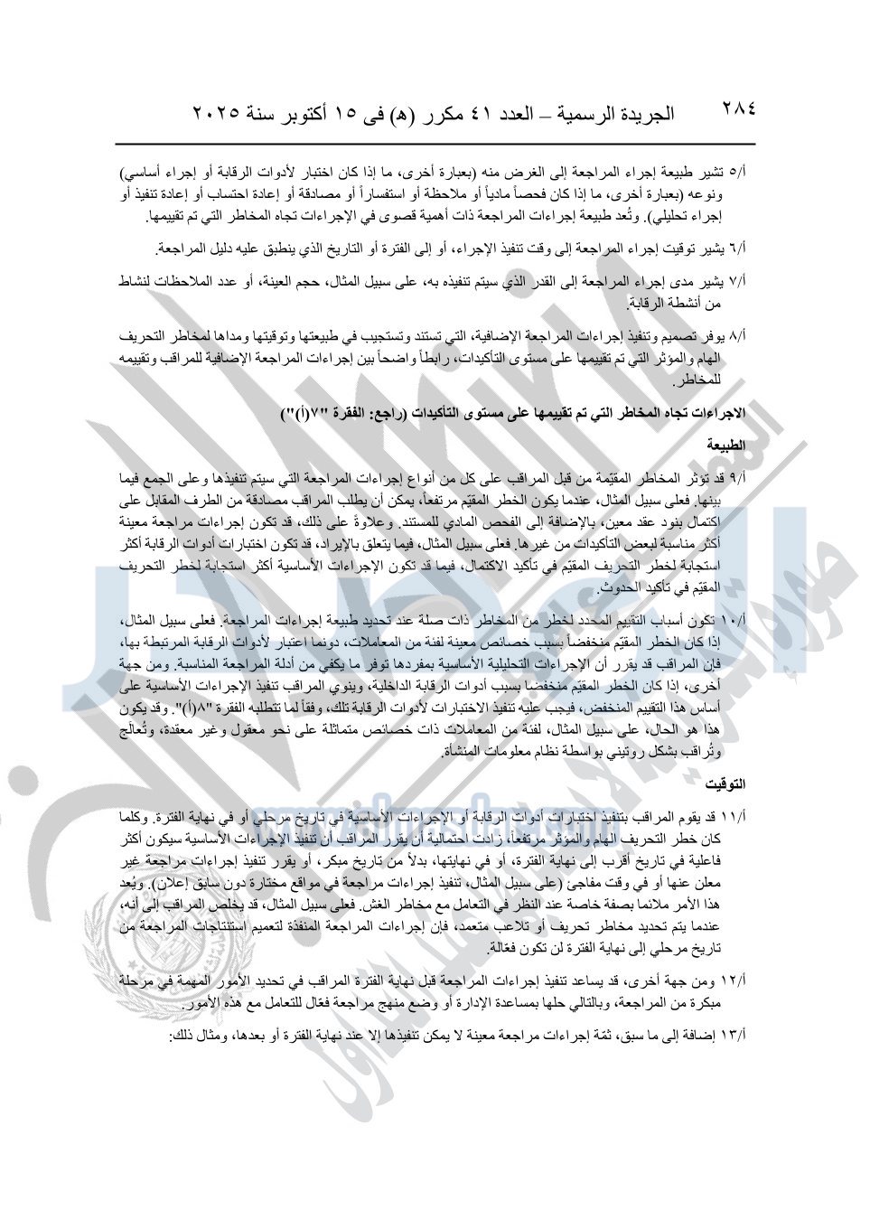 نشرت الجريدة الرسمية في العدد 41 مكرر "هـ" الصادر في 15 أكتوبر سنة 2025، قرار رئيس مجلس الوزراء رقم 3725 لسنة 2025، بشأن العمل بالمعايير المصرية للمراجعة والفحص المحدود ومهام التأكد الأخرى المرافقة لهذا القرار.