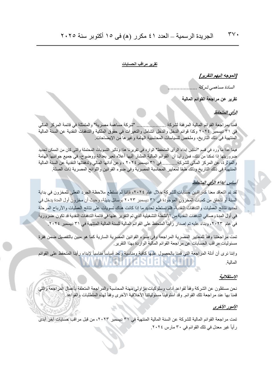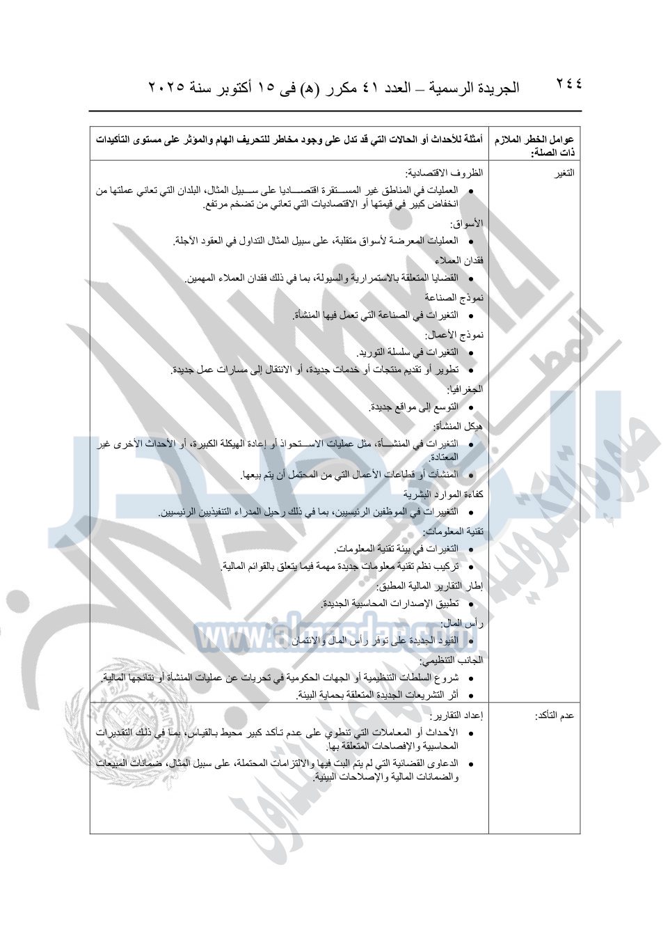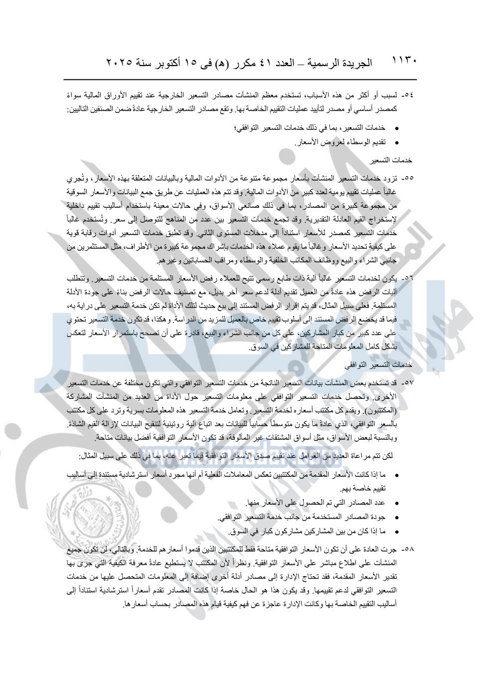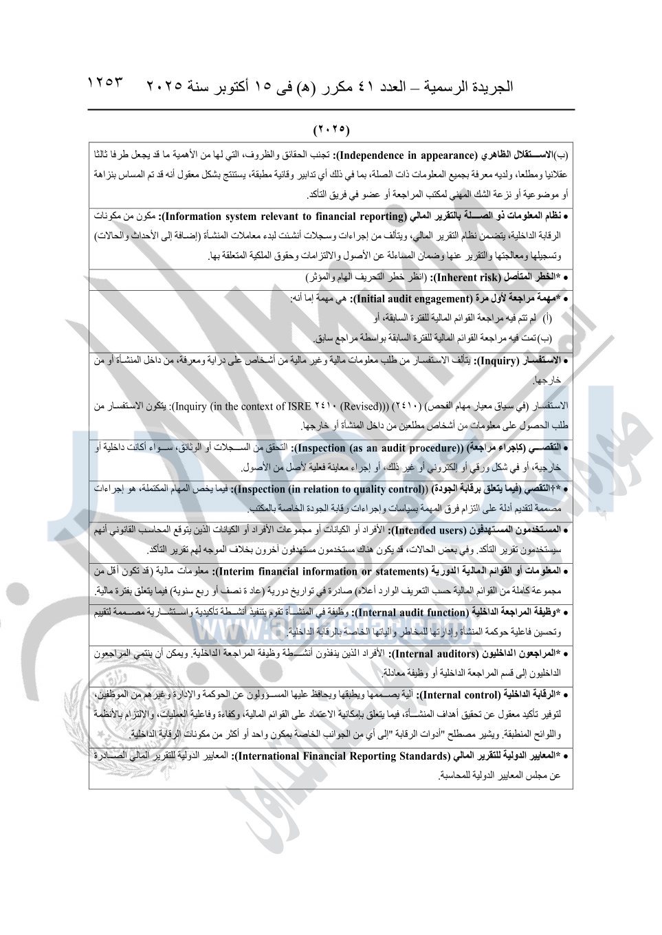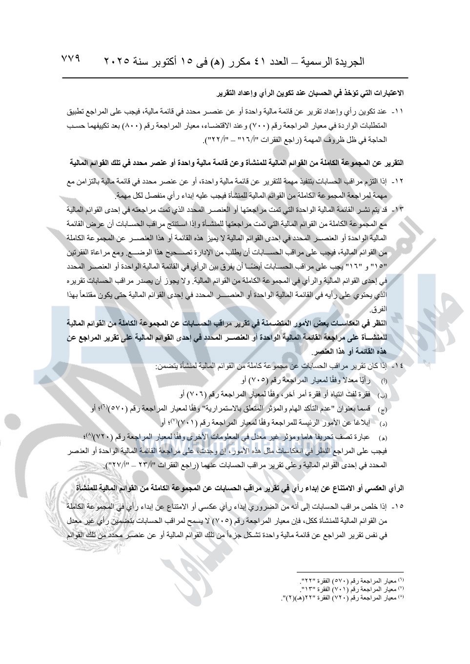 نشرت الجريدة الرسمية في العدد 41 مكرر "هـ" الصادر في 15 أكتوبر سنة 2025، قرار رئيس مجلس الوزراء رقم 3725 لسنة 2025، بشأن العمل بالمعايير المصرية للمراجعة والفحص المحدود ومهام التأكد الأخرى المرافقة لهذا القرار.