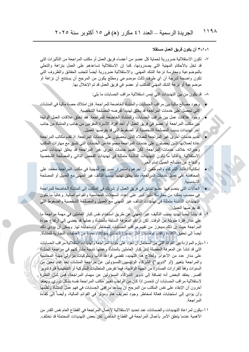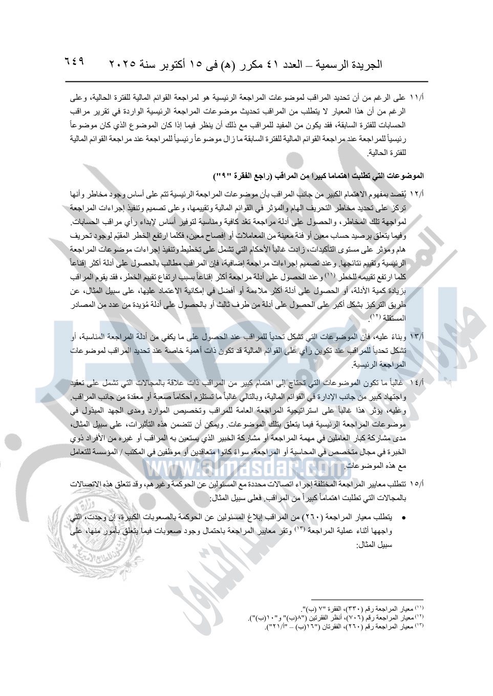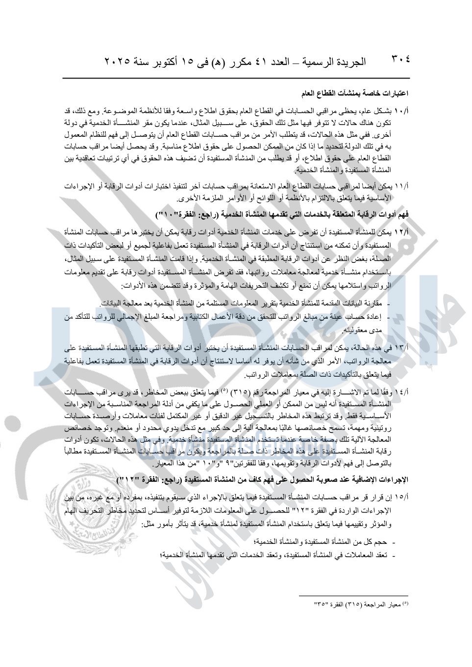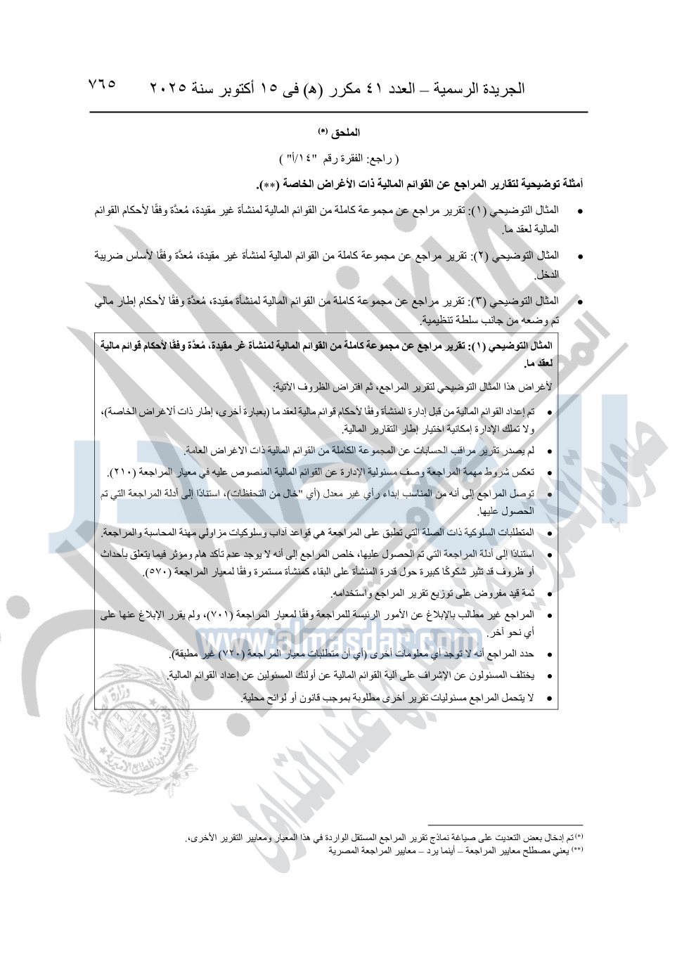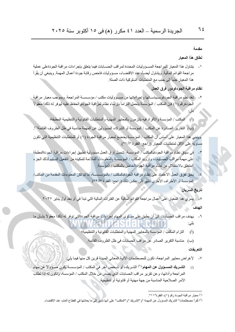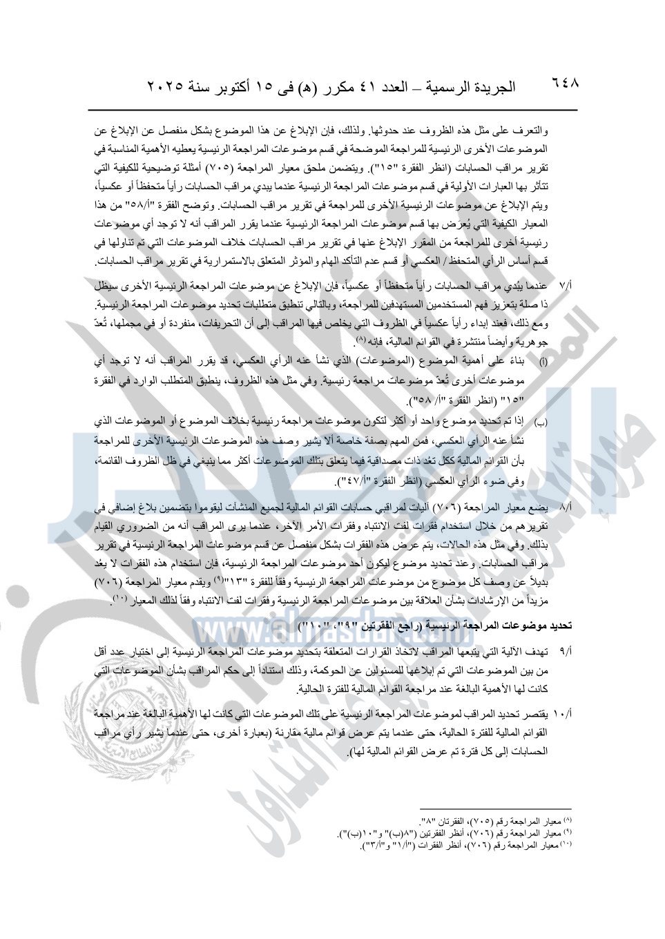 نشرت الجريدة الرسمية في العدد 41 مكرر "هـ" الصادر في 15 أكتوبر سنة 2025، قرار رئيس مجلس الوزراء رقم 3725 لسنة 2025، بشأن العمل بالمعايير المصرية للمراجعة والفحص المحدود ومهام التأكد الأخرى المرافقة لهذا القرار.