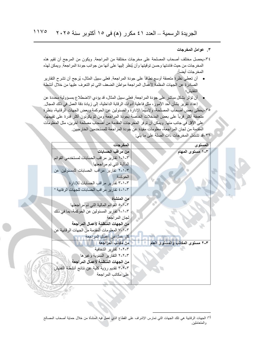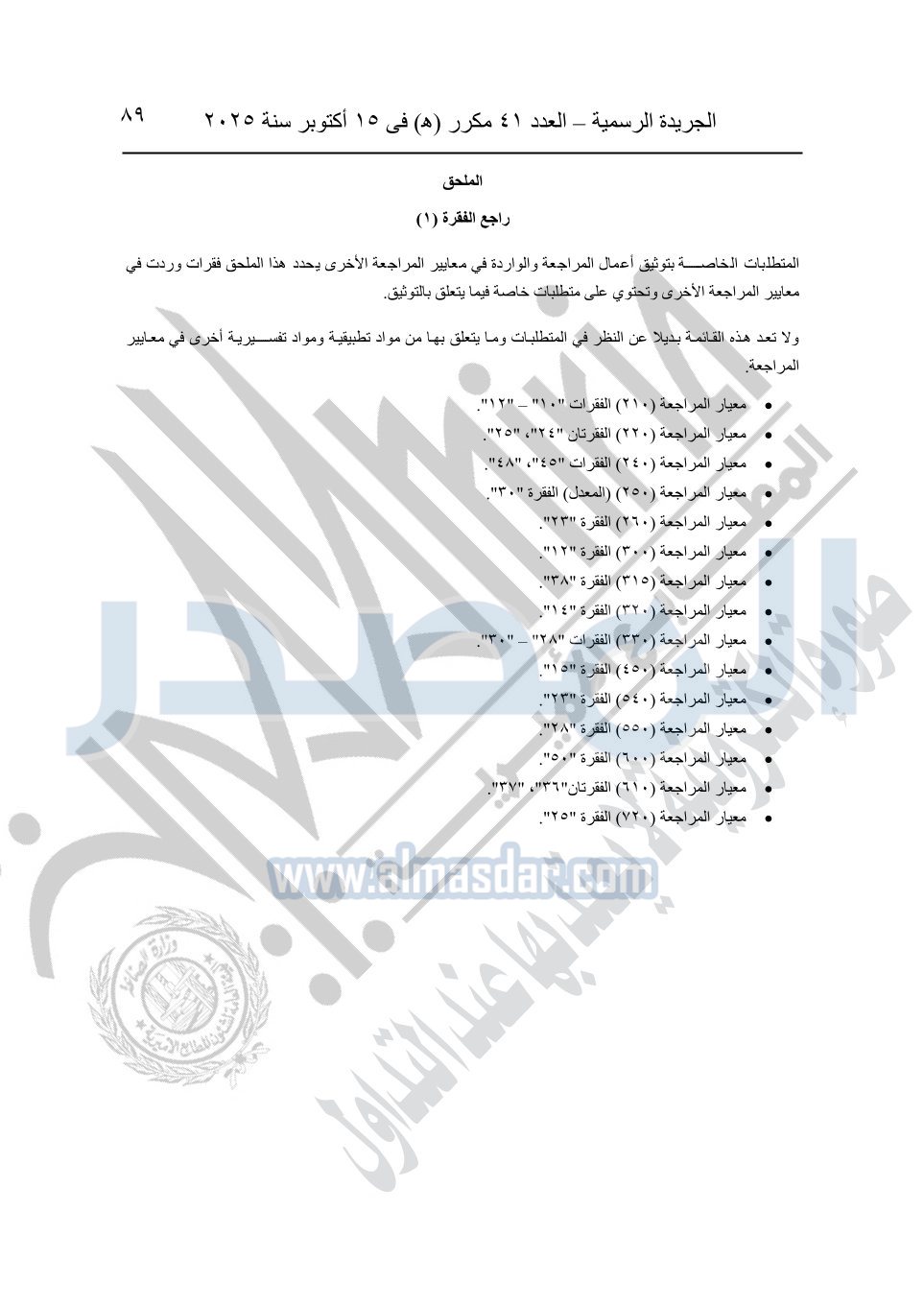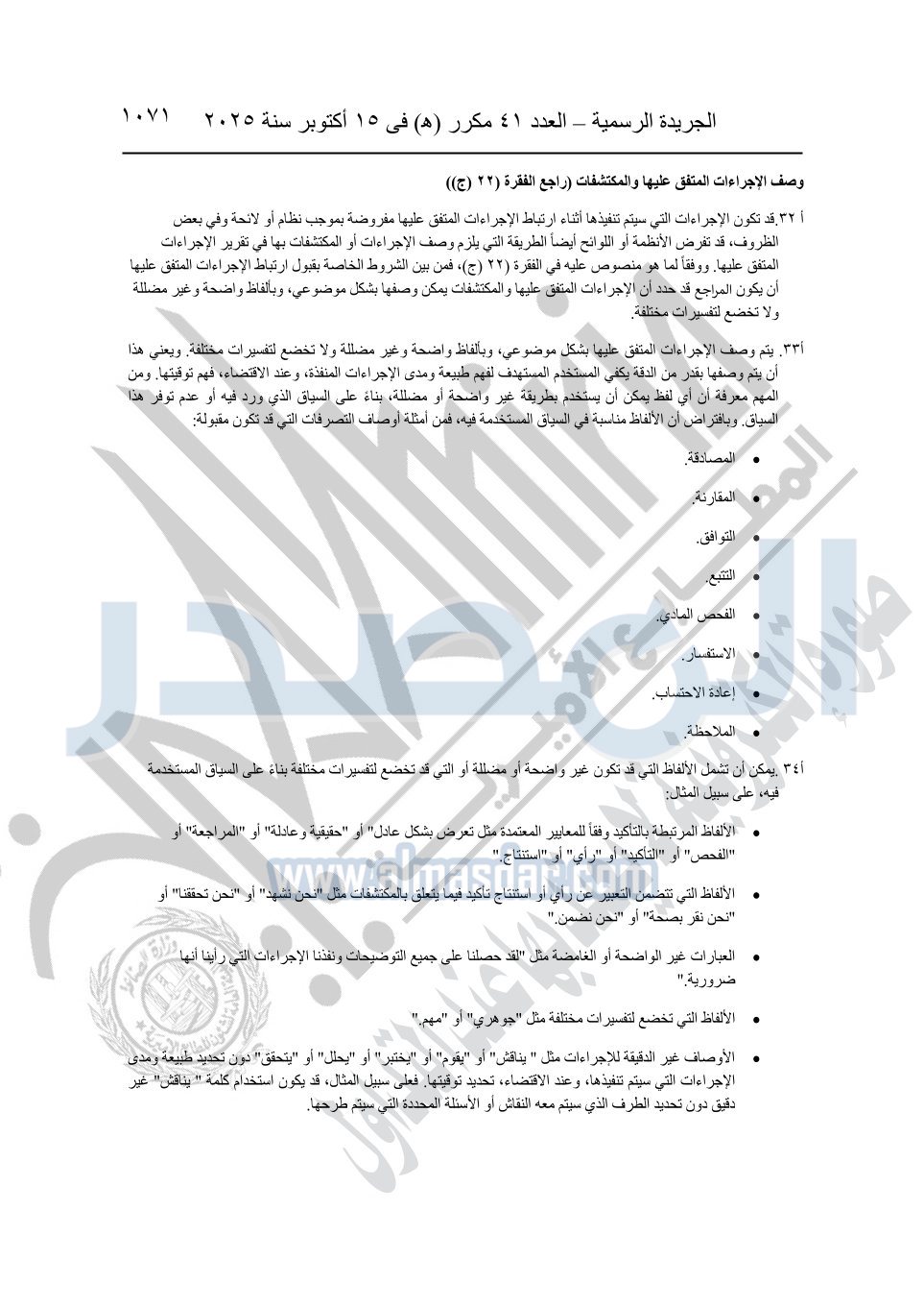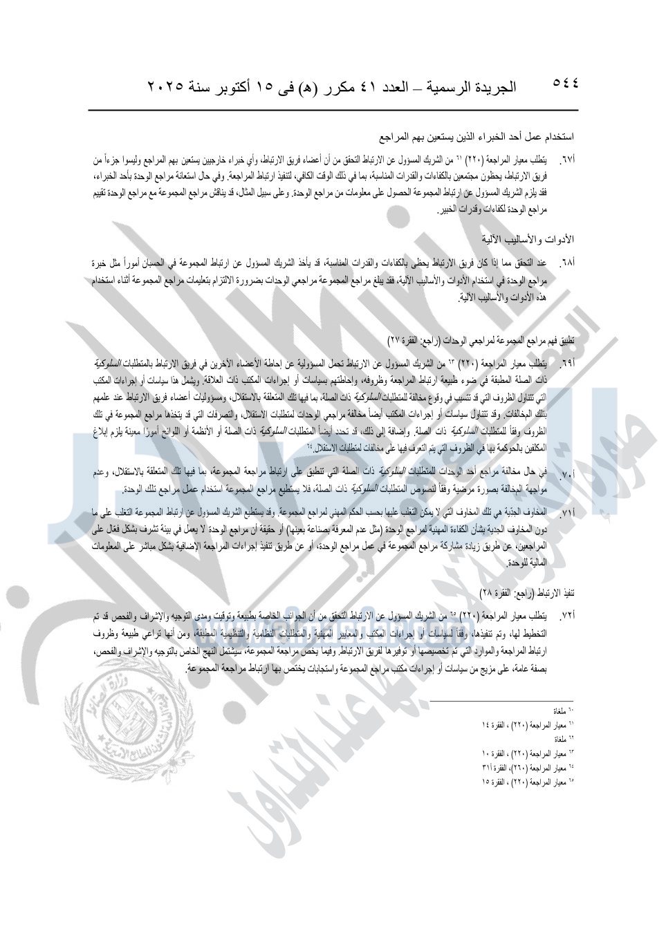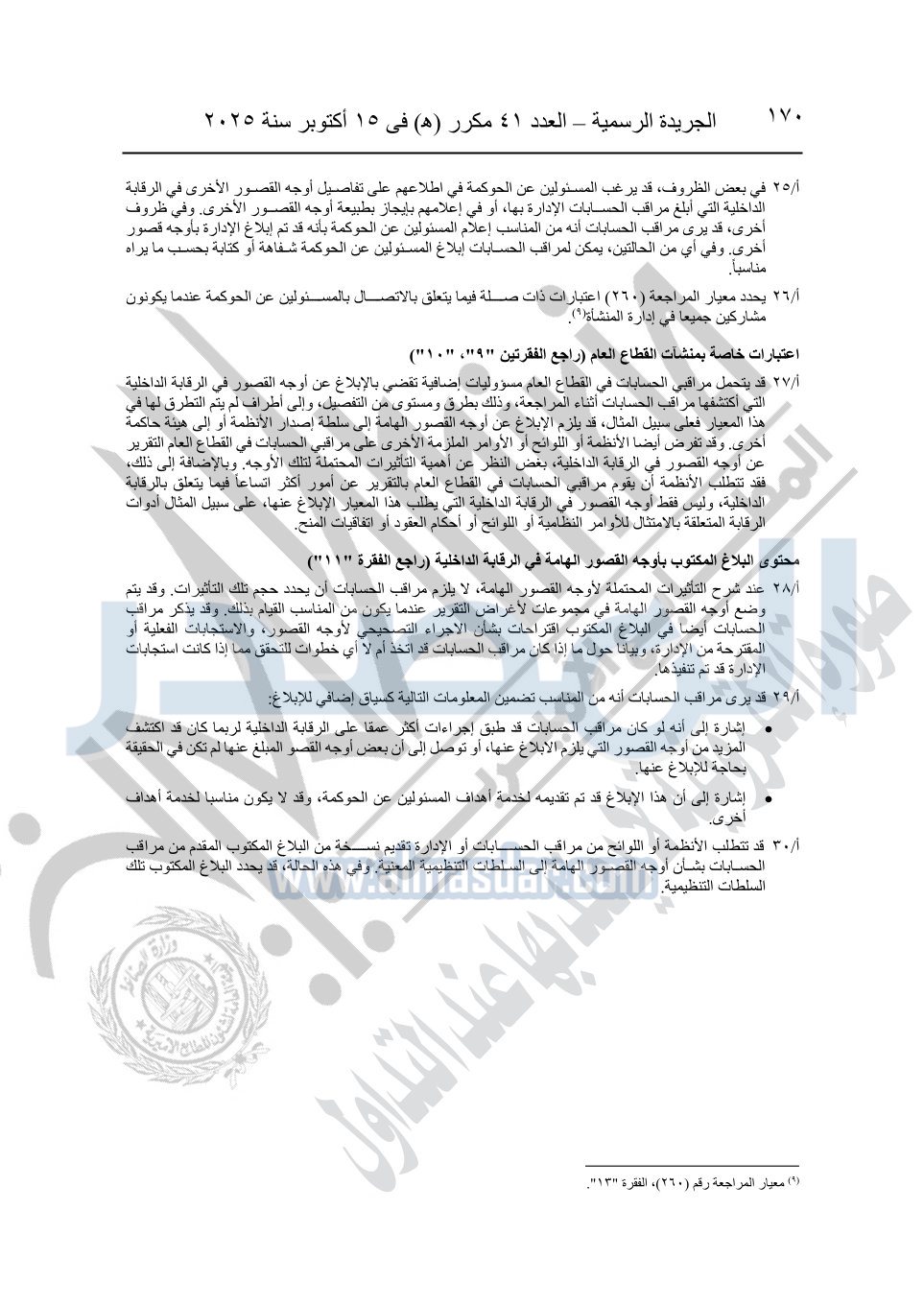 نشرت الجريدة الرسمية في العدد 41 مكرر "هـ" الصادر في 15 أكتوبر سنة 2025، قرار رئيس مجلس الوزراء رقم 3725 لسنة 2025، بشأن العمل بالمعايير المصرية للمراجعة والفحص المحدود ومهام التأكد الأخرى المرافقة لهذا القرار.
