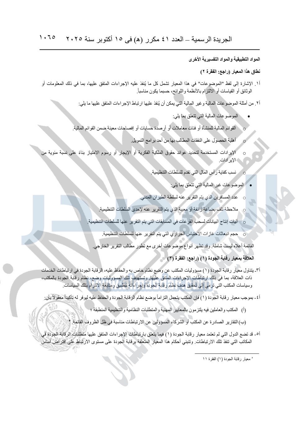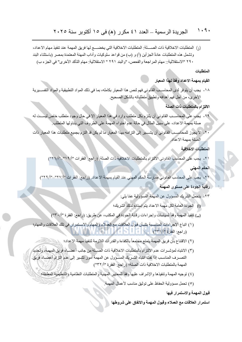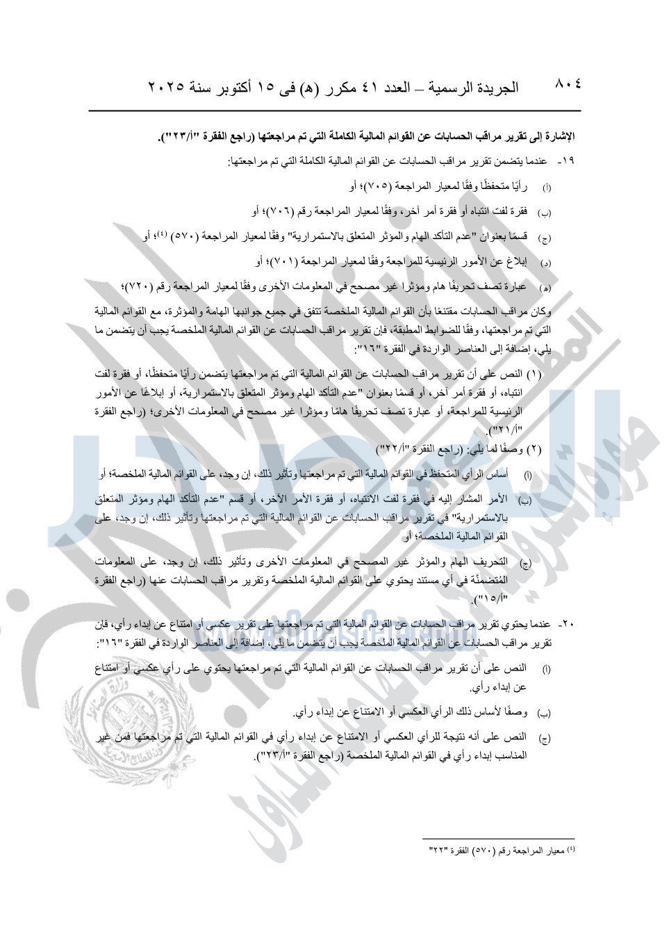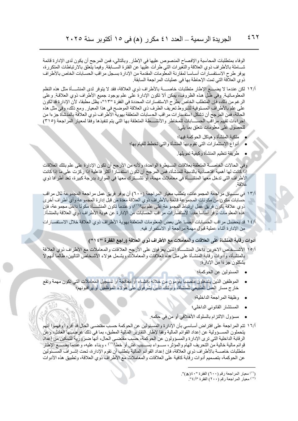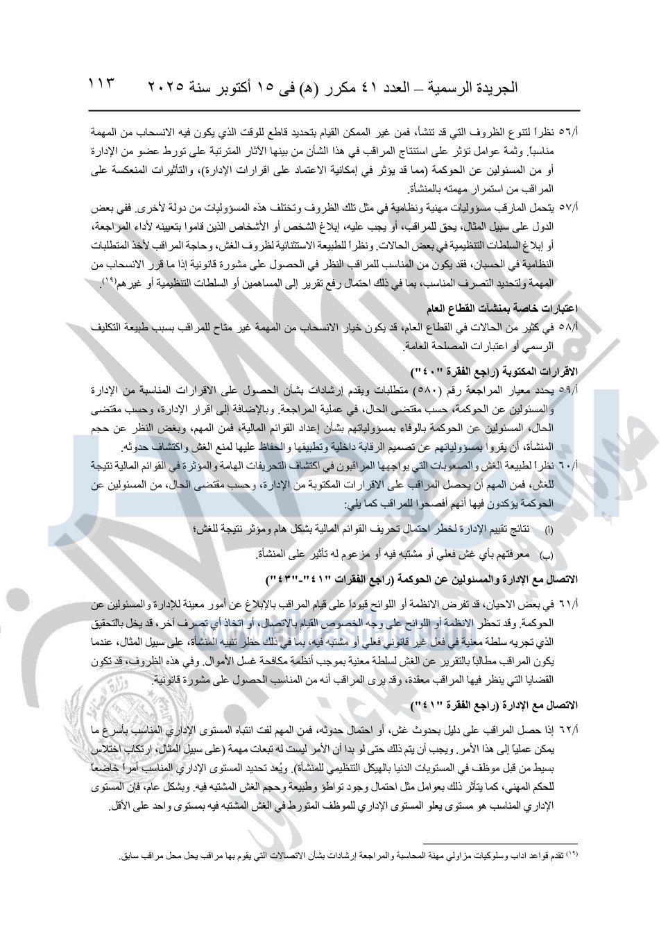 نشرت الجريدة الرسمية في العدد 41 مكرر "هـ" الصادر في 15 أكتوبر سنة 2025، قرار رئيس مجلس الوزراء رقم 3725 لسنة 2025، بشأن العمل بالمعايير المصرية للمراجعة والفحص المحدود ومهام التأكد الأخرى المرافقة لهذا القرار.