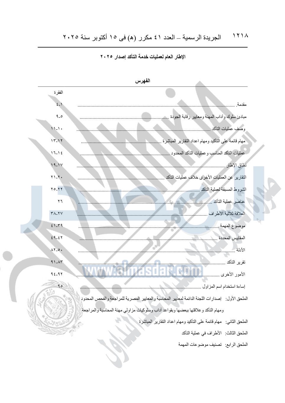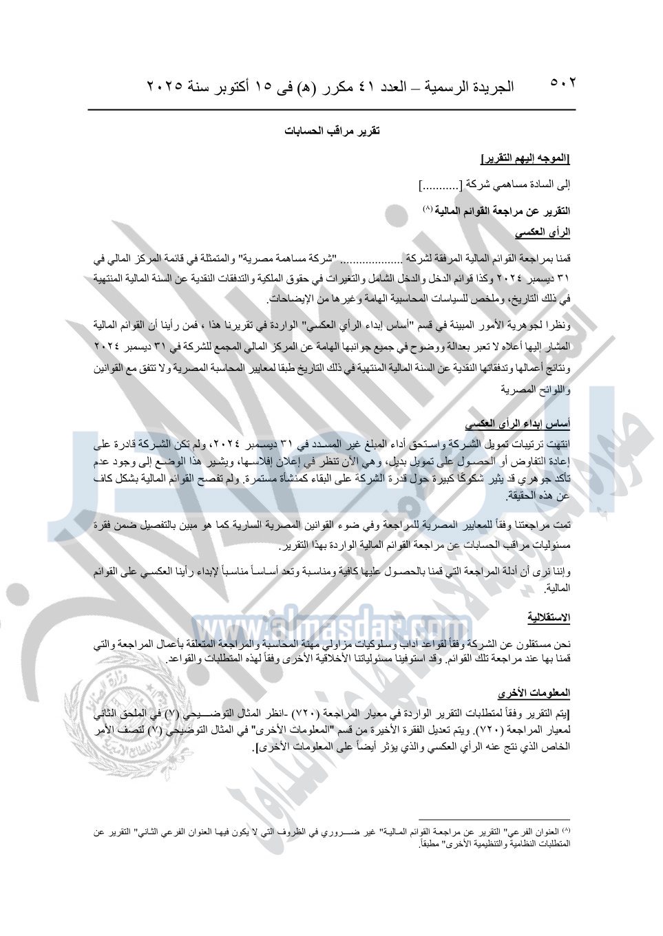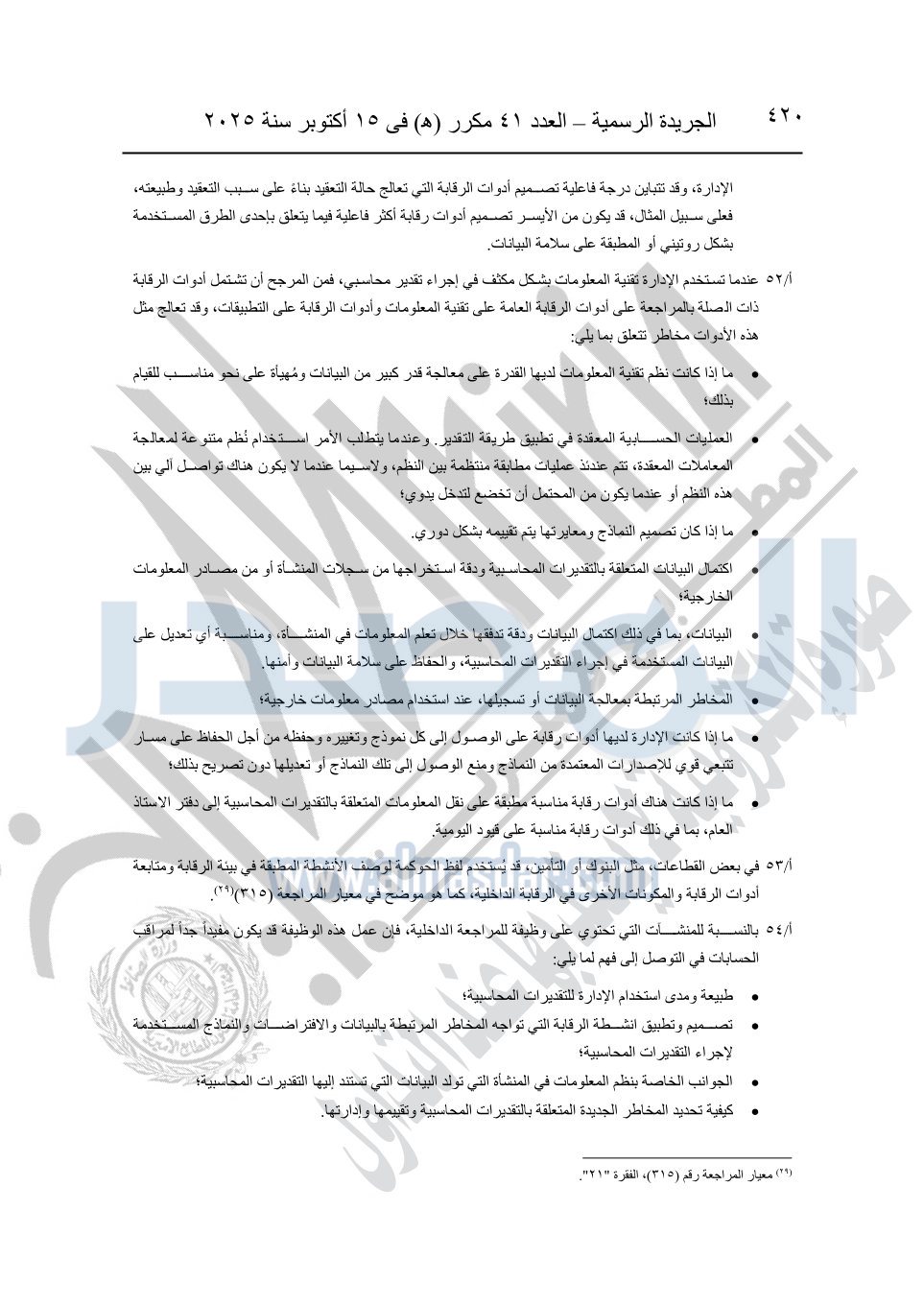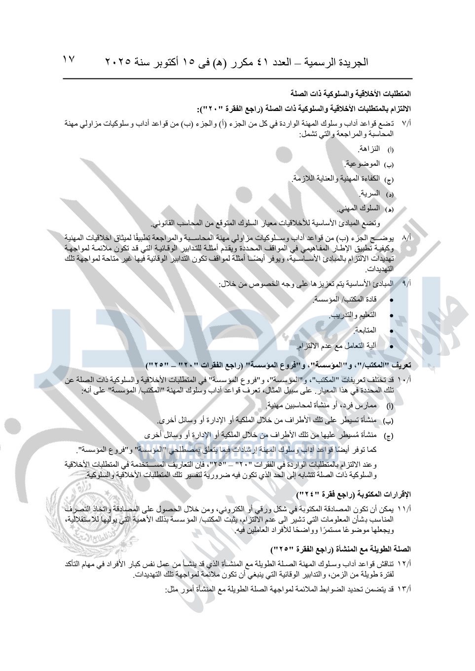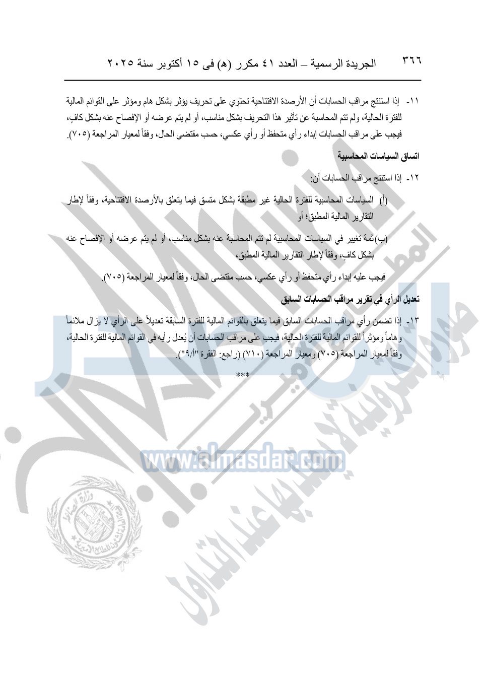 نشرت الجريدة الرسمية في العدد 41 مكرر "هـ" الصادر في 15 أكتوبر سنة 2025، قرار رئيس مجلس الوزراء رقم 3725 لسنة 2025، بشأن العمل بالمعايير المصرية للمراجعة والفحص المحدود ومهام التأكد الأخرى المرافقة لهذا القرار.