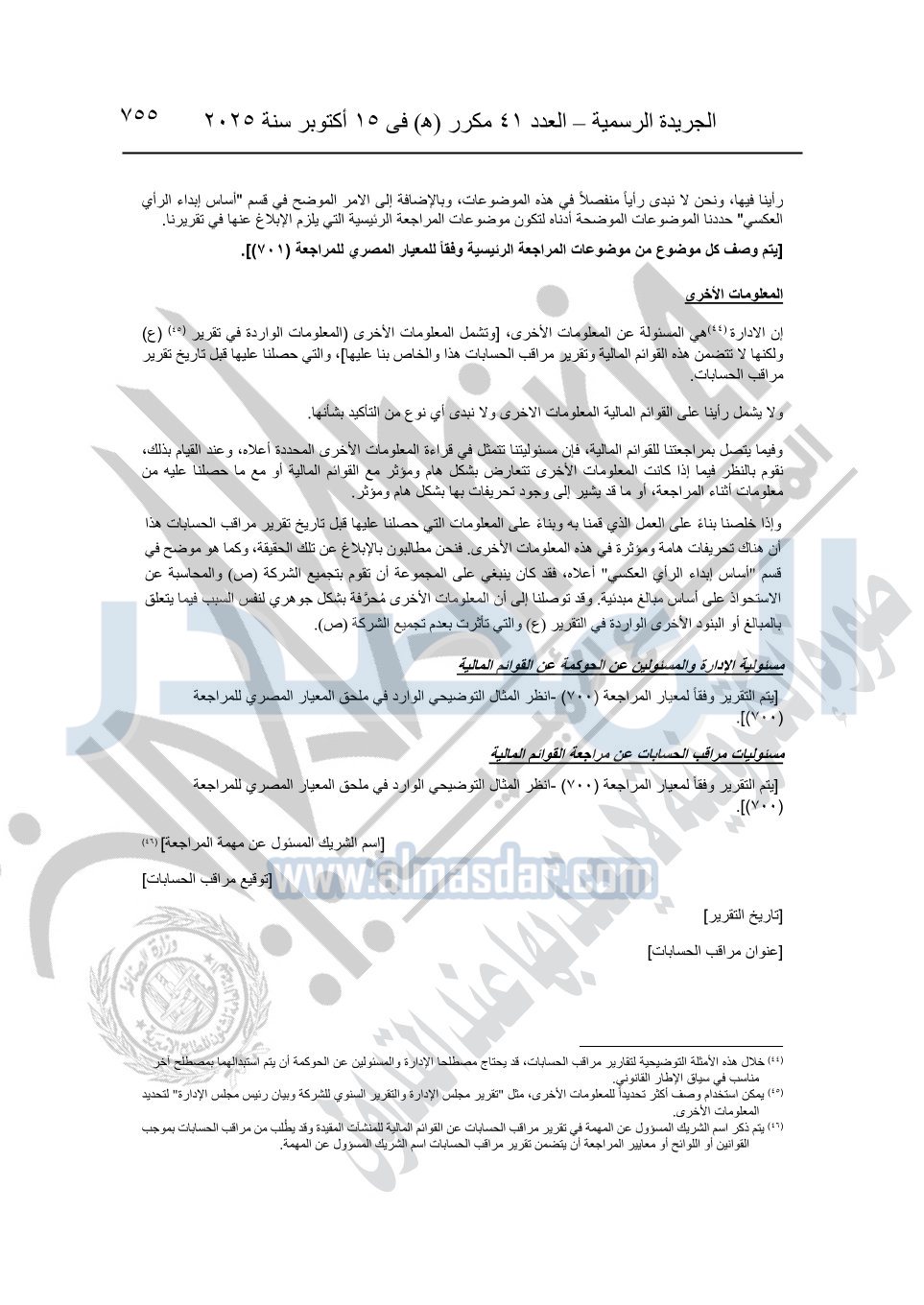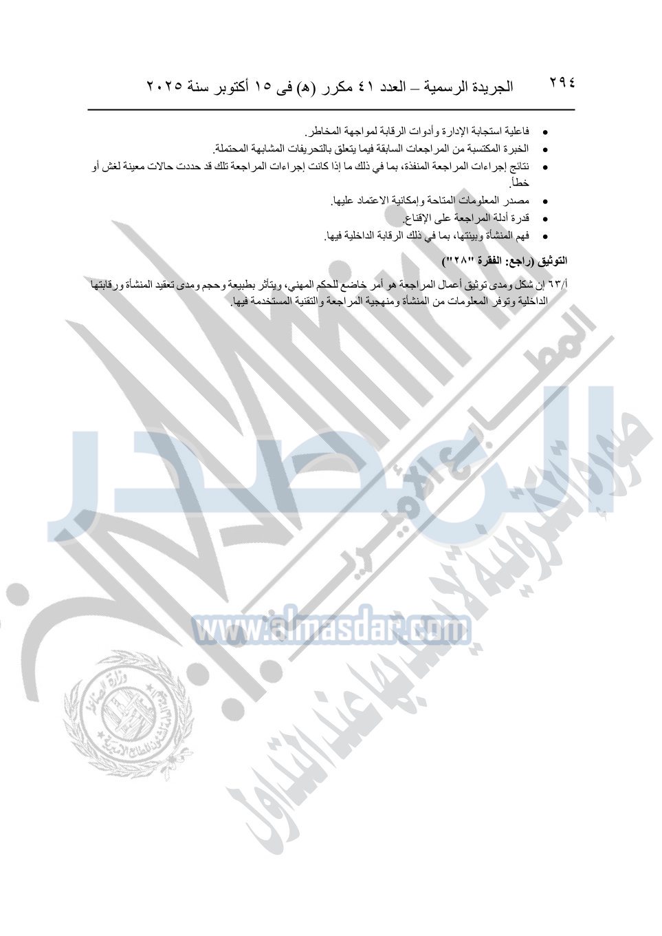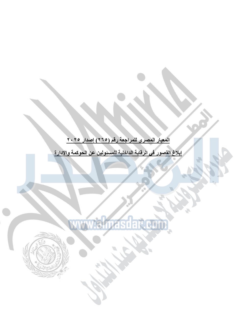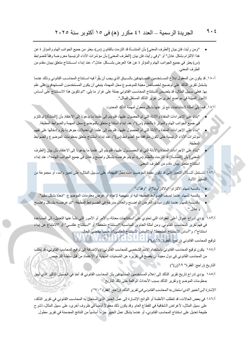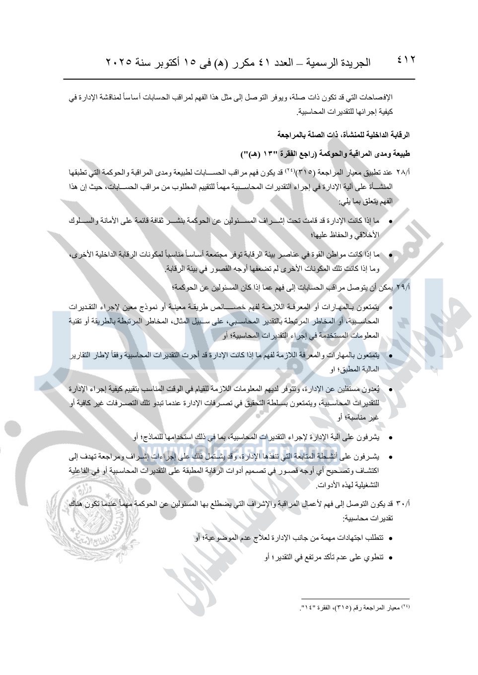 نشرت الجريدة الرسمية في العدد 41 مكرر "هـ" الصادر في 15 أكتوبر سنة 2025، قرار رئيس مجلس الوزراء رقم 3725 لسنة 2025، بشأن العمل بالمعايير المصرية للمراجعة والفحص المحدود ومهام التأكد الأخرى المرافقة لهذا القرار.
