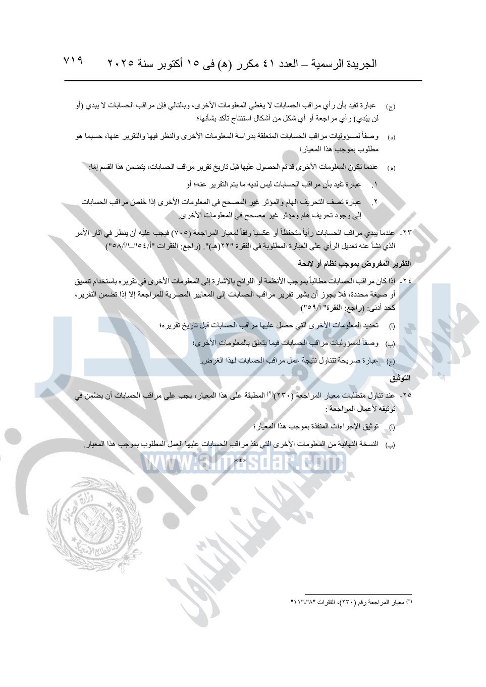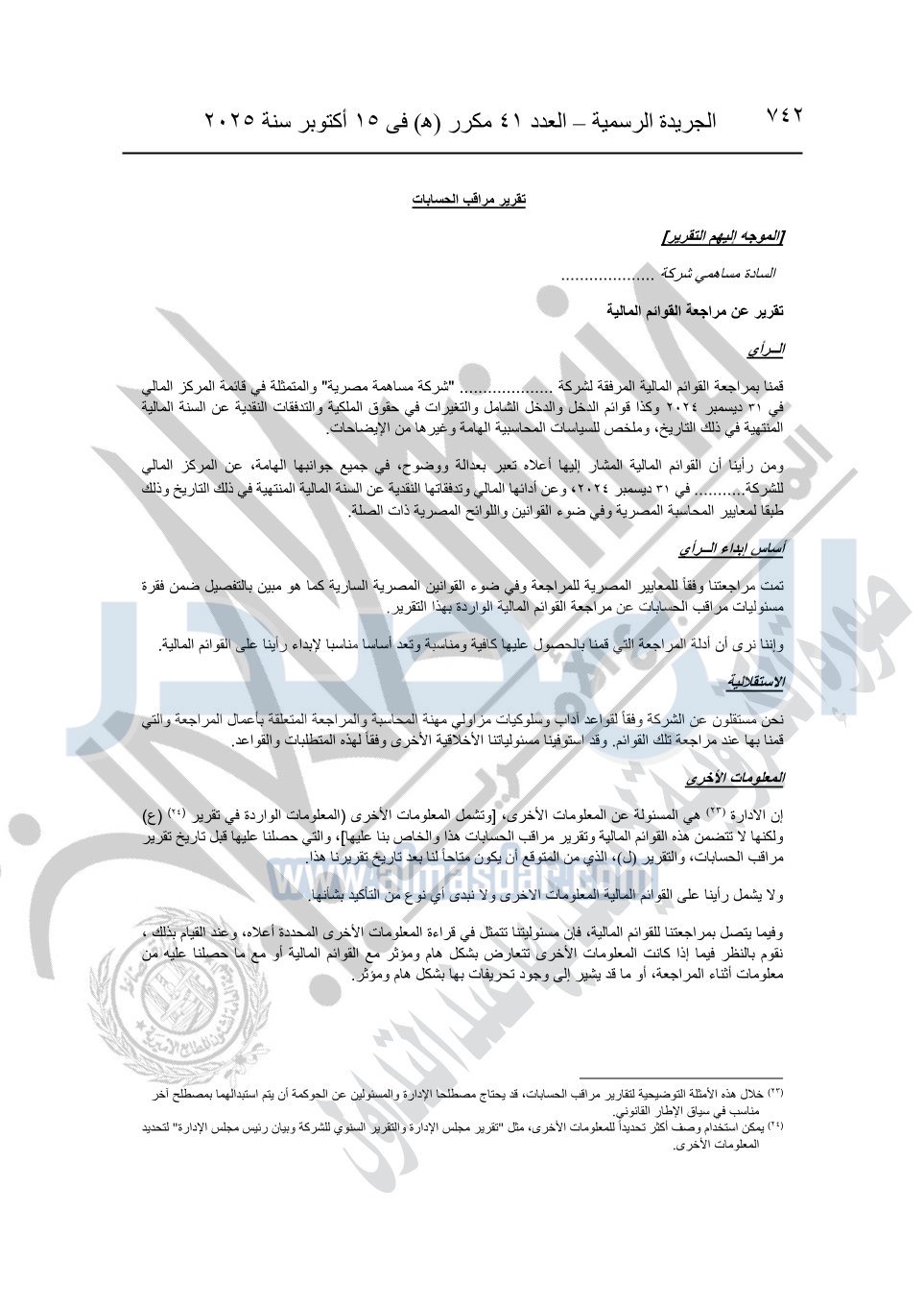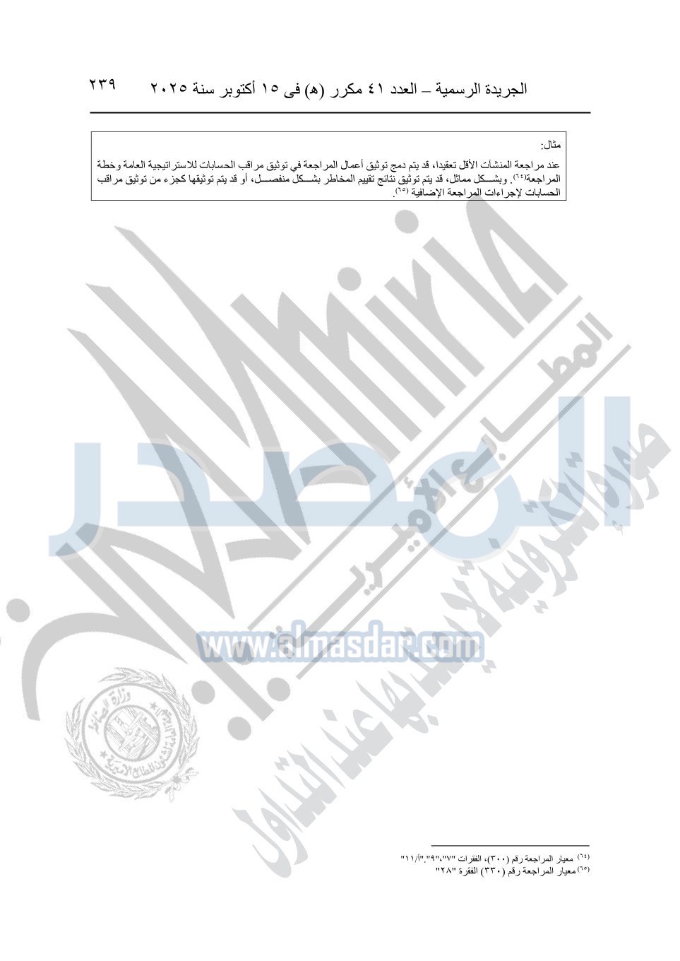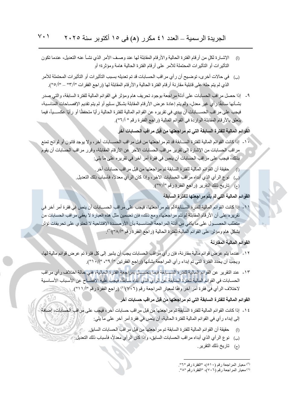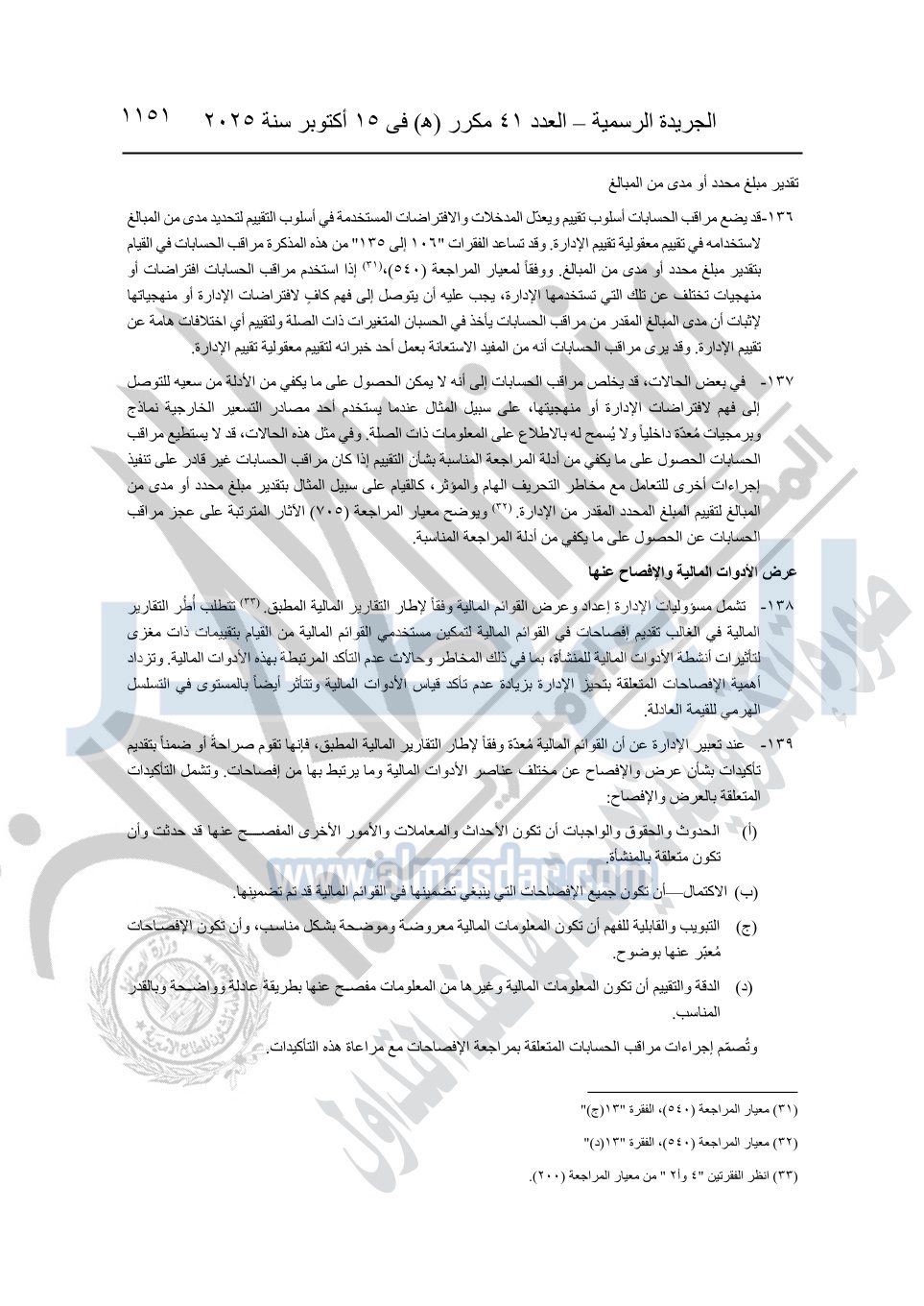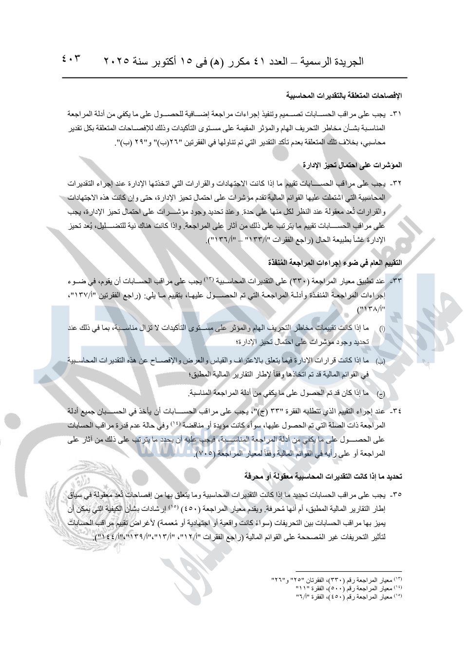 نشرت الجريدة الرسمية في العدد 41 مكرر "هـ" الصادر في 15 أكتوبر سنة 2025، قرار رئيس مجلس الوزراء رقم 3725 لسنة 2025، بشأن العمل بالمعايير المصرية للمراجعة والفحص المحدود ومهام التأكد الأخرى المرافقة لهذا القرار.
