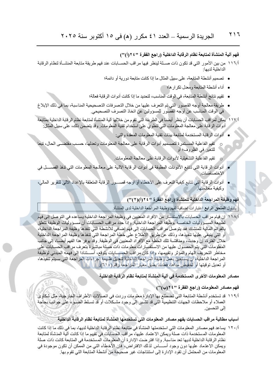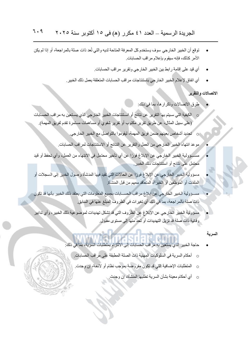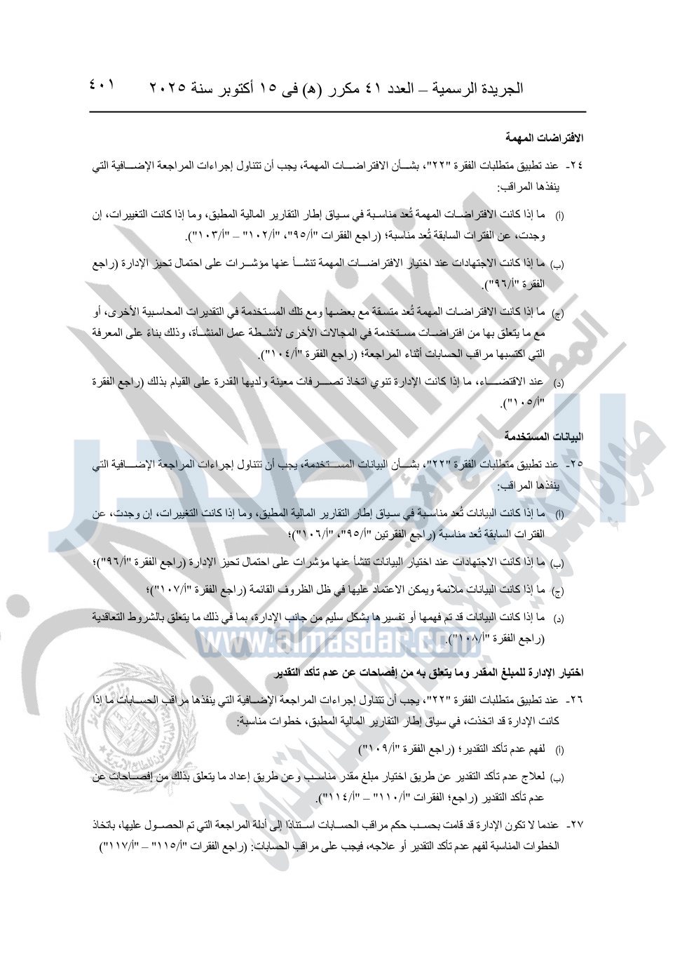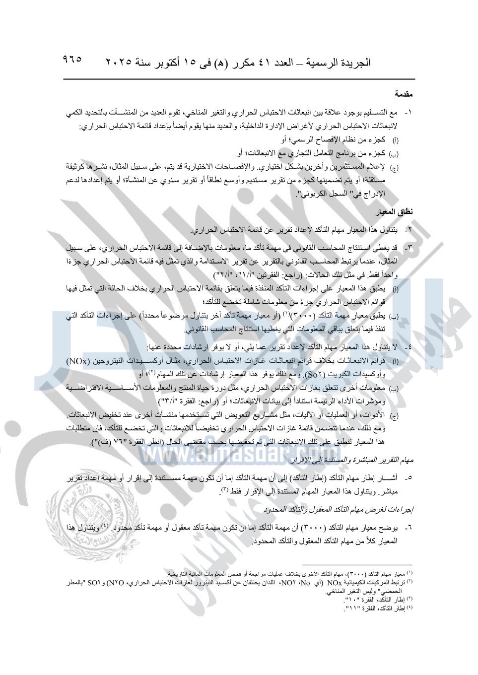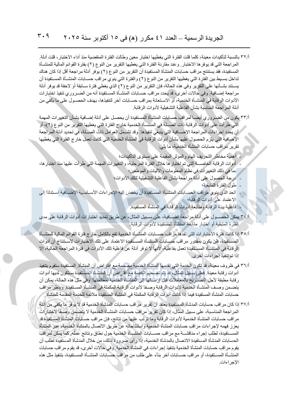 نشرت الجريدة الرسمية في العدد 41 مكرر "هـ" الصادر في 15 أكتوبر سنة 2025، قرار رئيس مجلس الوزراء رقم 3725 لسنة 2025، بشأن العمل بالمعايير المصرية للمراجعة والفحص المحدود ومهام التأكد الأخرى المرافقة لهذا القرار.