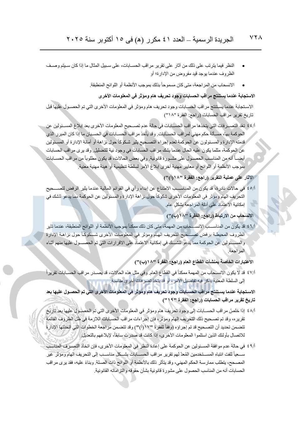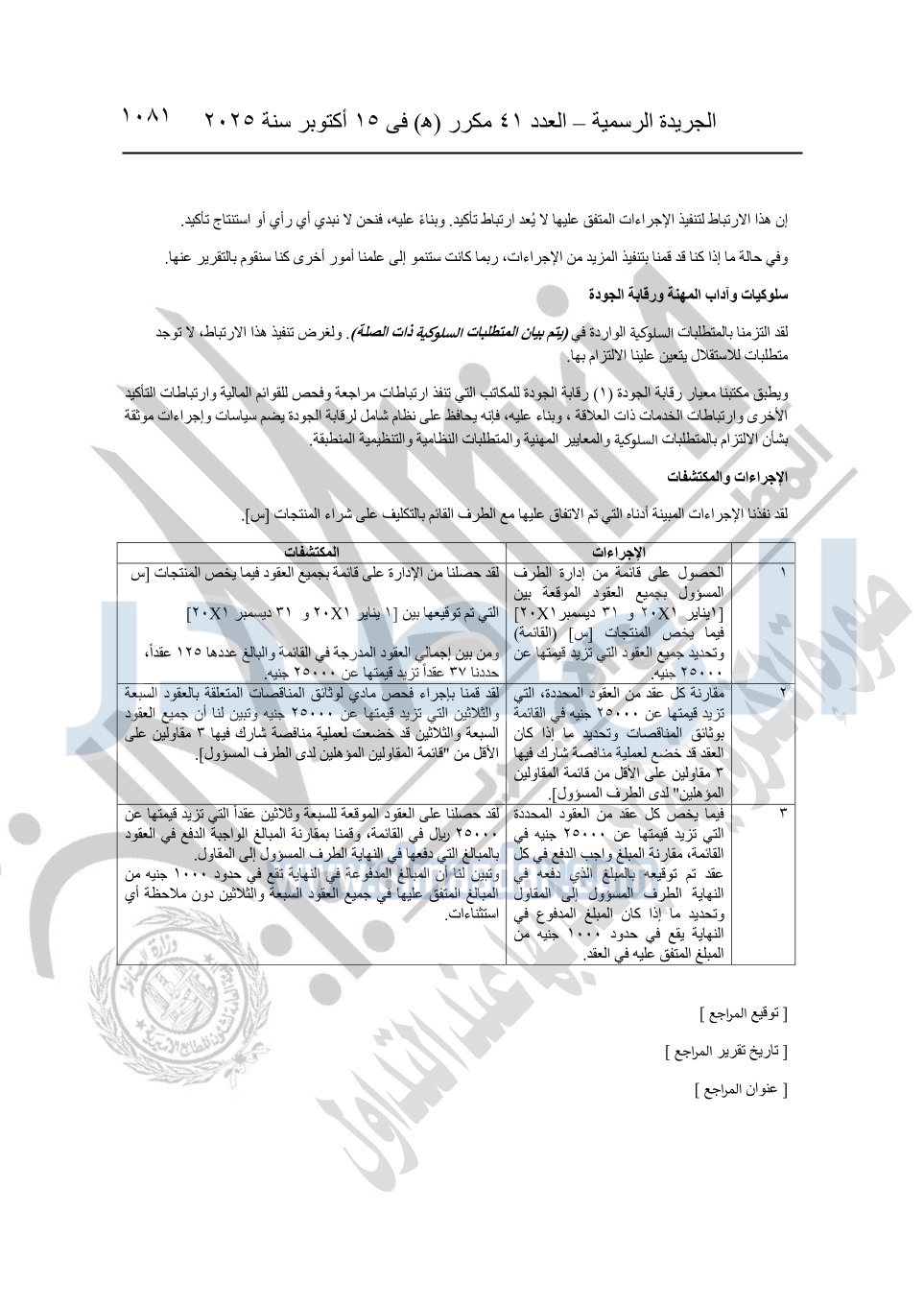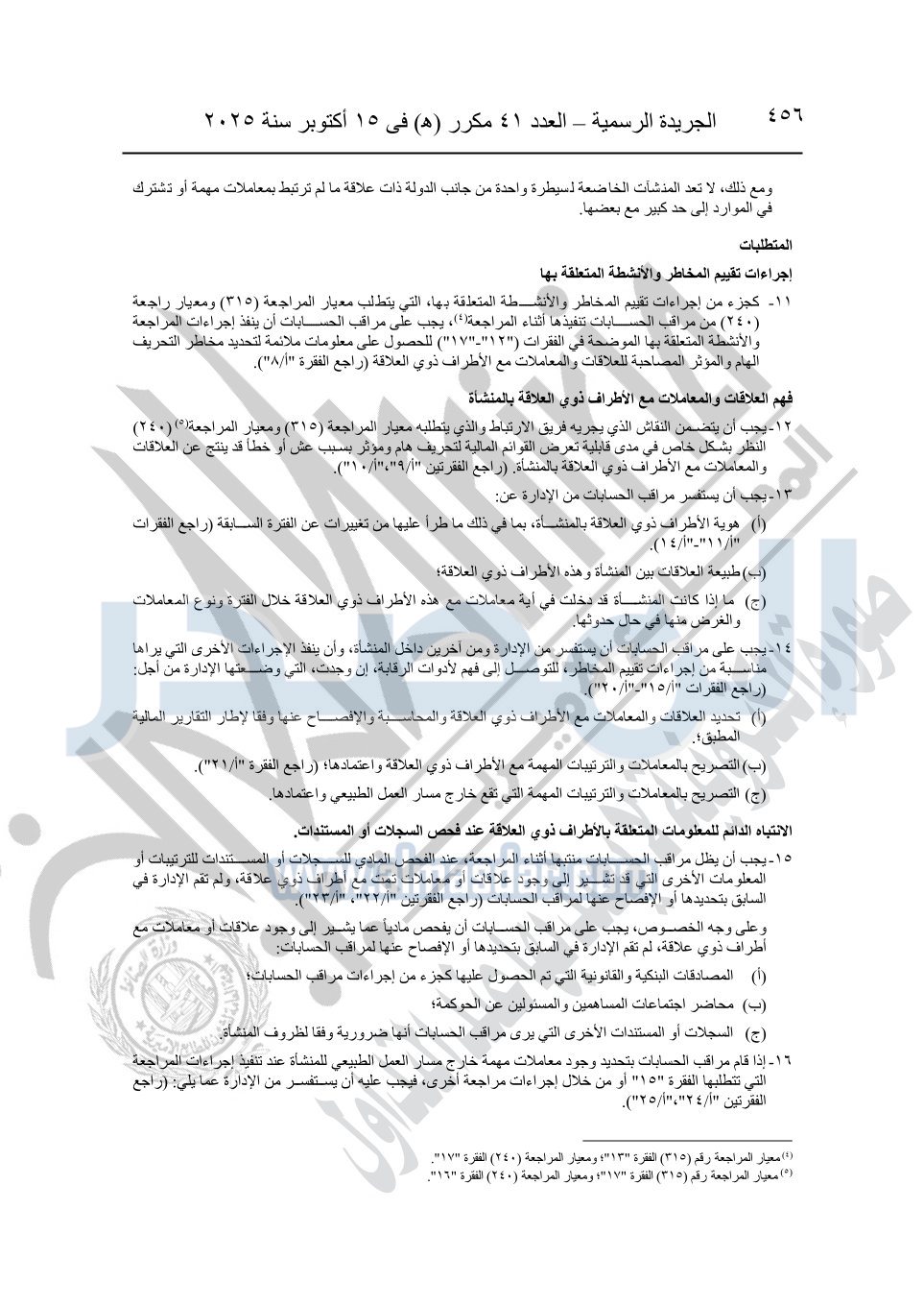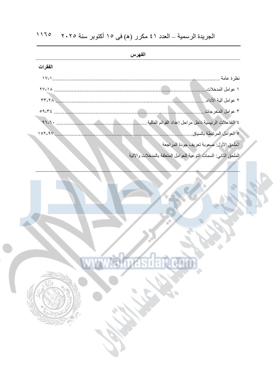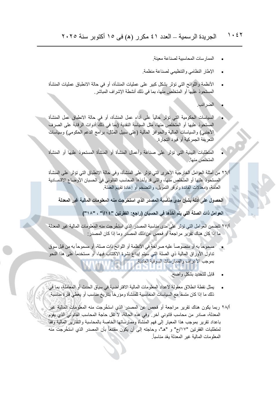 نشرت الجريدة الرسمية في العدد 41 مكرر "هـ" الصادر في 15 أكتوبر سنة 2025، قرار رئيس مجلس الوزراء رقم 3725 لسنة 2025، بشأن العمل بالمعايير المصرية للمراجعة والفحص المحدود ومهام التأكد الأخرى المرافقة لهذا القرار.